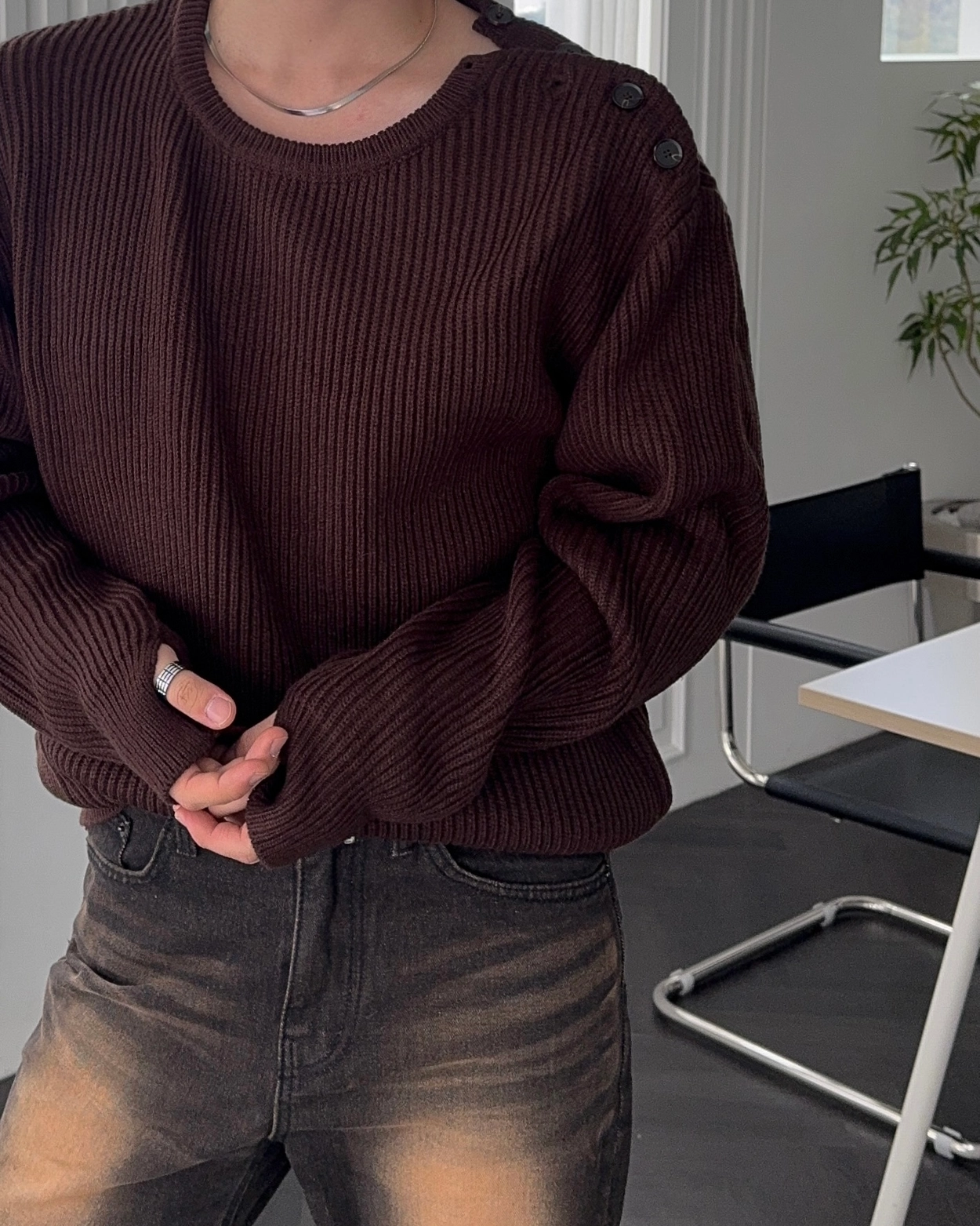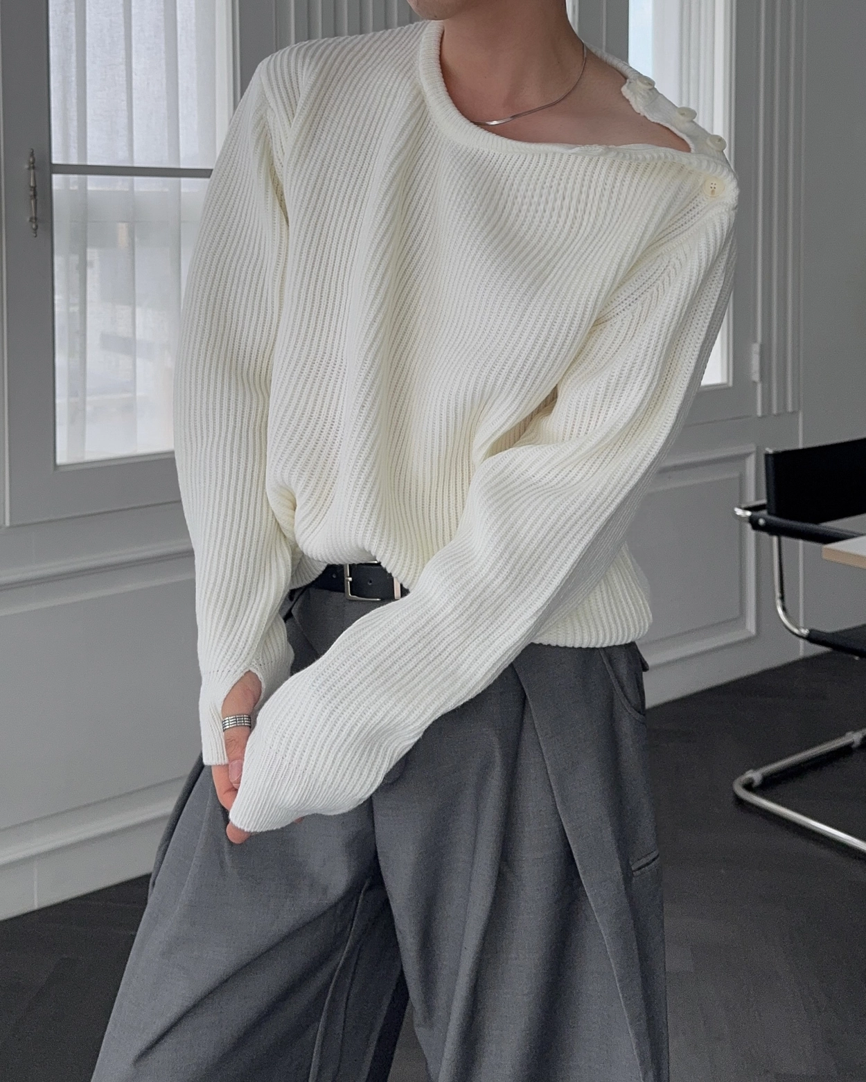 *딥블루 , 아이 당일출고* [MD추천] 올티 크롬 사이드 스냅 울 헤어리 니트 3COL