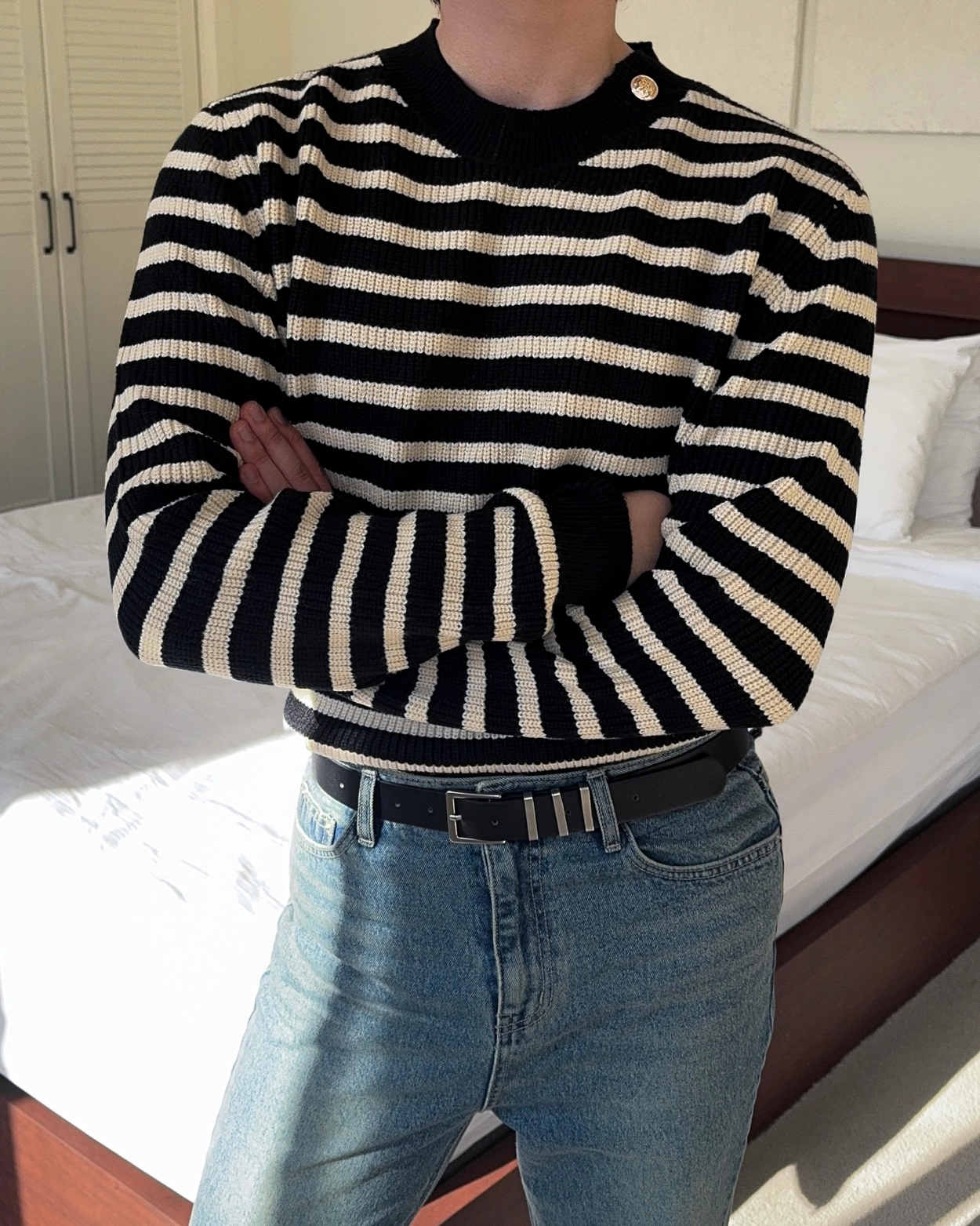 베르샤 견장 라운드 스트라이프 니트