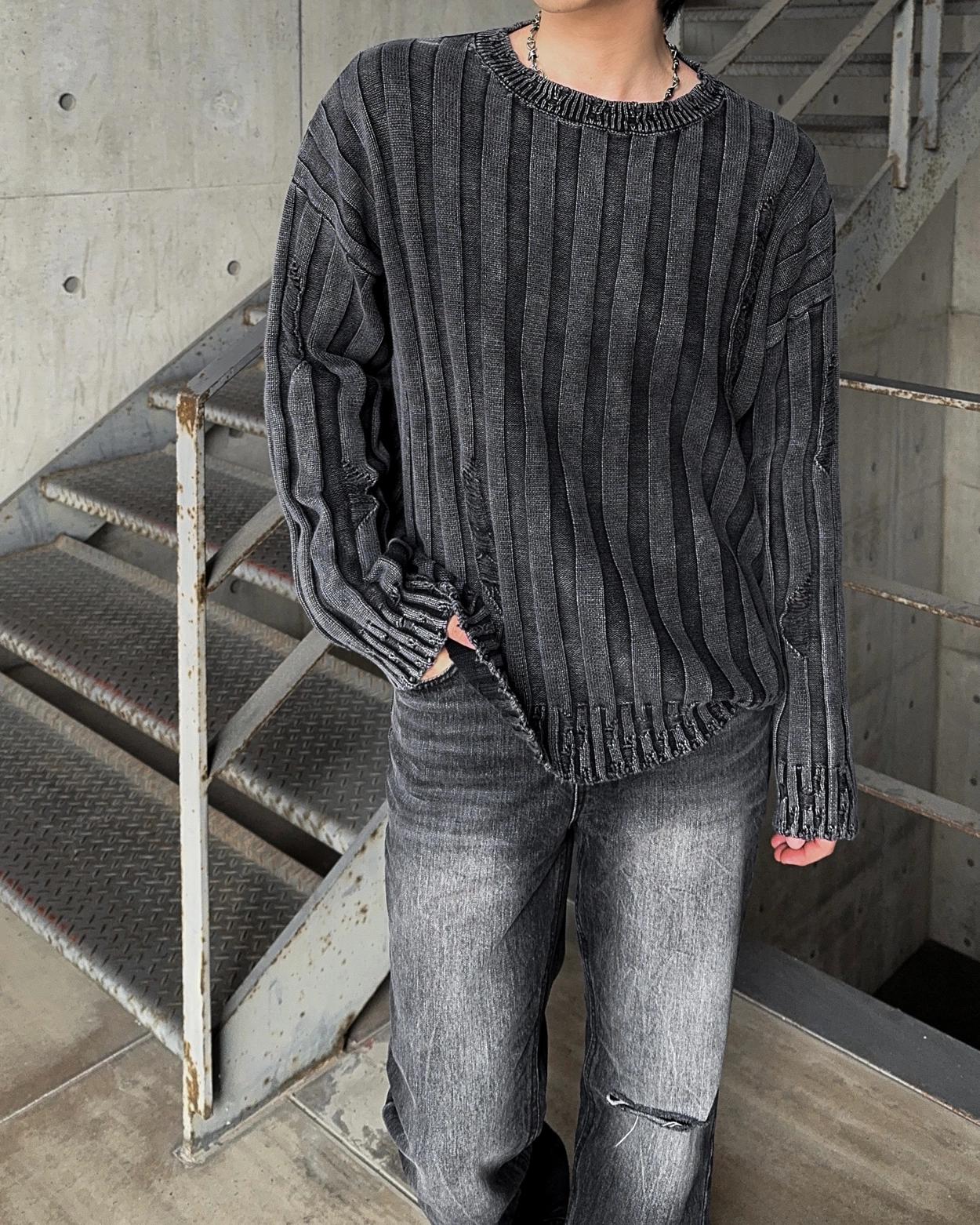 피거 다잉 골지 피그먼트 데미지 니트