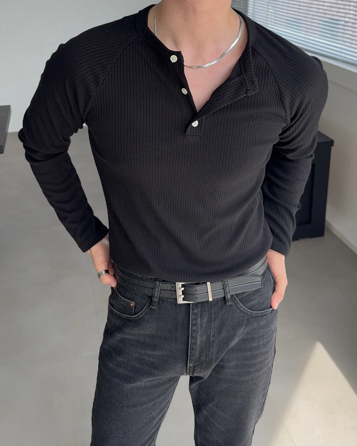 [MUSCLE FIT] 로비 스냅 헨리넥 골지 티셔츠 4COL