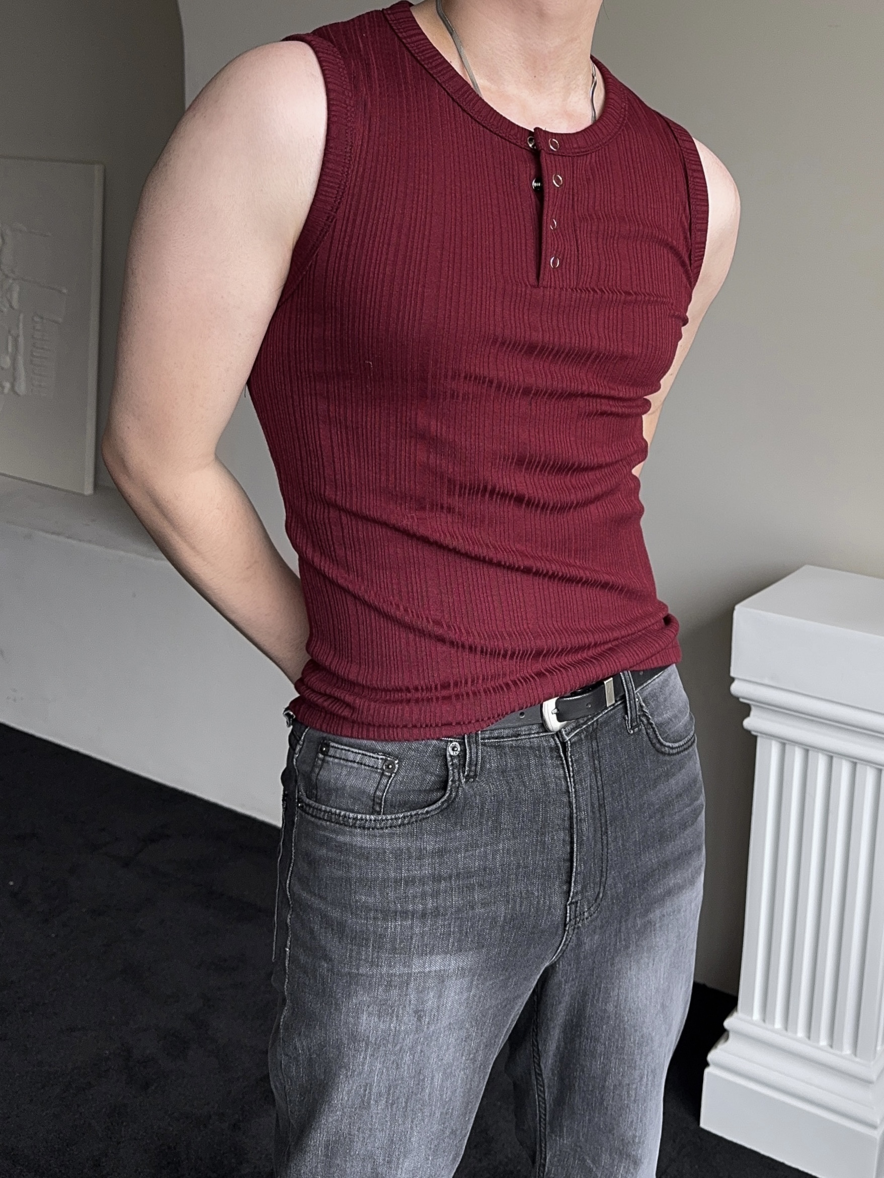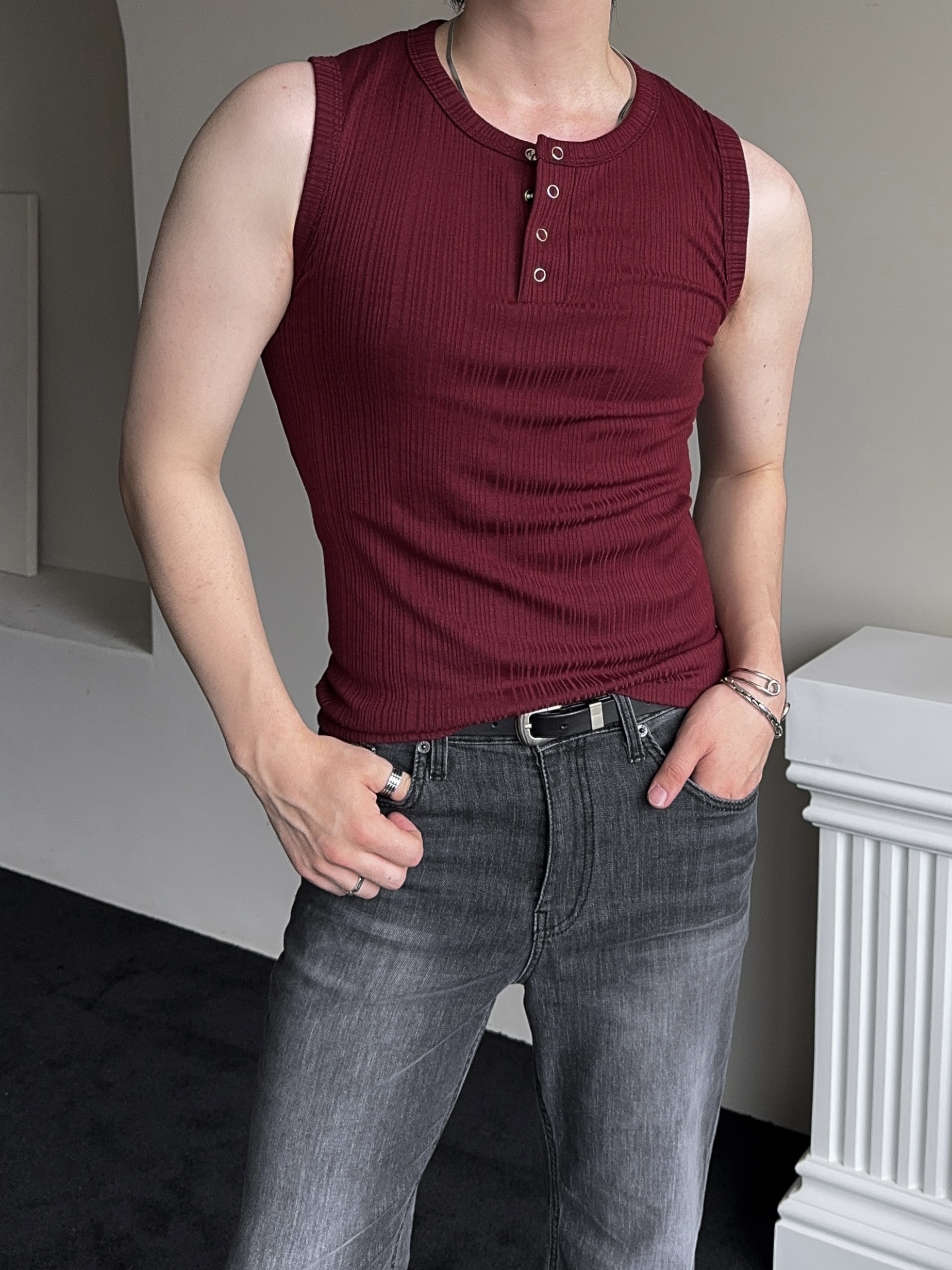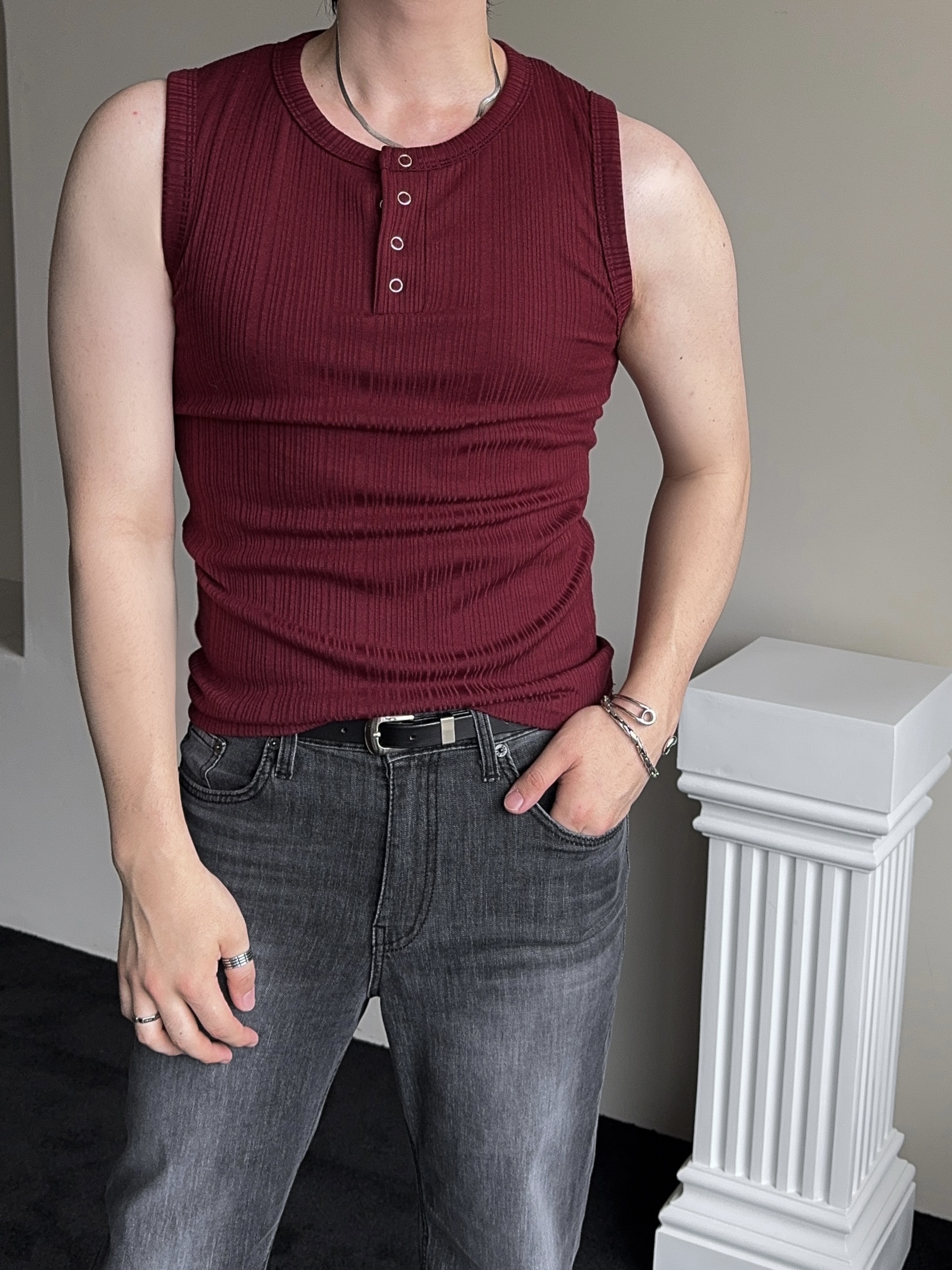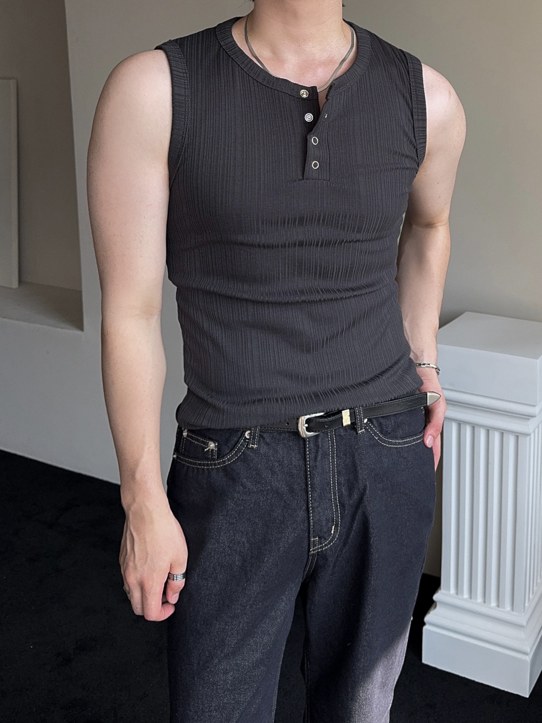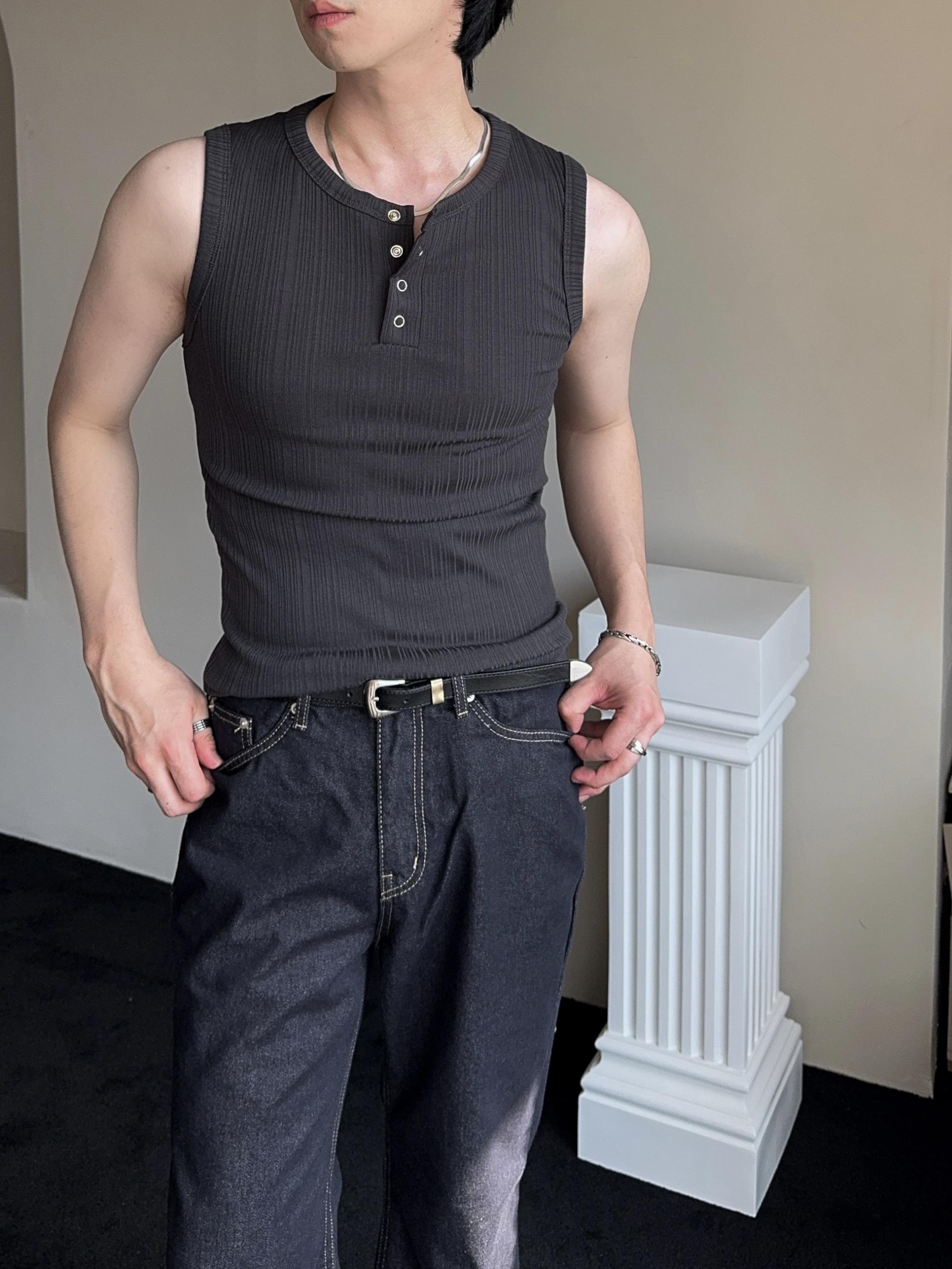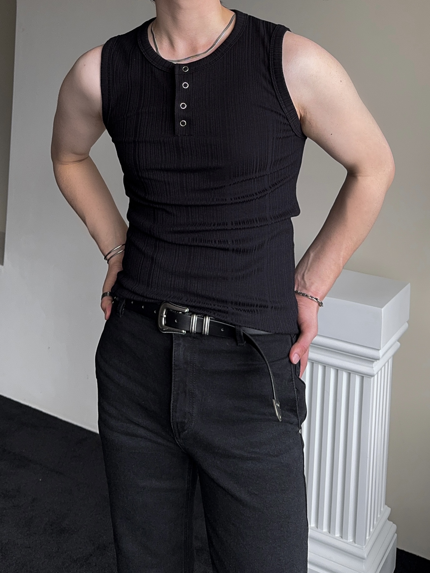 -얇은 골지 소재로 제작된 헨리넥 나시 티셔츠