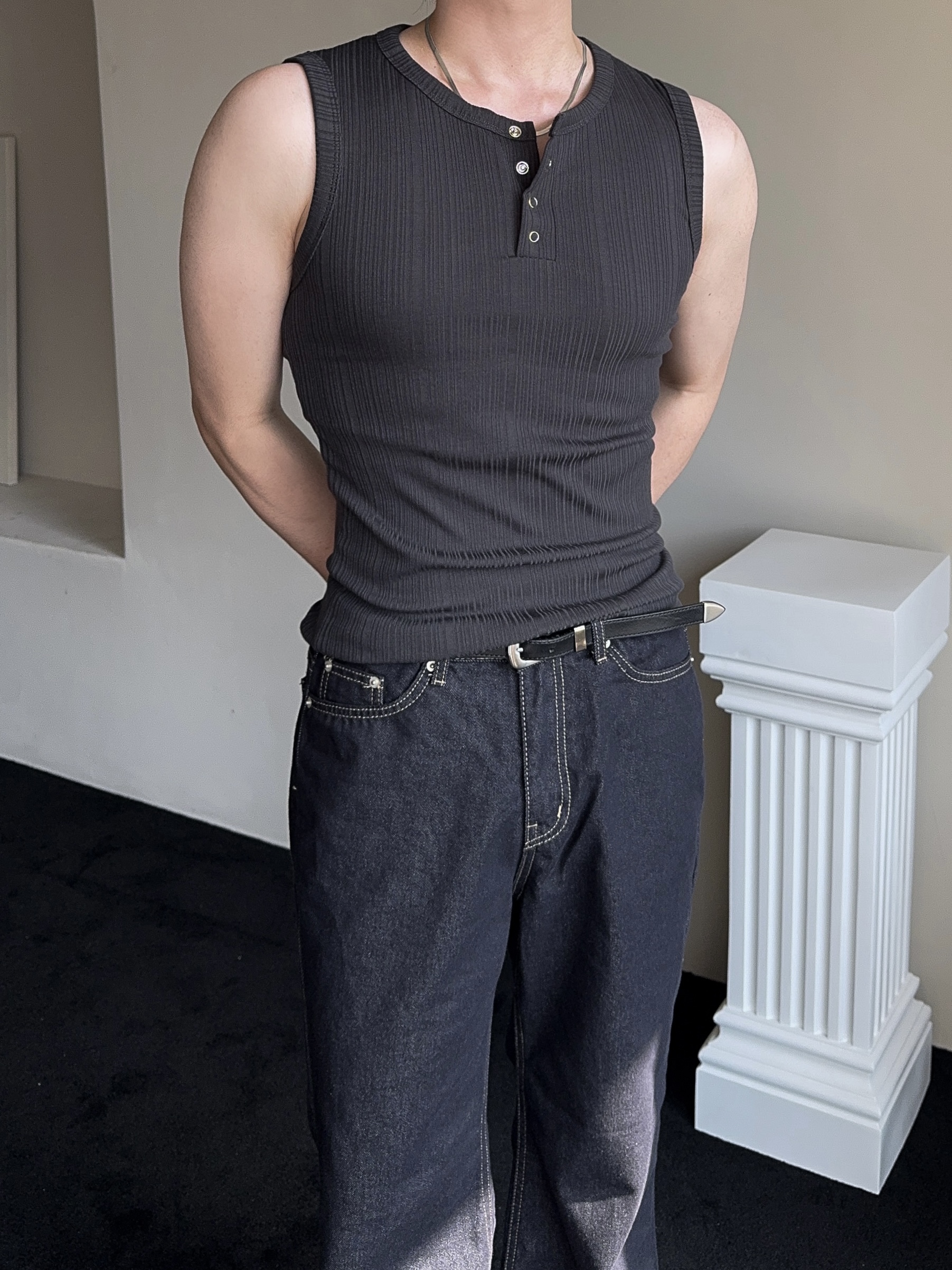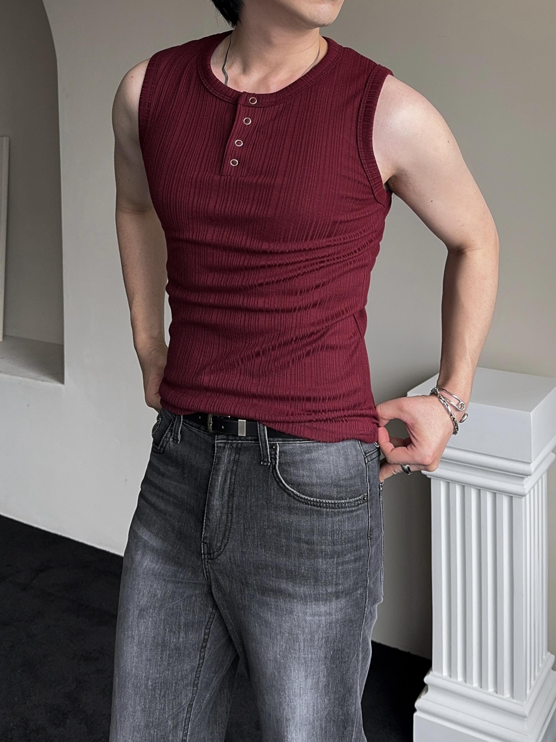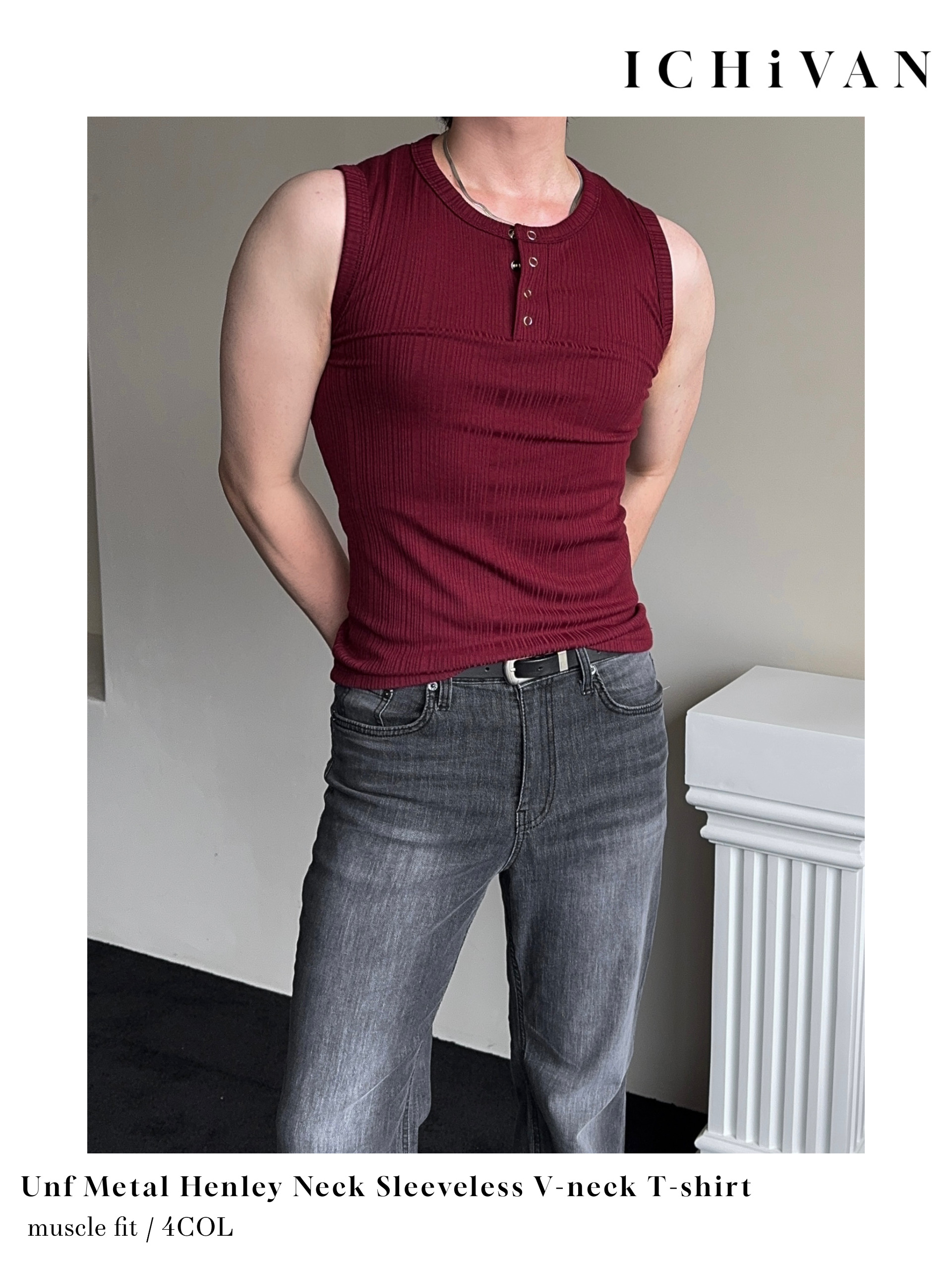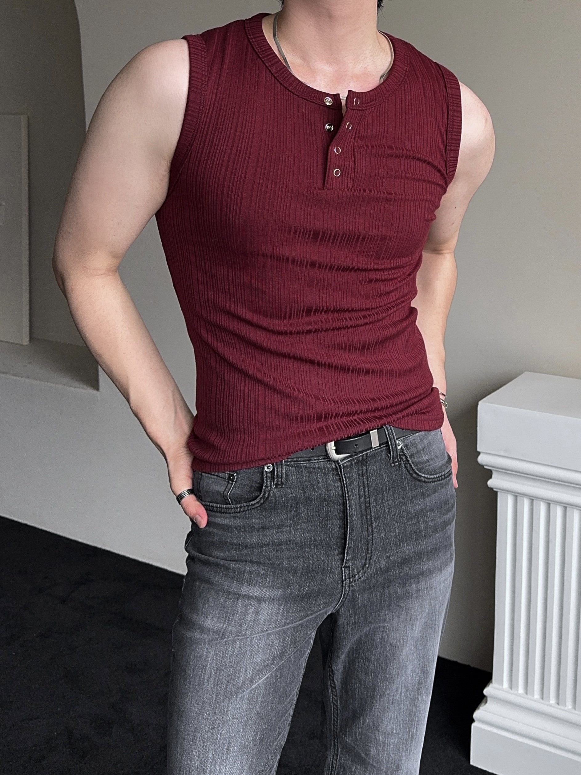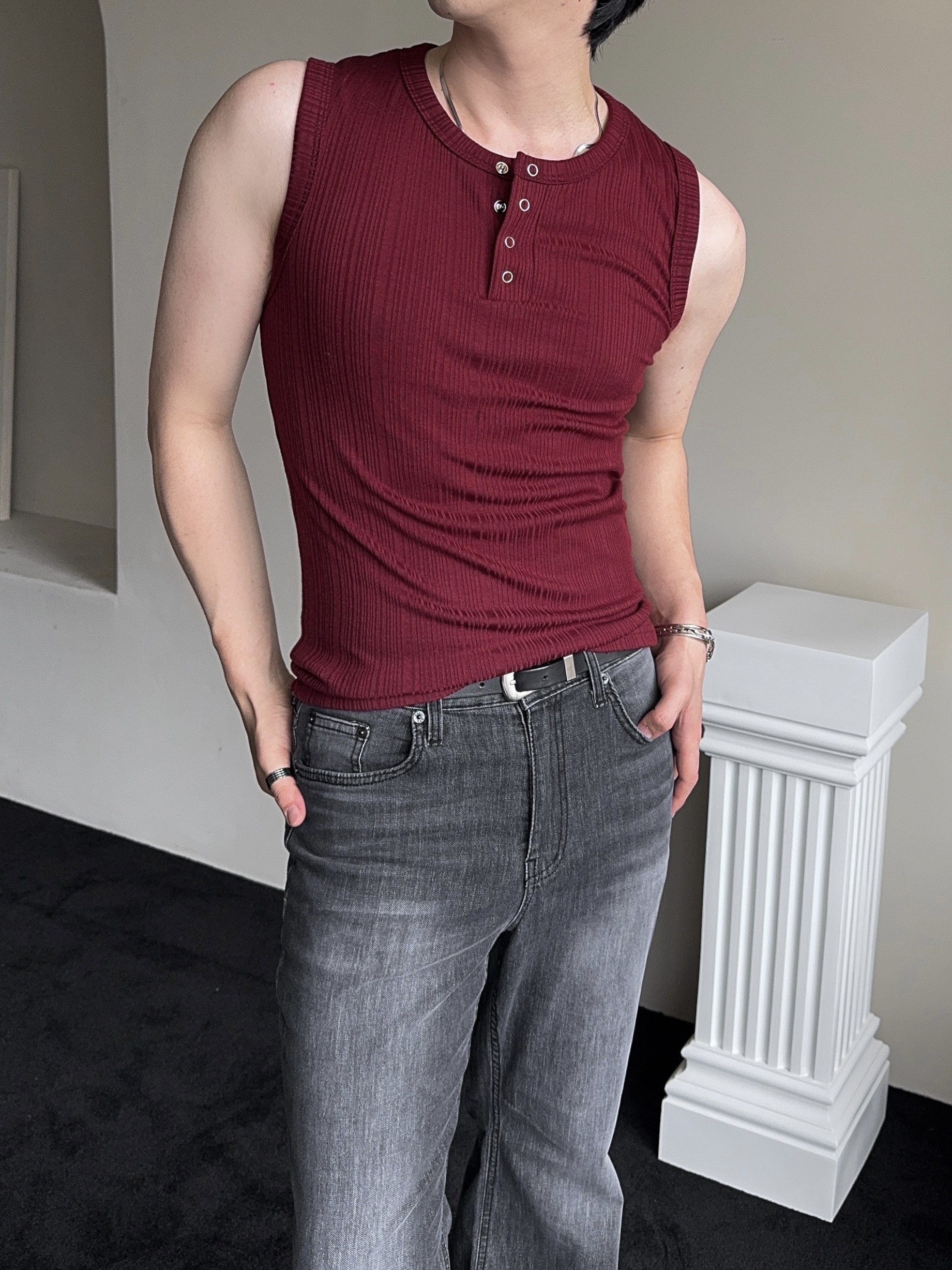 -얇은 골지 소재로 제작된 헨리넥 나시 티셔츠