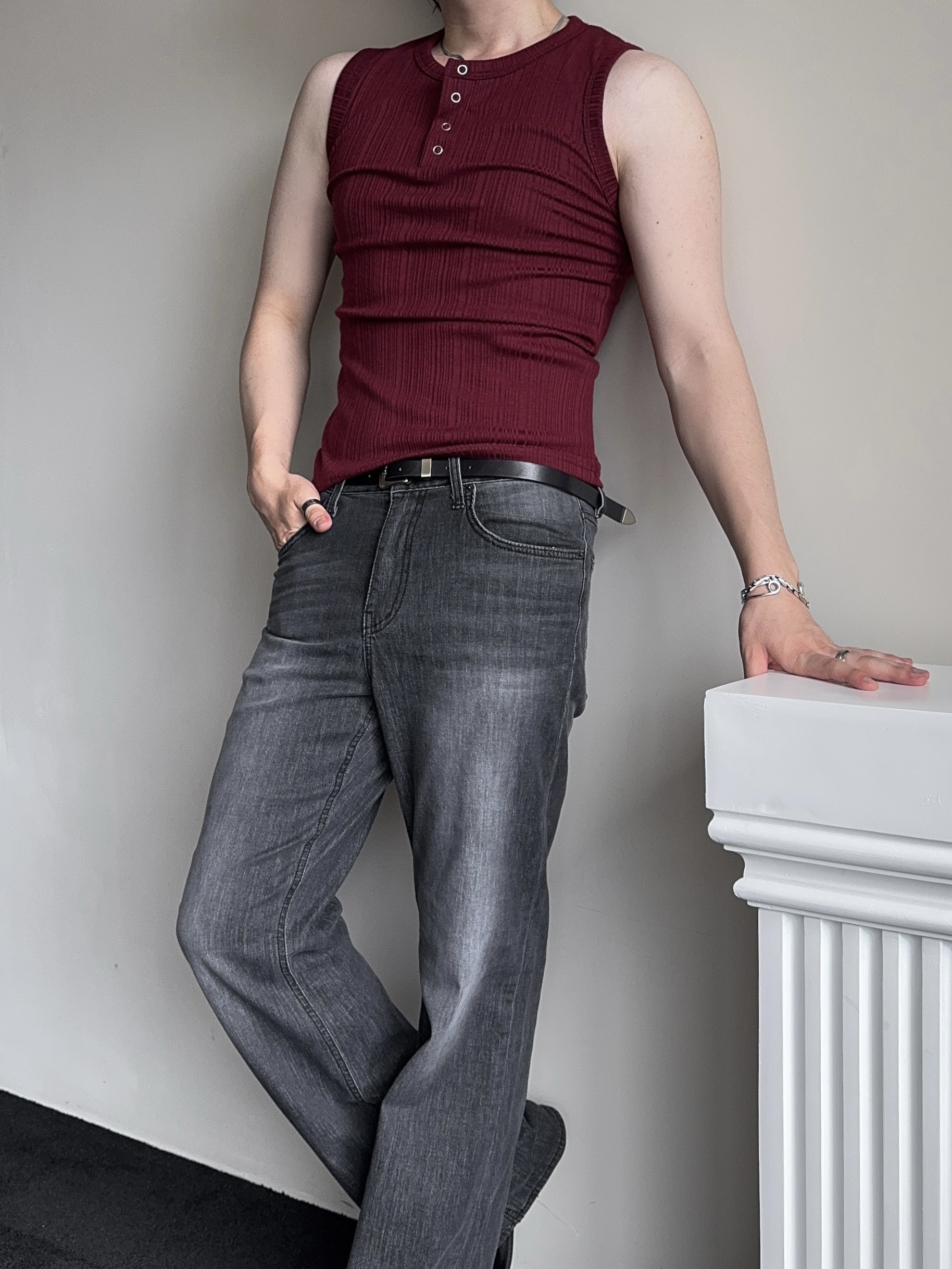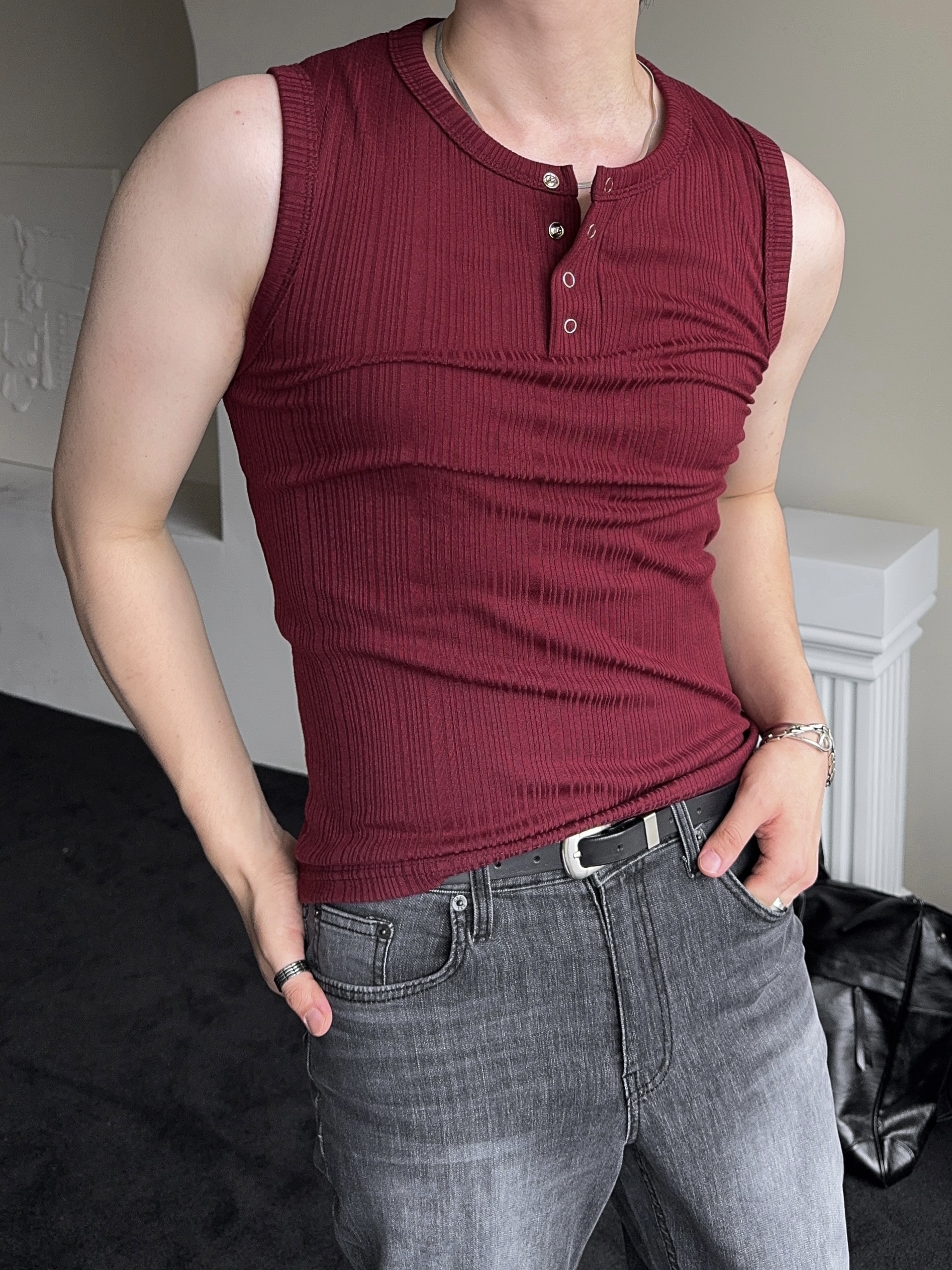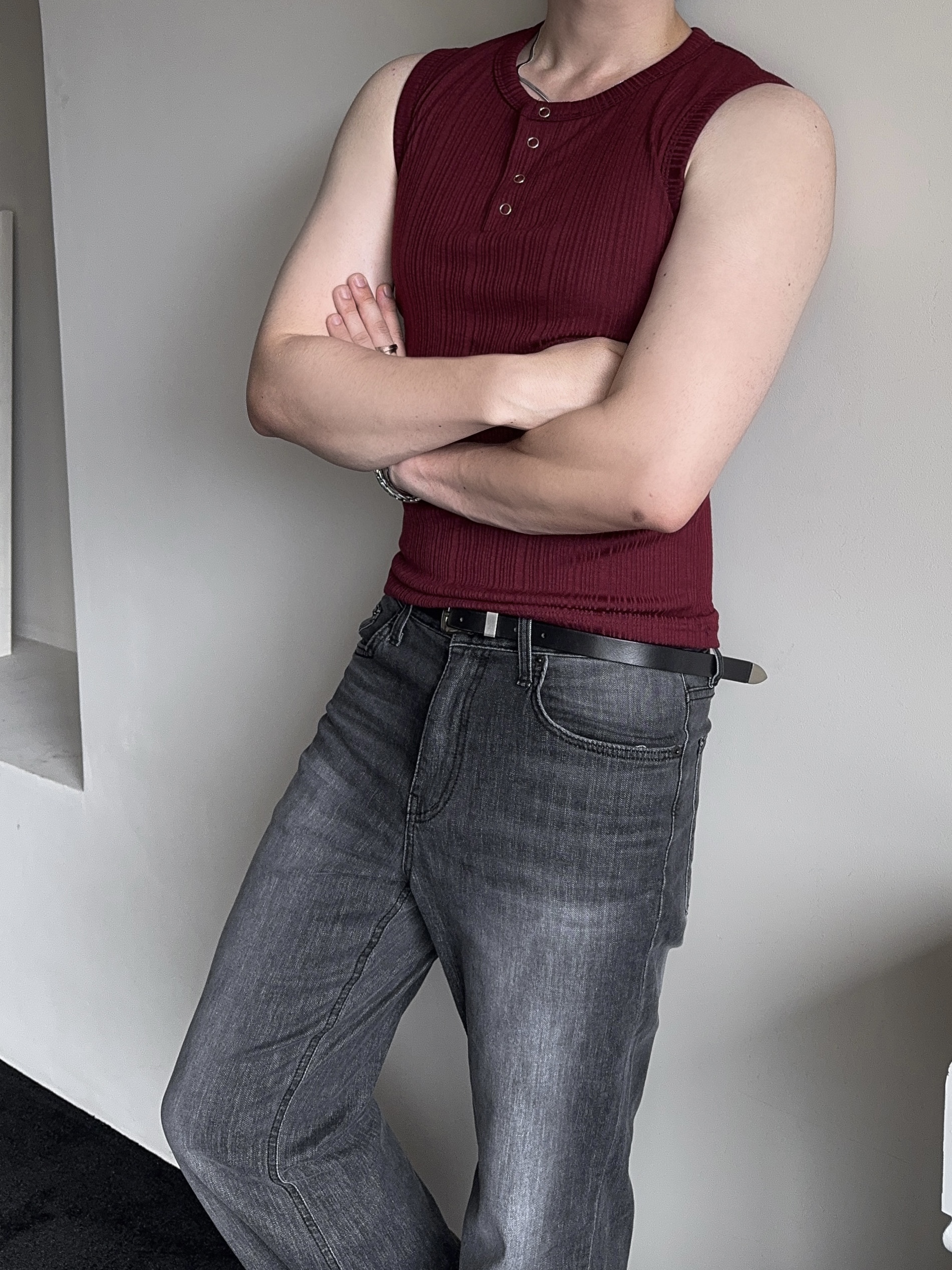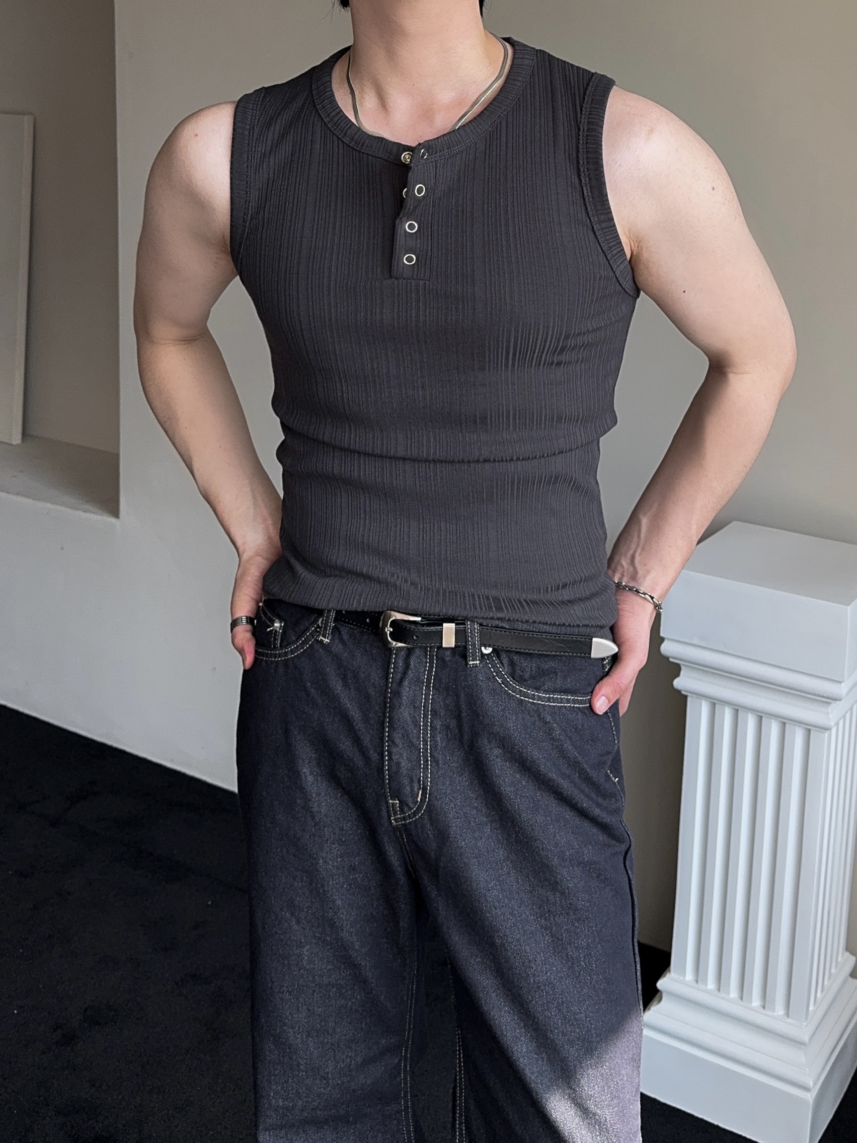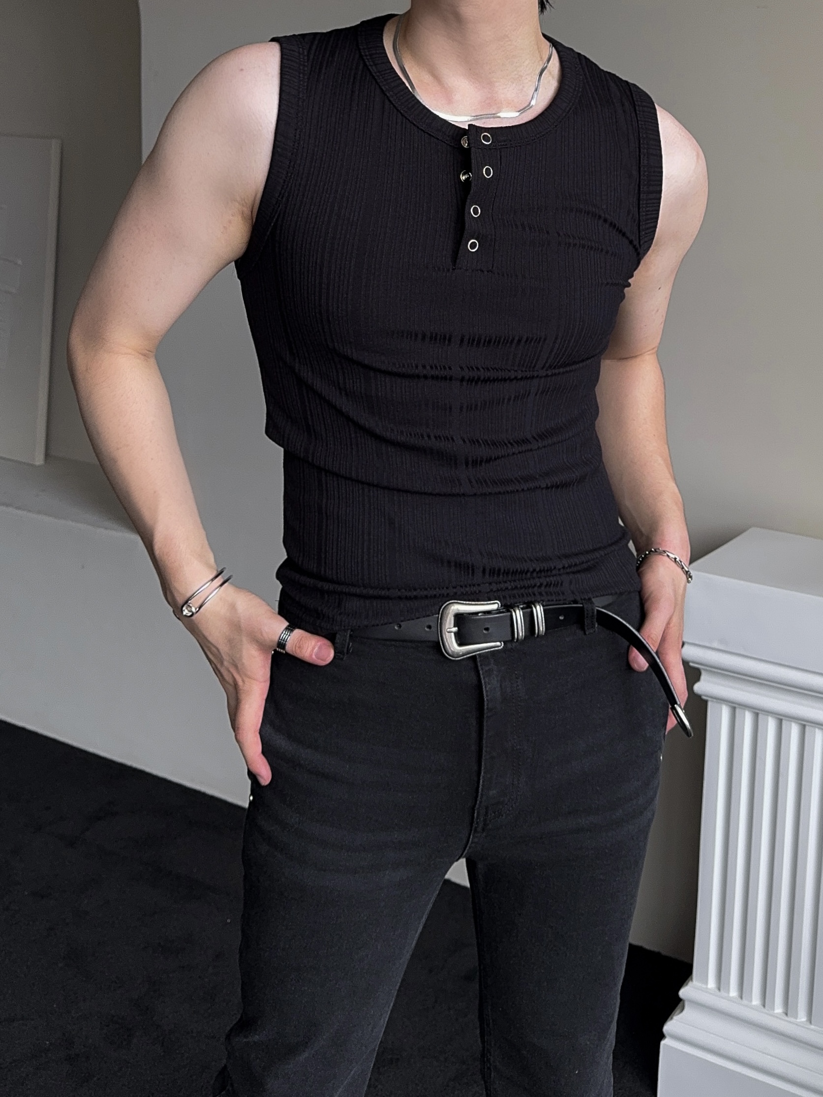 -얇은 골지 소재로 제작된 헨리넥 나시 티셔츠