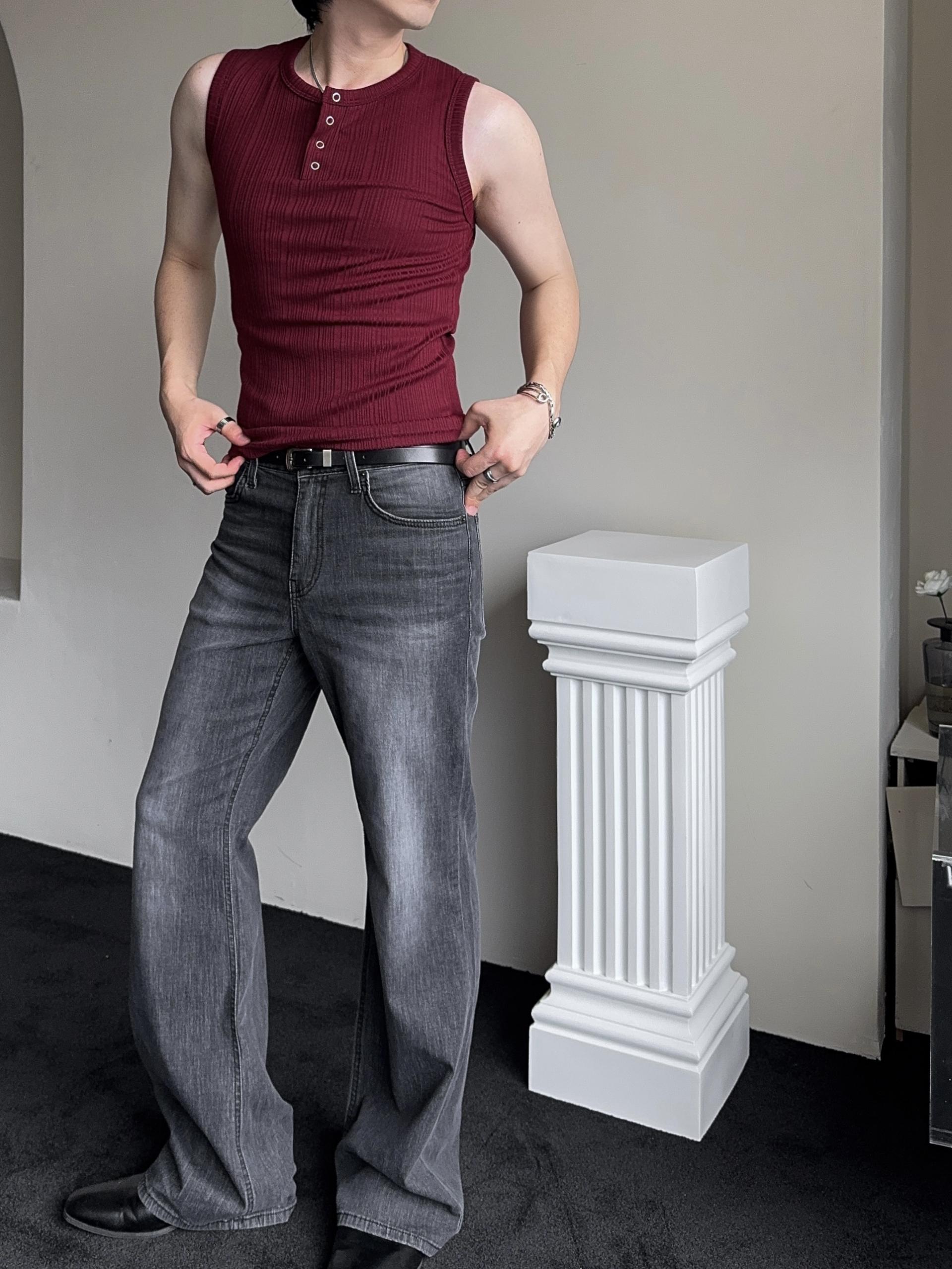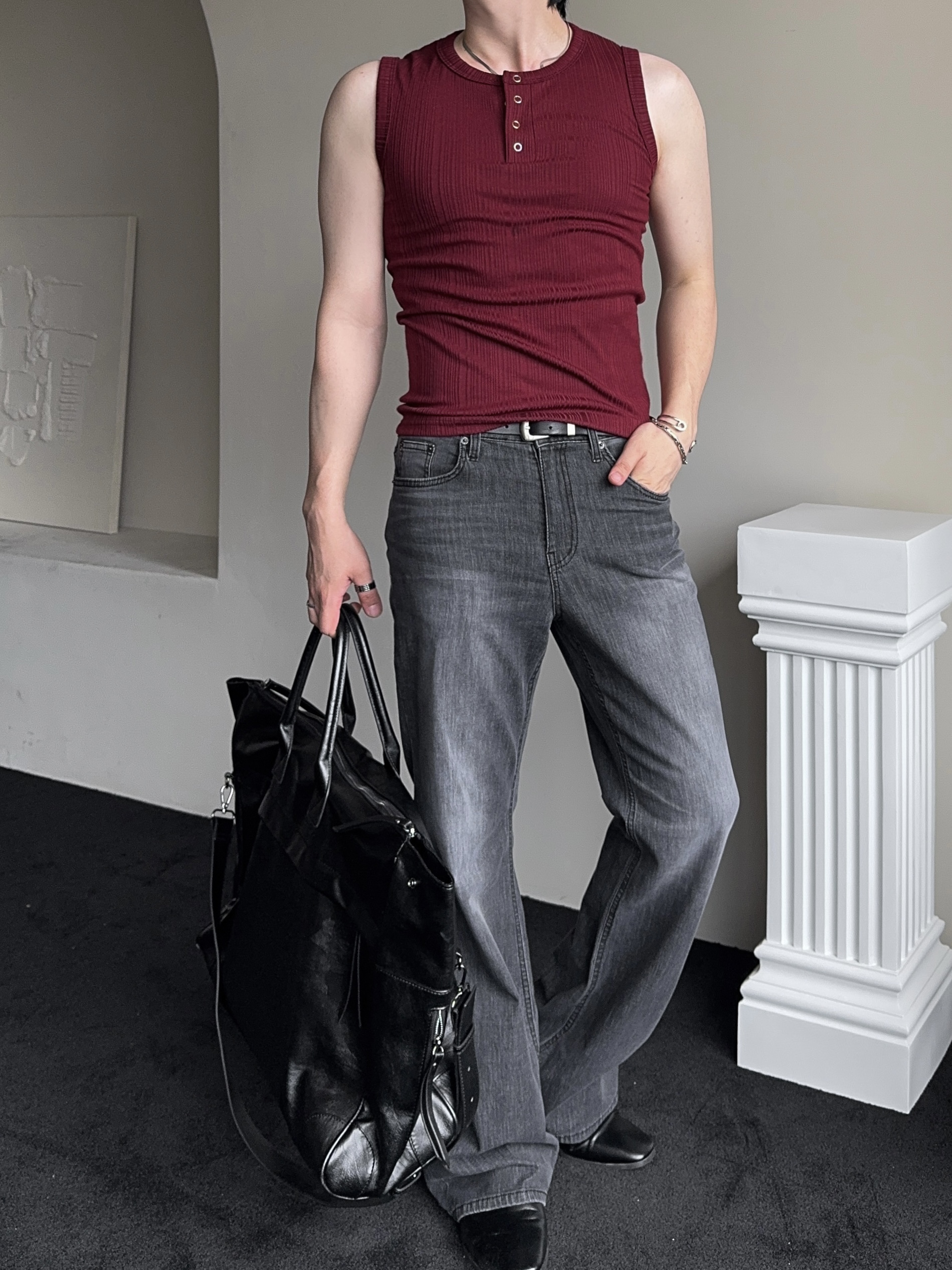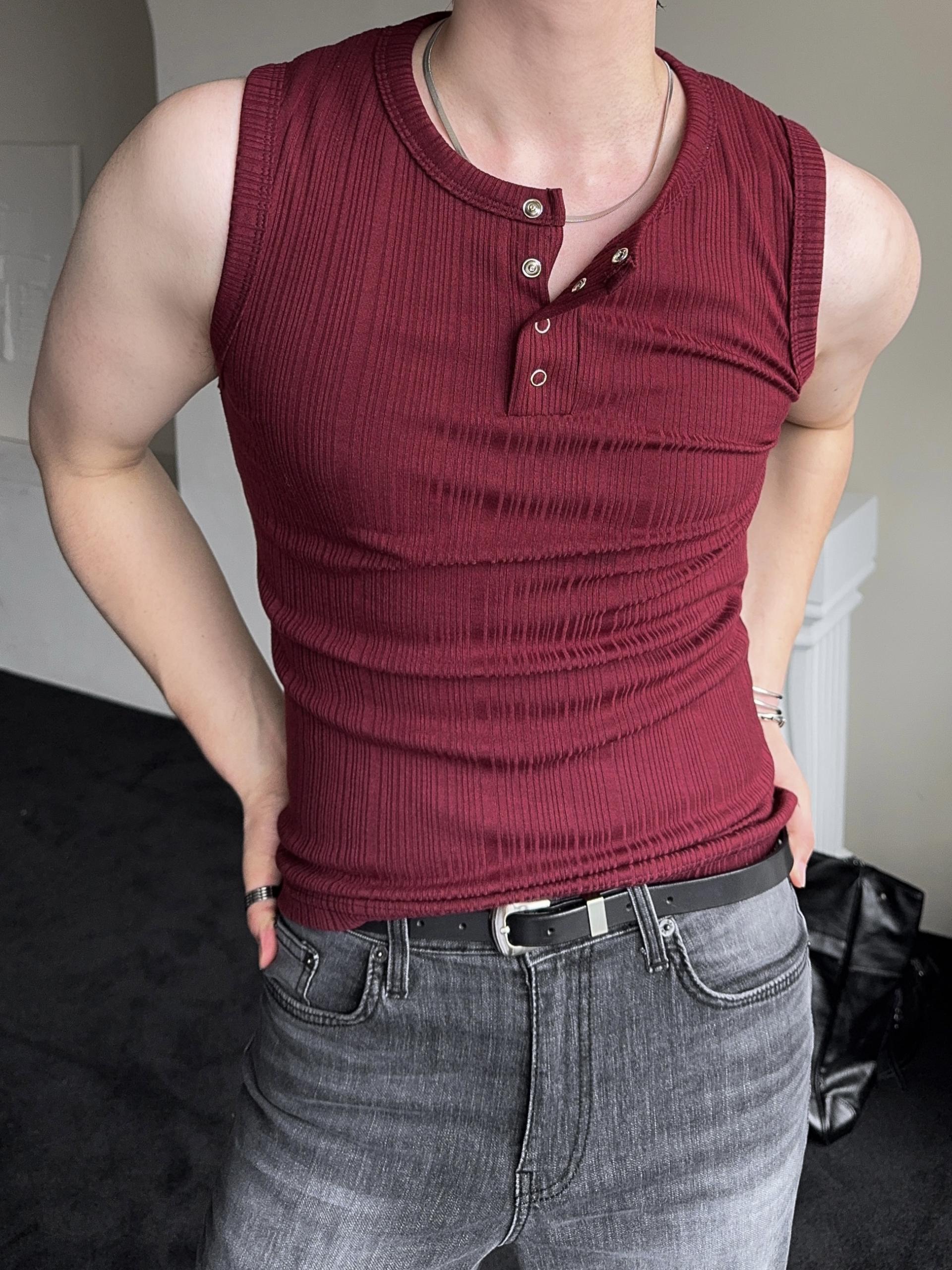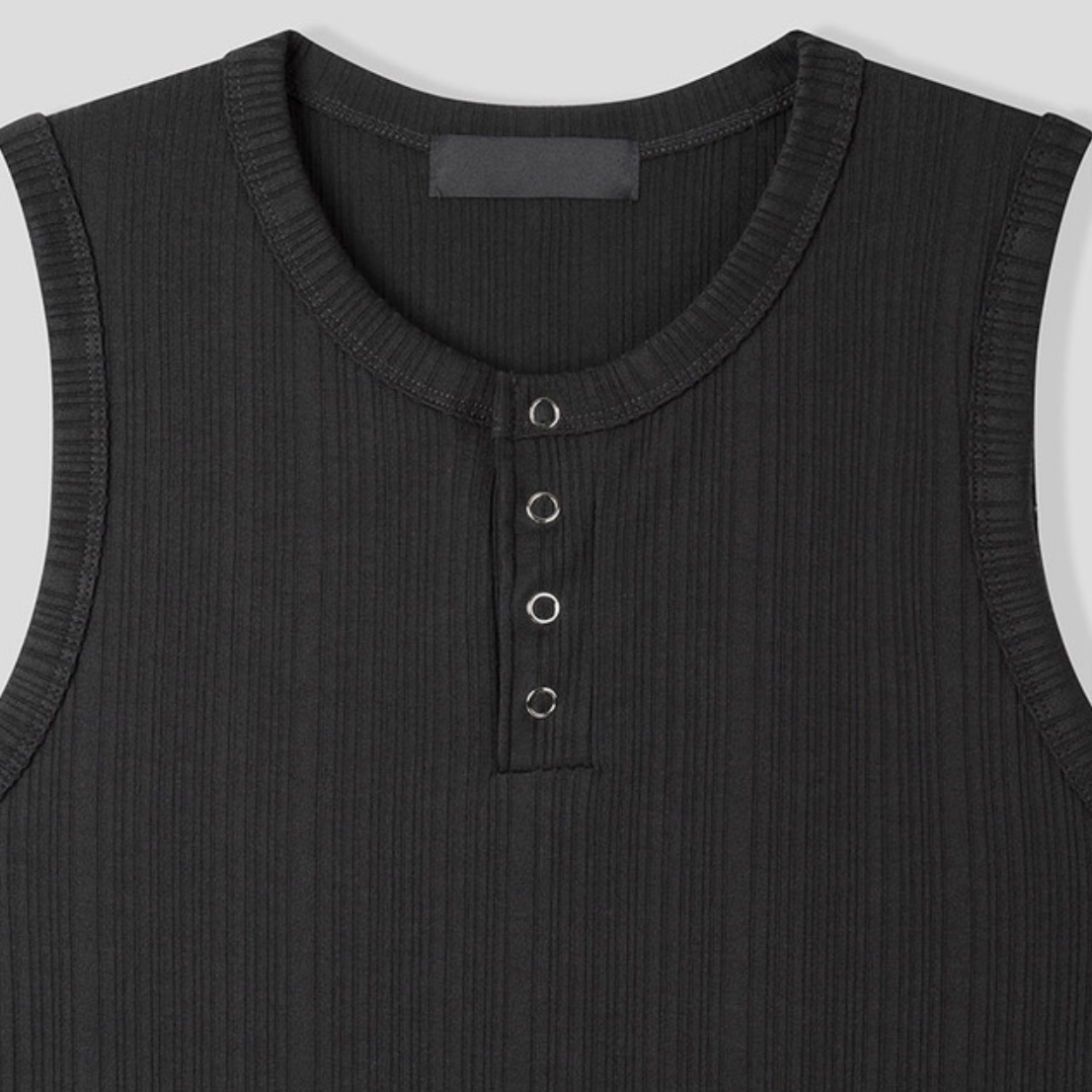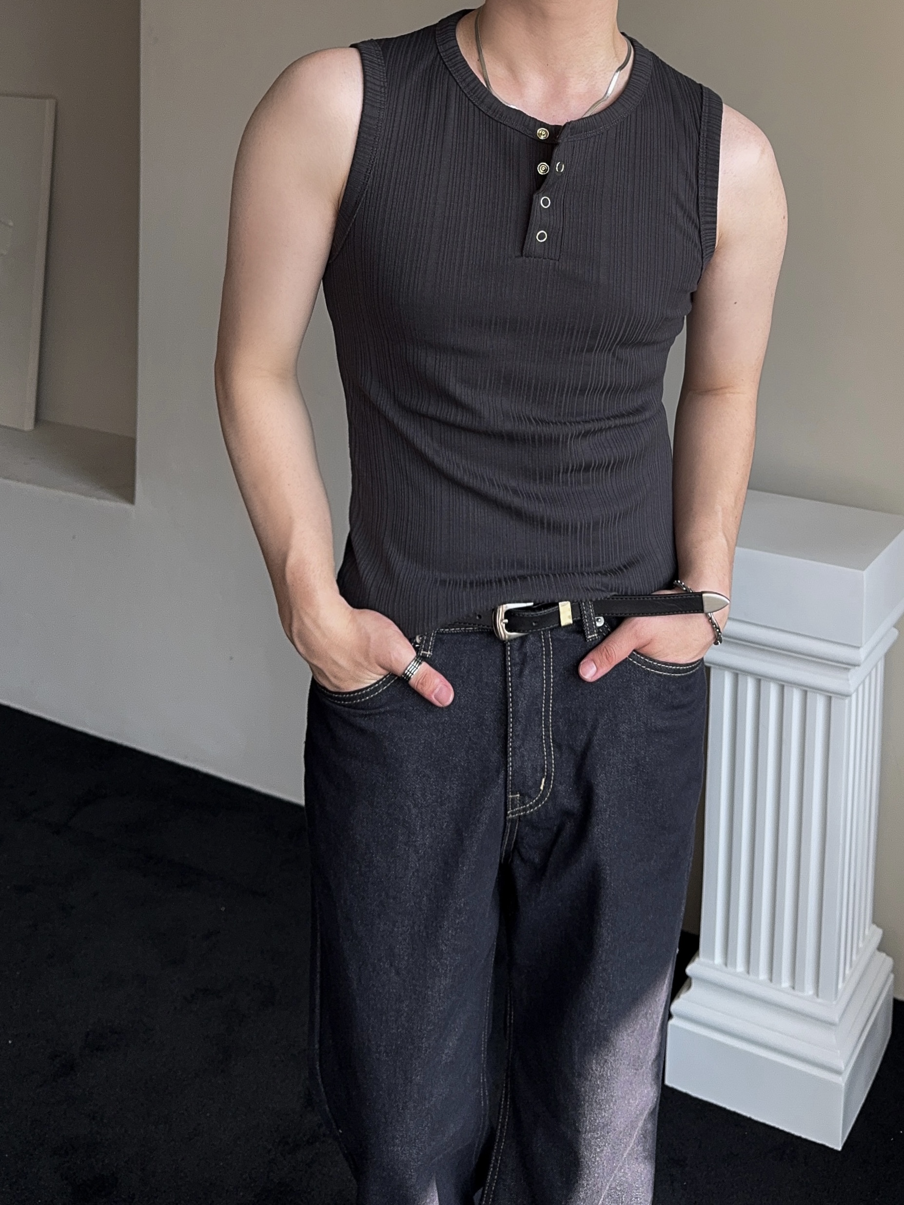 -얇은 골지 소재로 제작된 헨리넥 나시 티셔츠