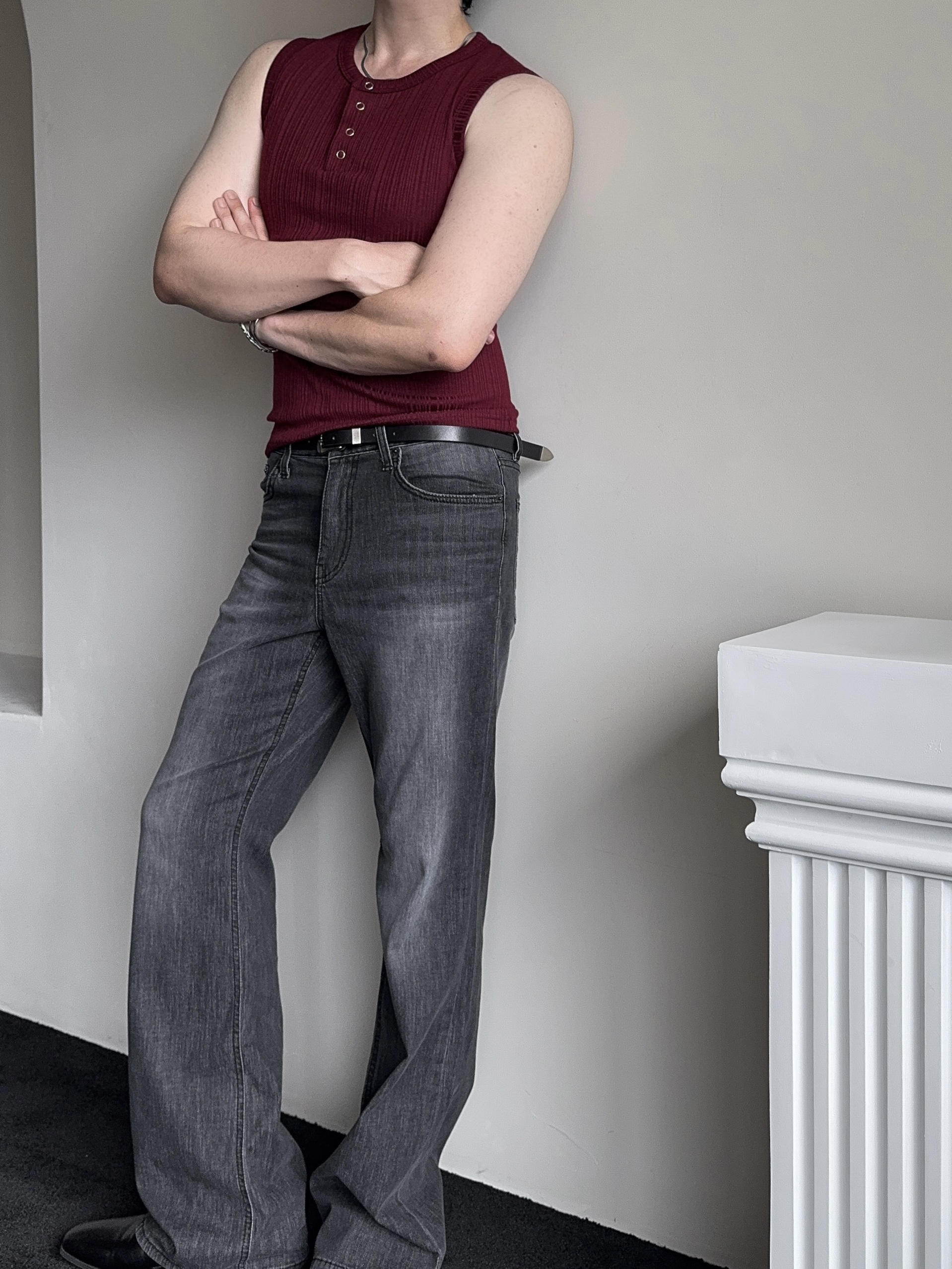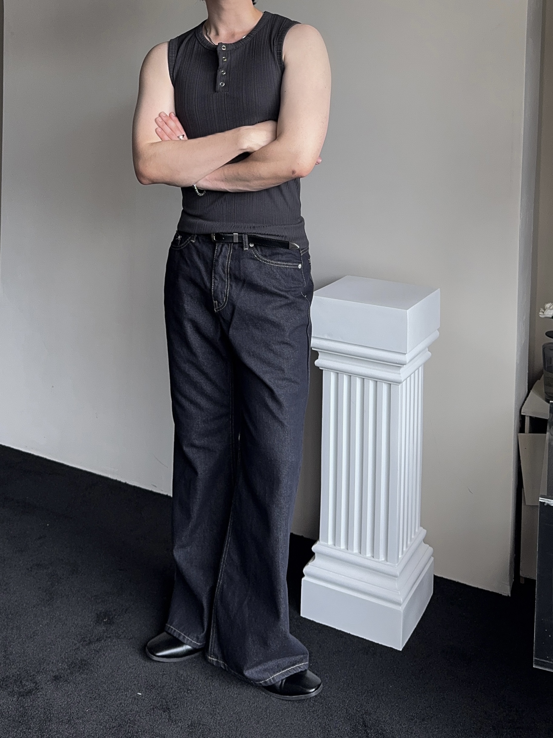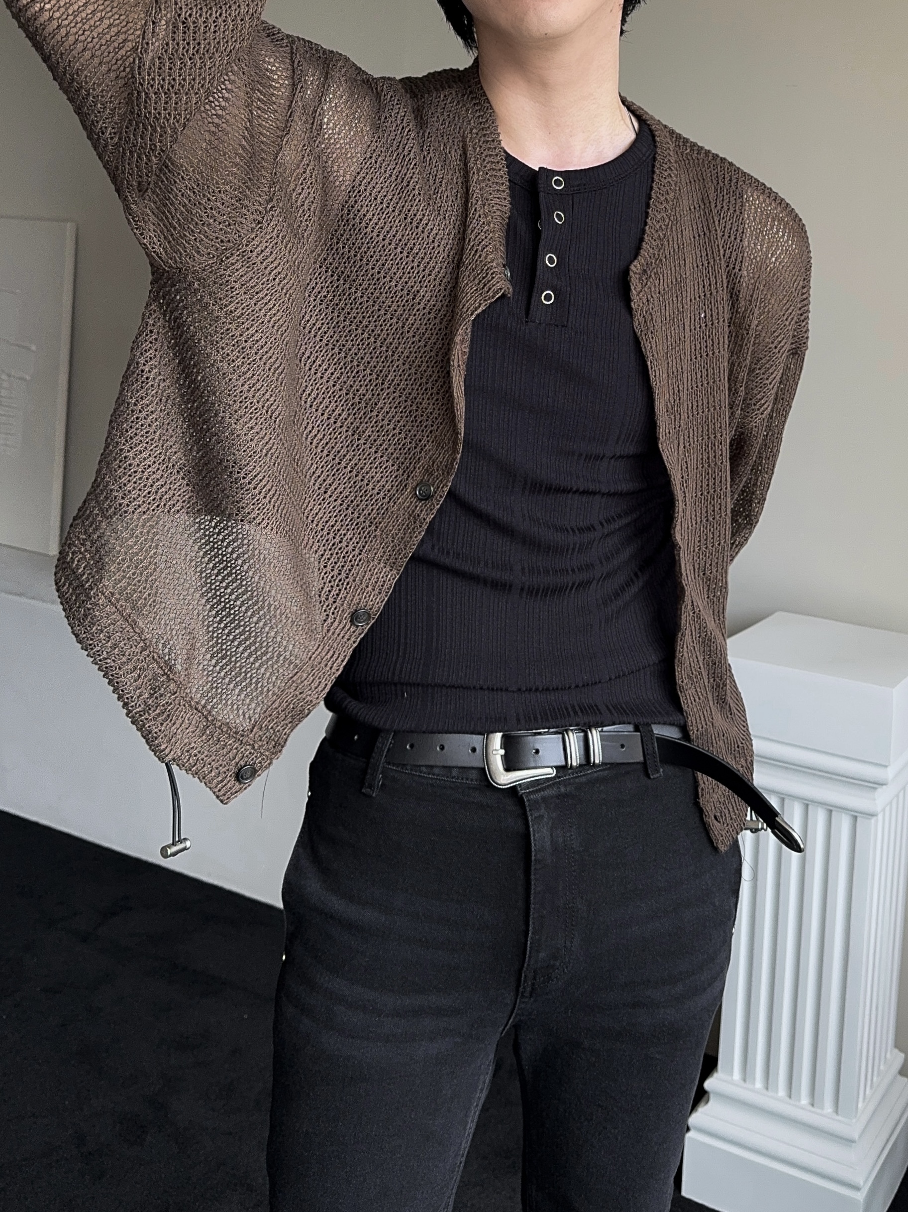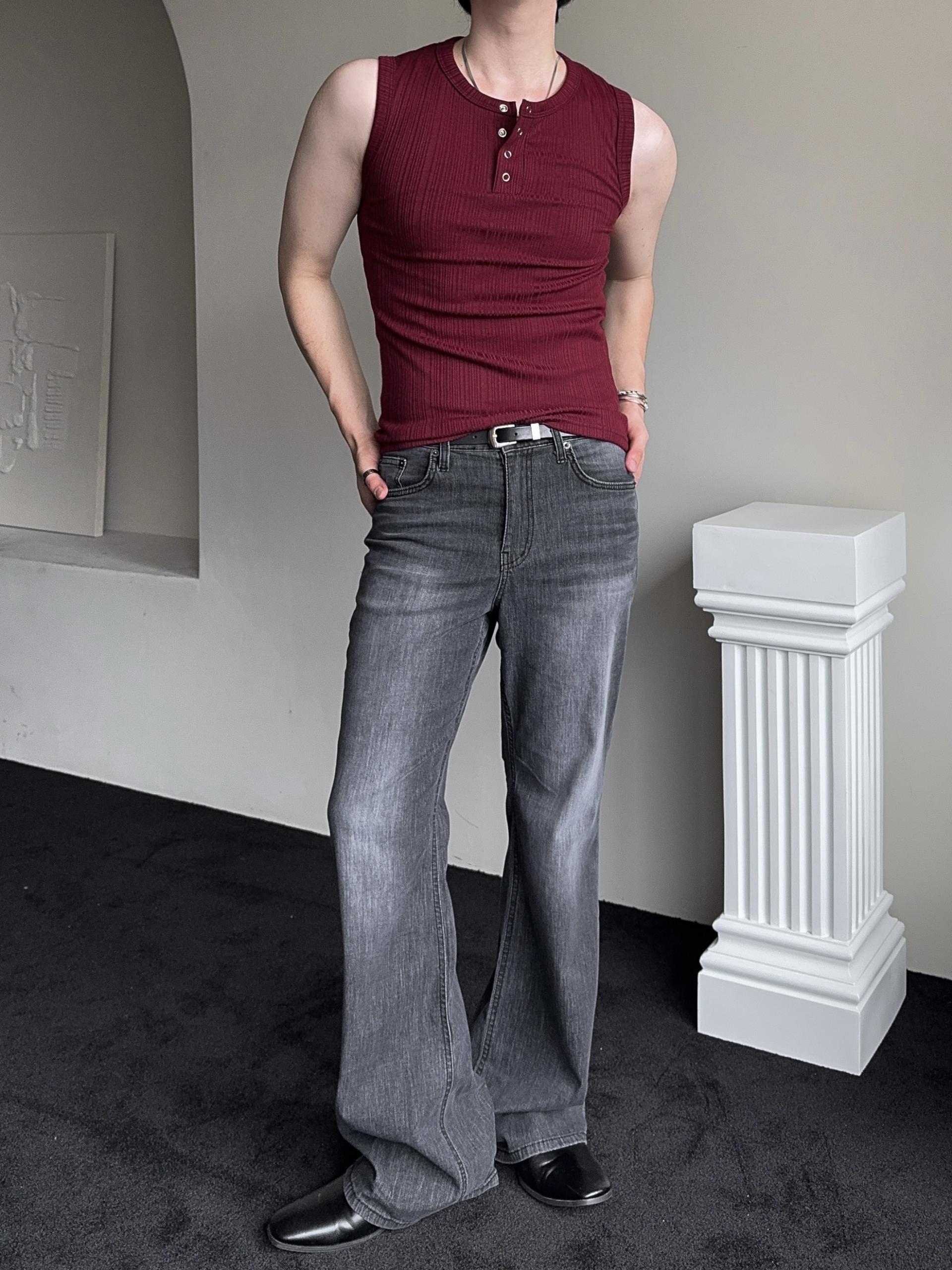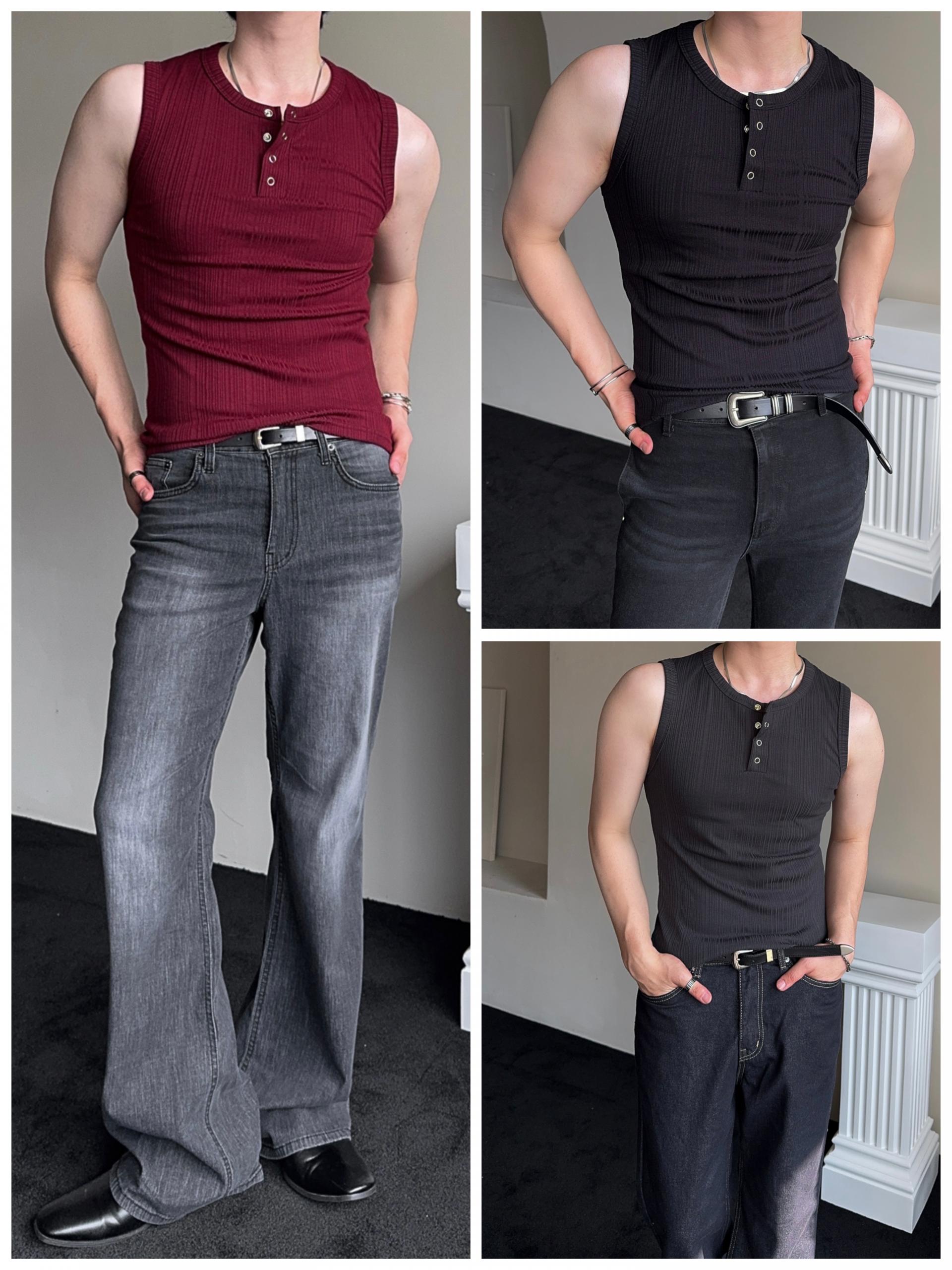 -얇은 골지 소재로 제작된 헨리넥 나시 티셔츠