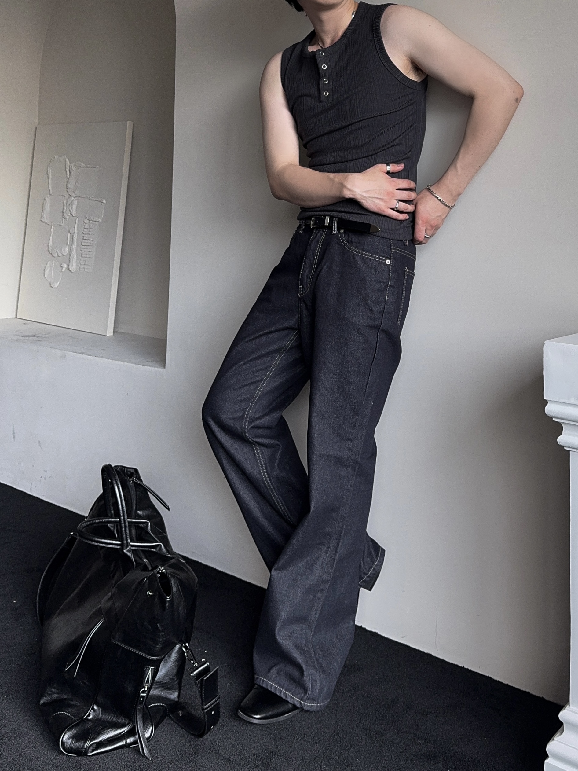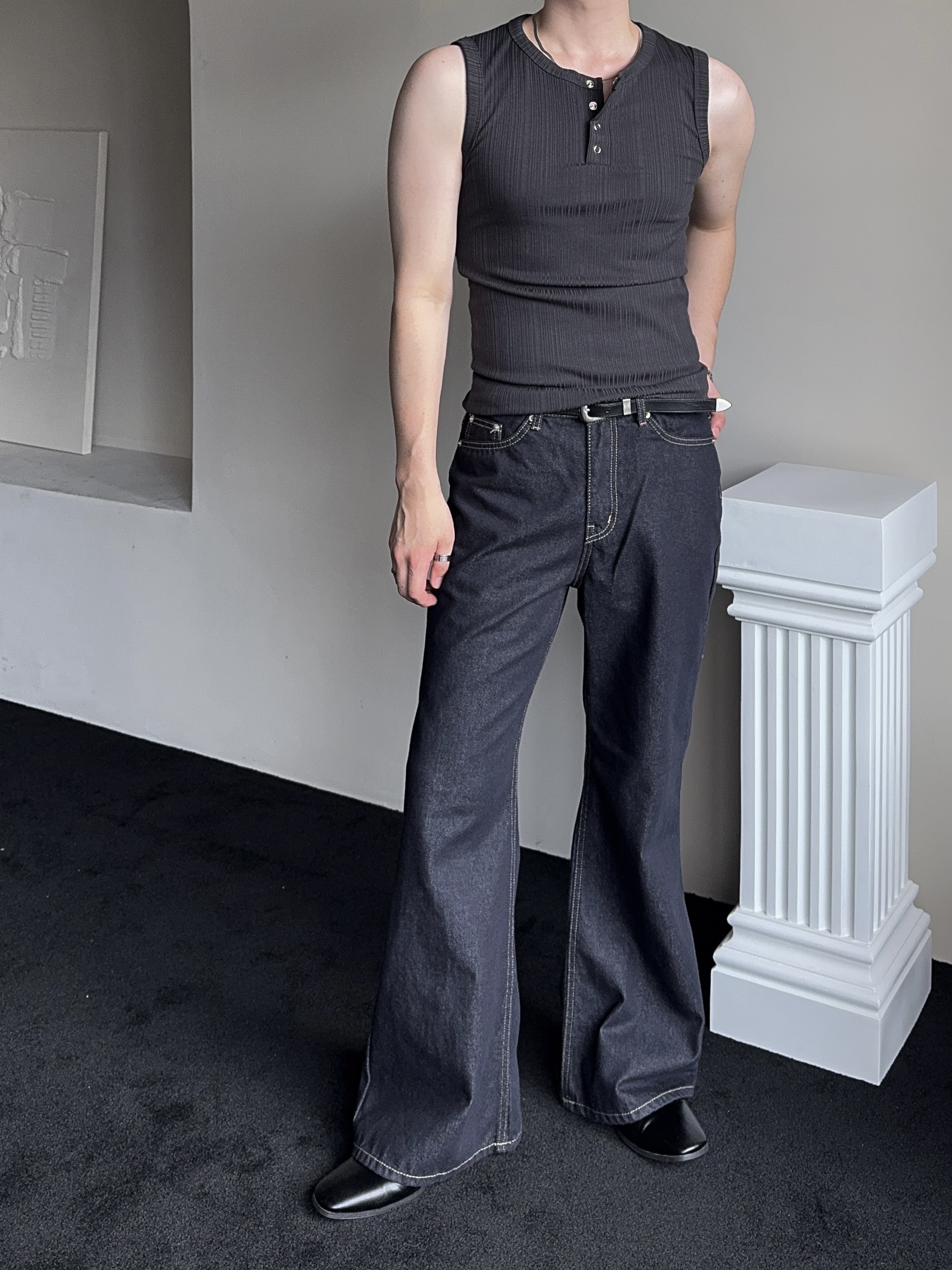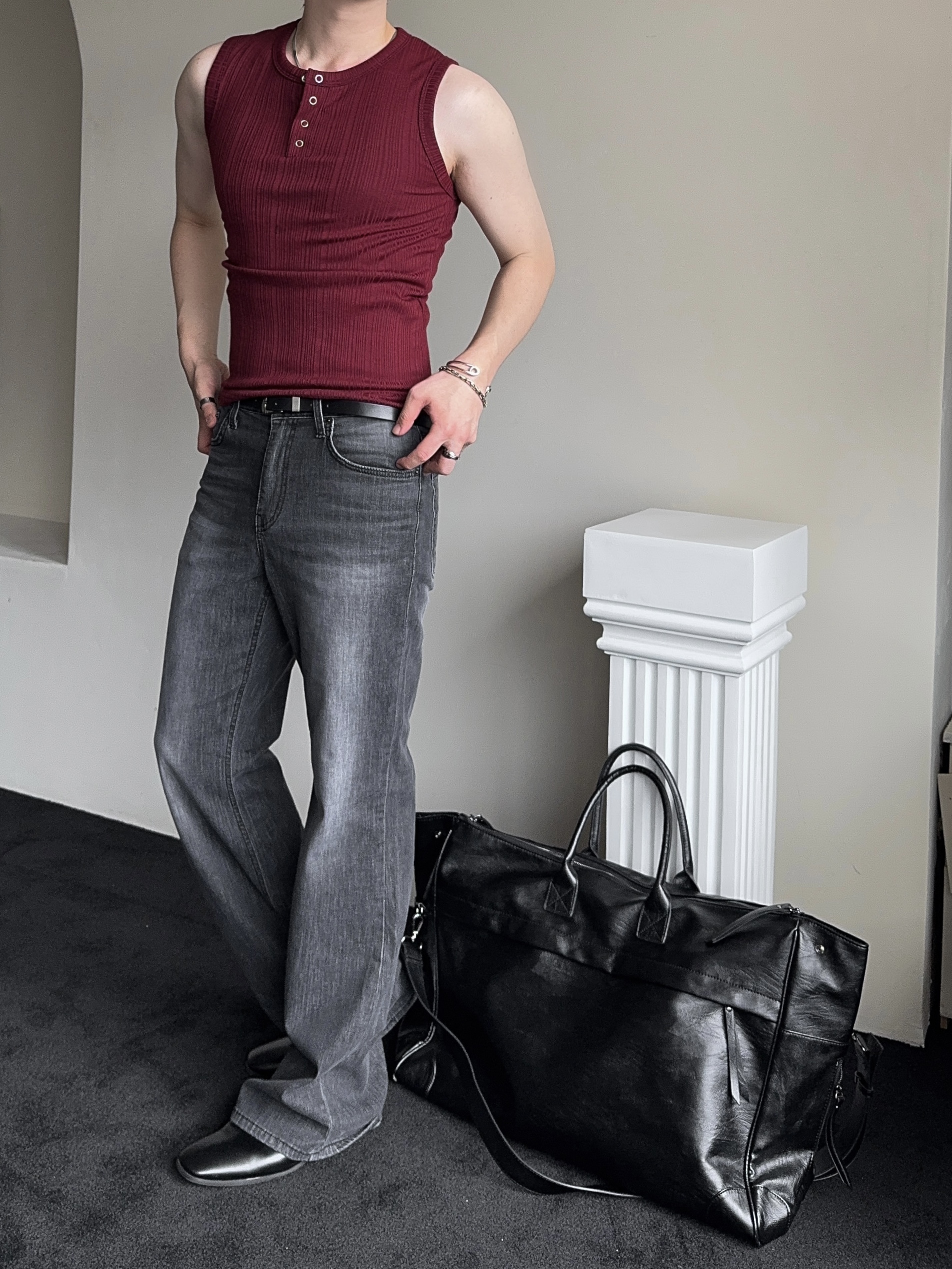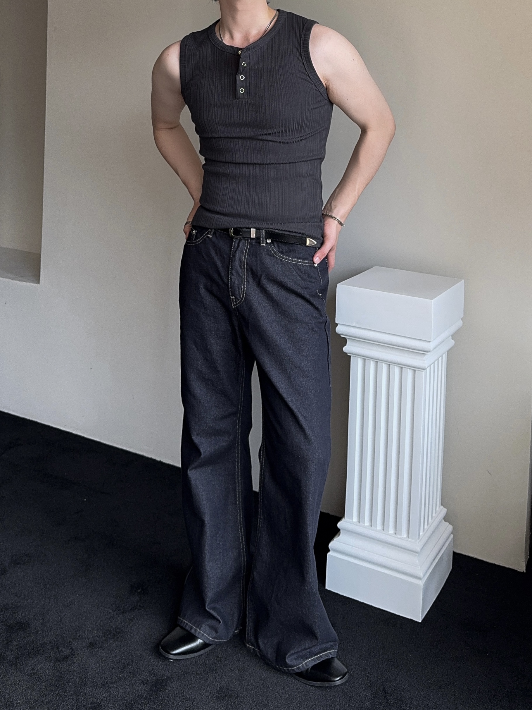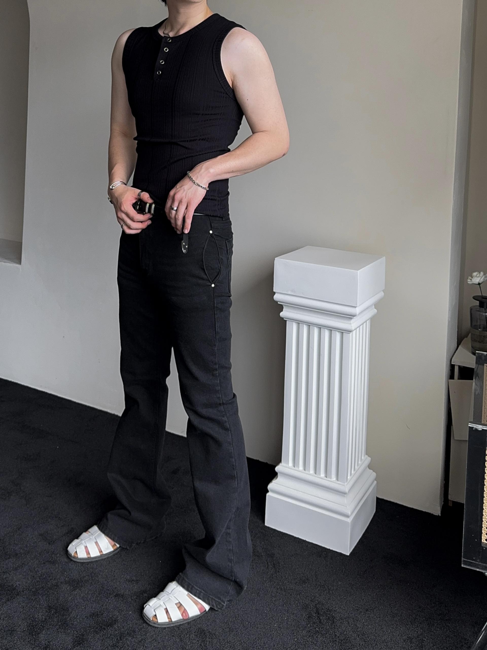 -얇은 골지 소재로 제작된 헨리넥 나시 티셔츠