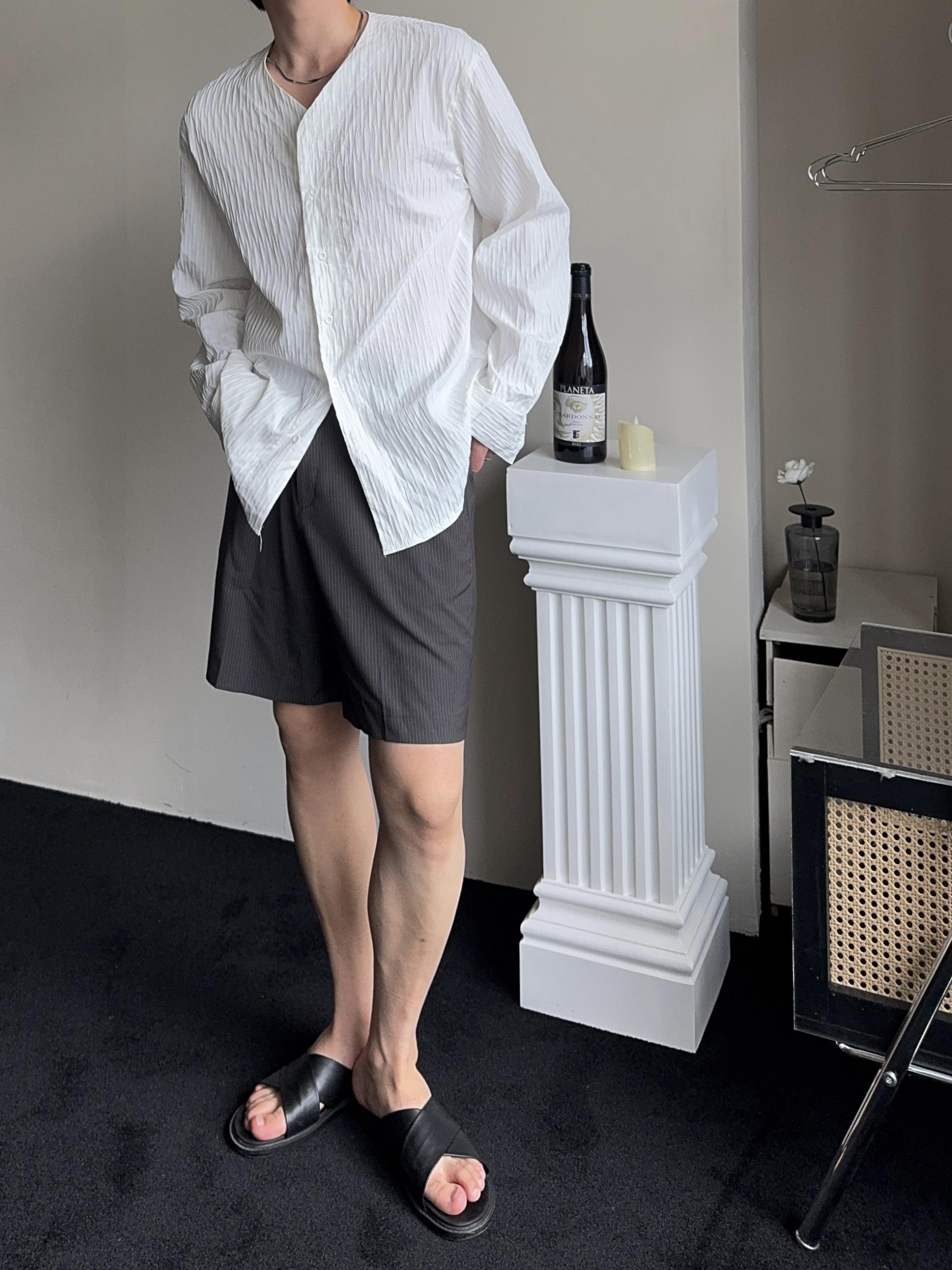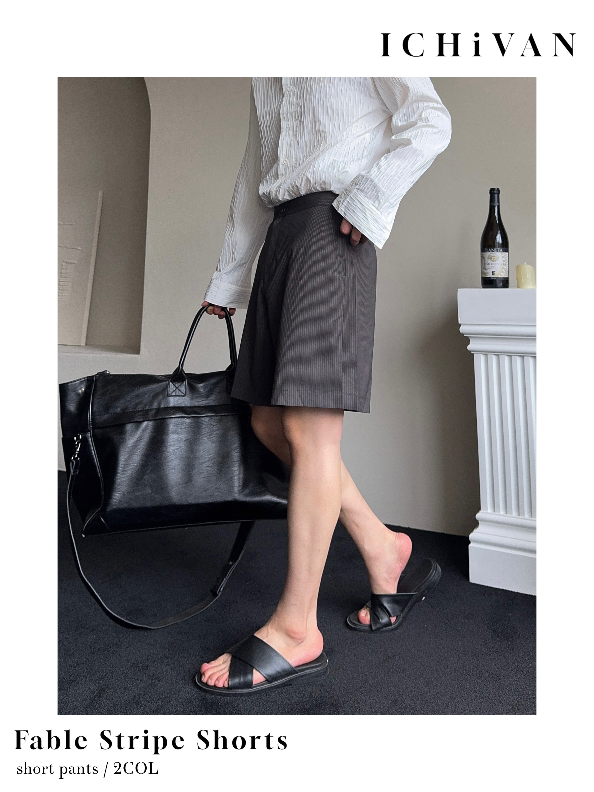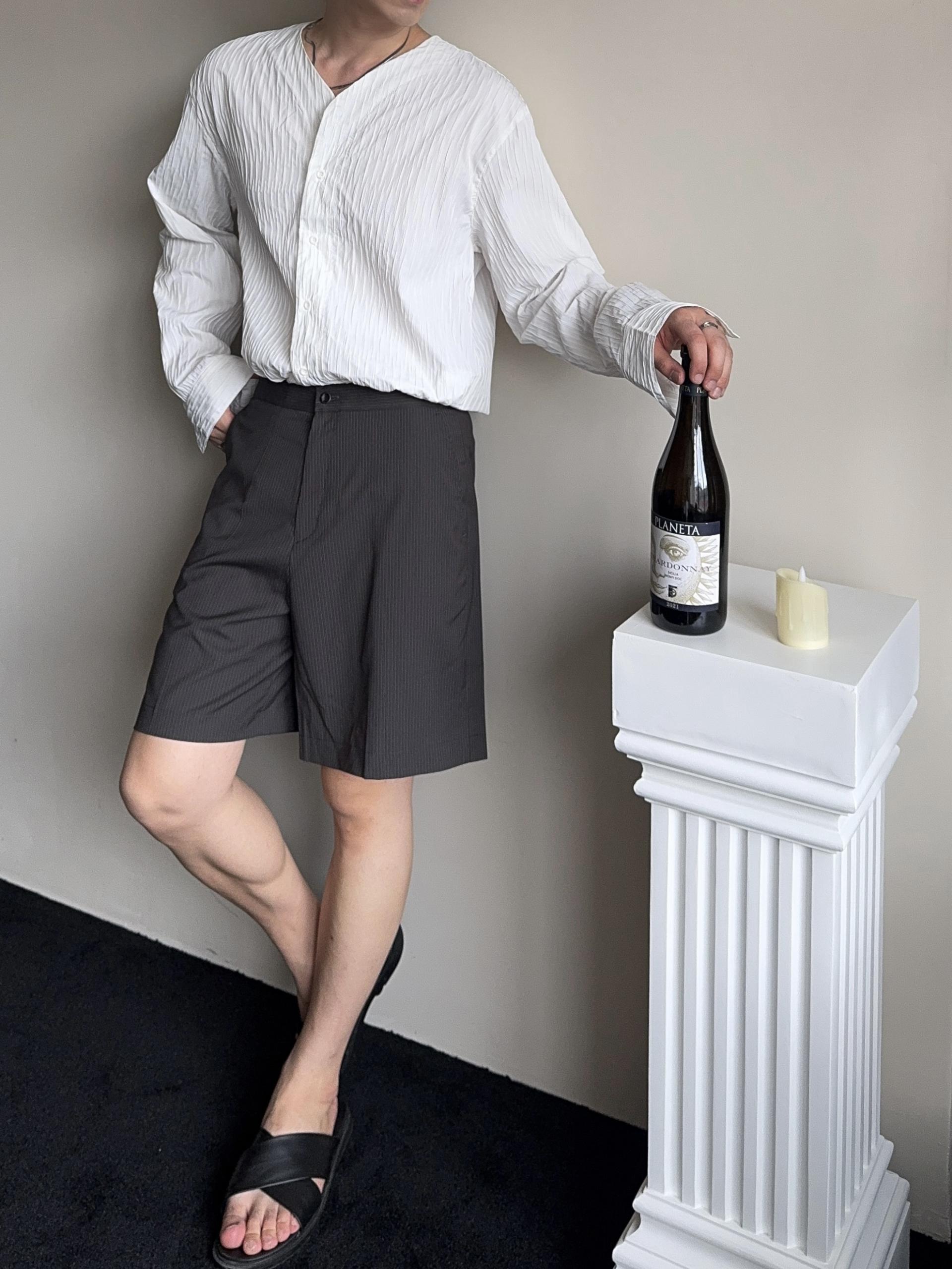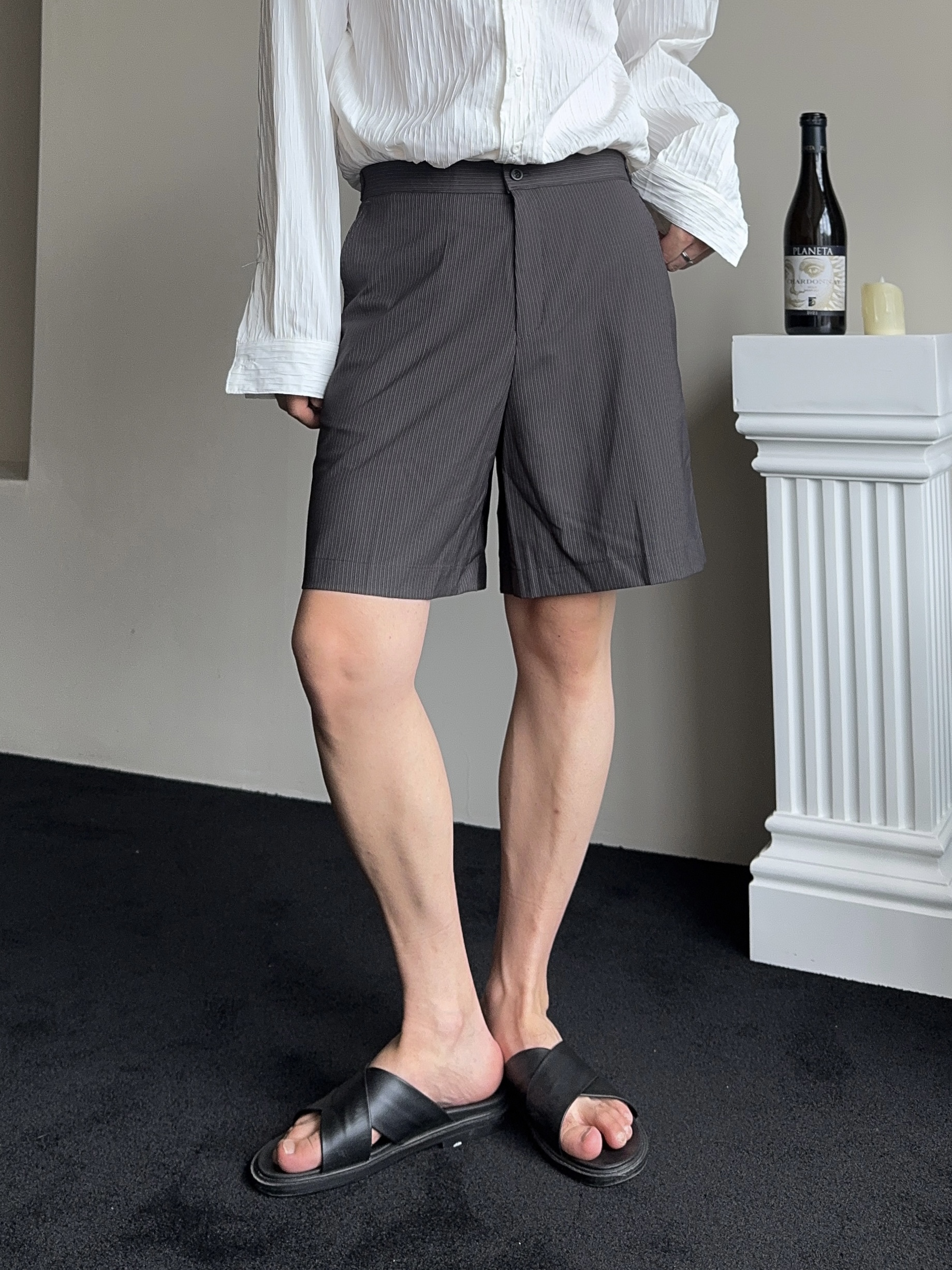 -올시즌 트렌디 숏 기장감의 스트라이프 패턴의 쇼츠 슬랙스