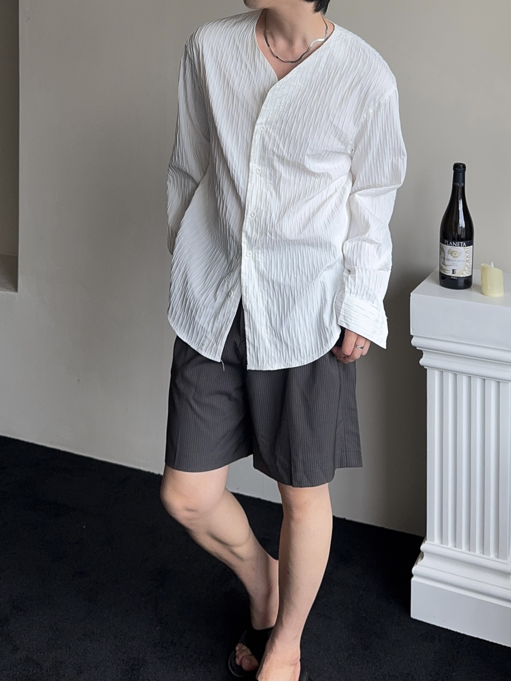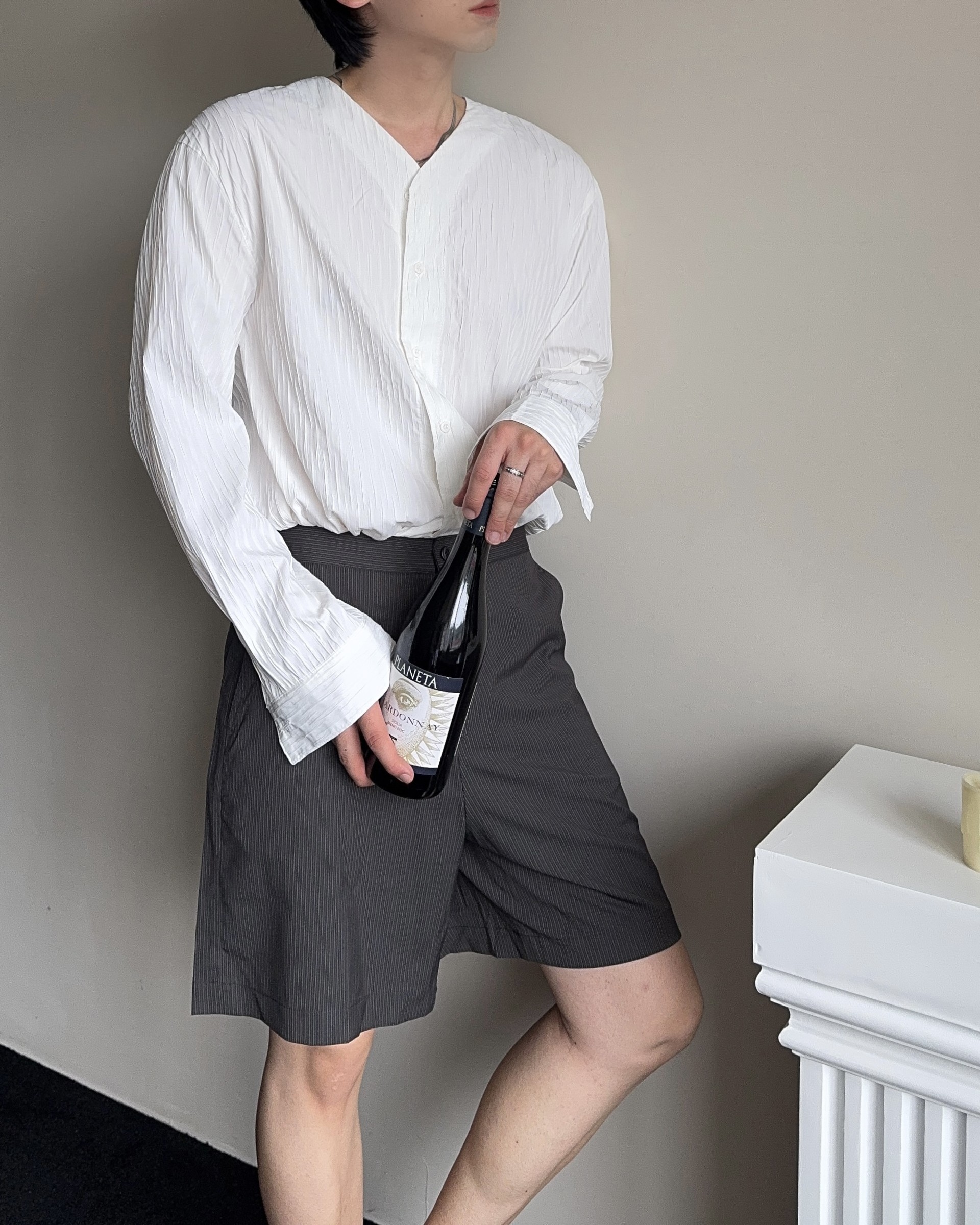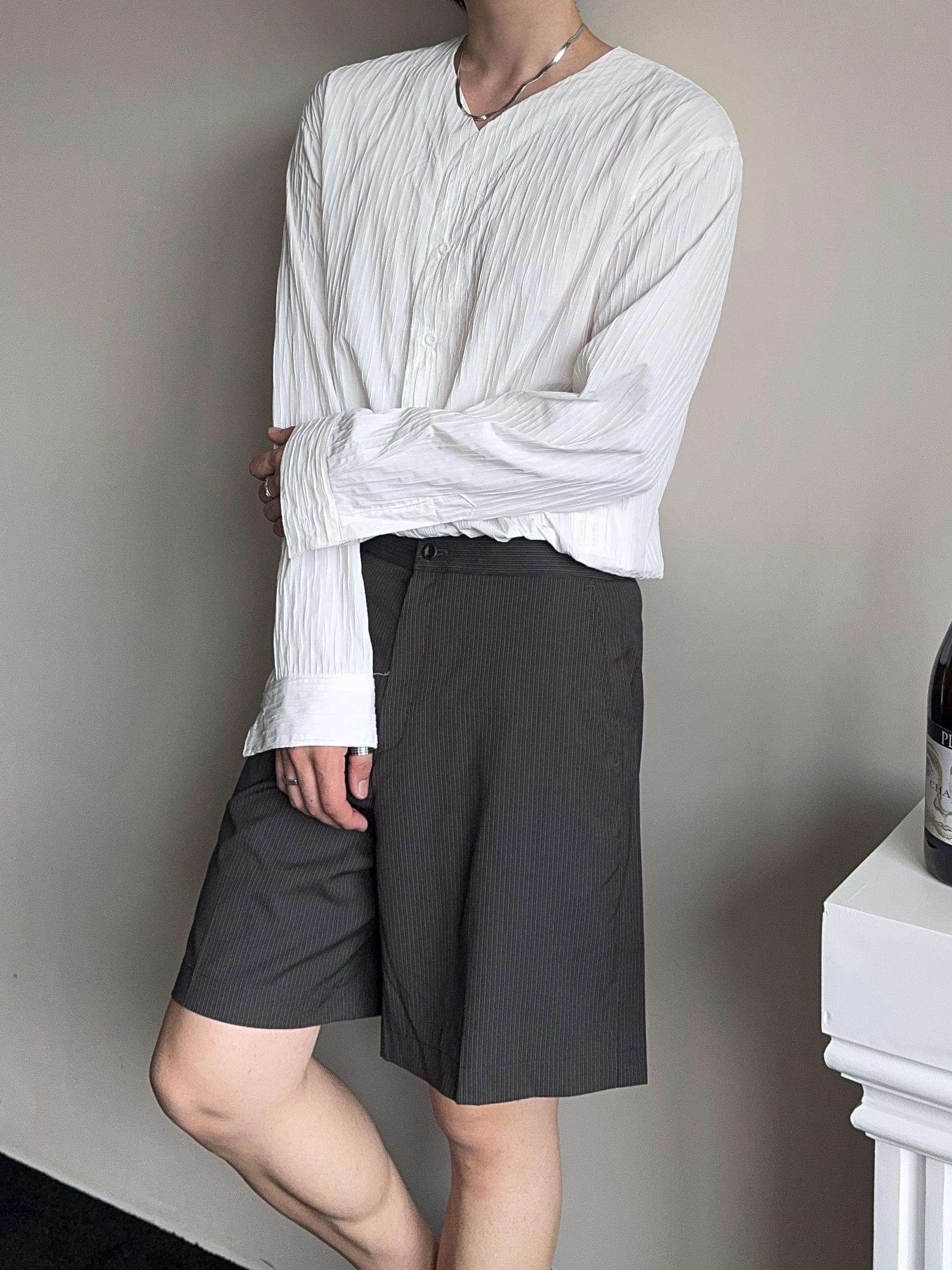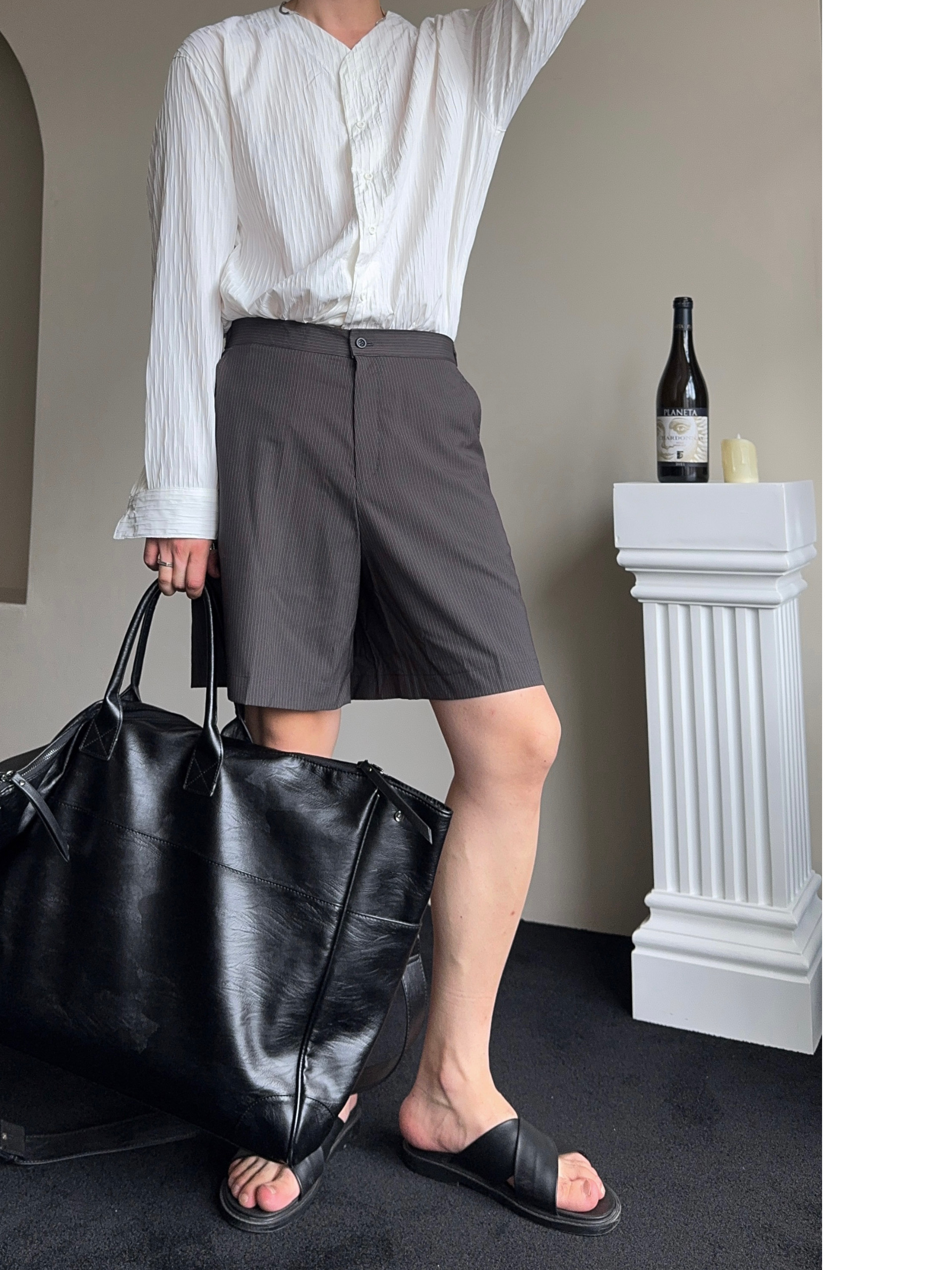 -올시즌 트렌디 숏 기장감의 스트라이프 패턴의 쇼츠 슬랙스