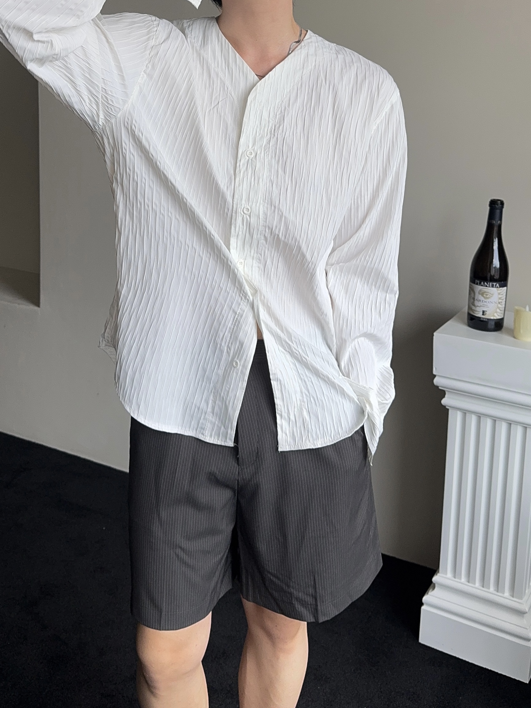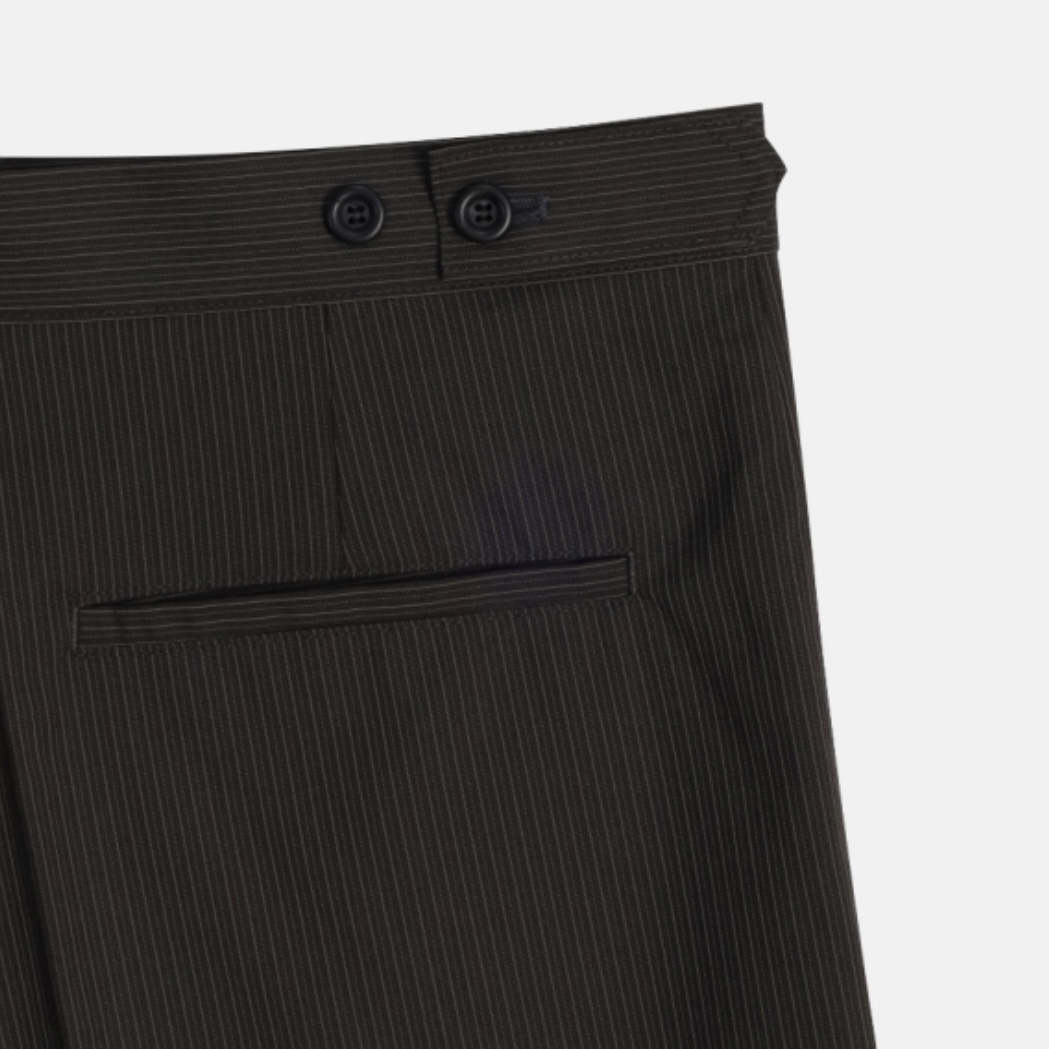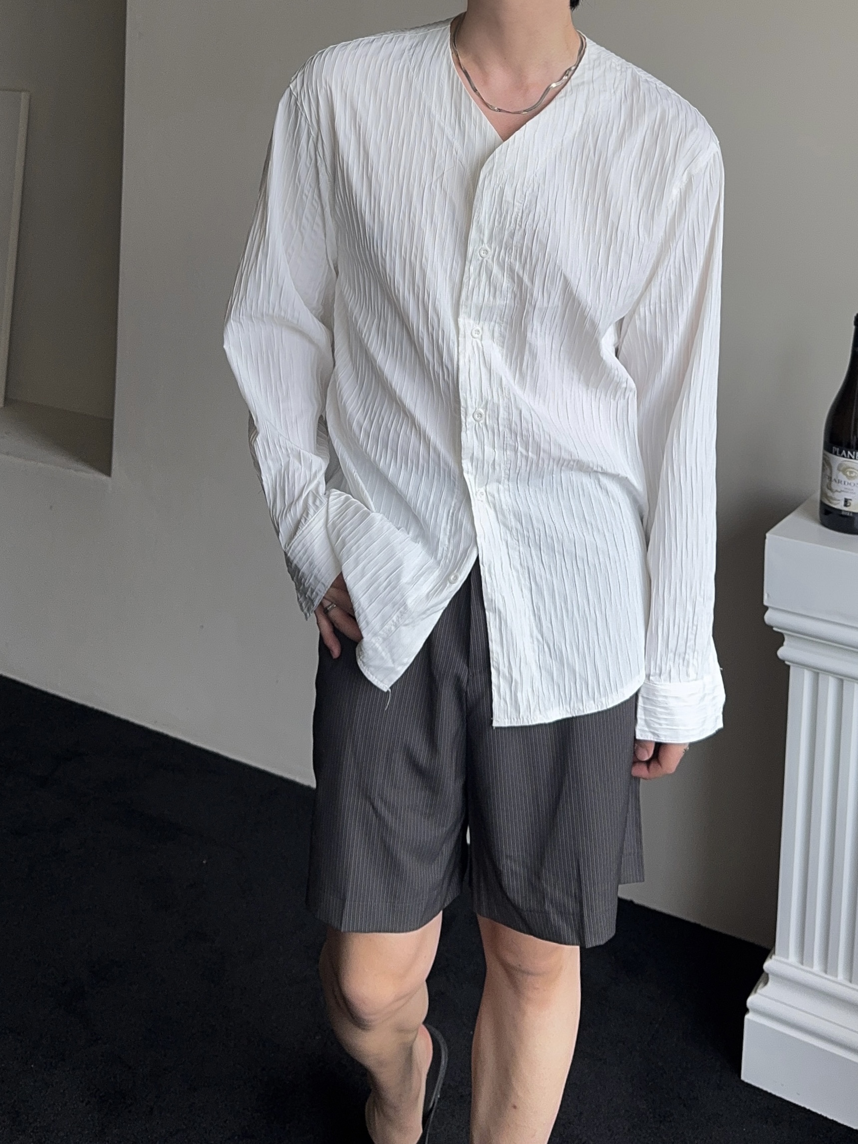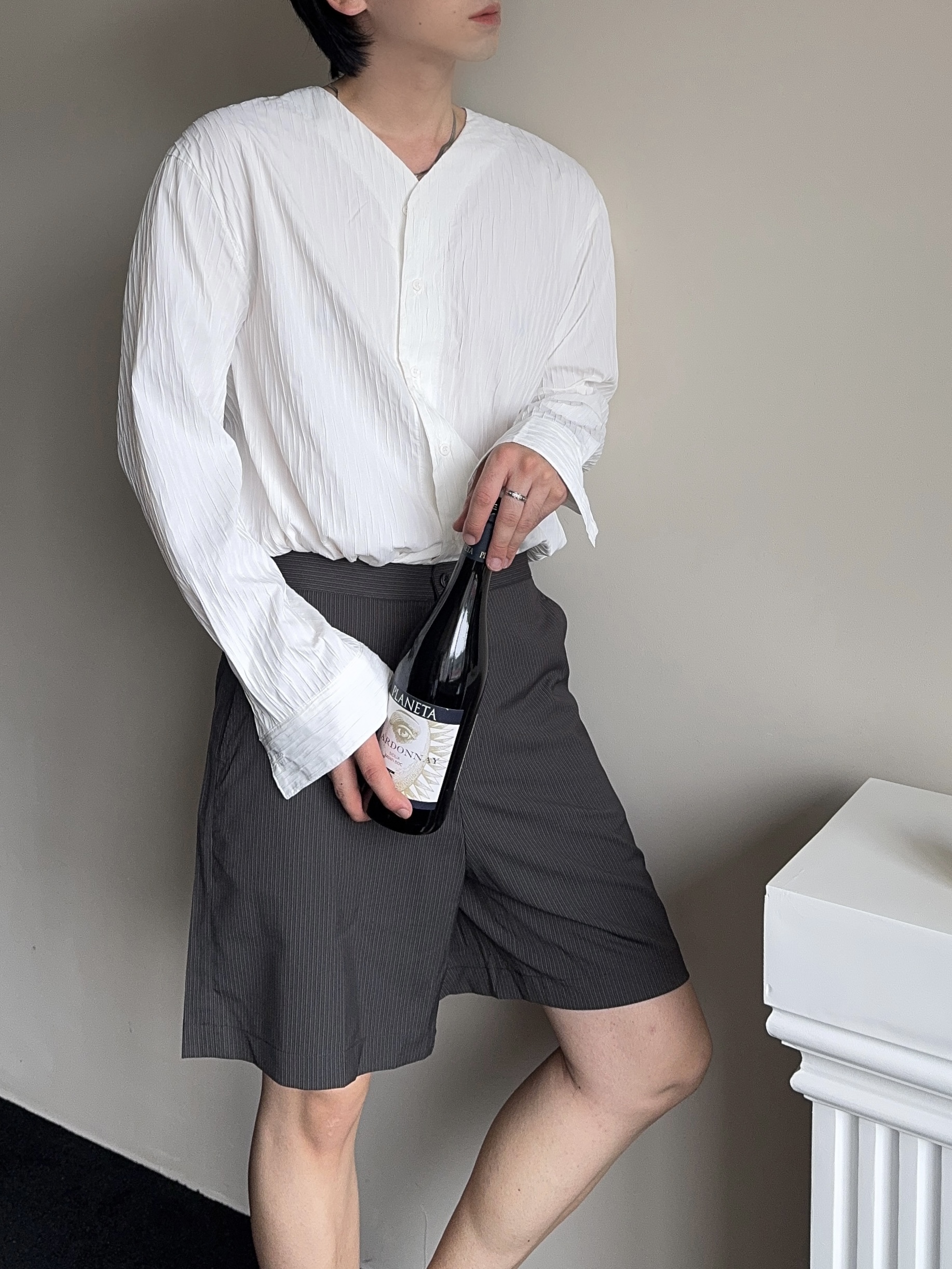 -올시즌 트렌디 숏 기장감의 스트라이프 패턴의 쇼츠 슬랙스