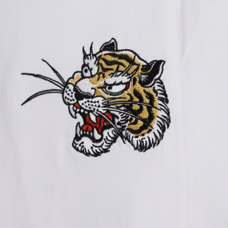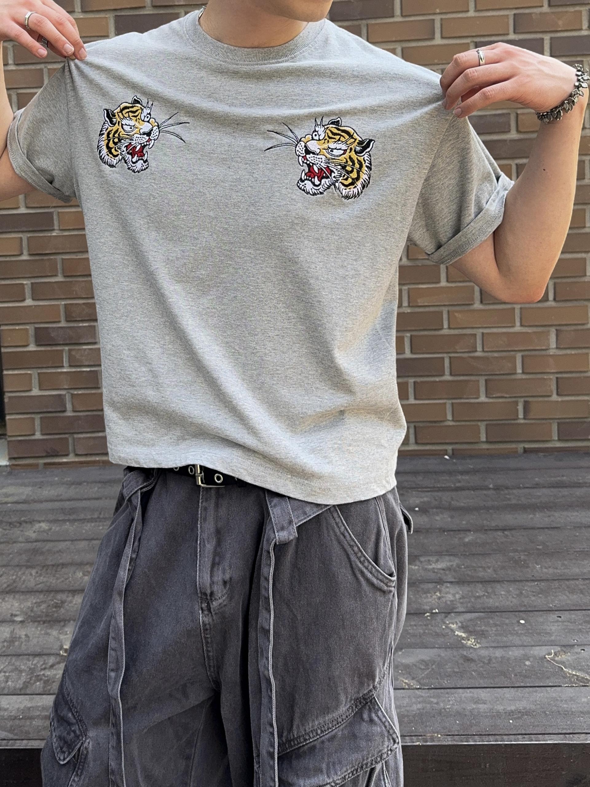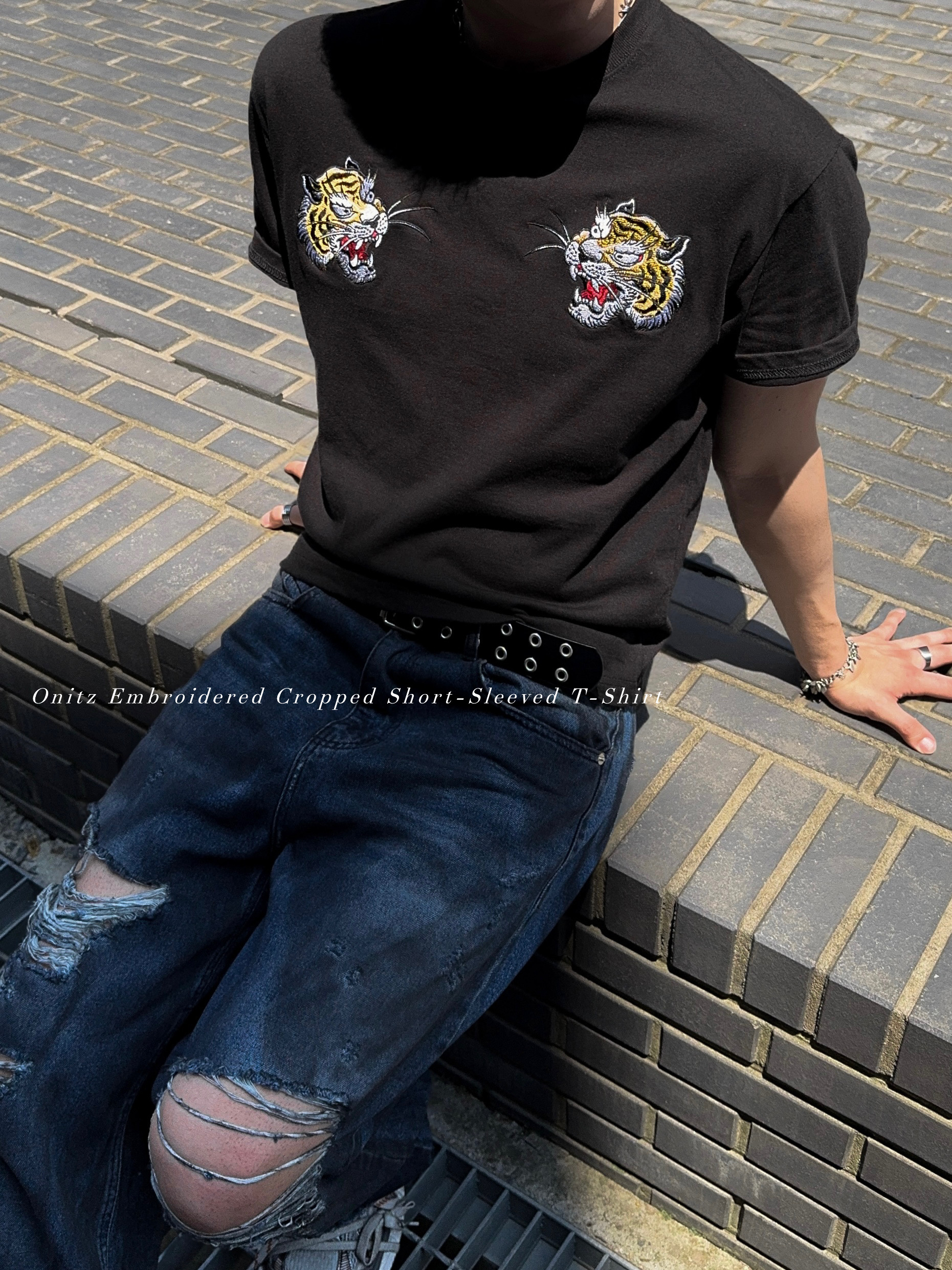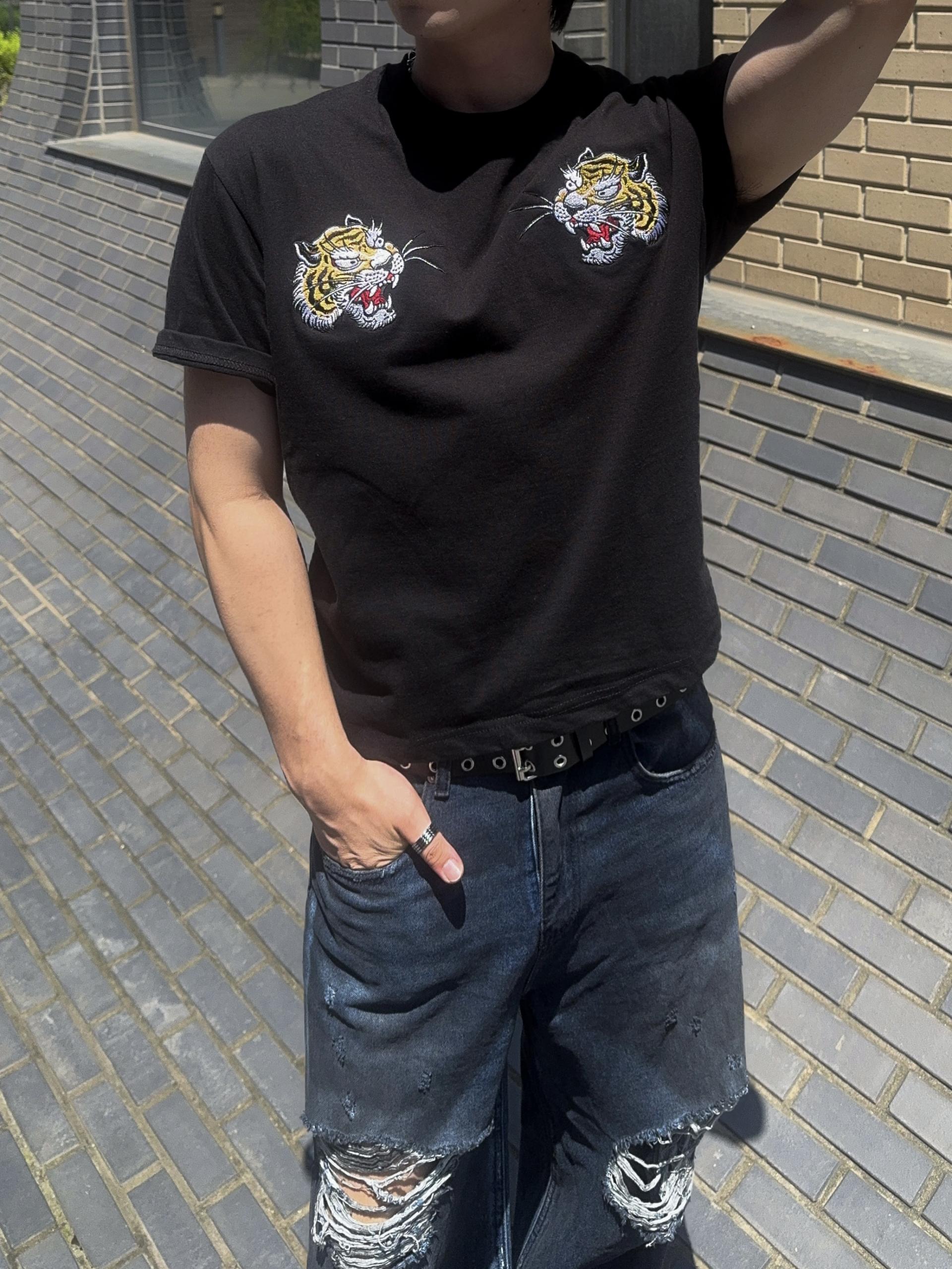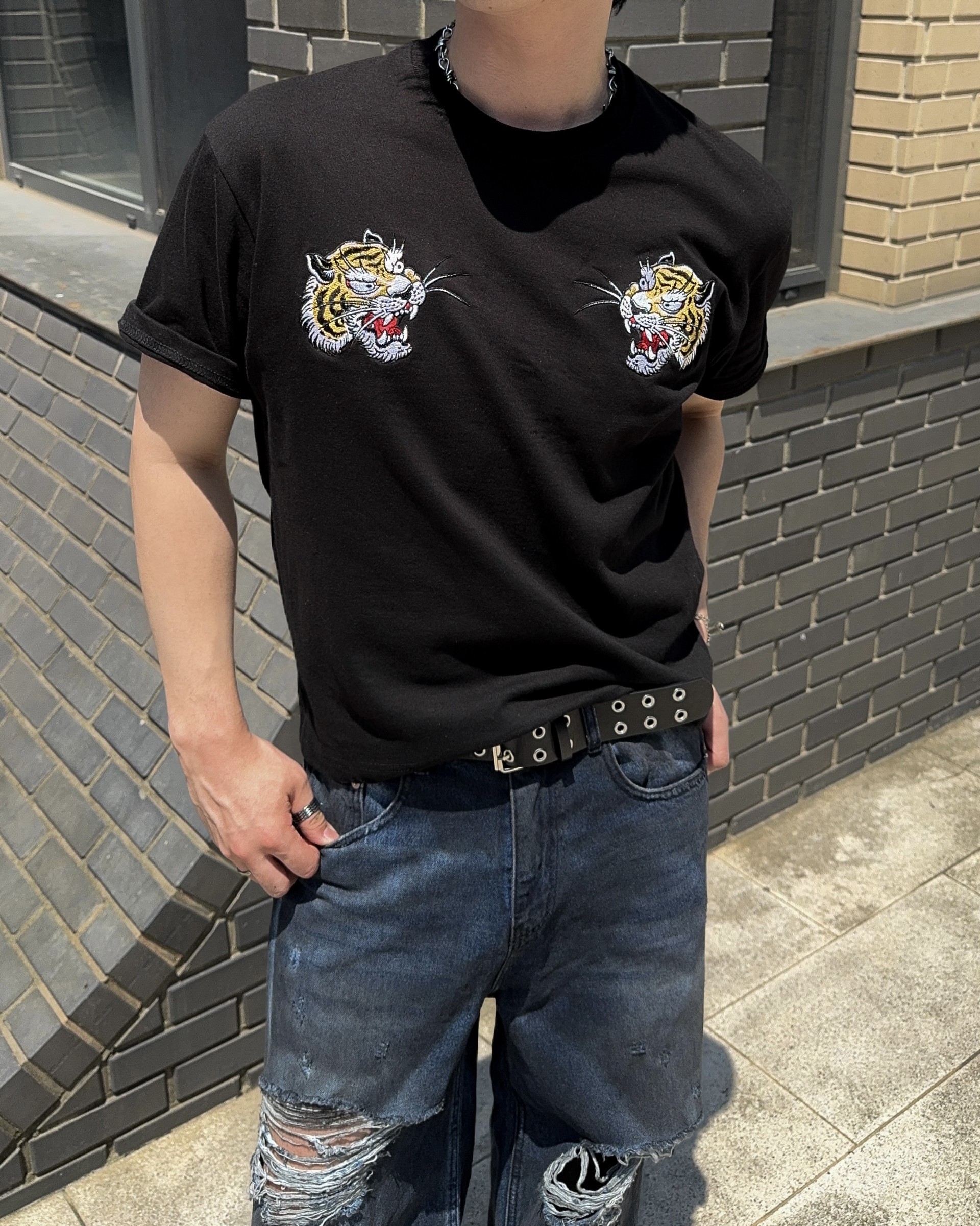 -타이거 스카잔 자수 포인트의 크롭 반팔 티셔츠