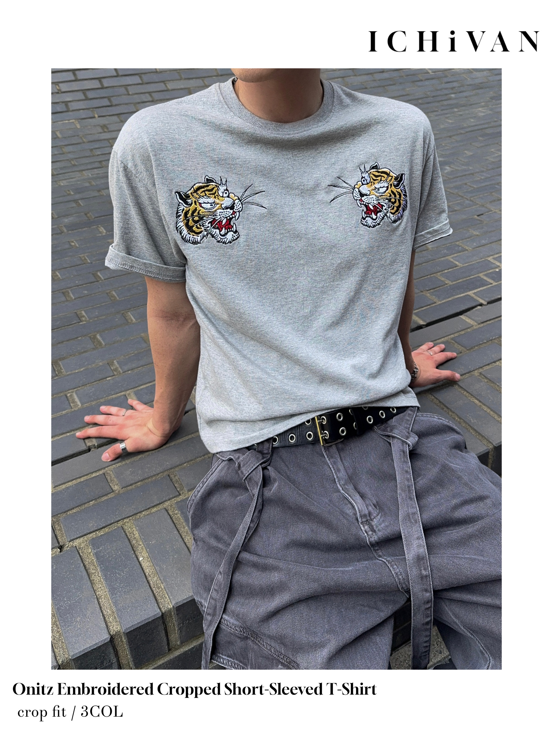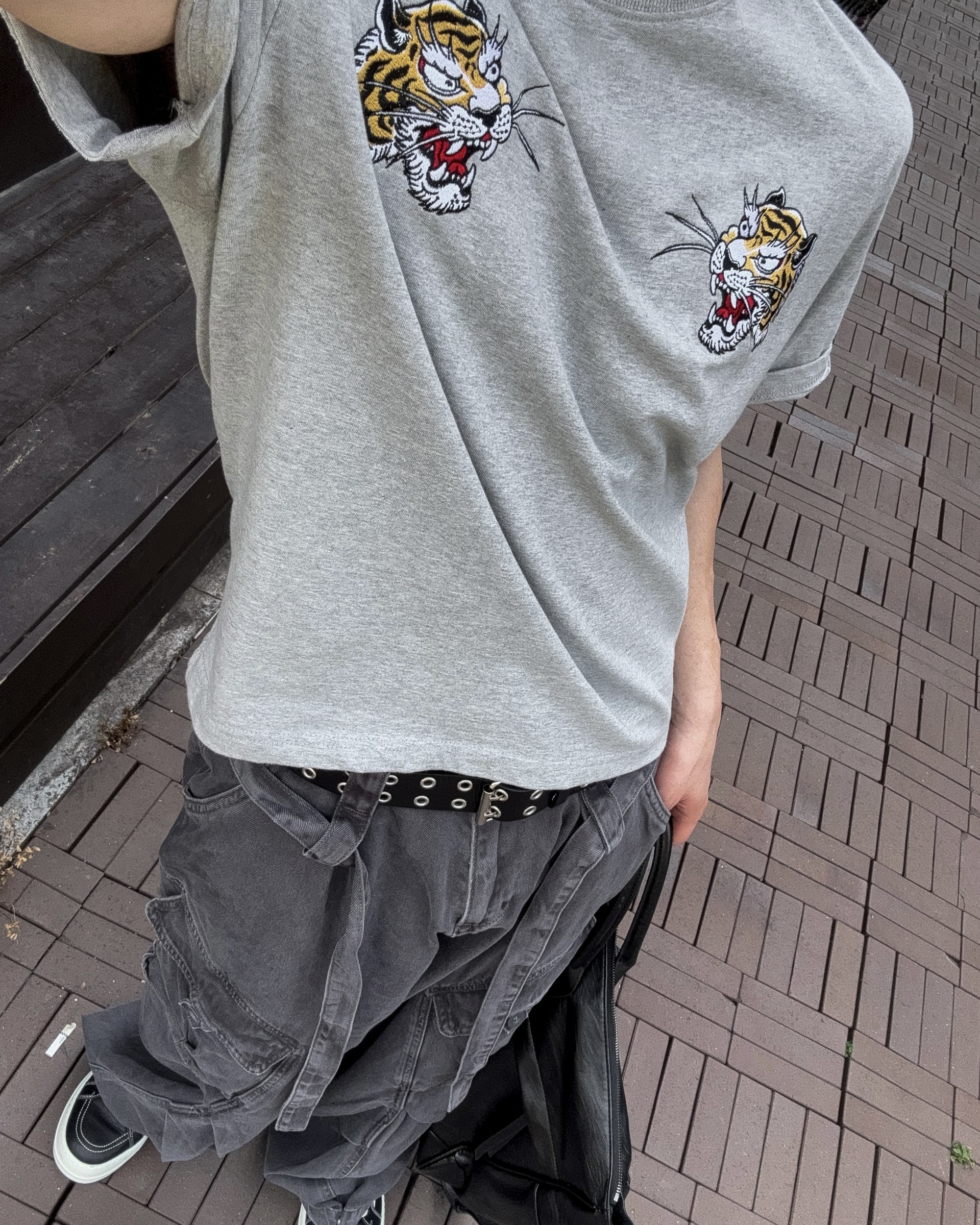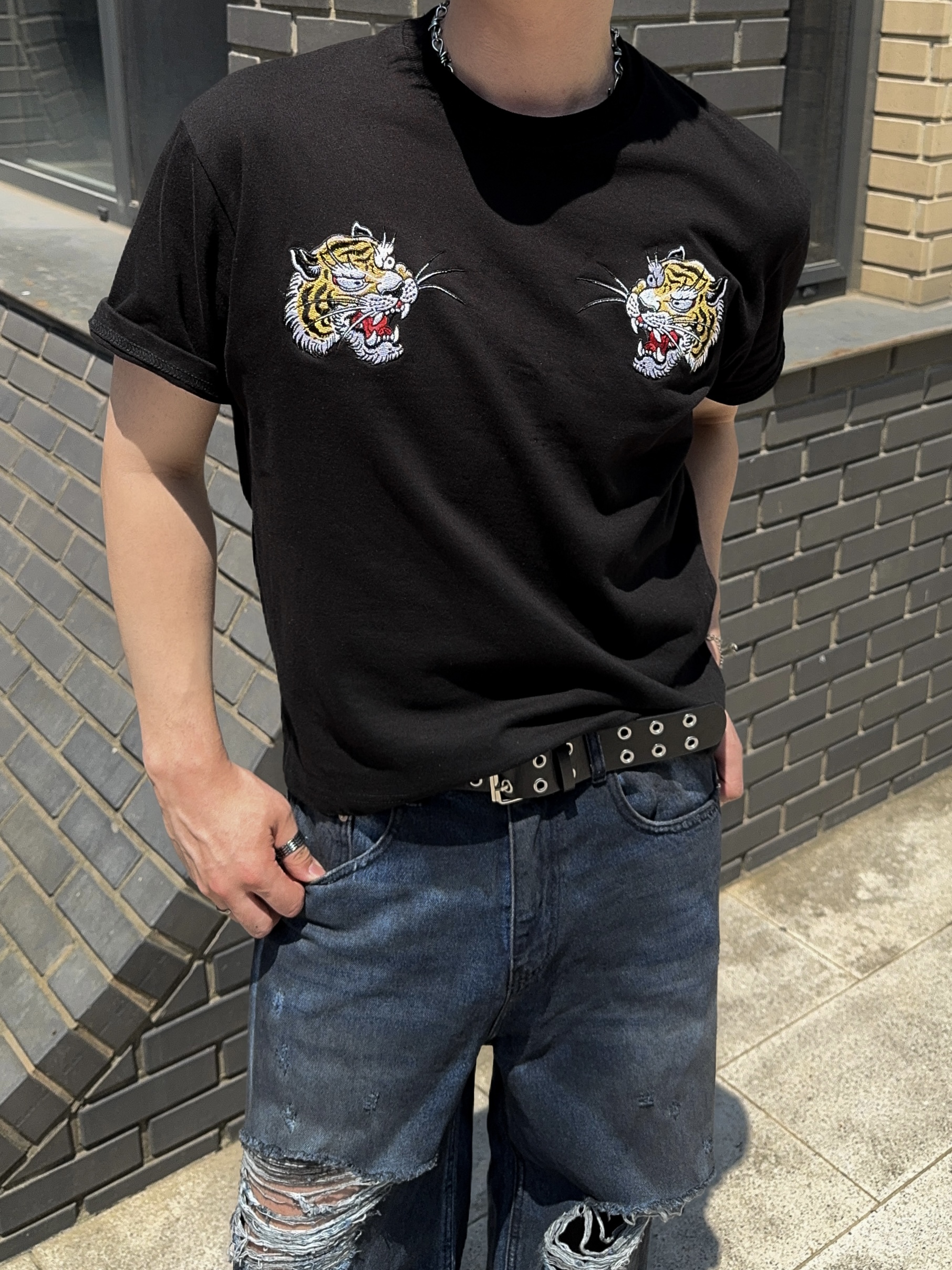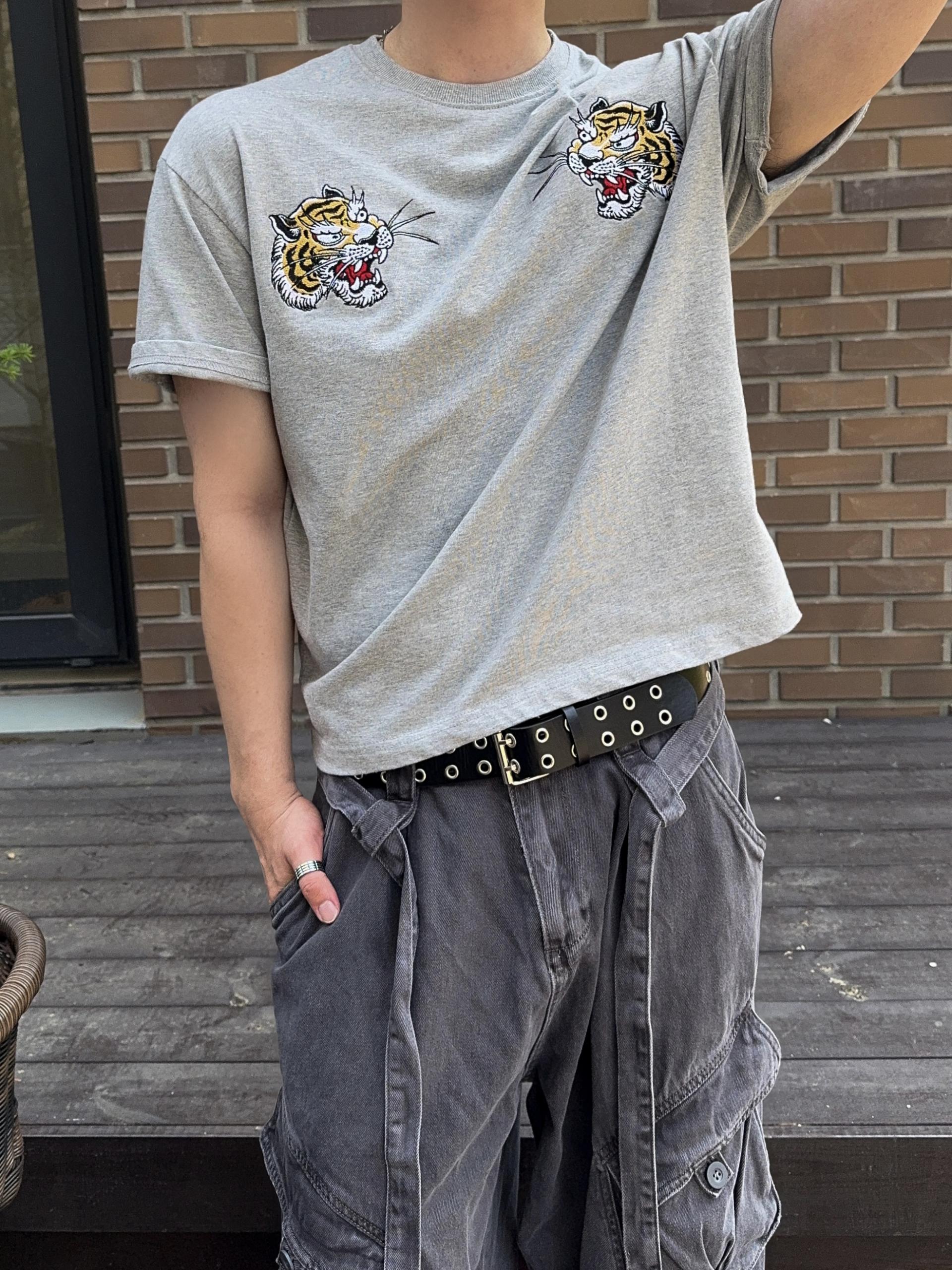 -타이거 스카잔 자수 포인트의 크롭 반팔 티셔츠