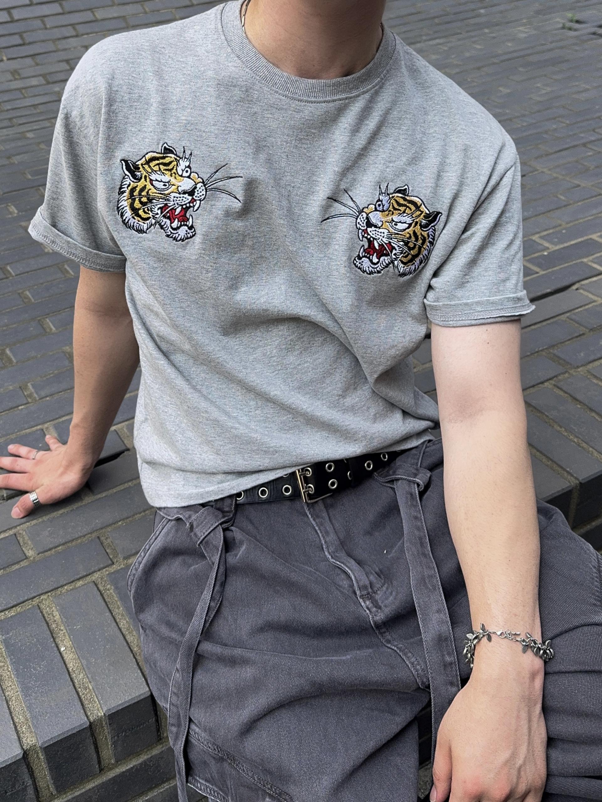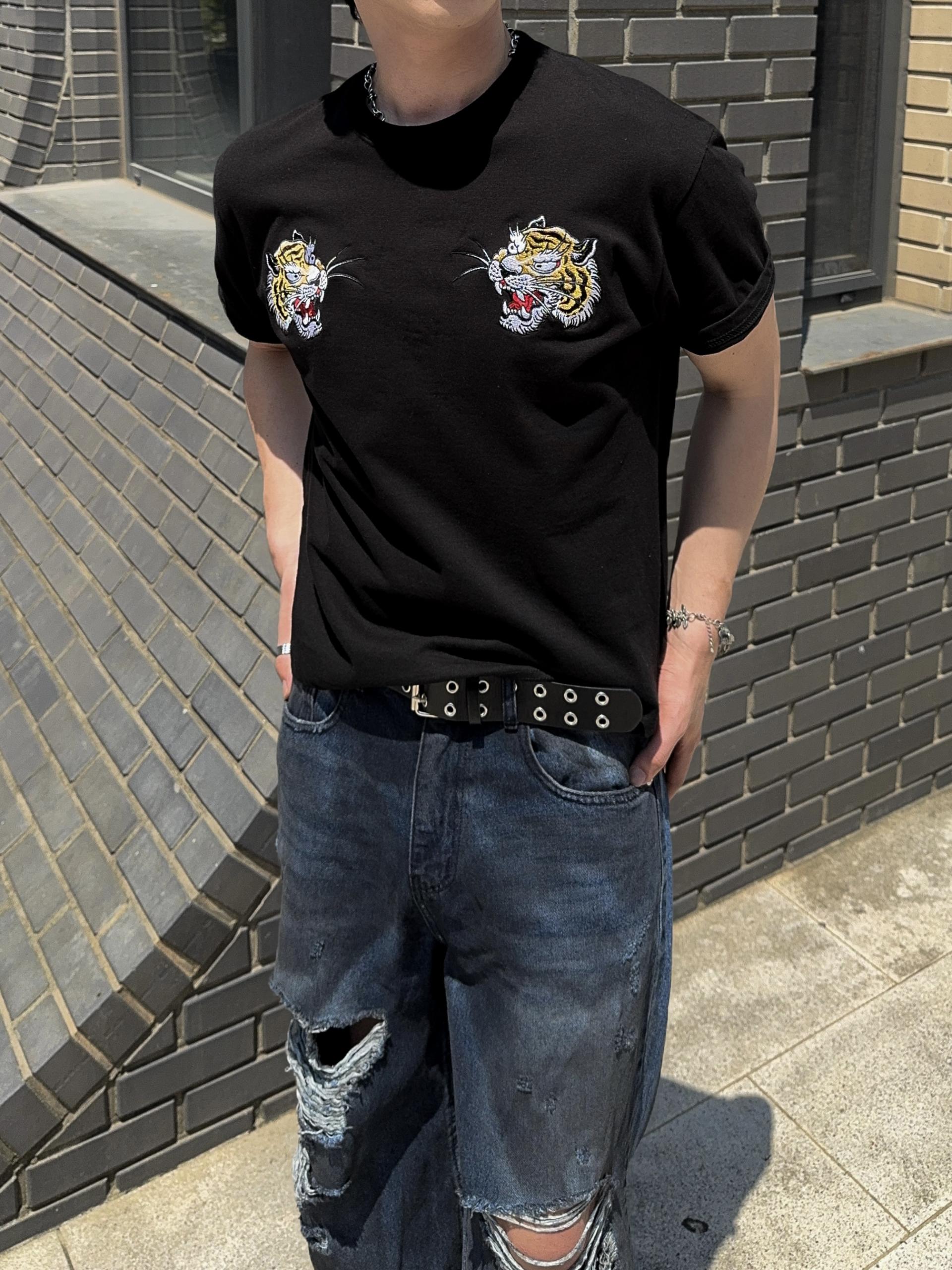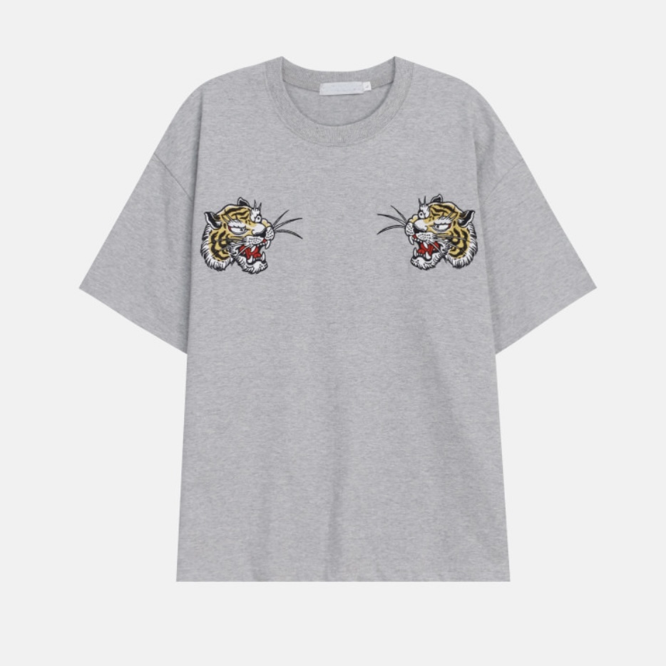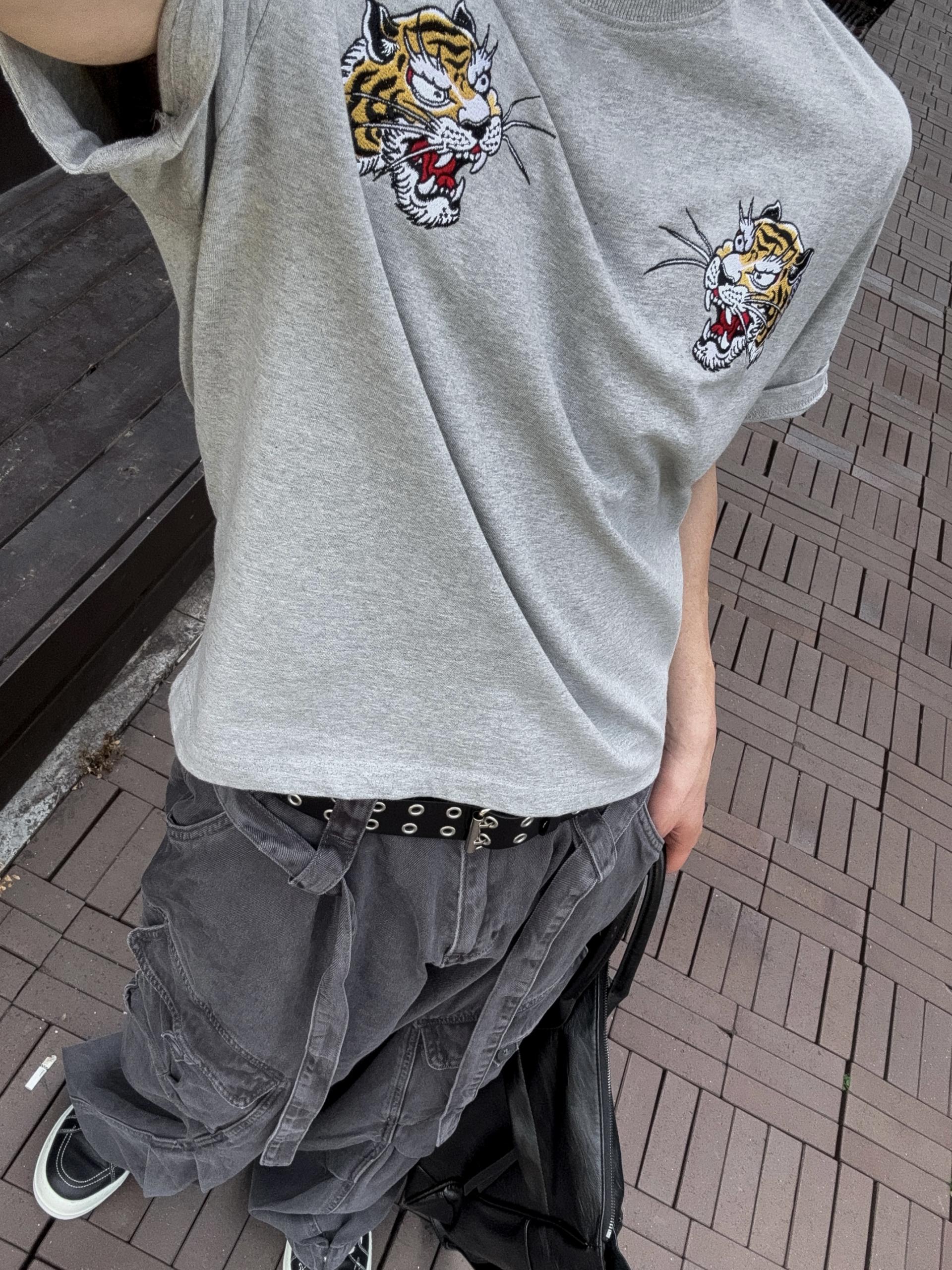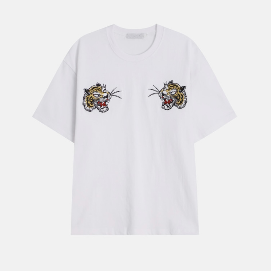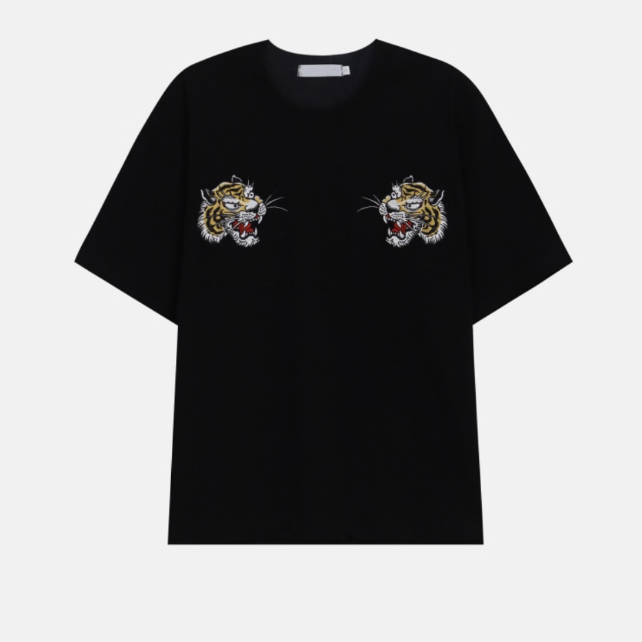 -타이거 스카잔 자수 포인트의 크롭 반팔 티셔츠