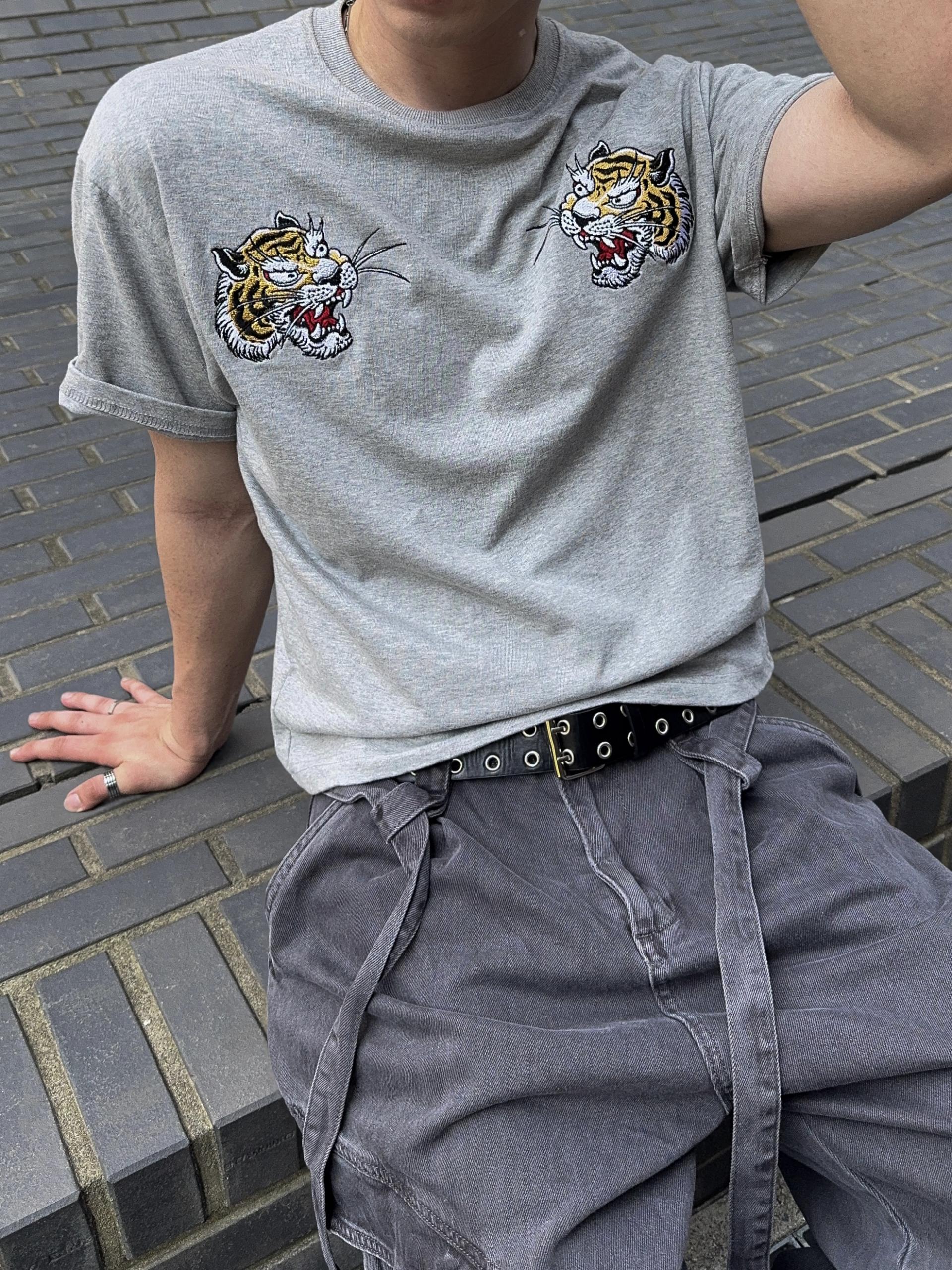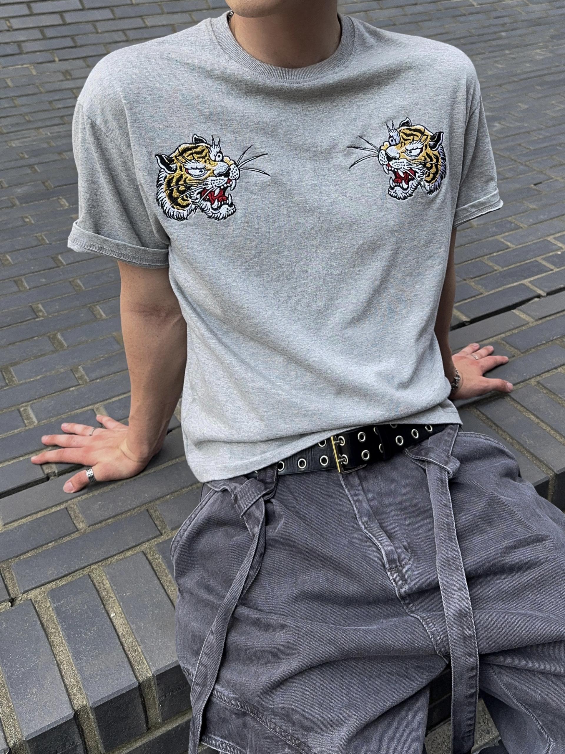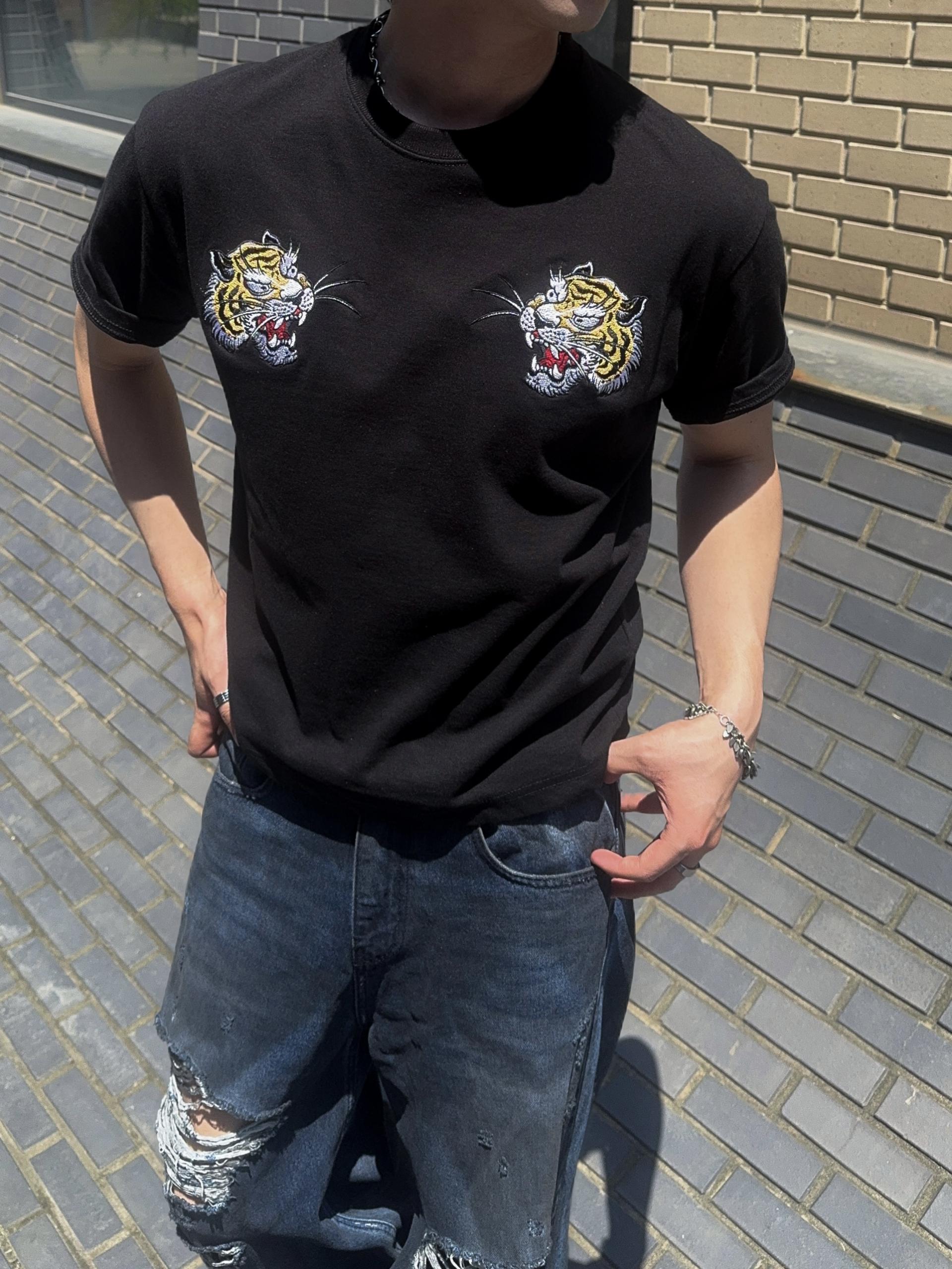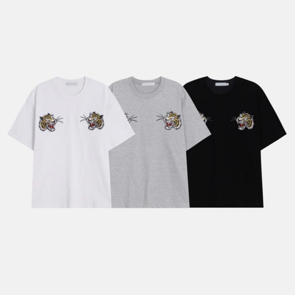 -타이거 스카잔 자수 포인트의 크롭 반팔 티셔츠