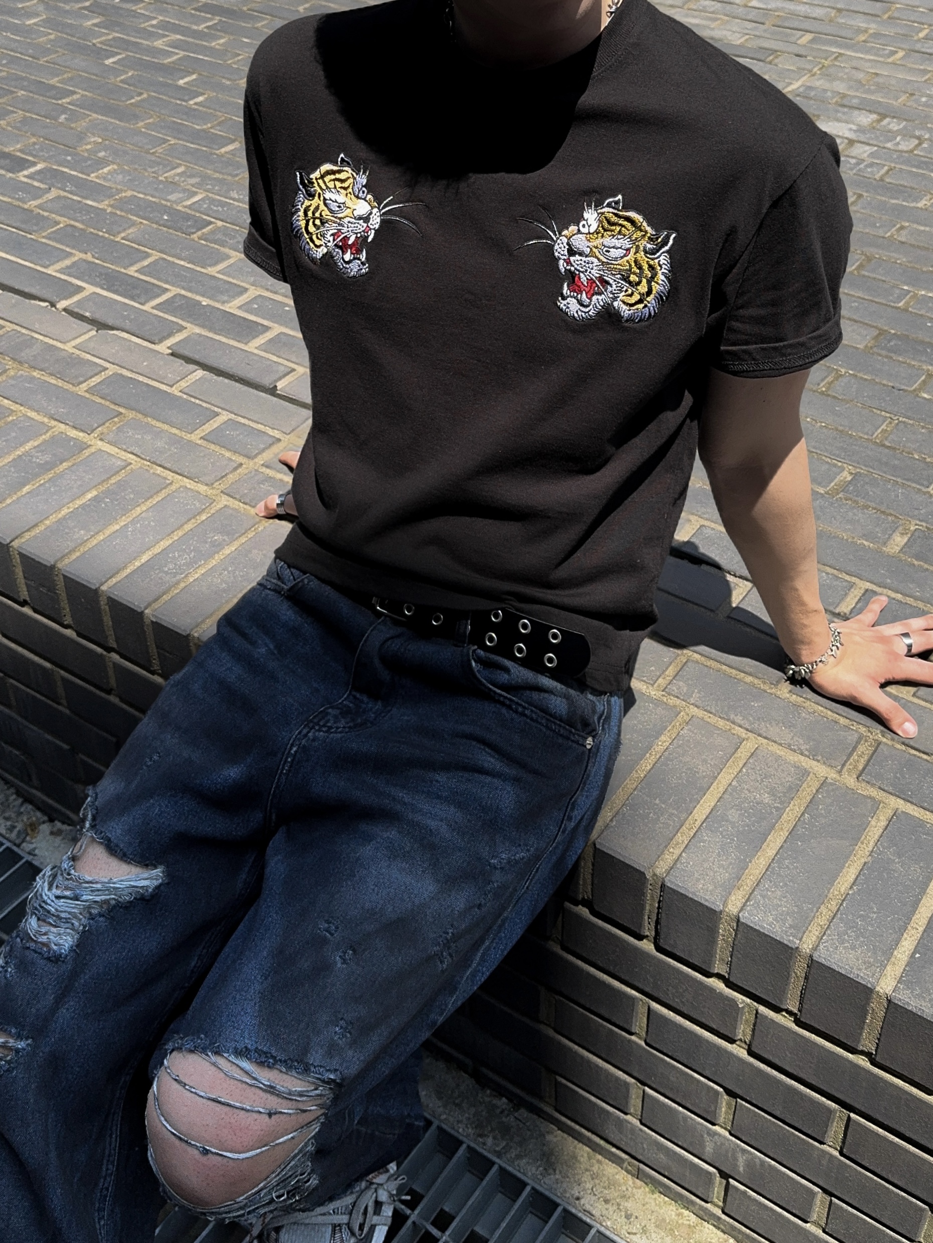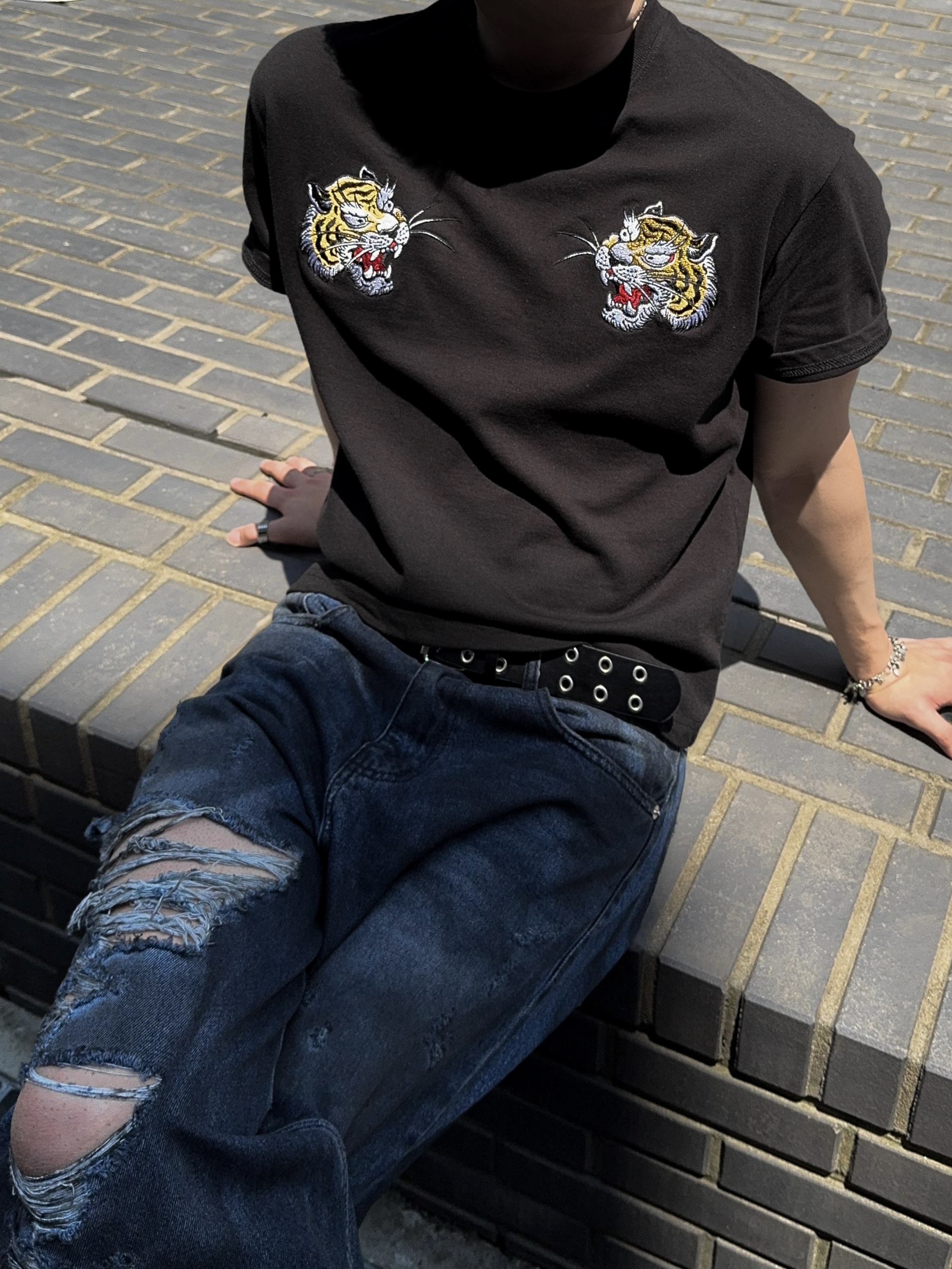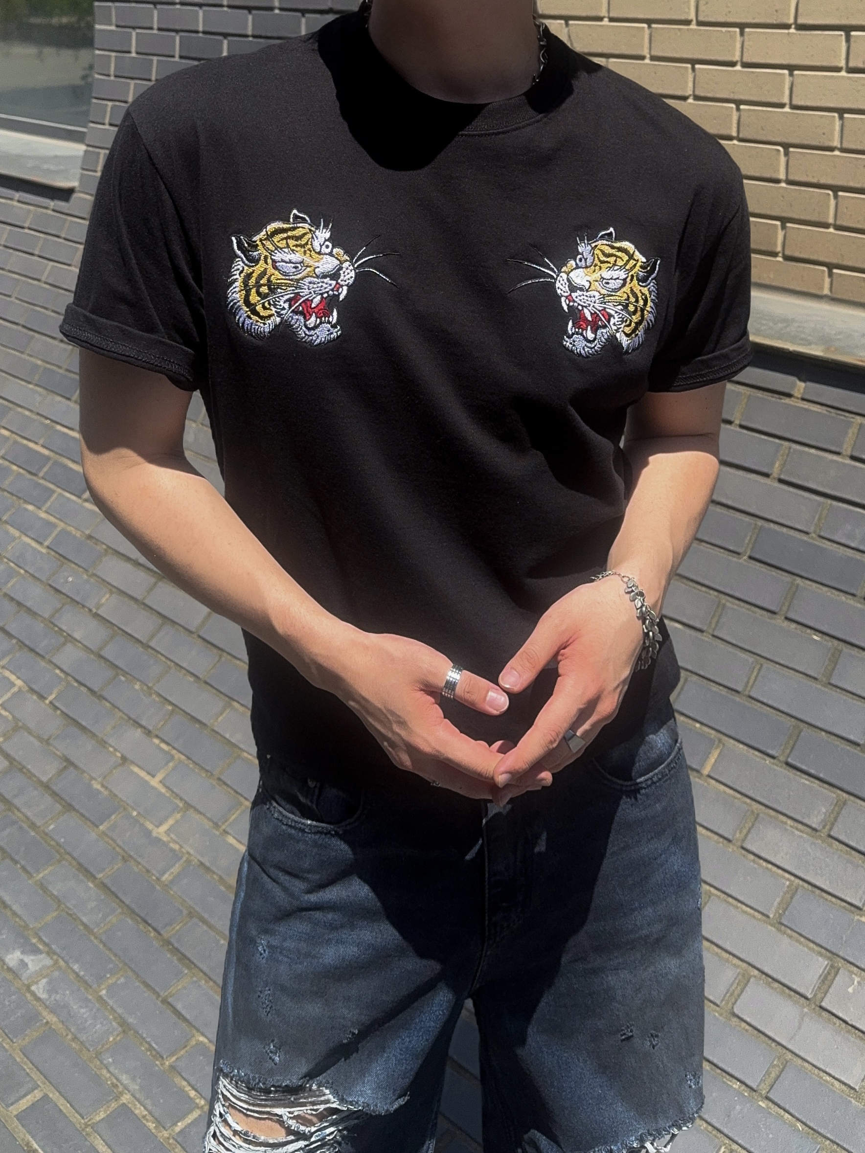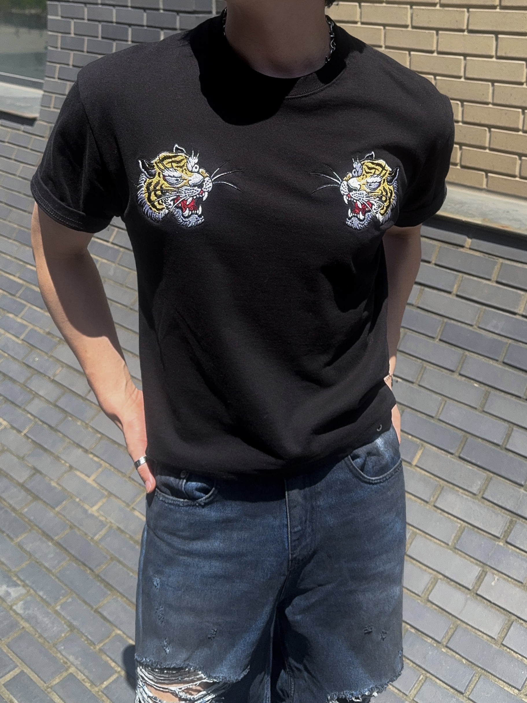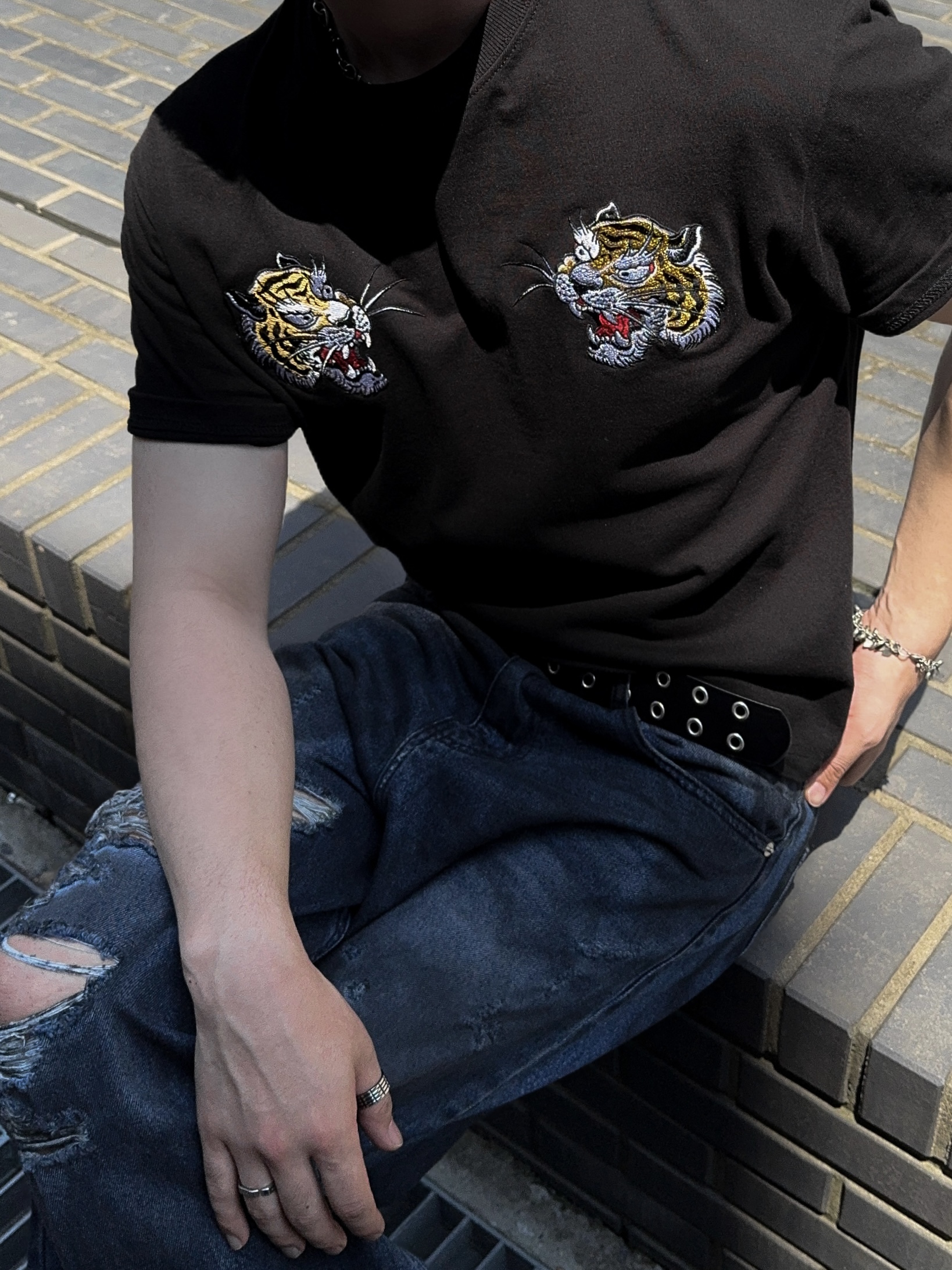 -타이거 스카잔 자수 포인트의 크롭 반팔 티셔츠