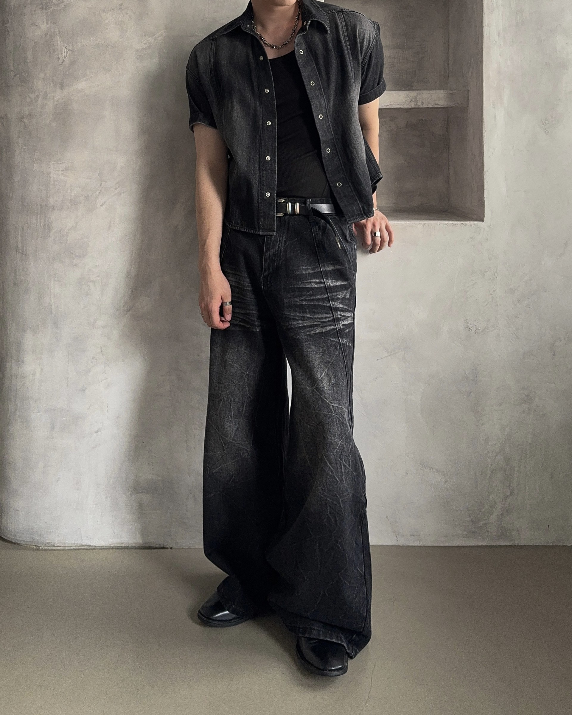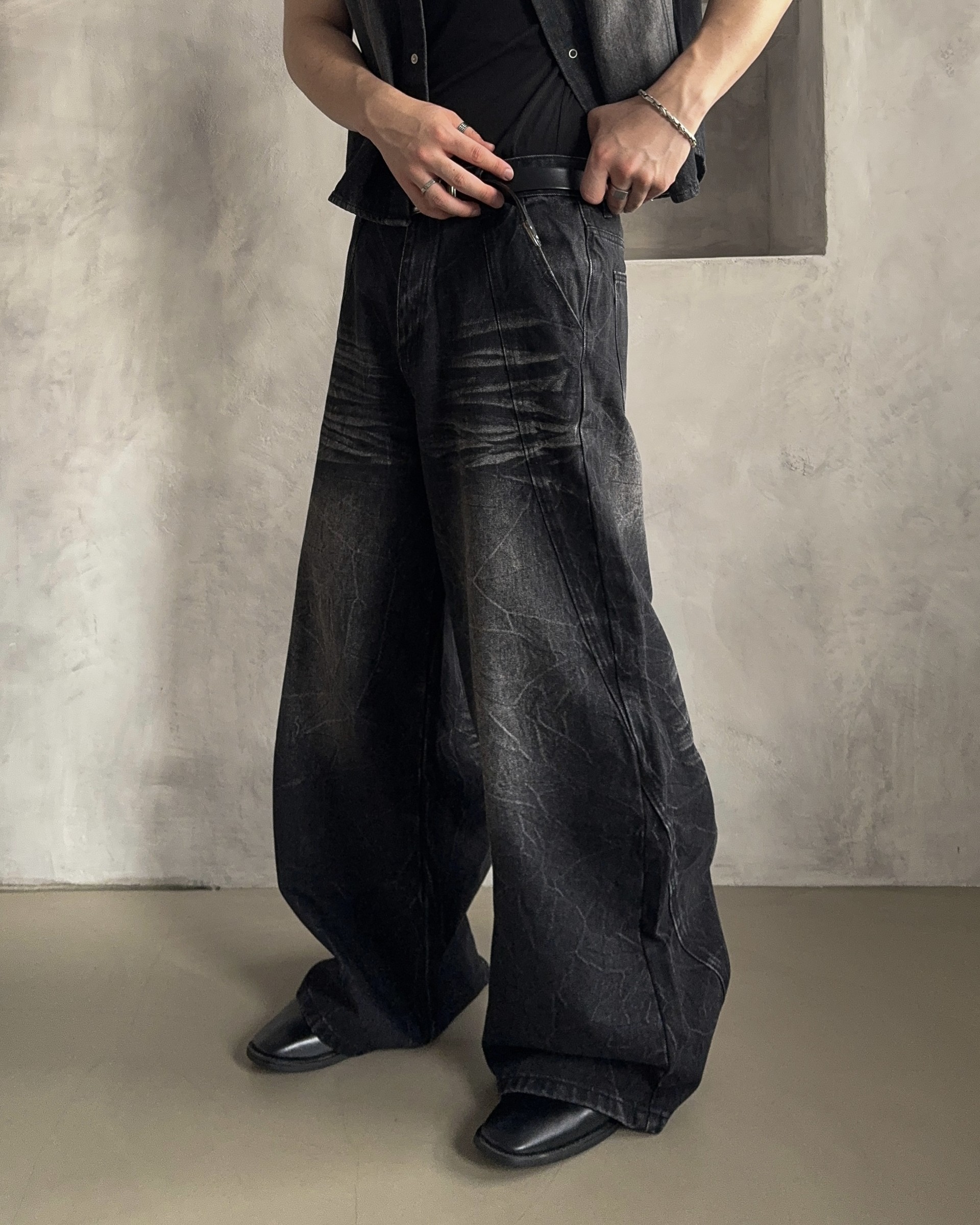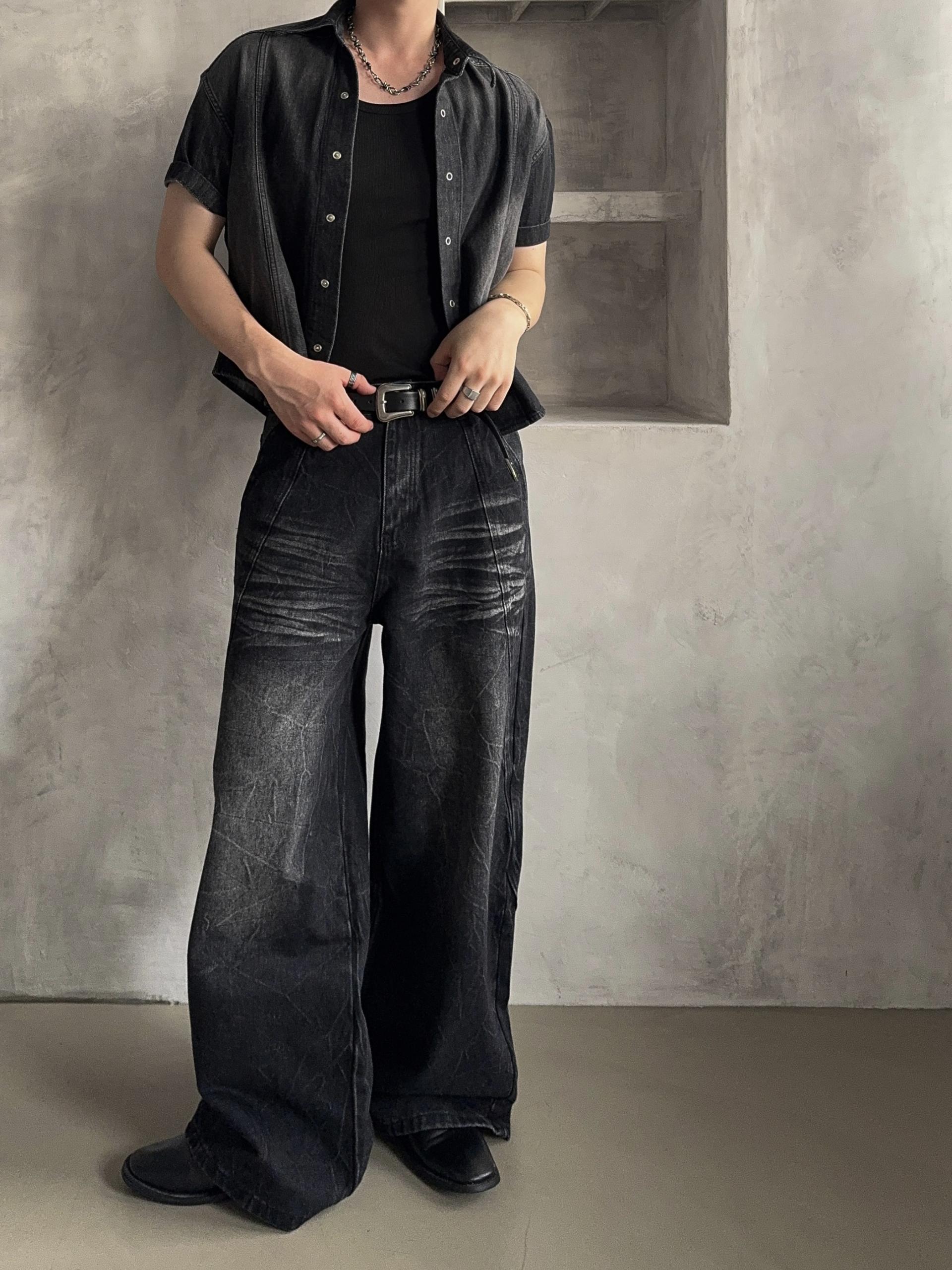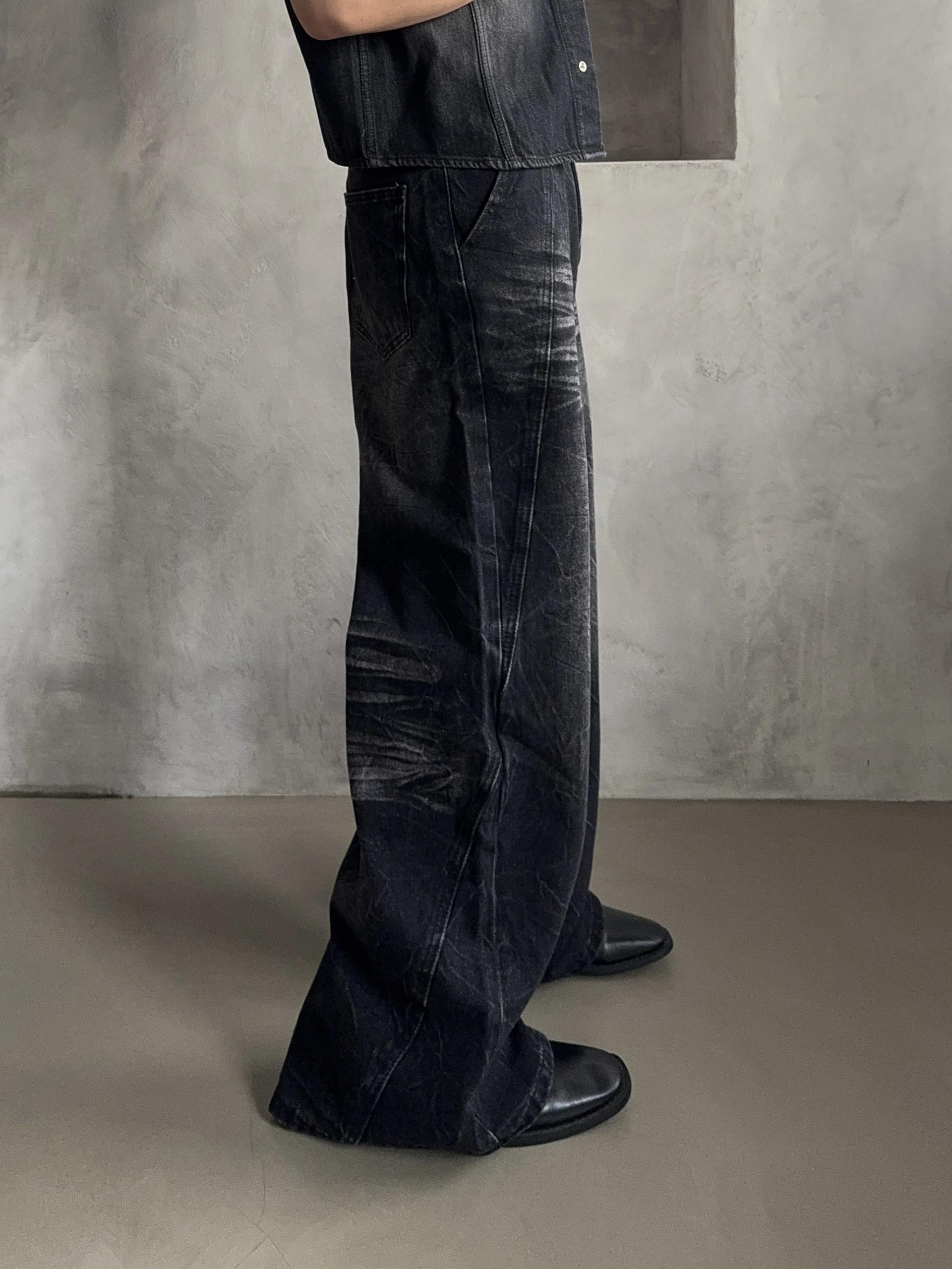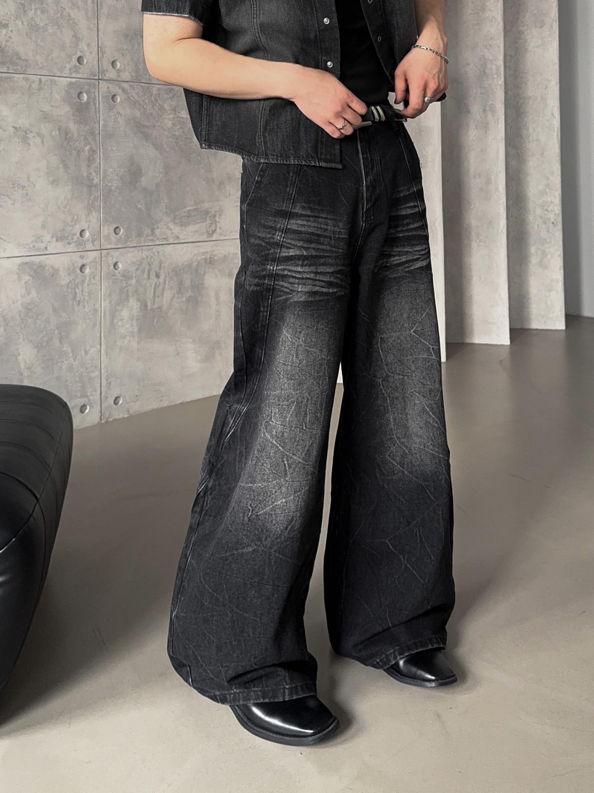 -탄탄한 데님 원단으로 제작된 와이드 팬츠