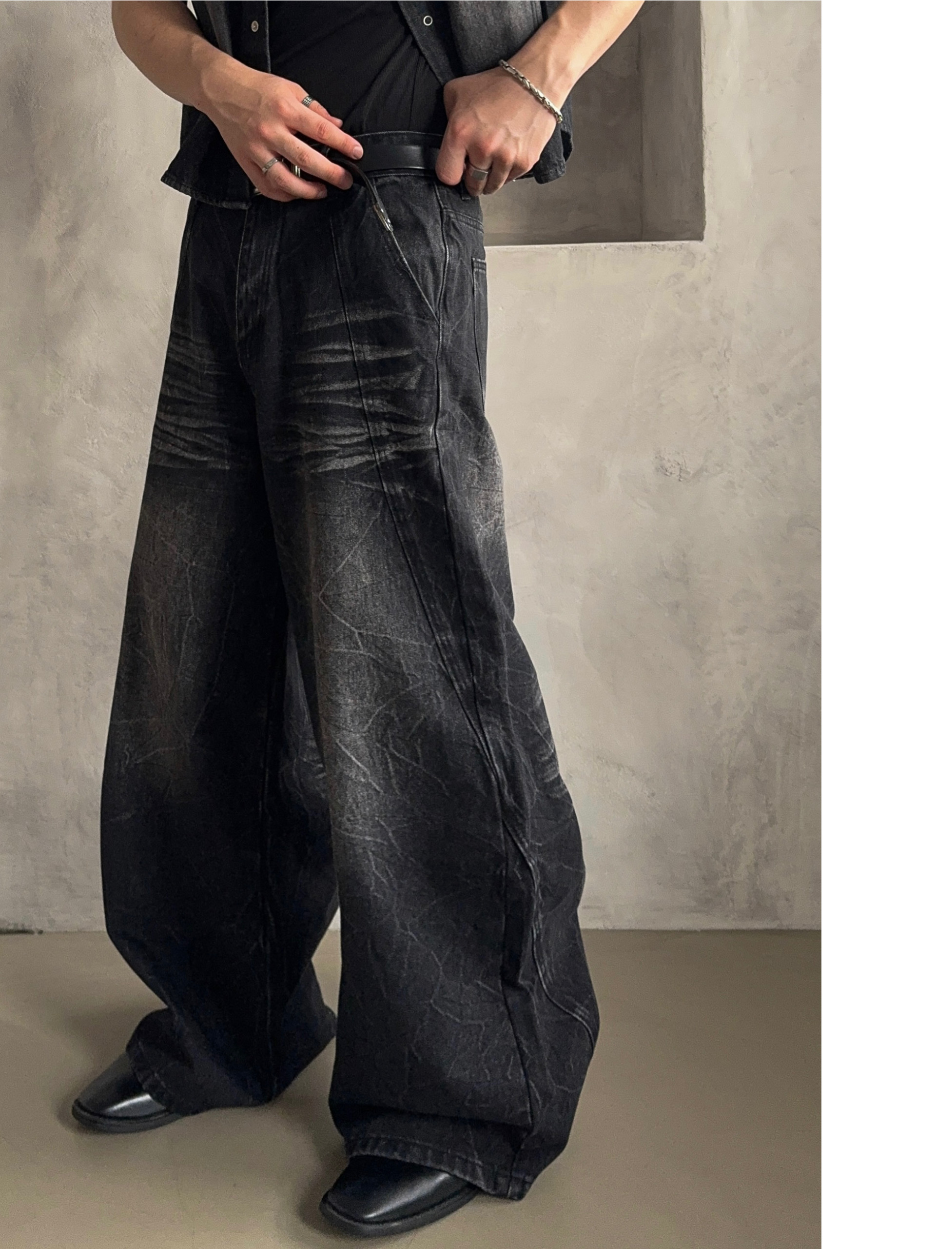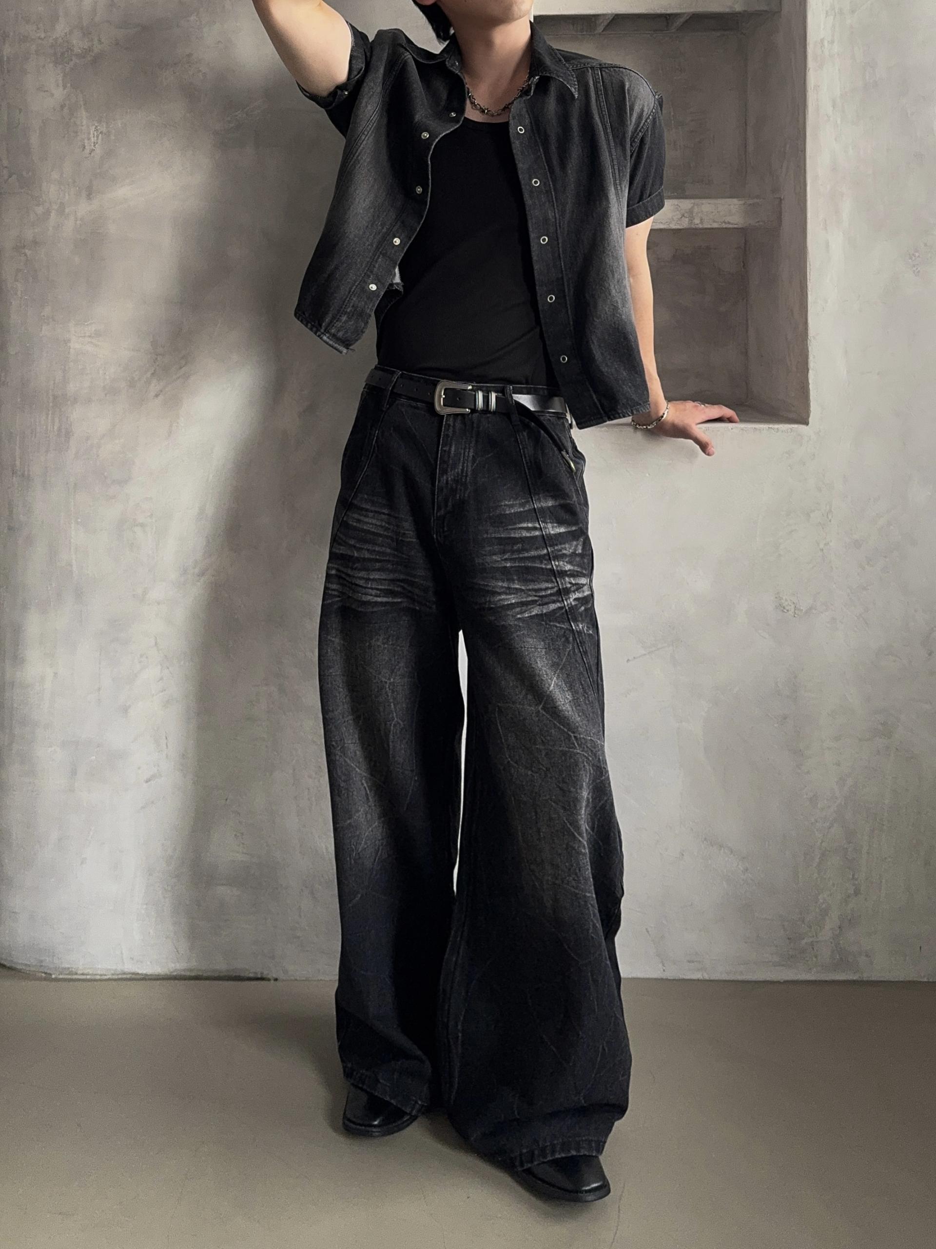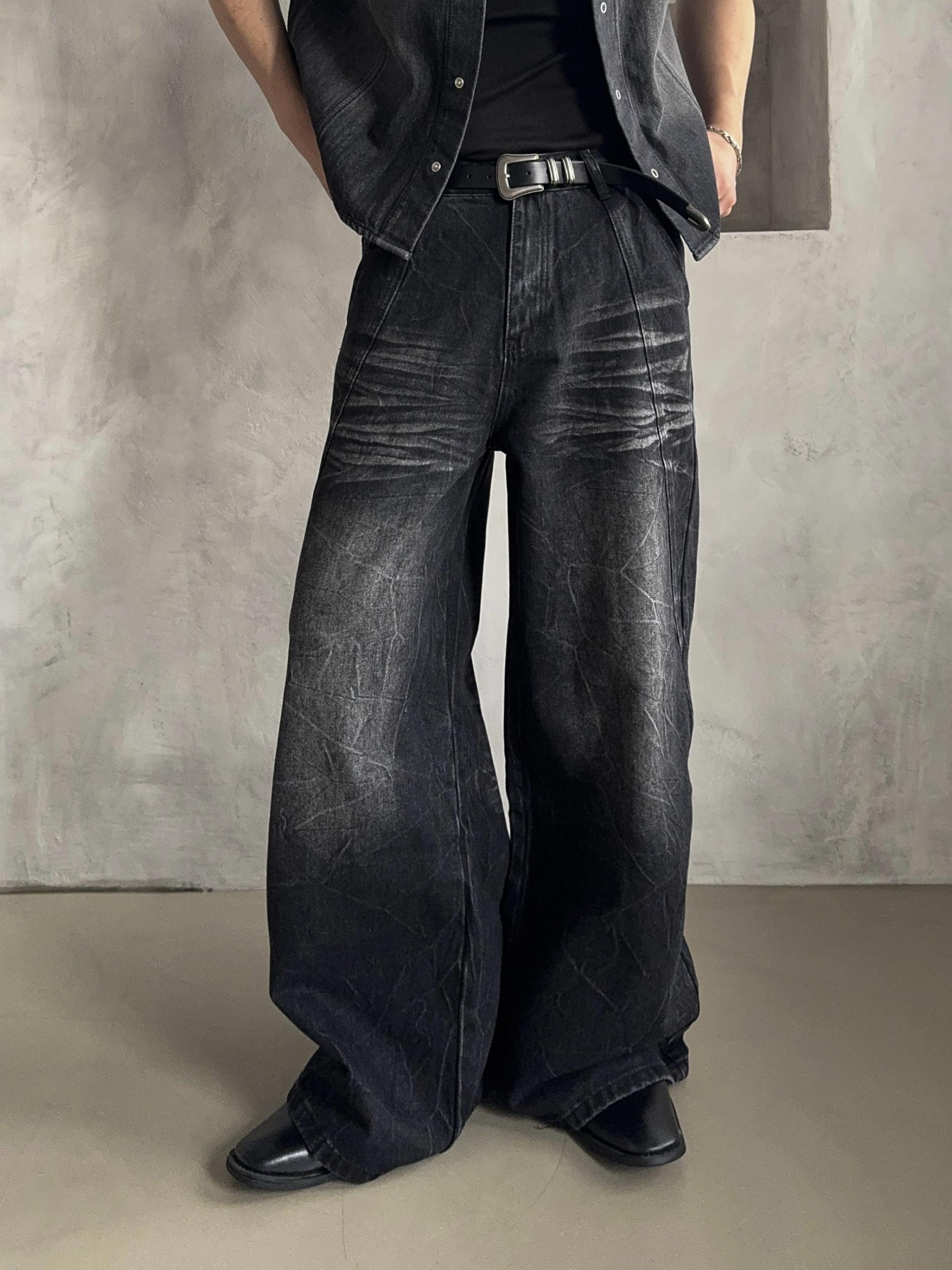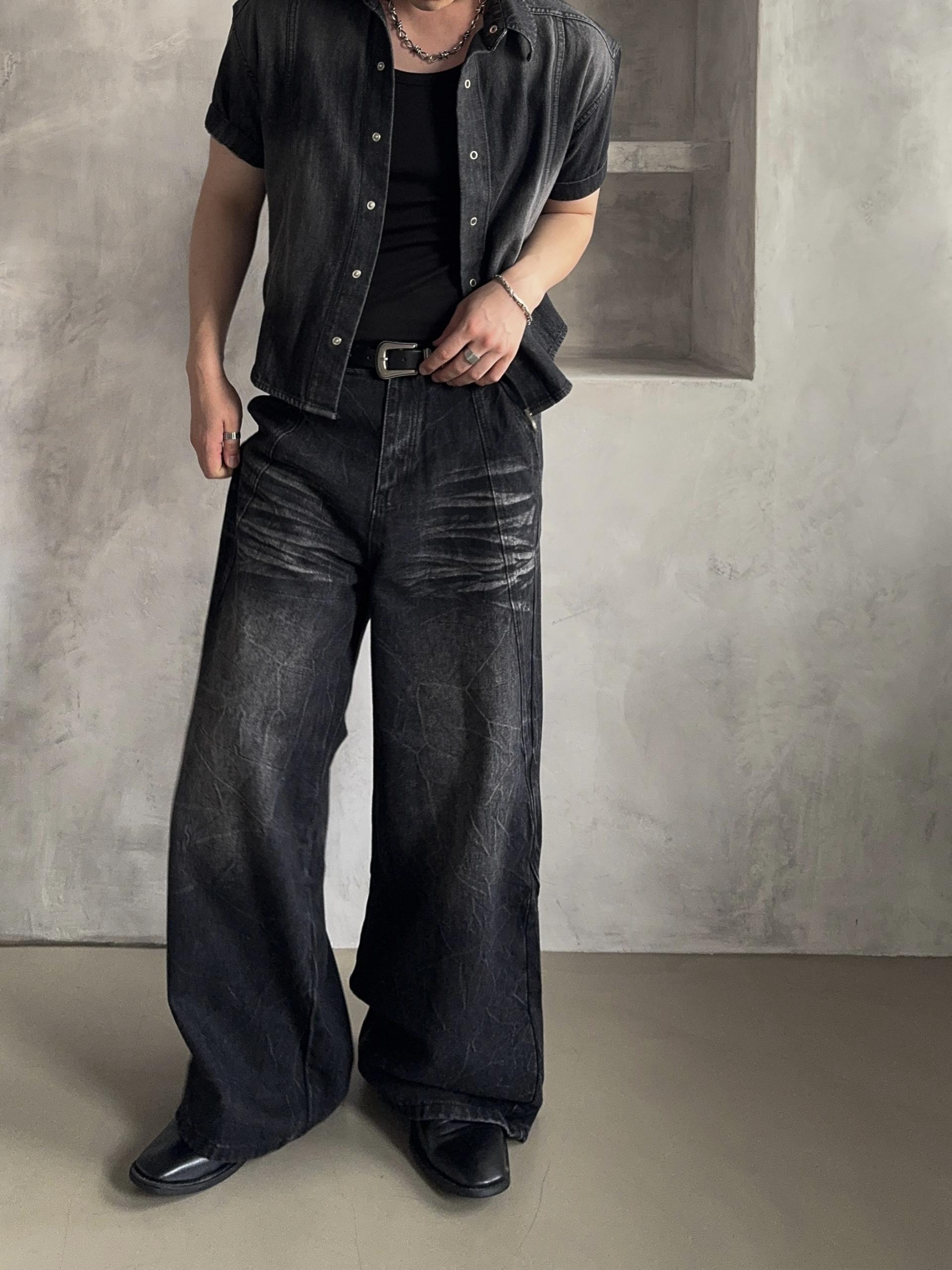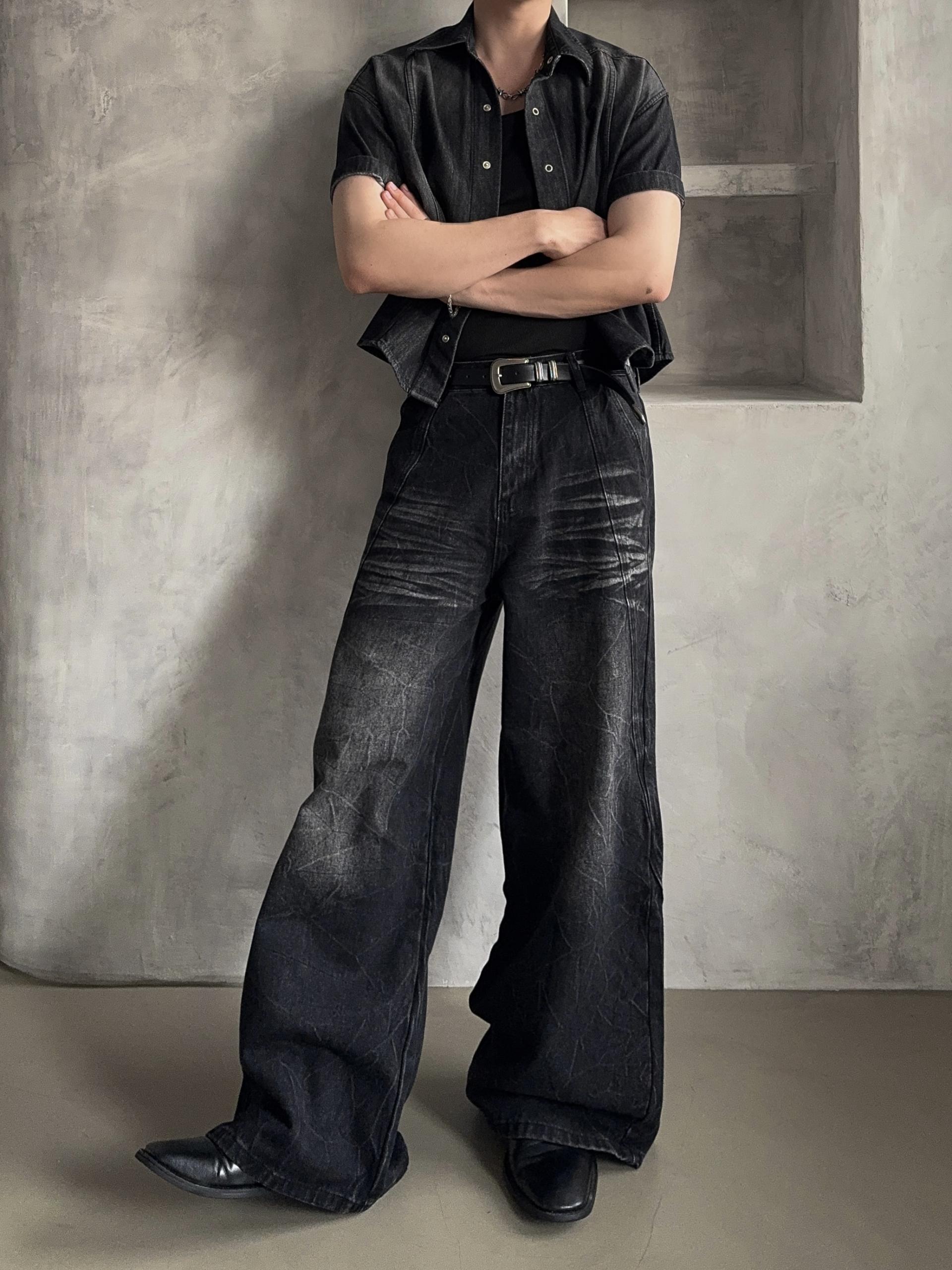 -탄탄한 데님 원단으로 제작된 와이드 팬츠