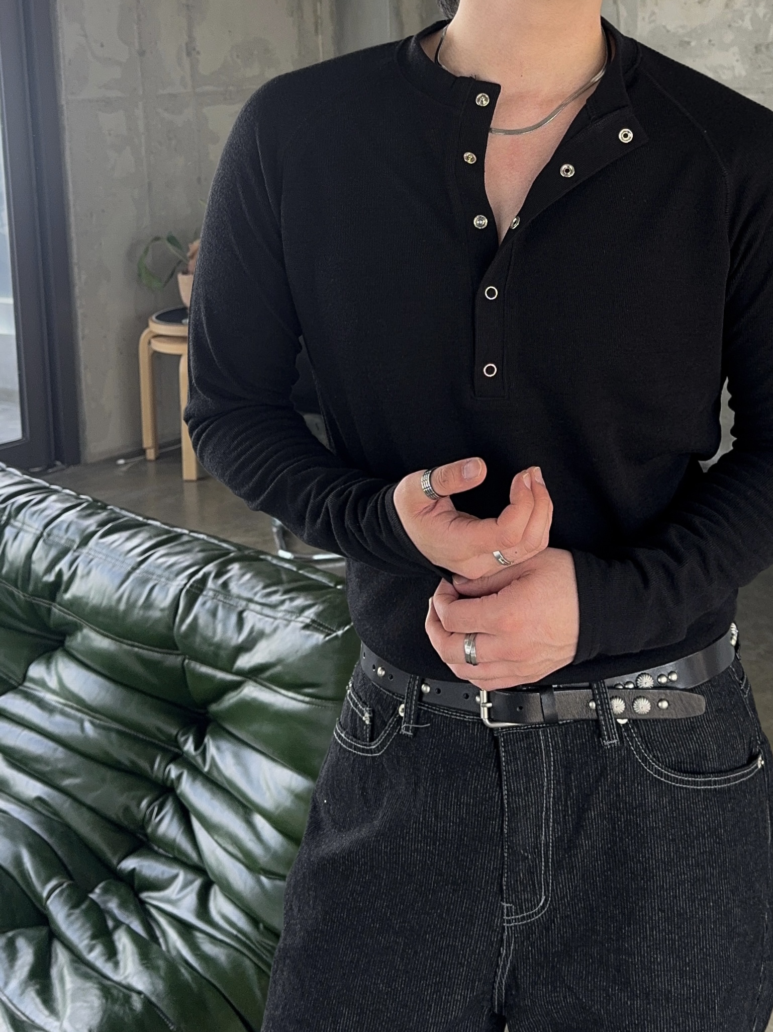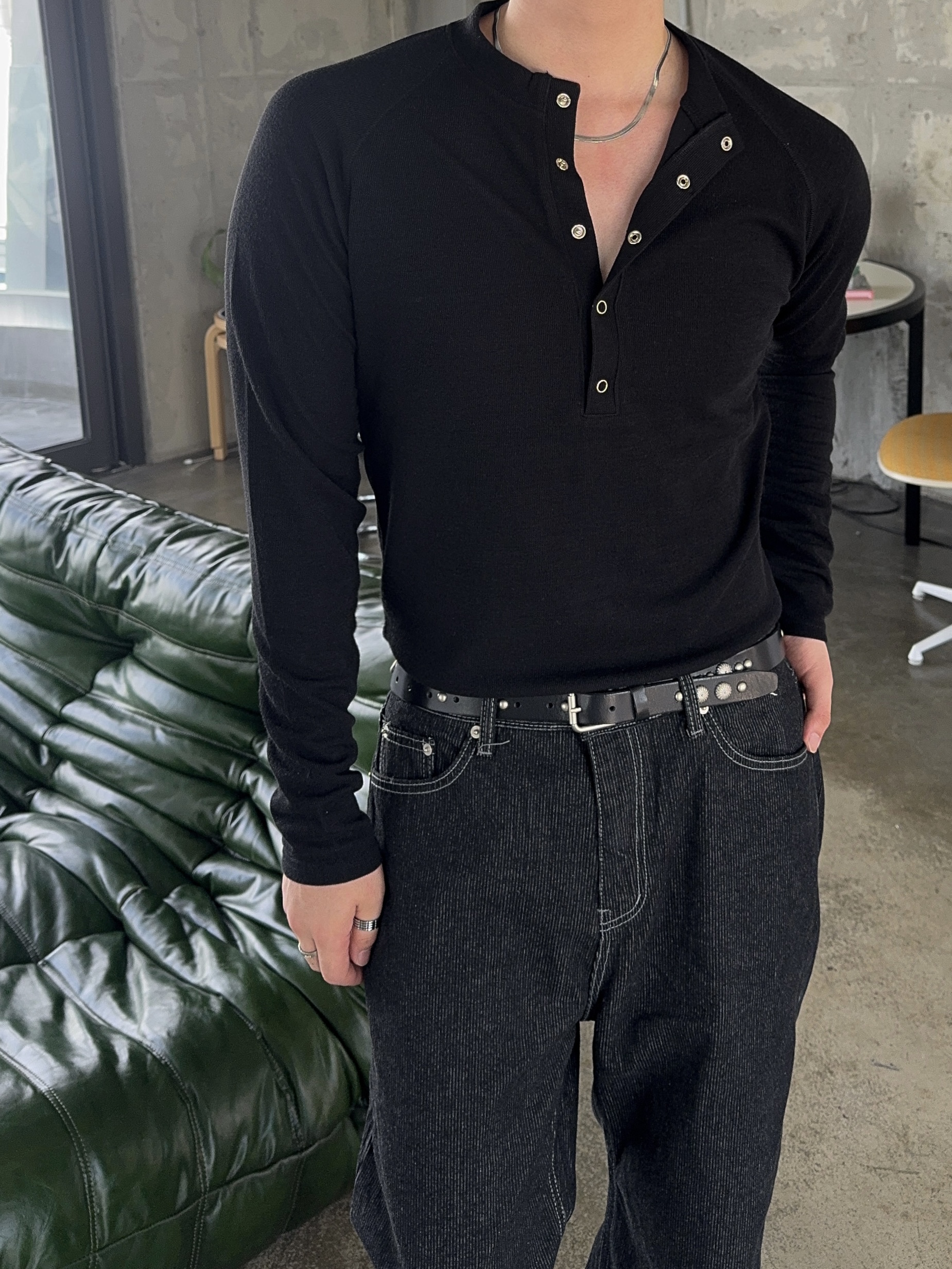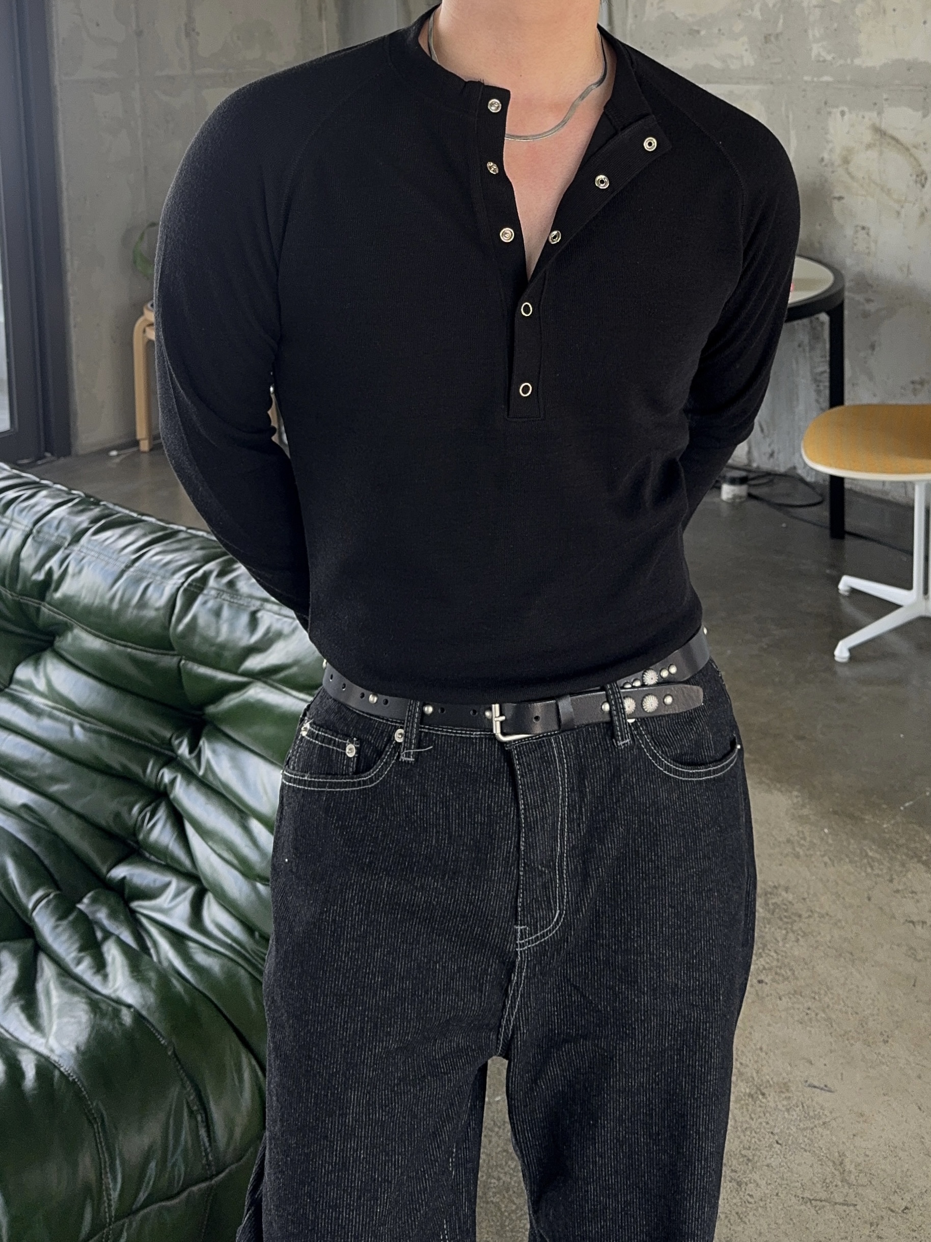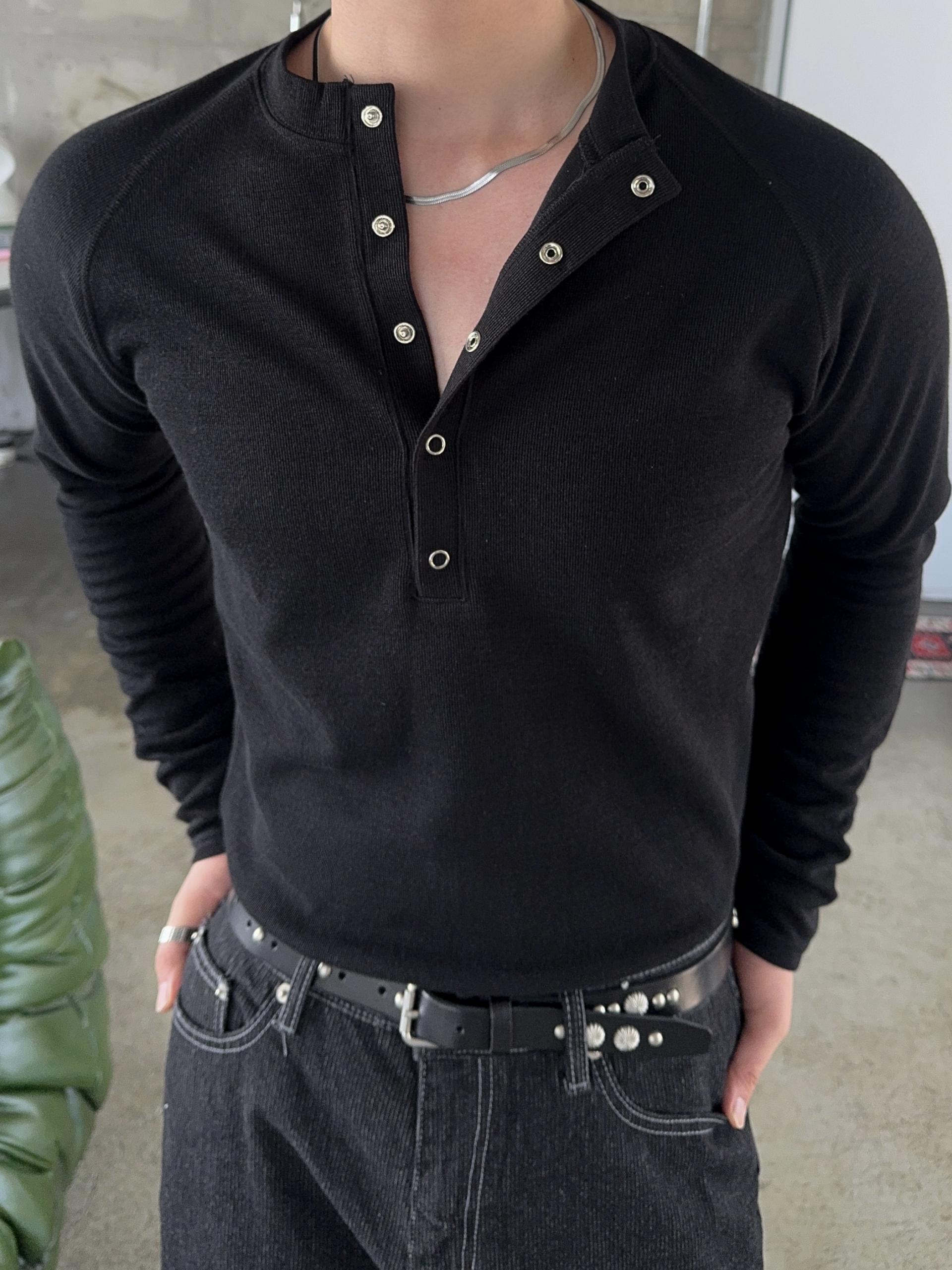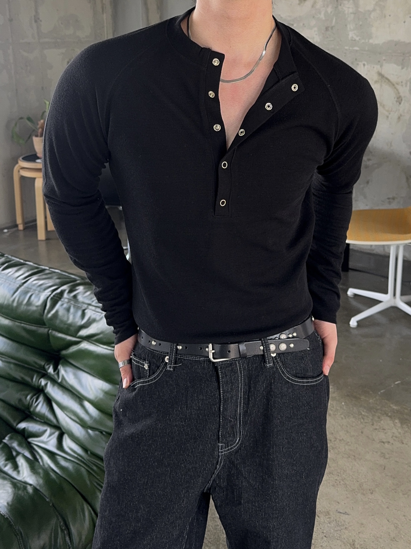 -깊은 딥 헨리넥 디자인과 실버 버튼으로 고급스러운 포인트