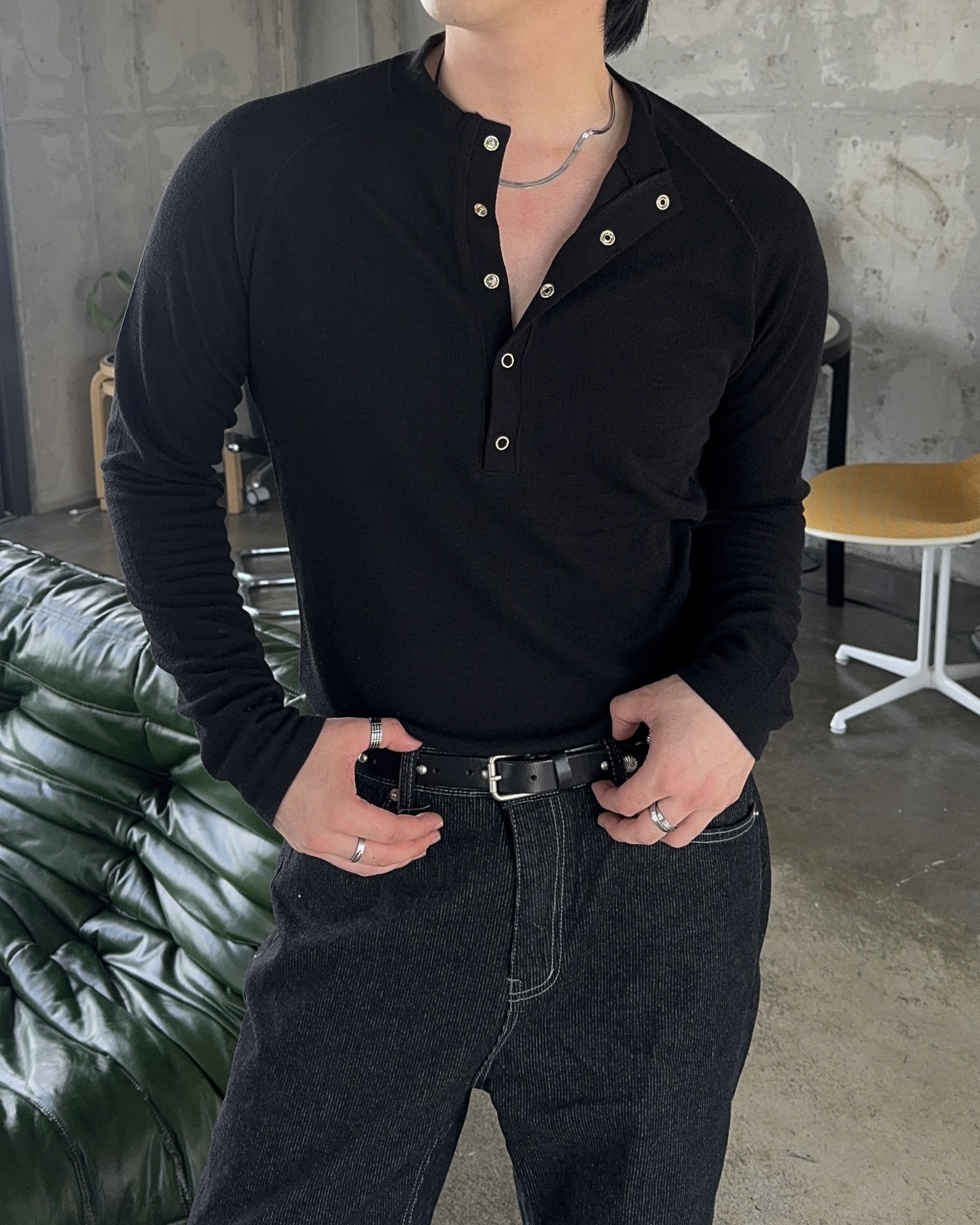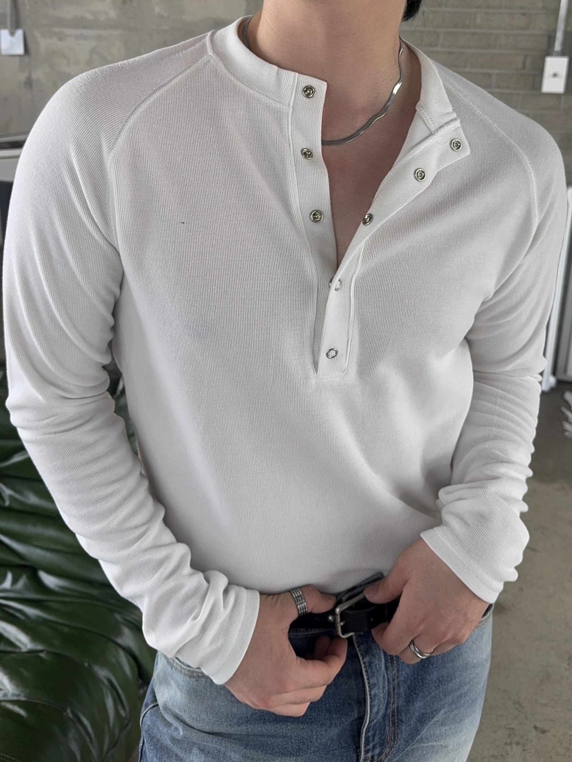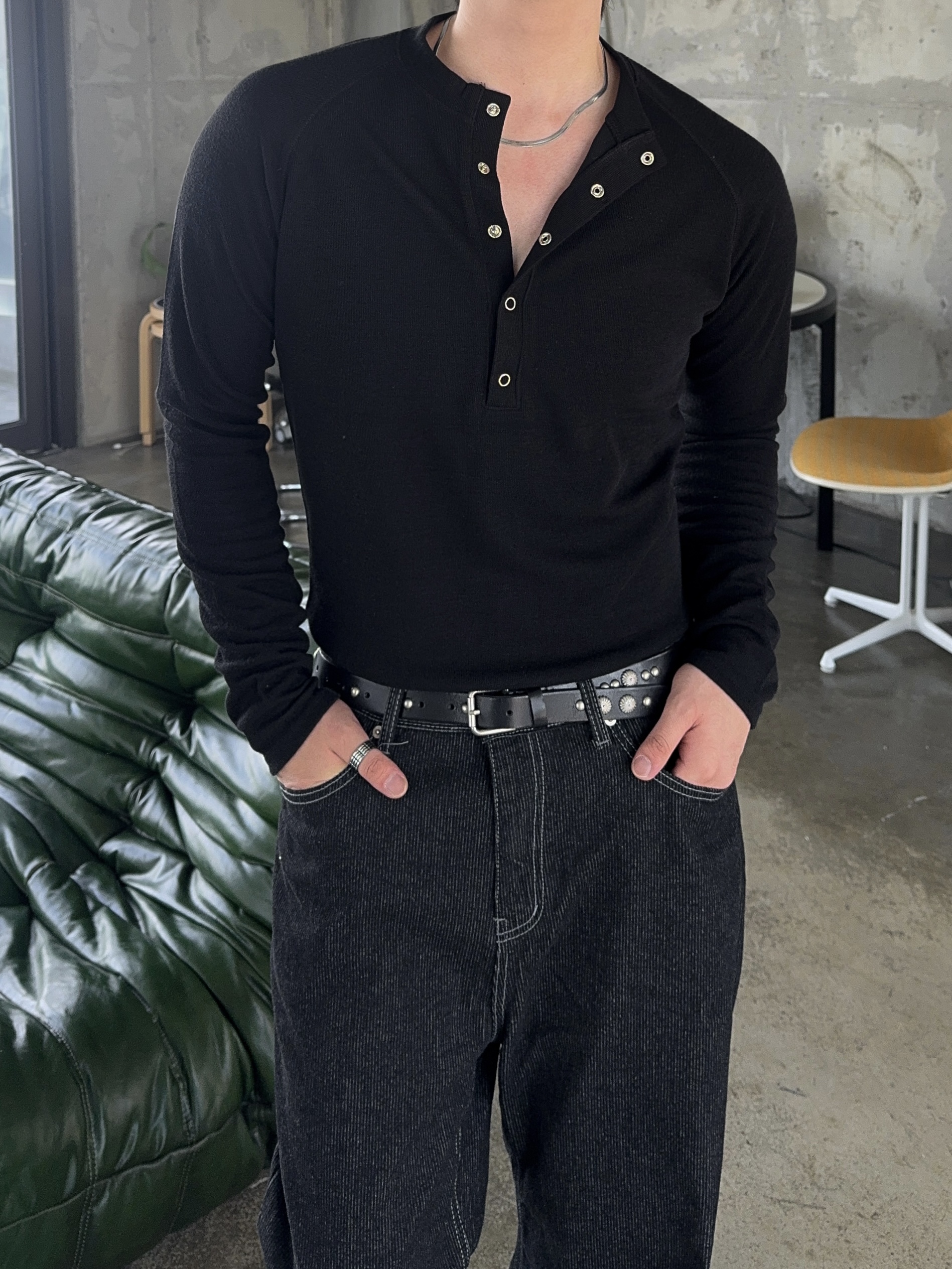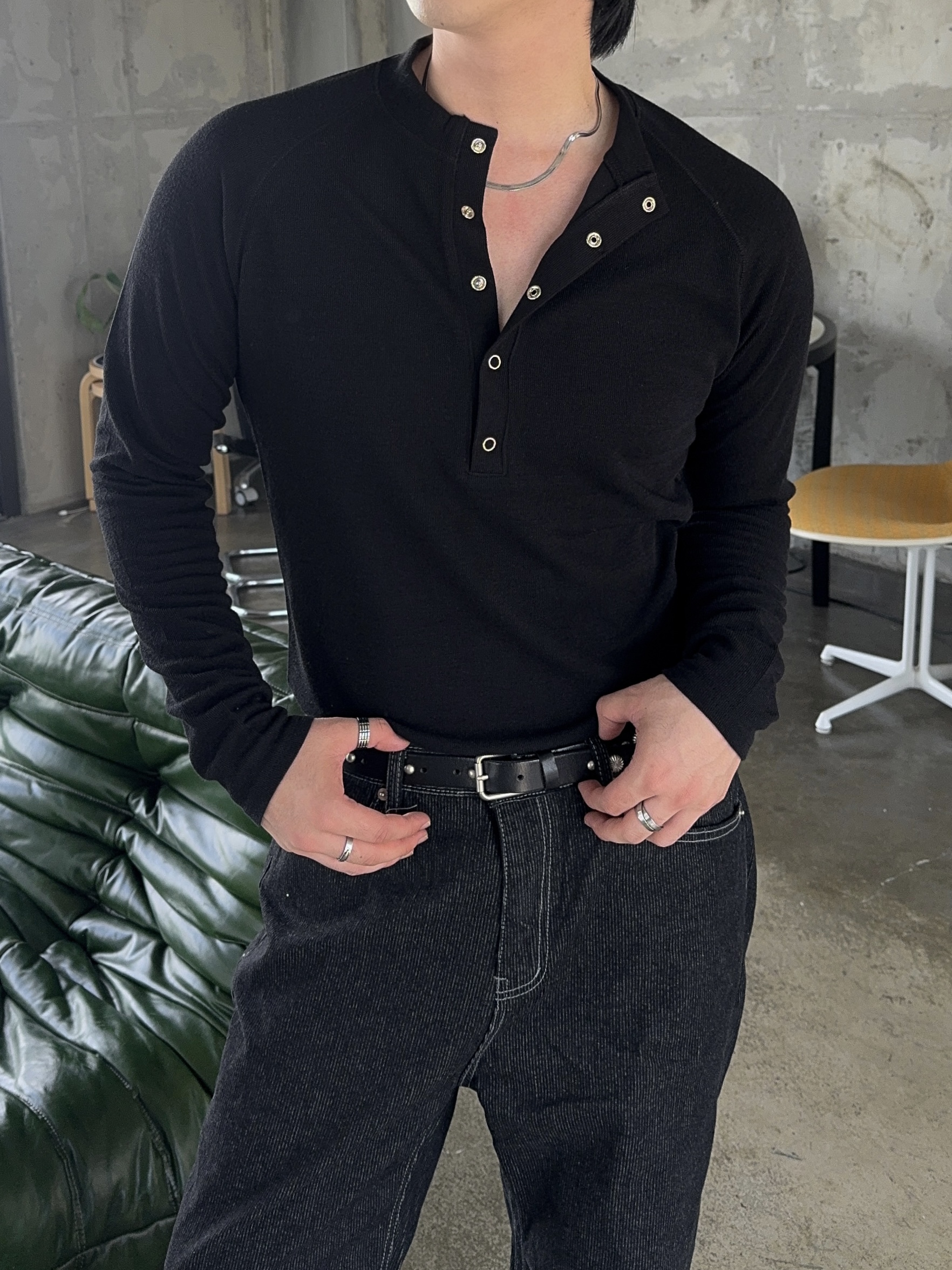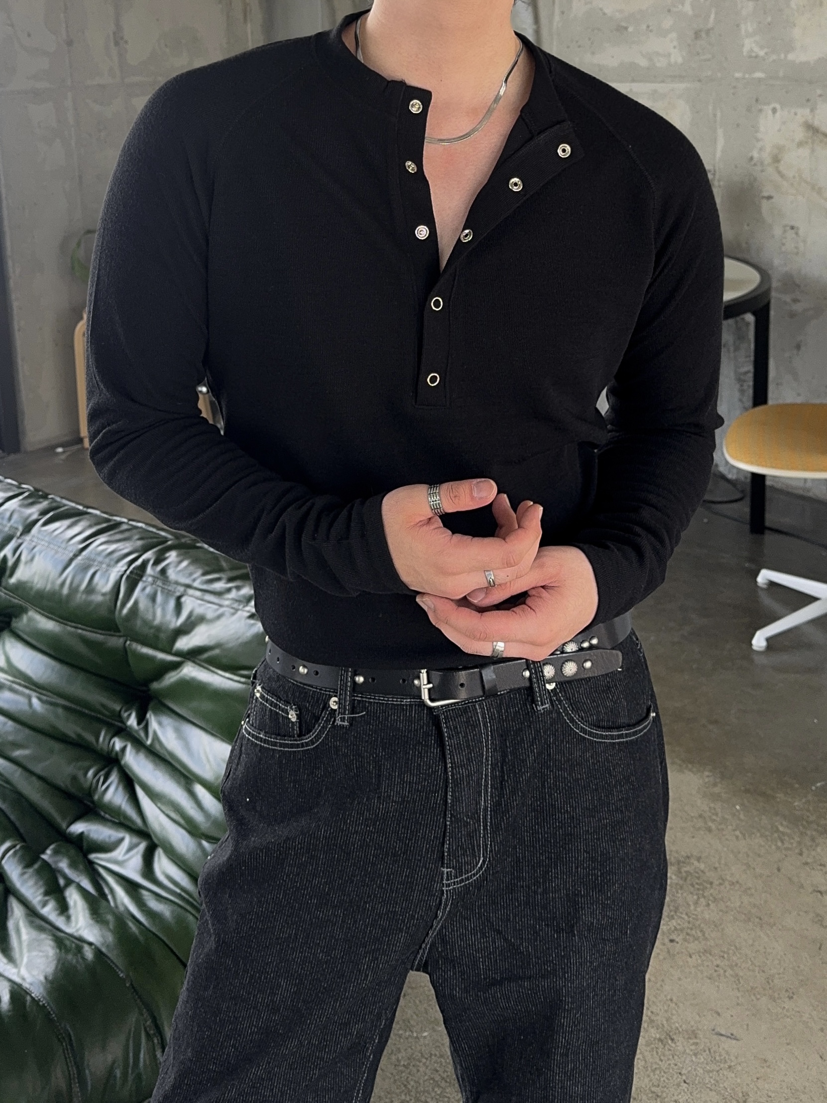 -깊은 딥 헨리넥 디자인과 실버 버튼으로 고급스러운 포인트