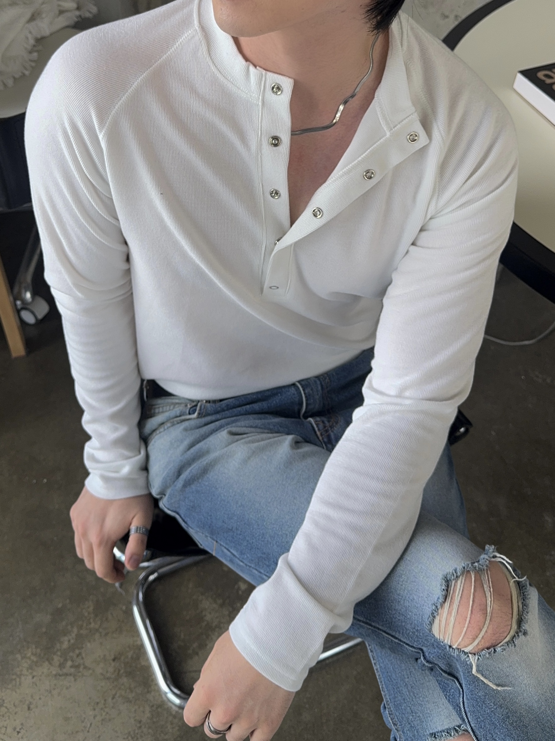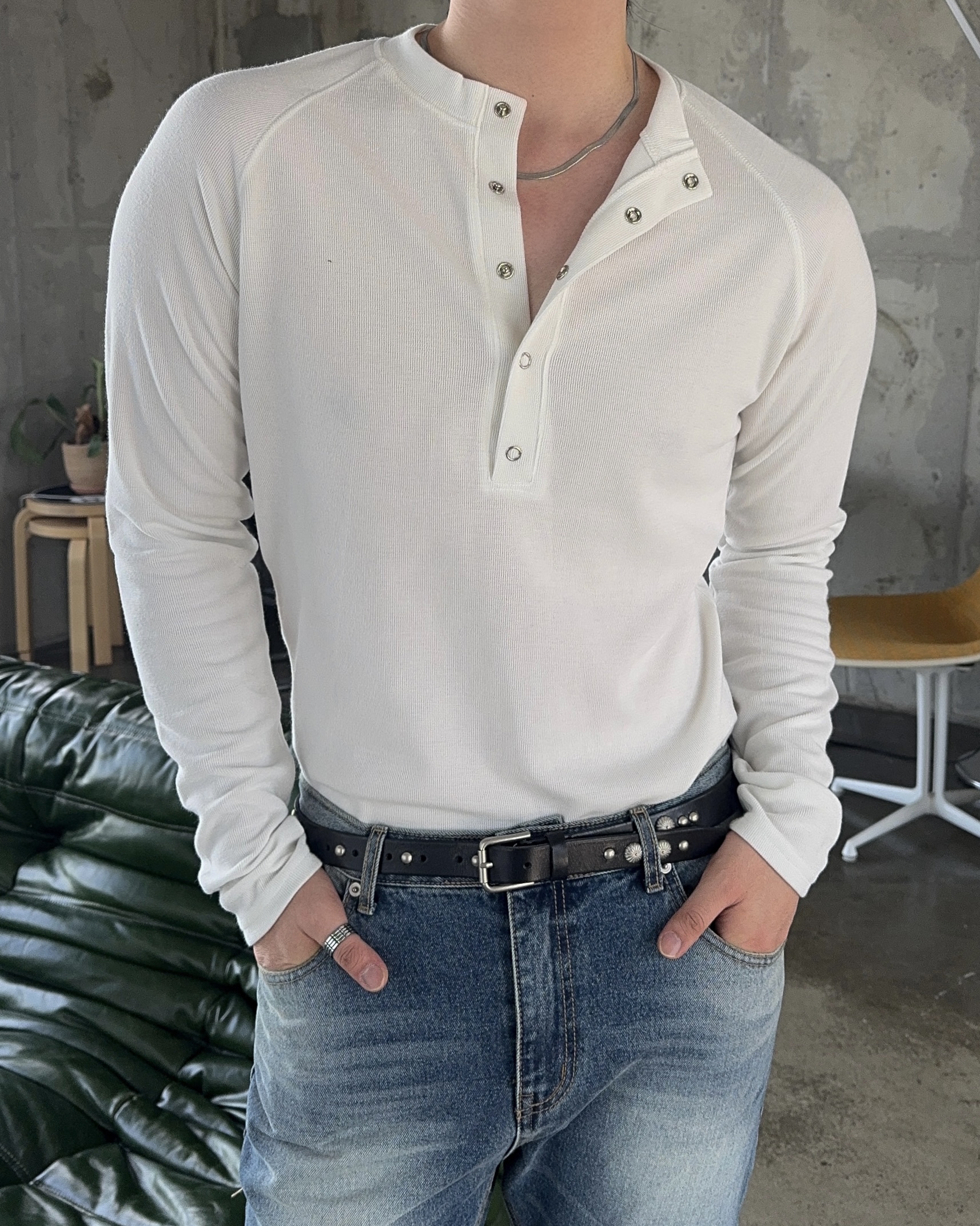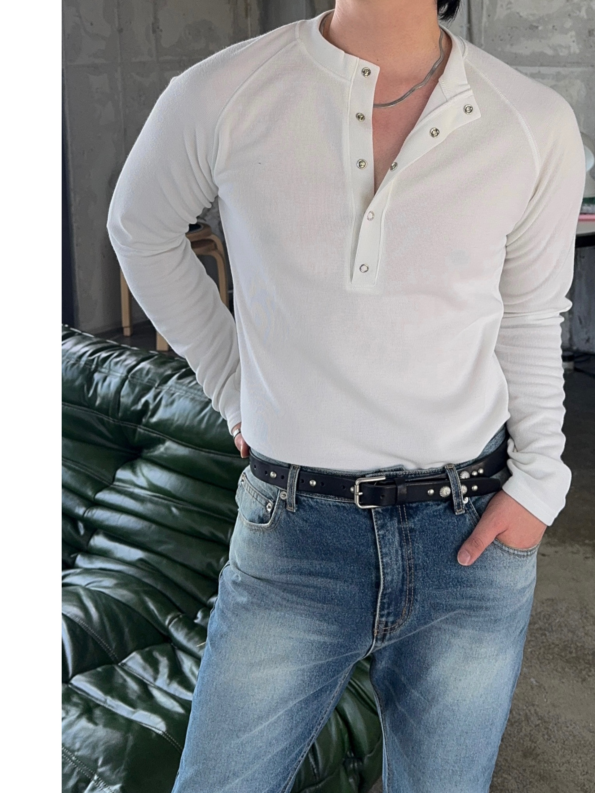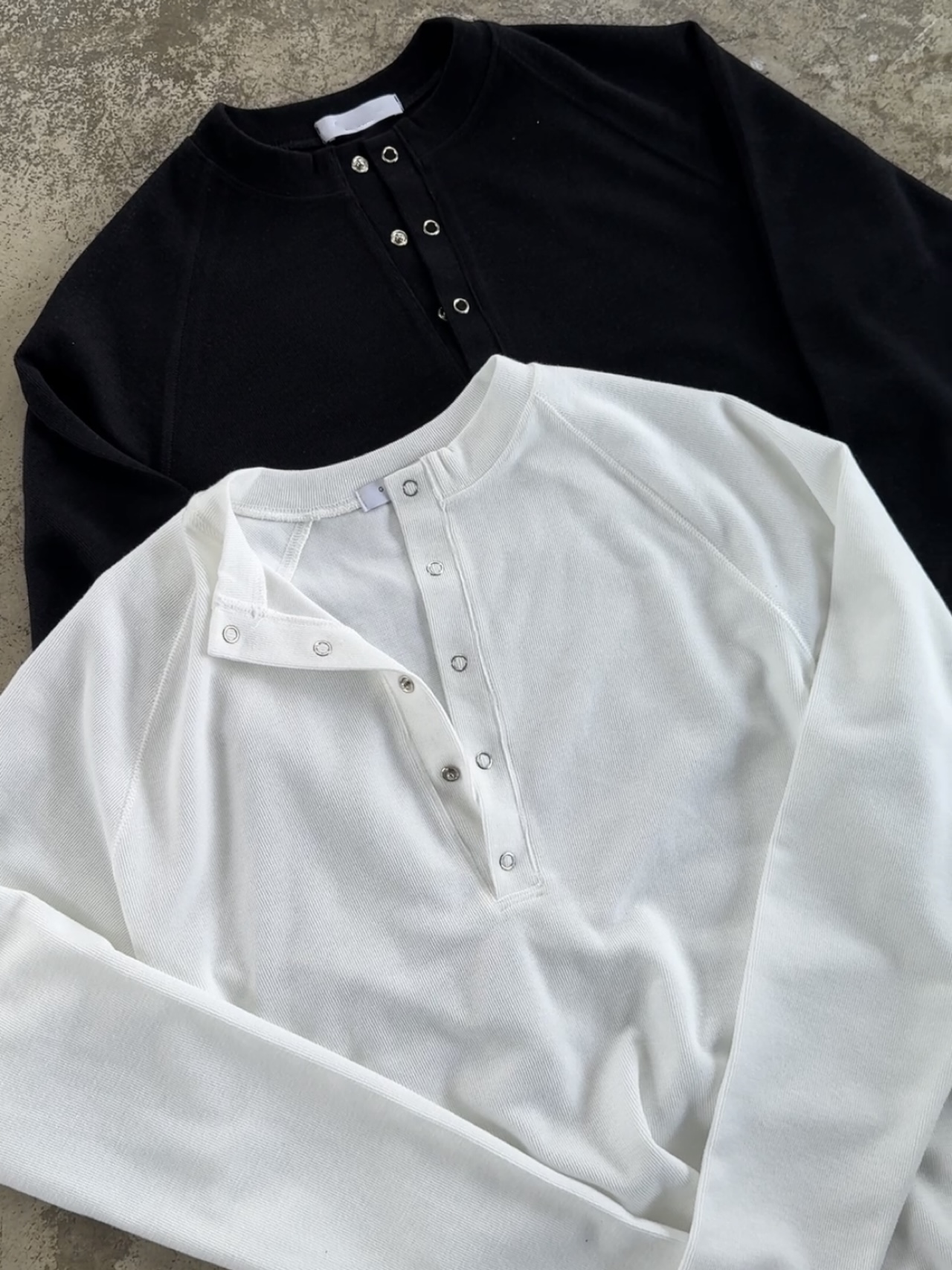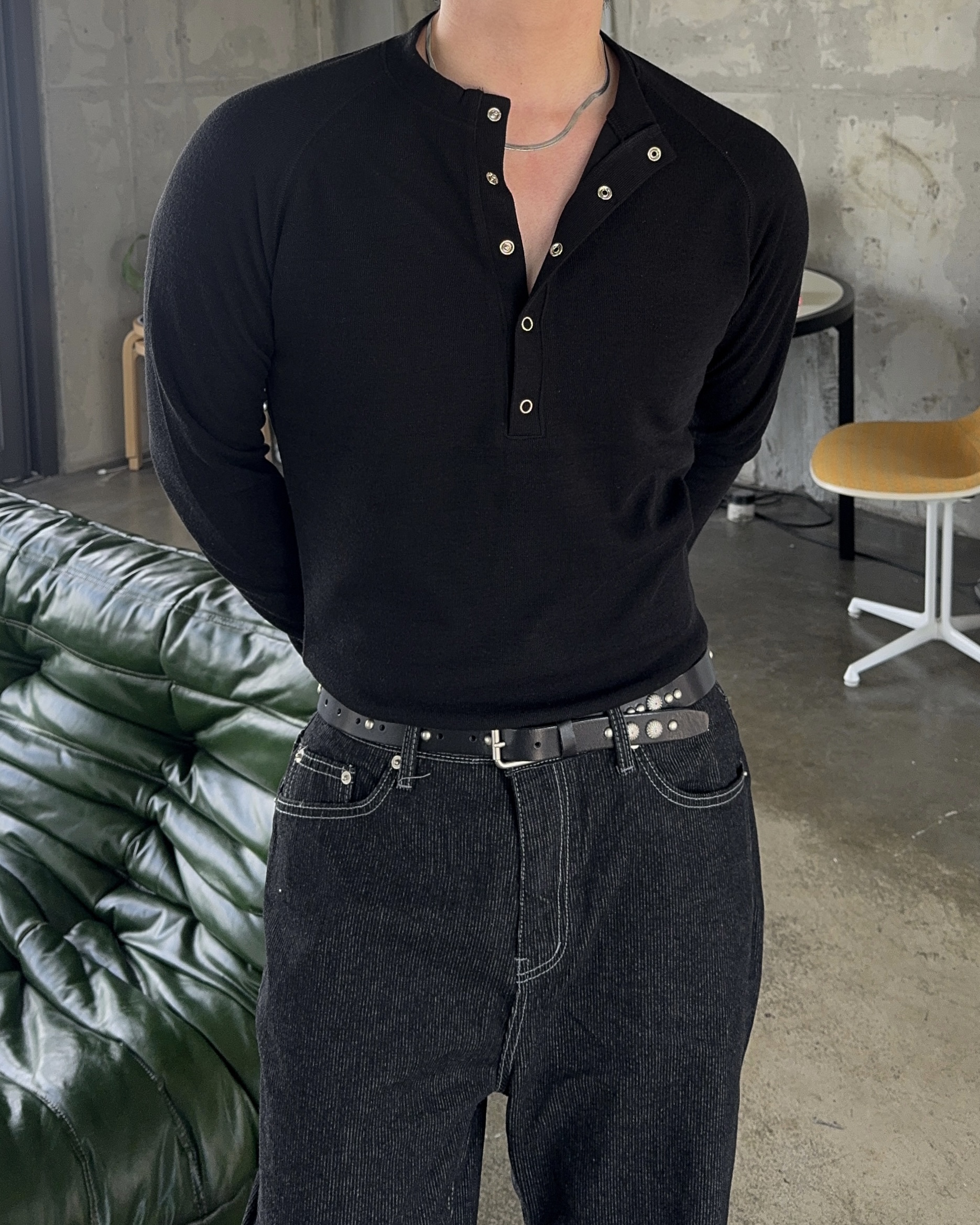 -깊은 딥 헨리넥 디자인과 실버 버튼으로 고급스러운 포인트