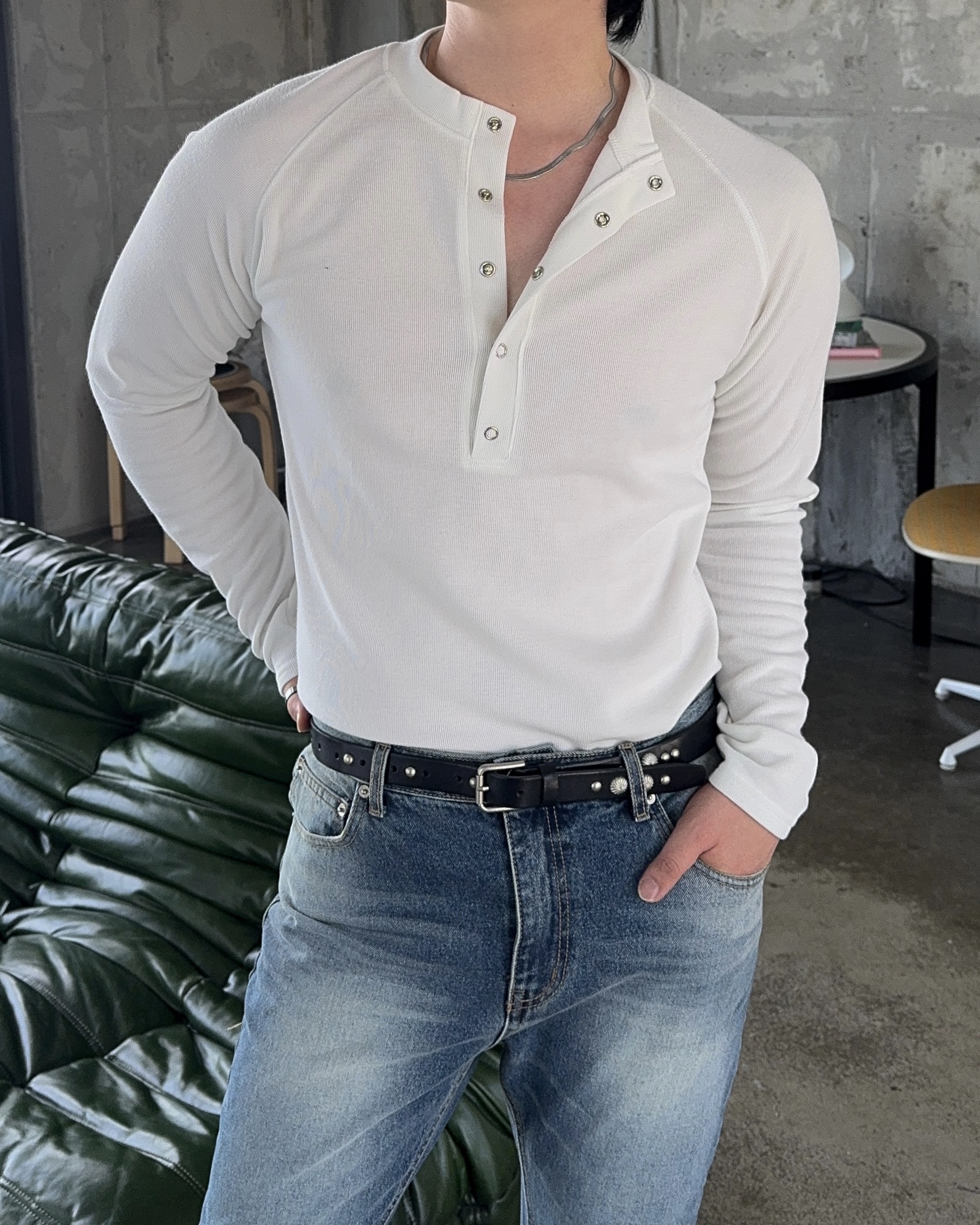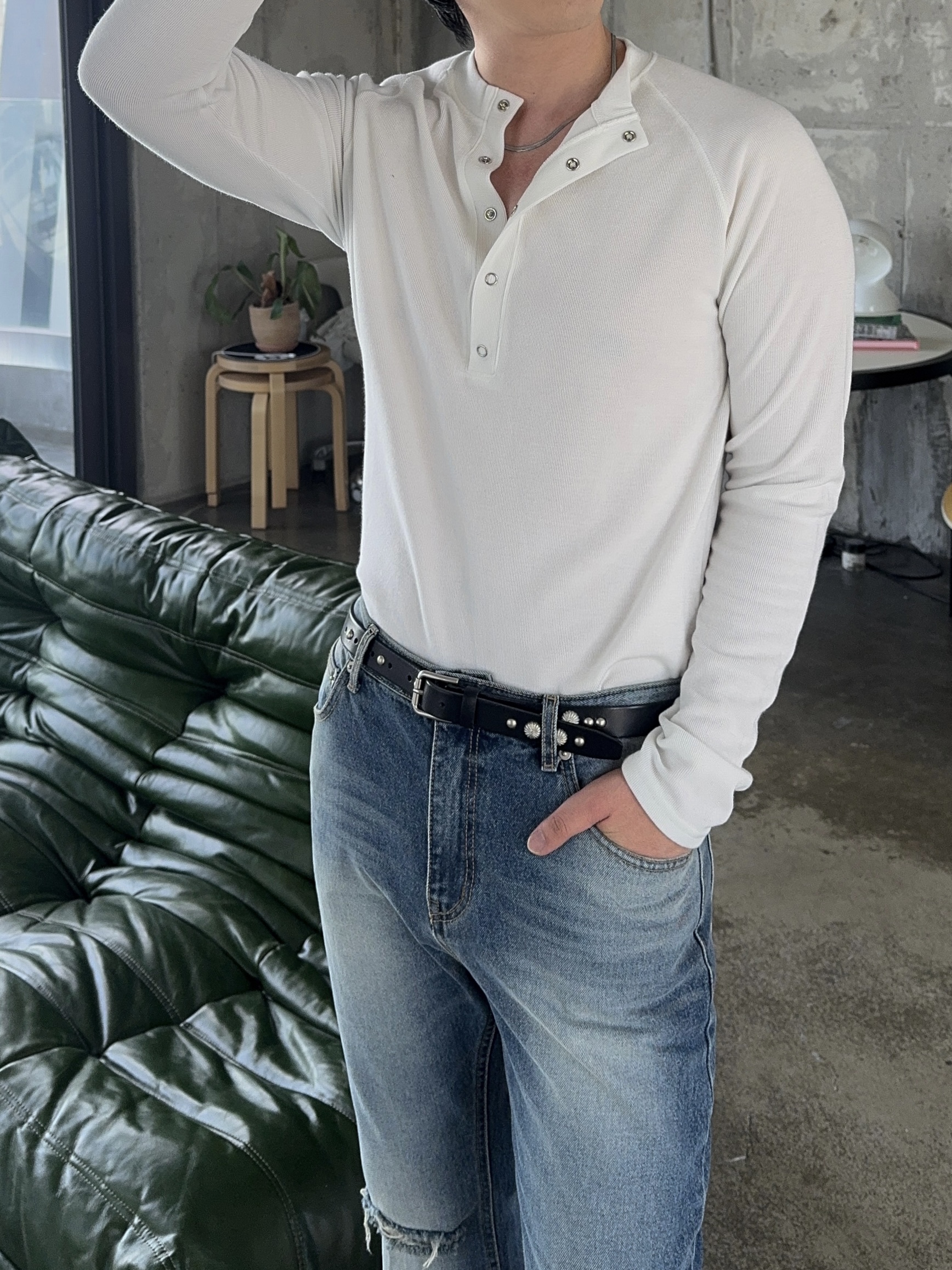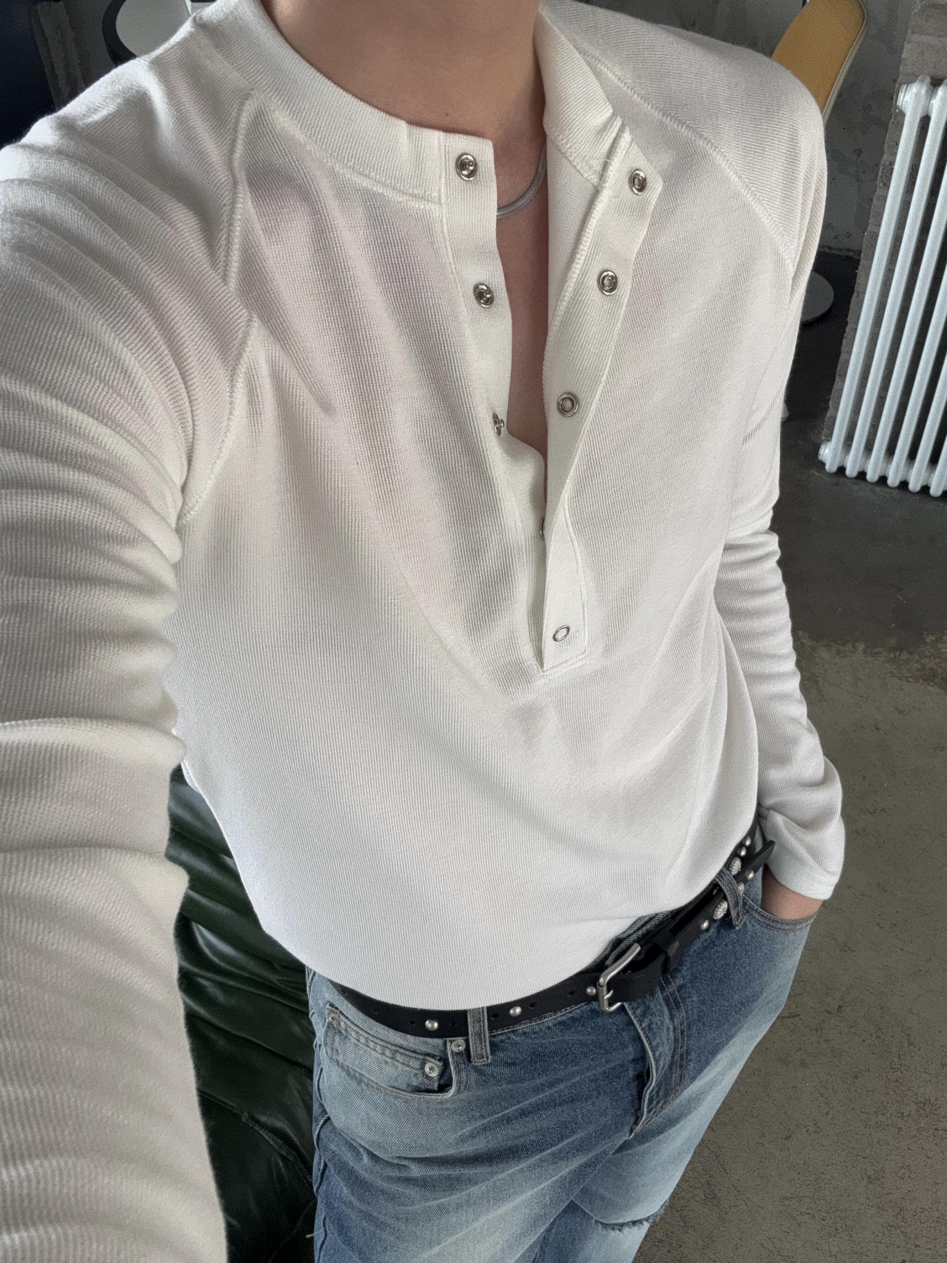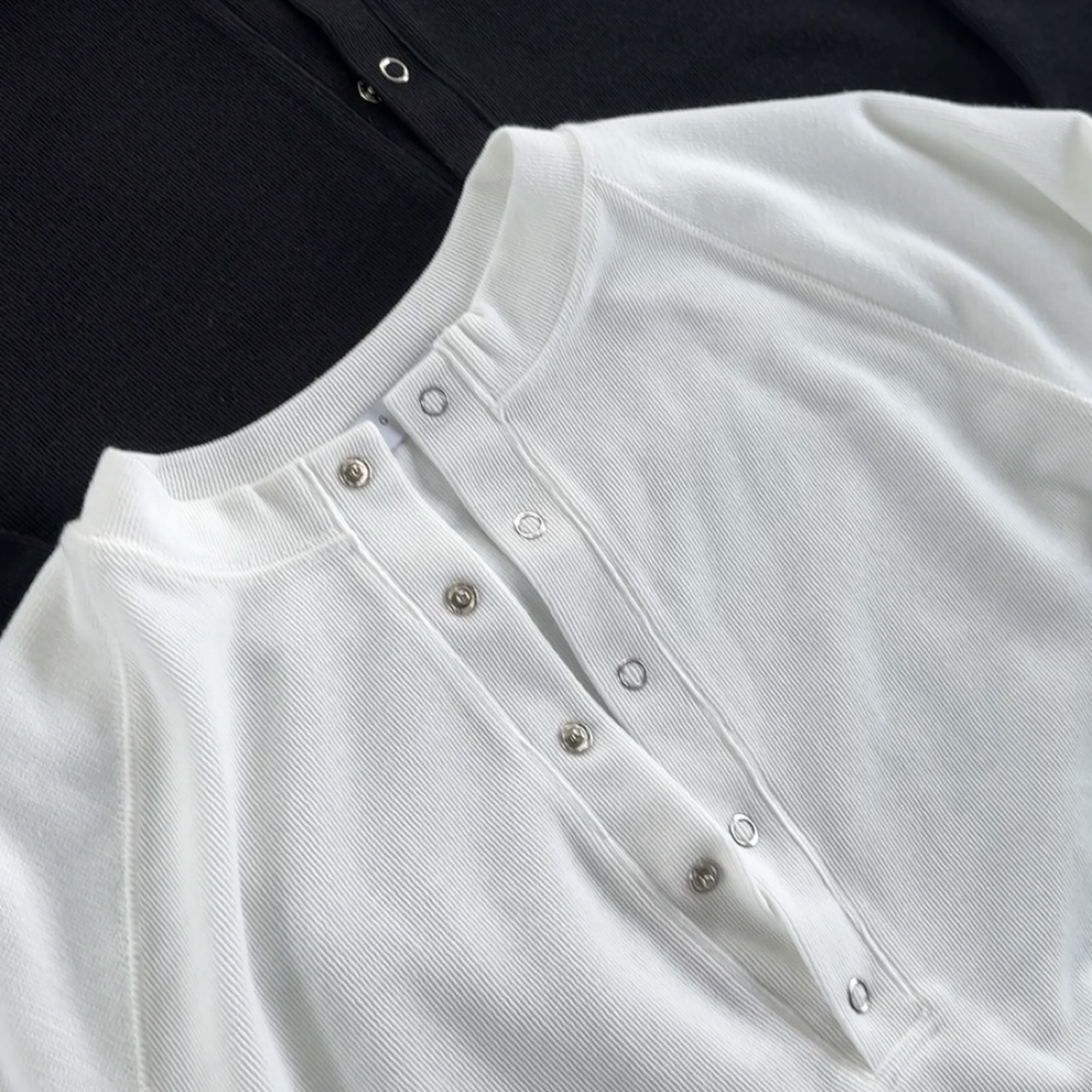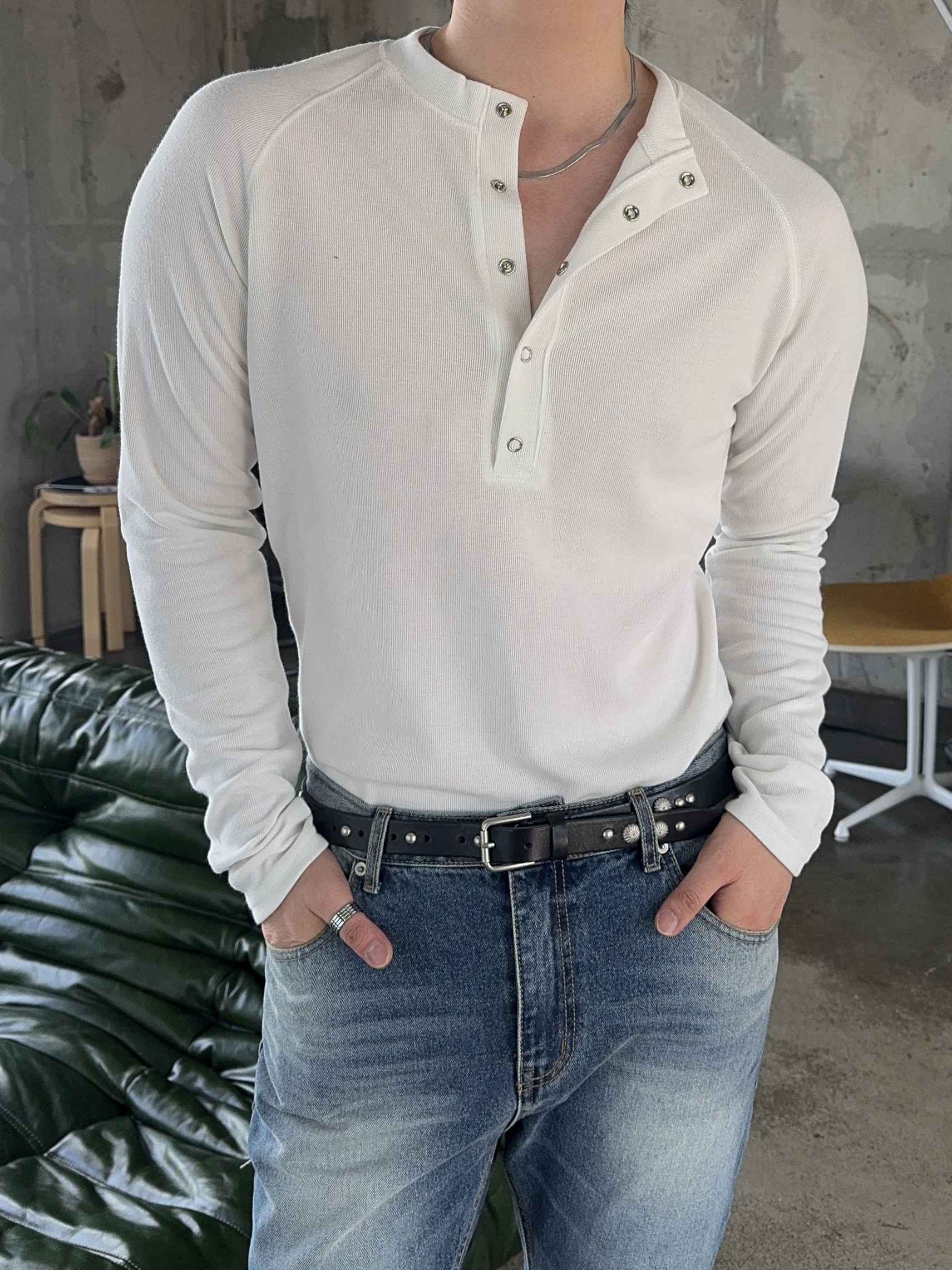 -깊은 딥 헨리넥 디자인과 실버 버튼으로 고급스러운 포인트