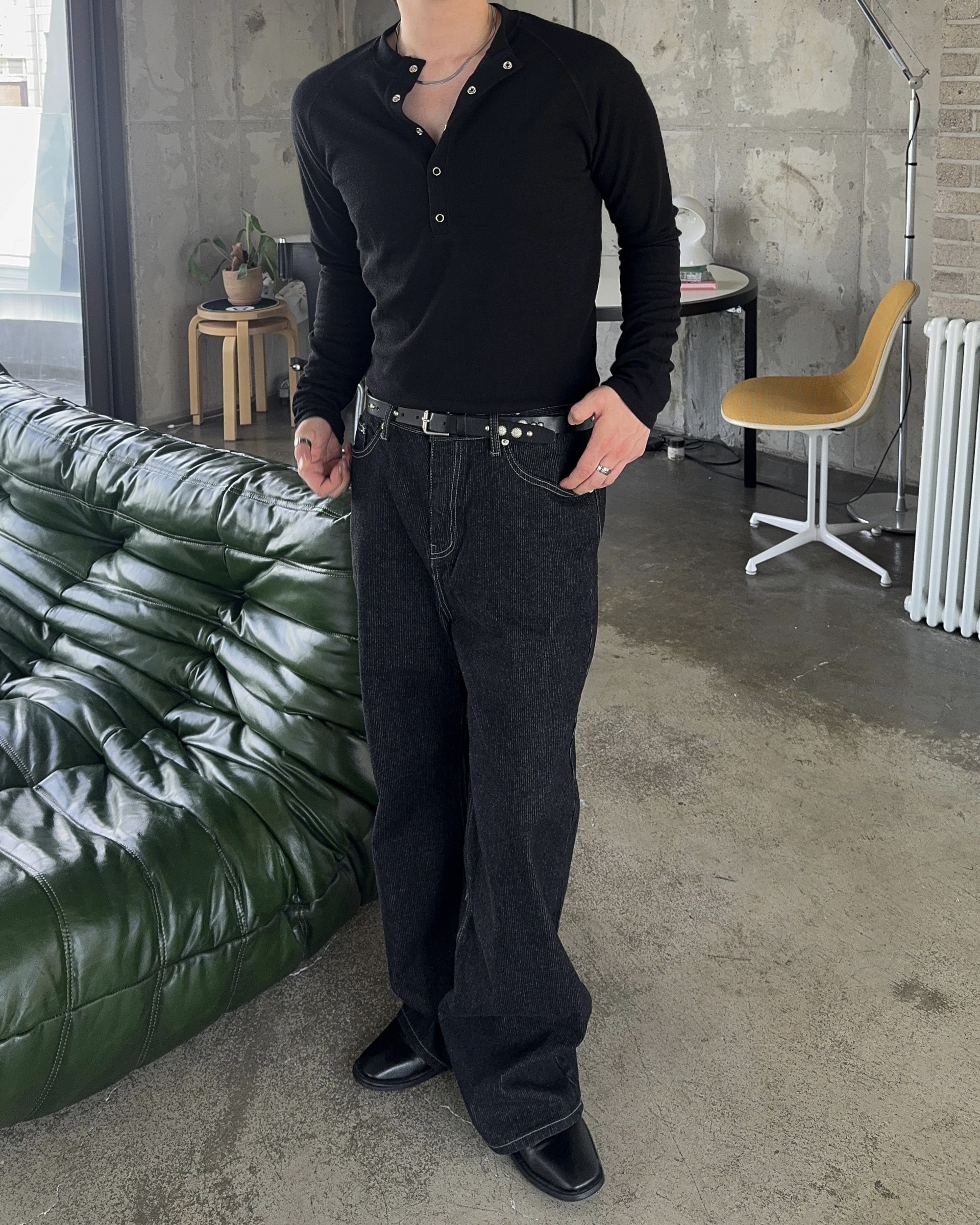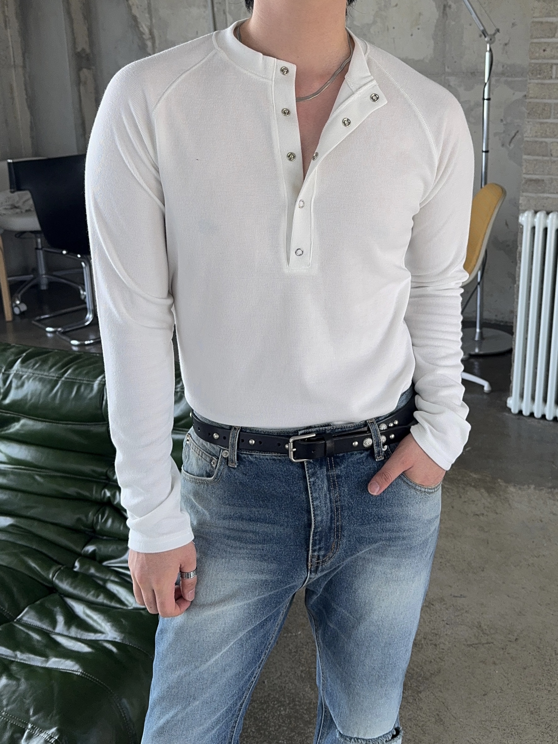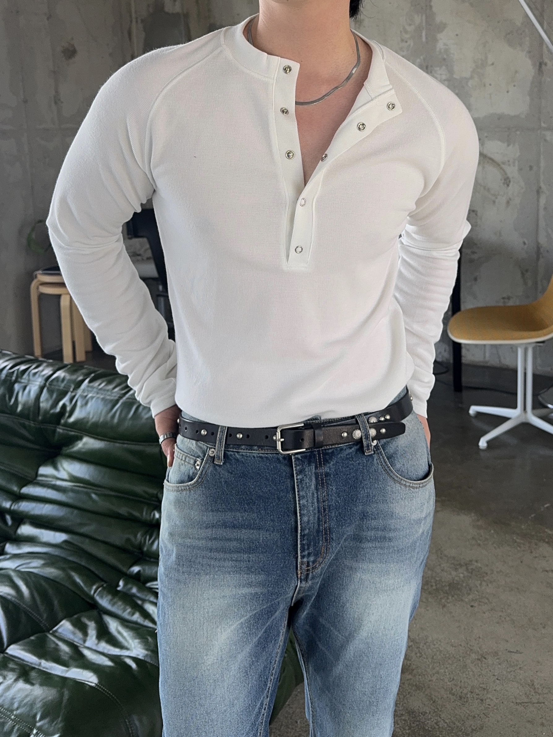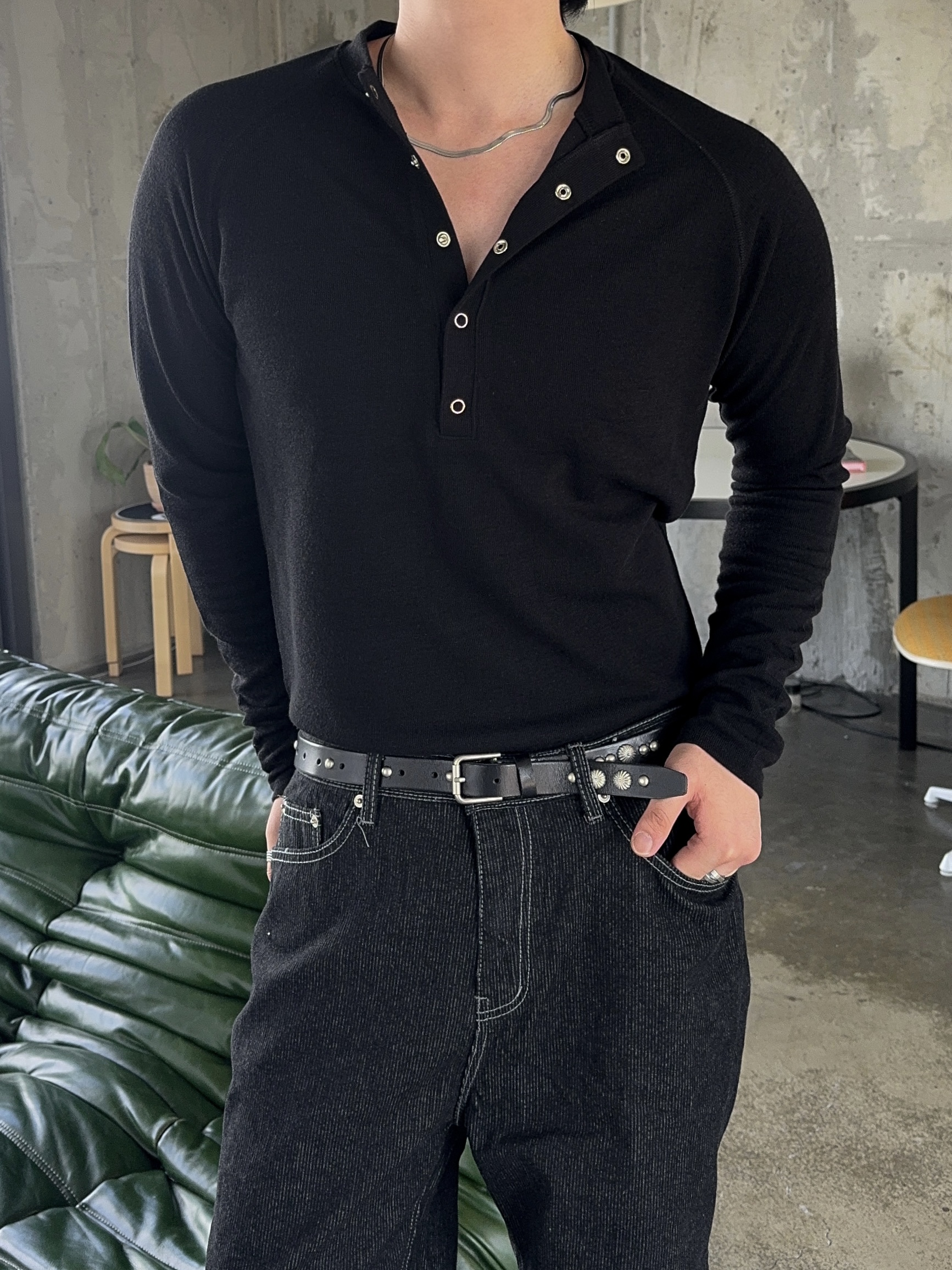 -깊은 딥 헨리넥 디자인과 실버 버튼으로 고급스러운 포인트