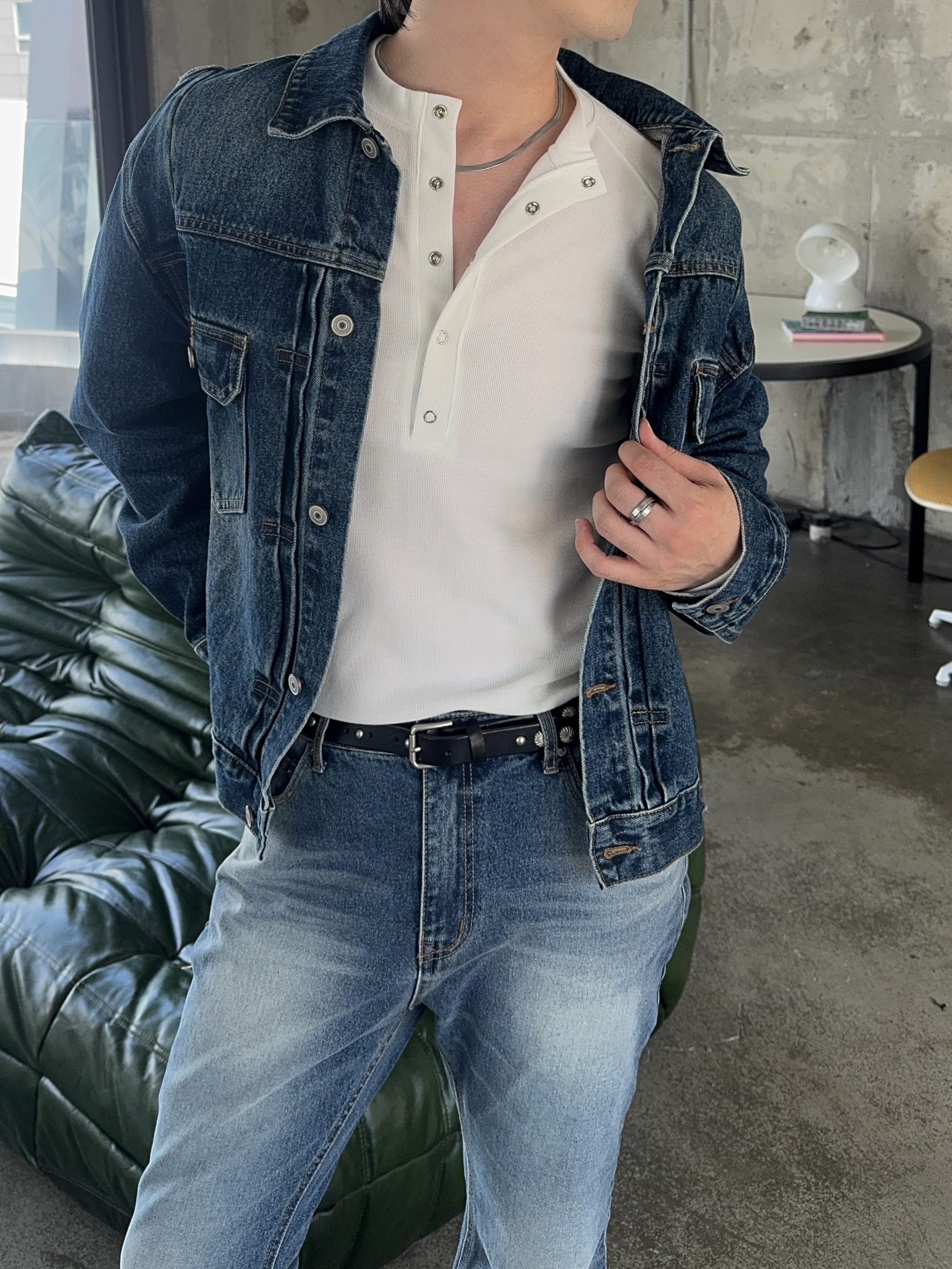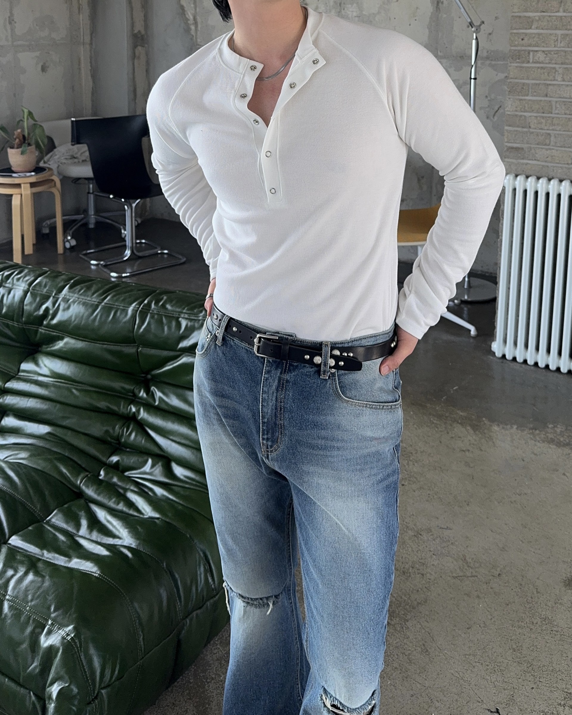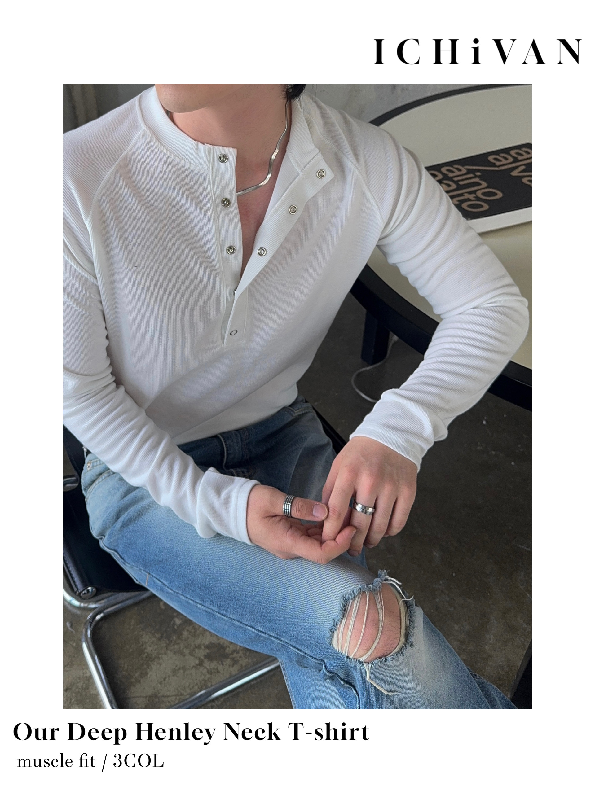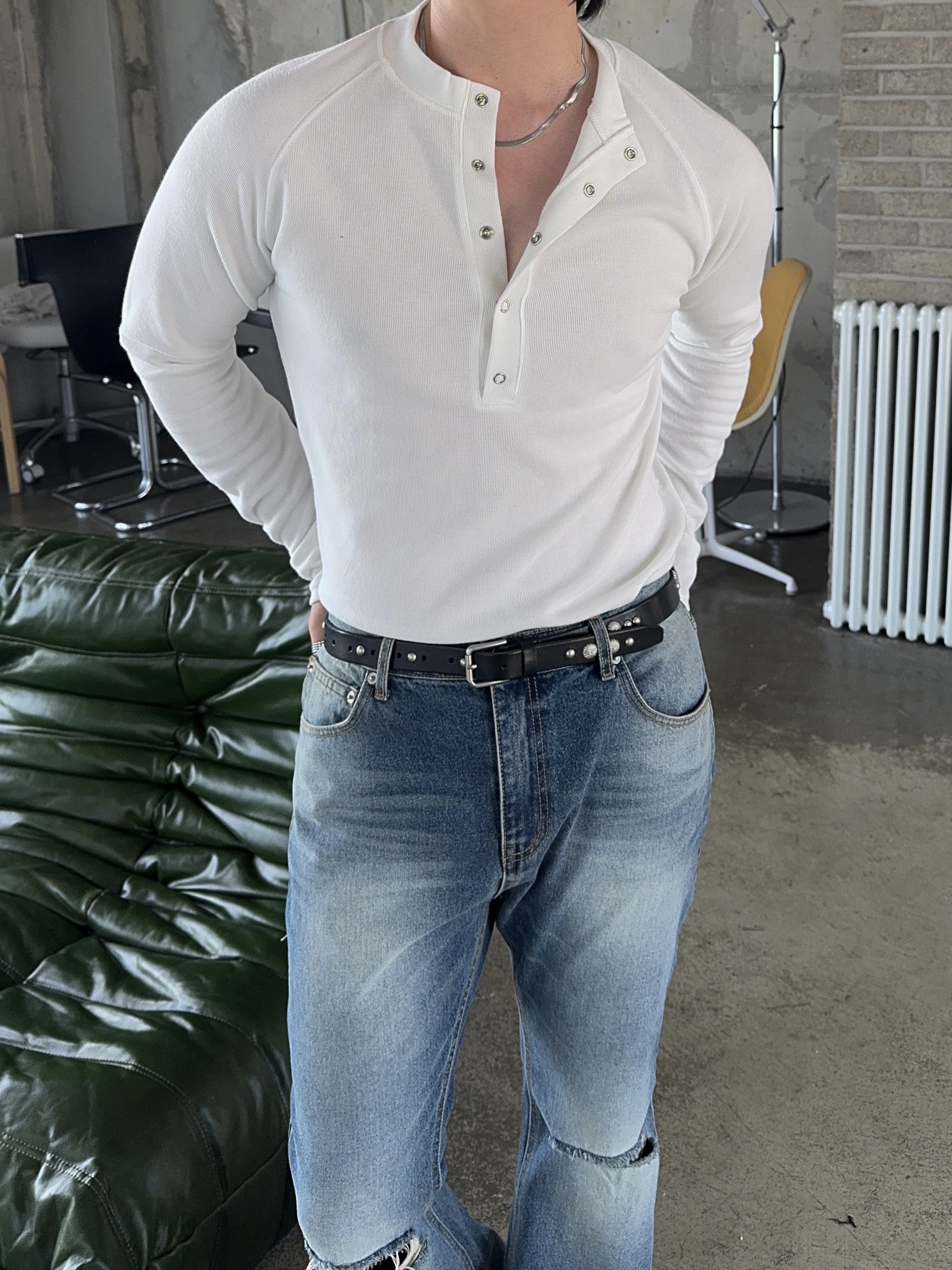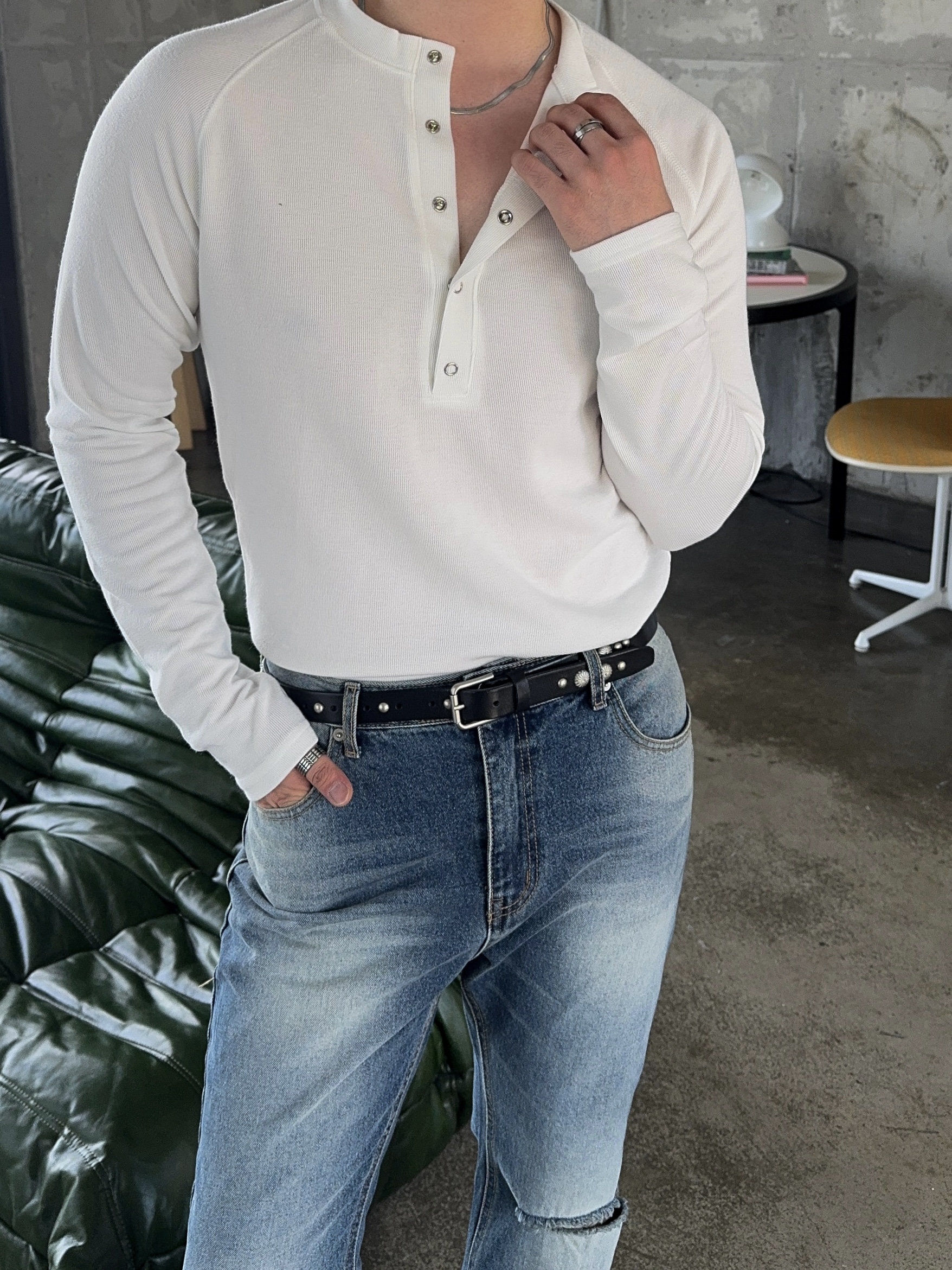 -깊은 딥 헨리넥 디자인과 실버 버튼으로 고급스러운 포인트