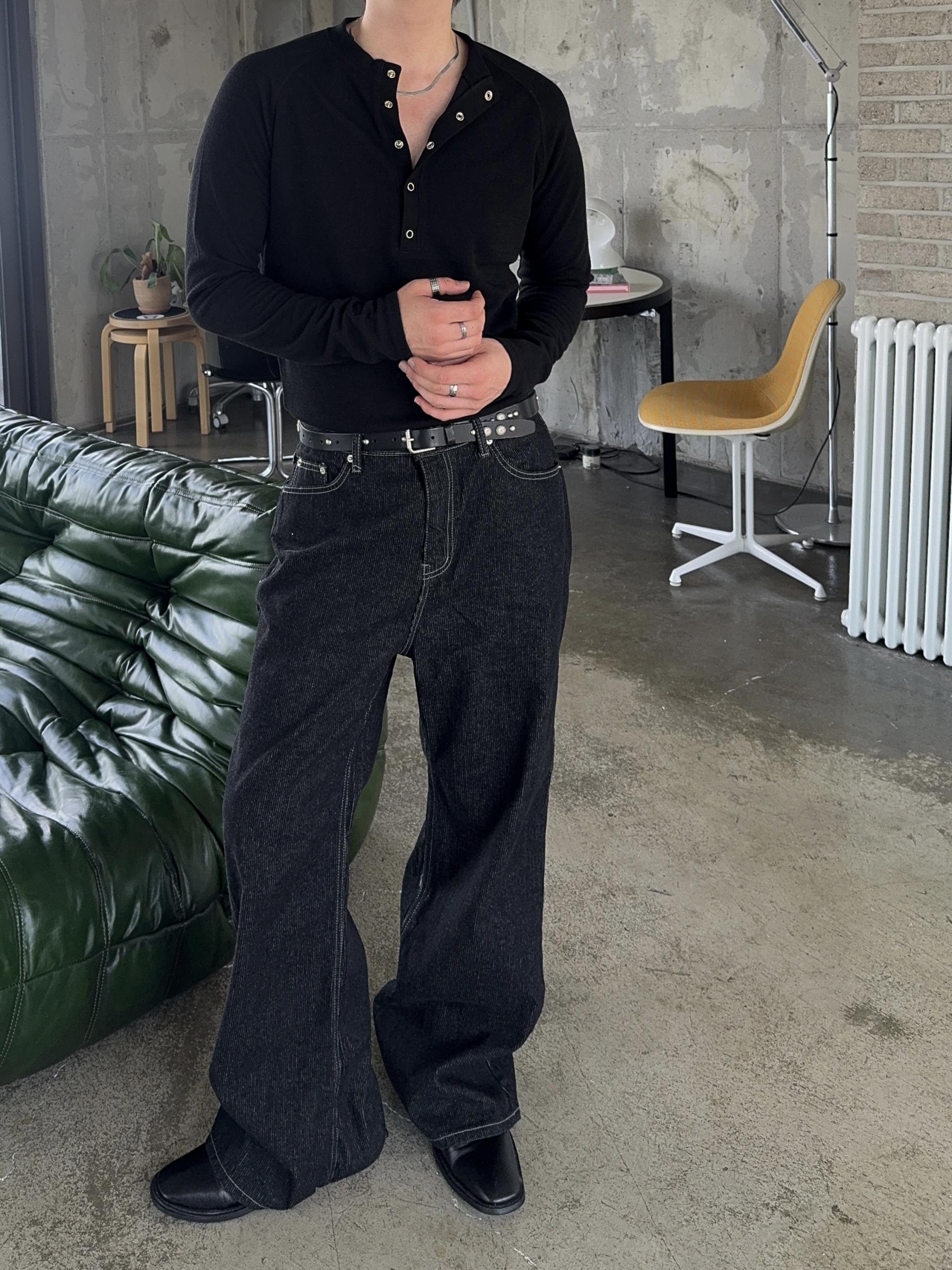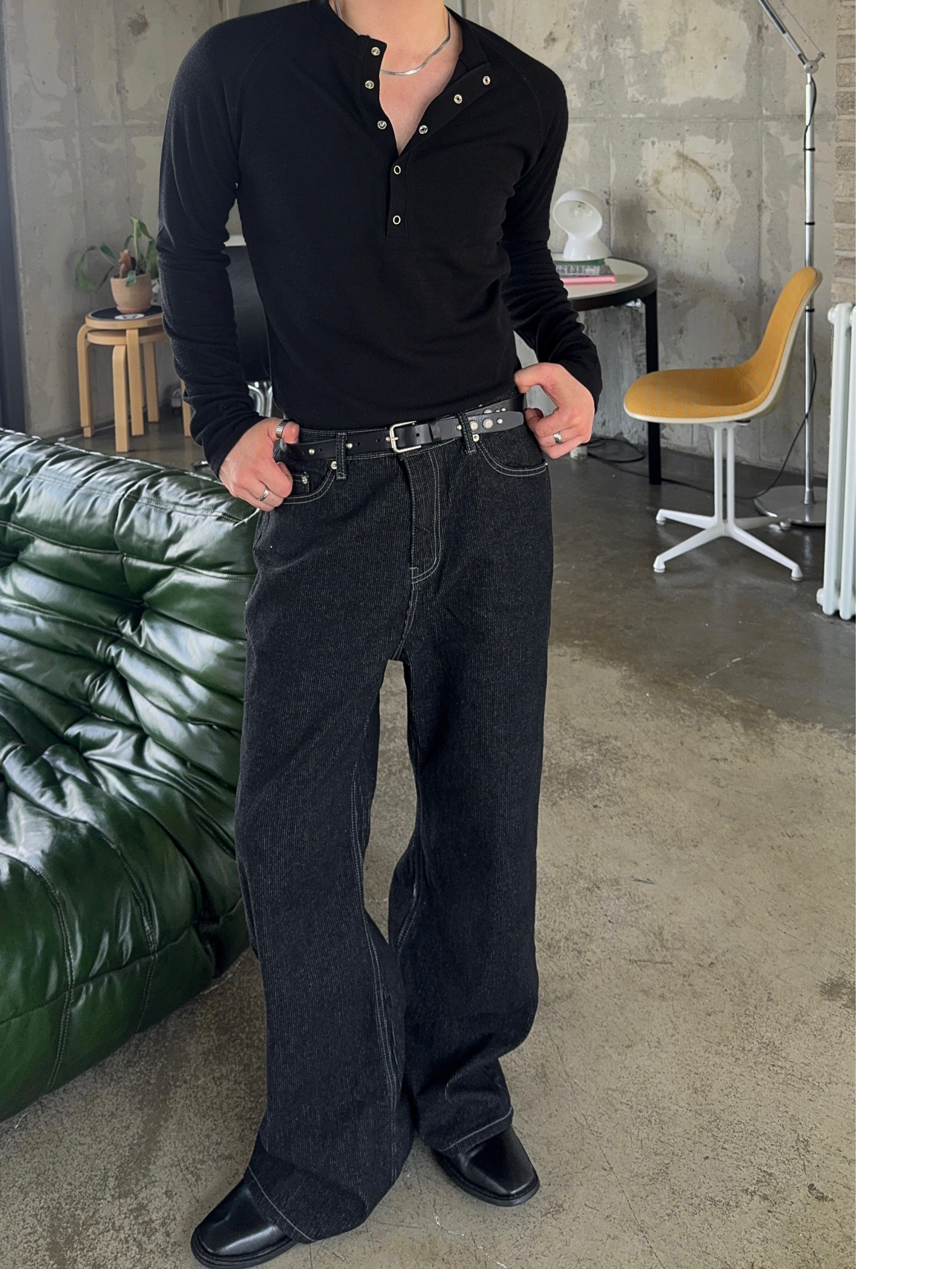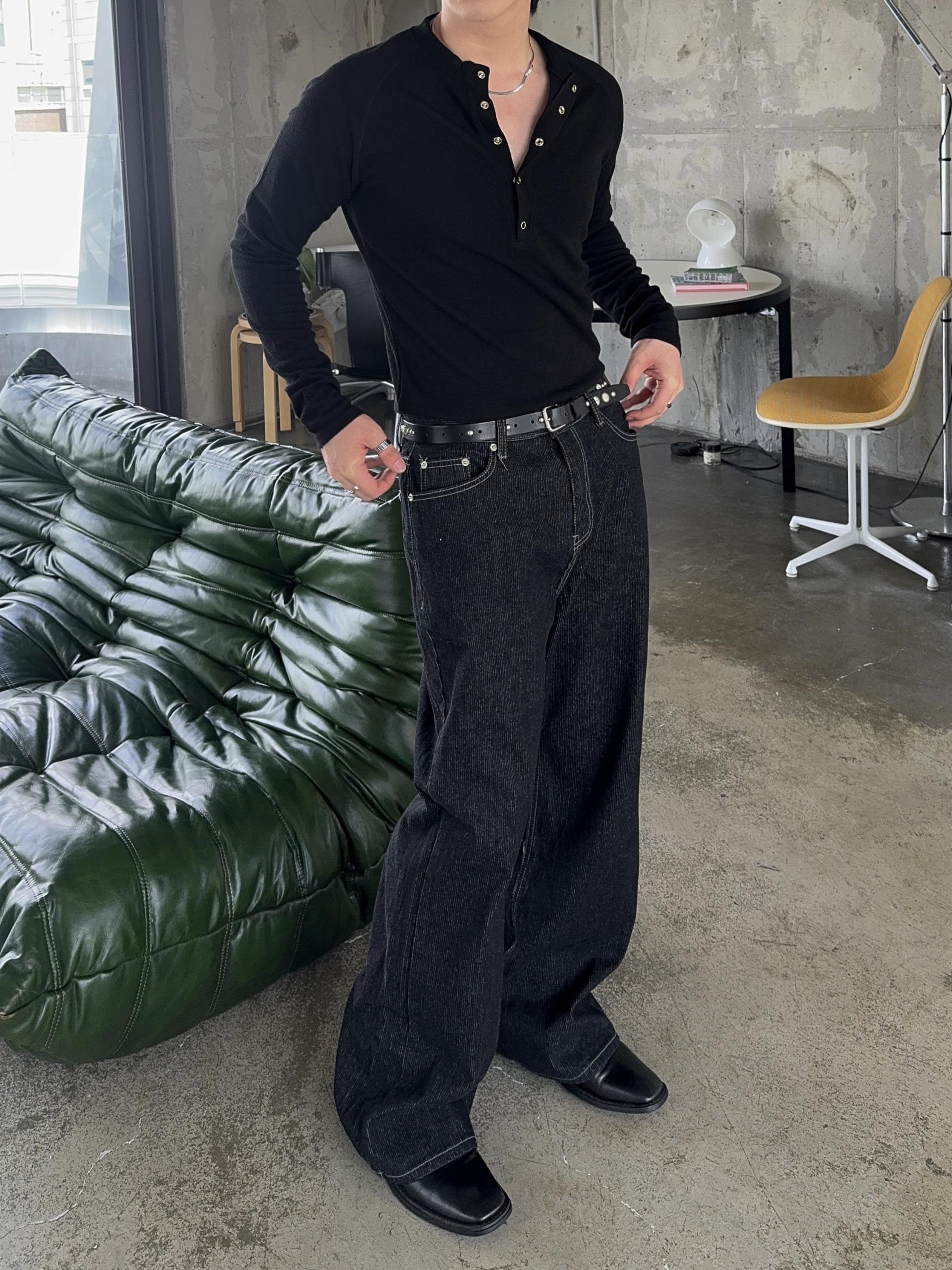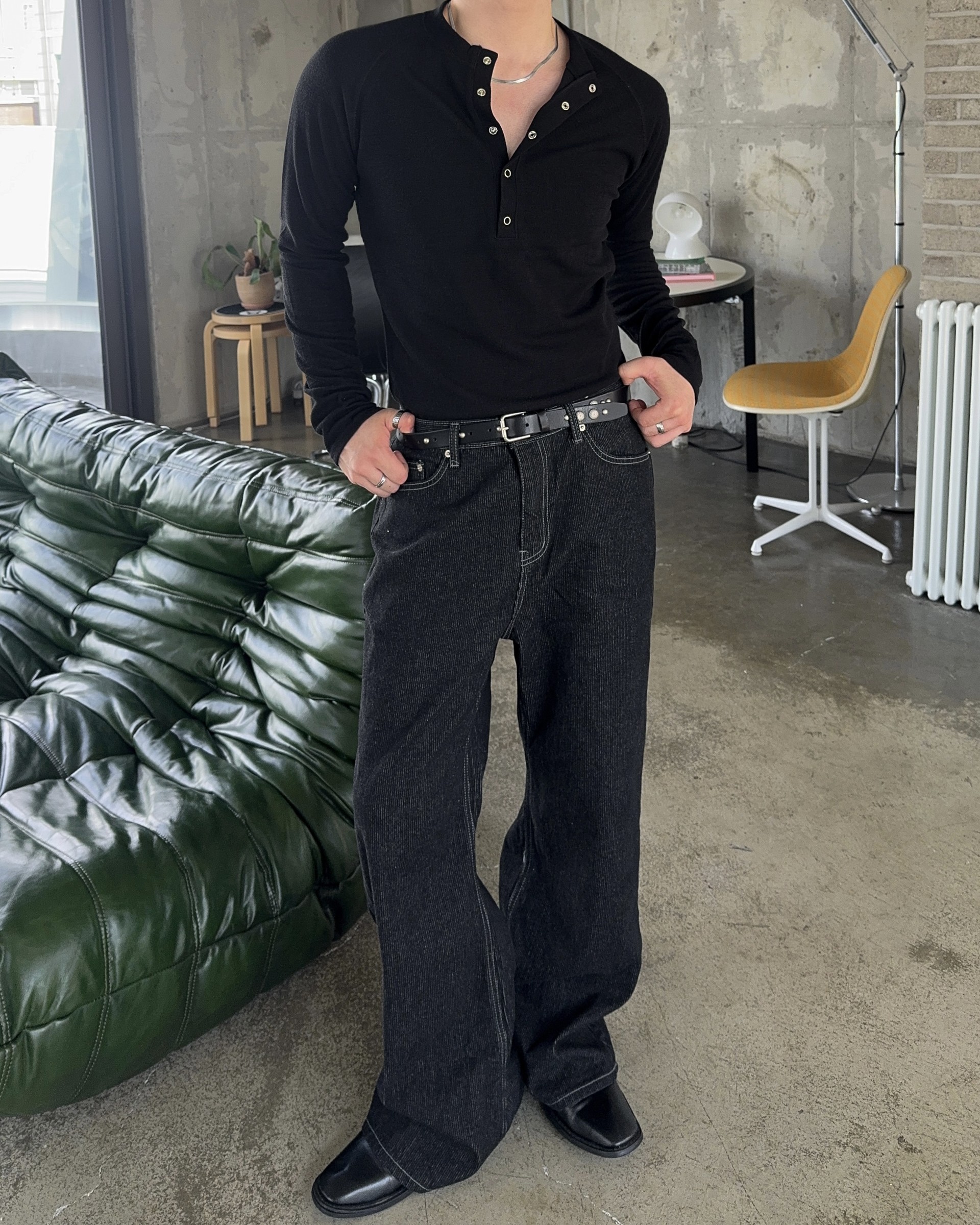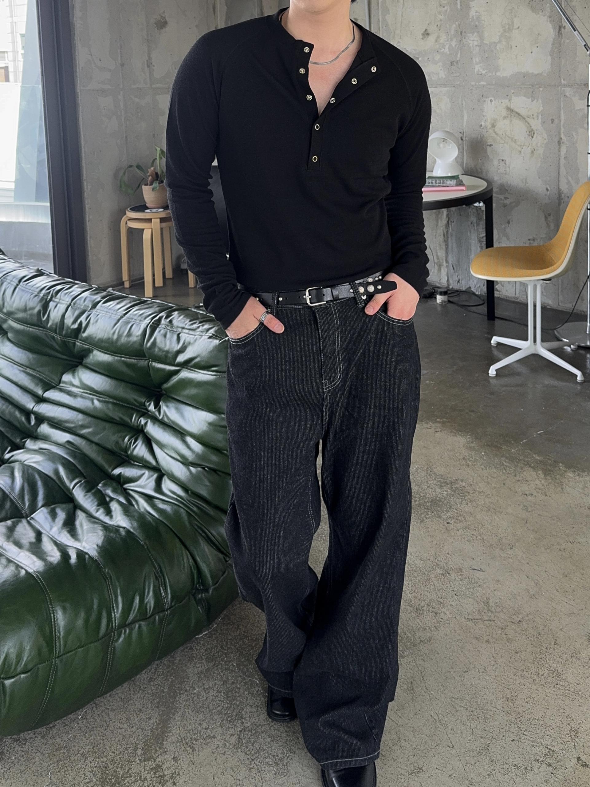 -깊은 딥 헨리넥 디자인과 실버 버튼으로 고급스러운 포인트