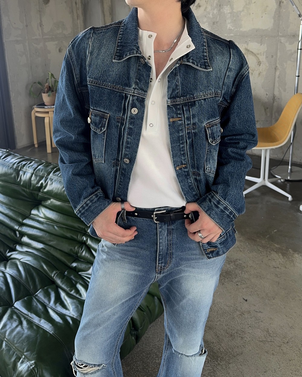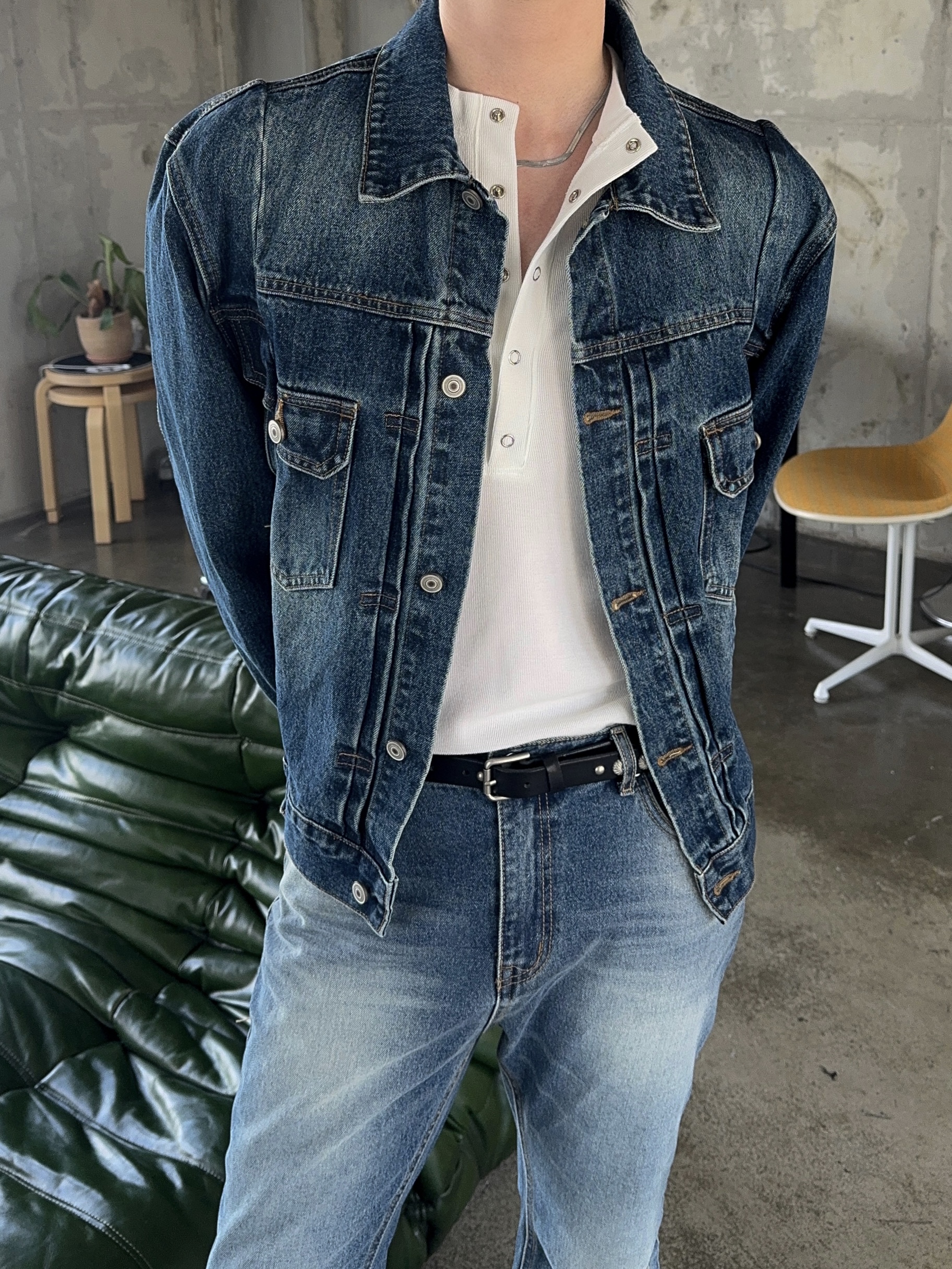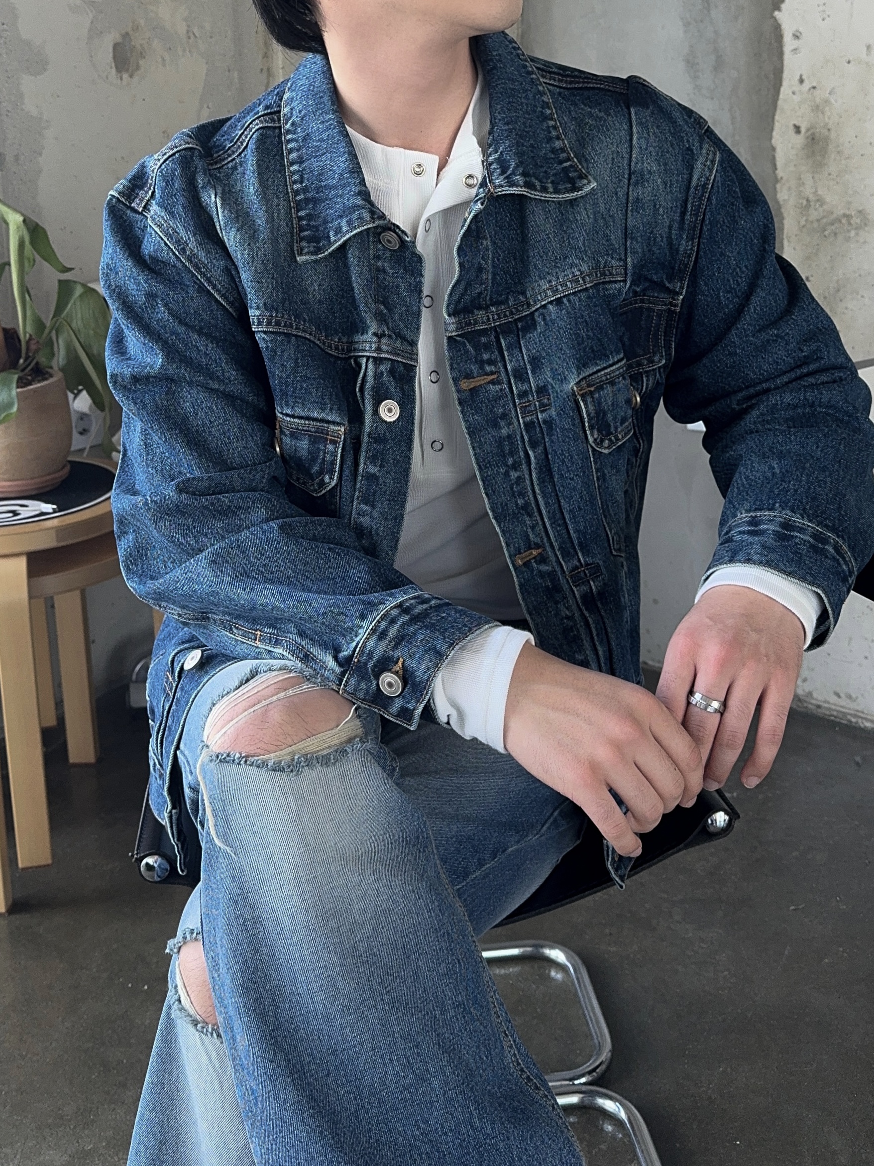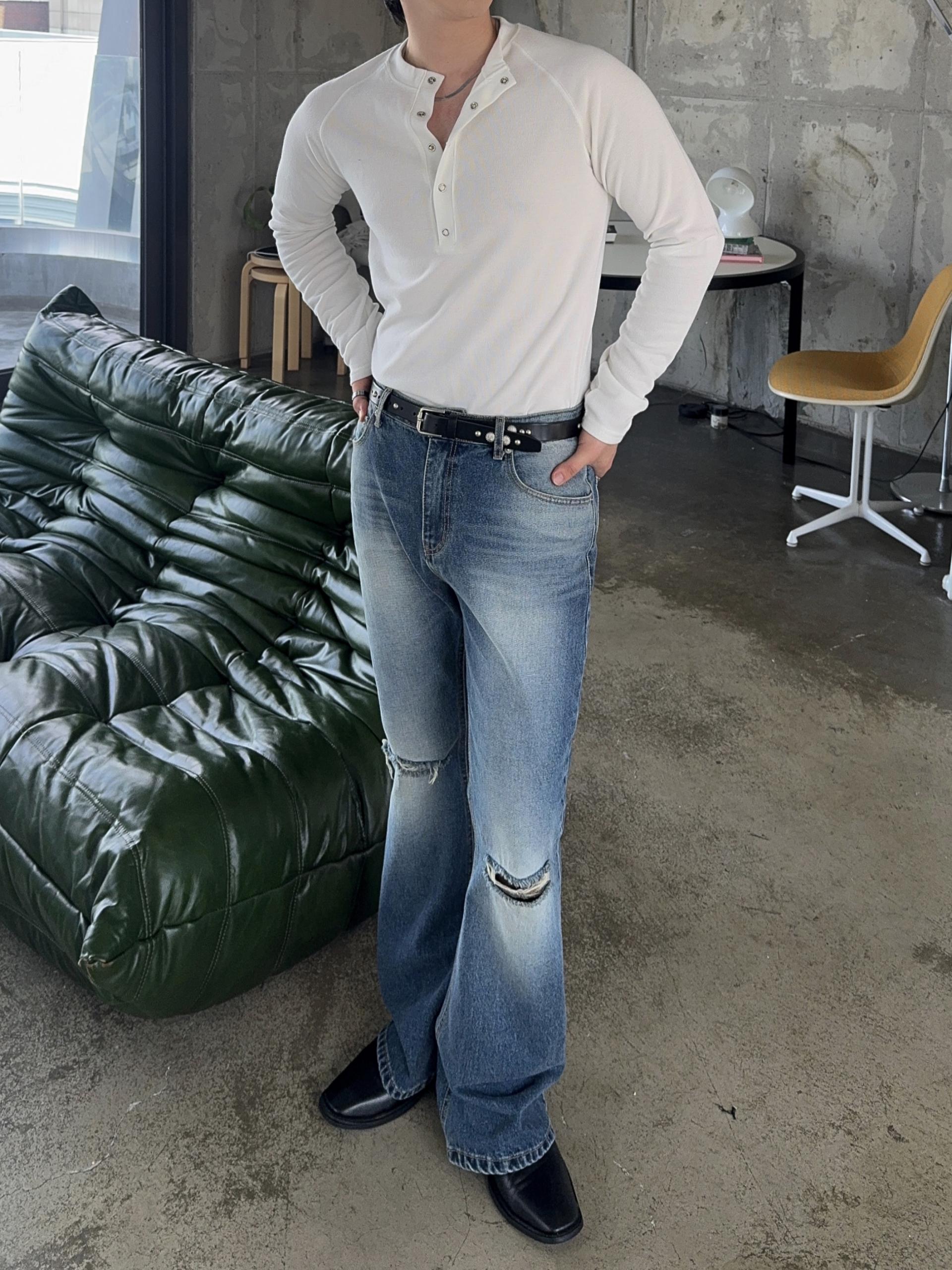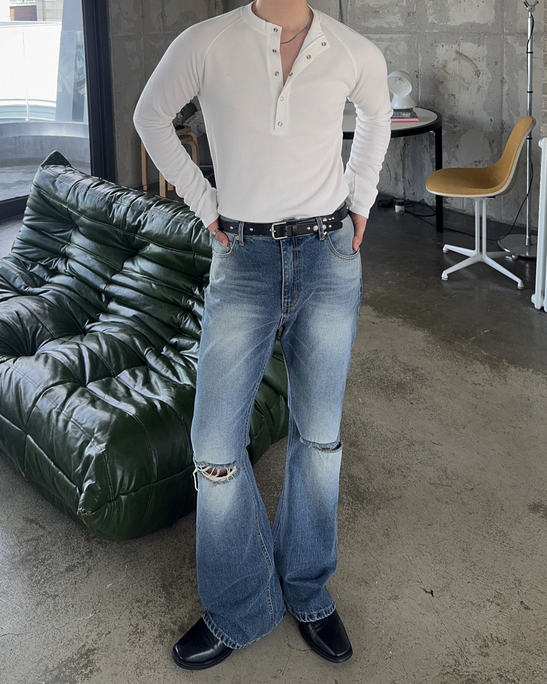 -깊은 딥 헨리넥 디자인과 실버 버튼으로 고급스러운 포인트