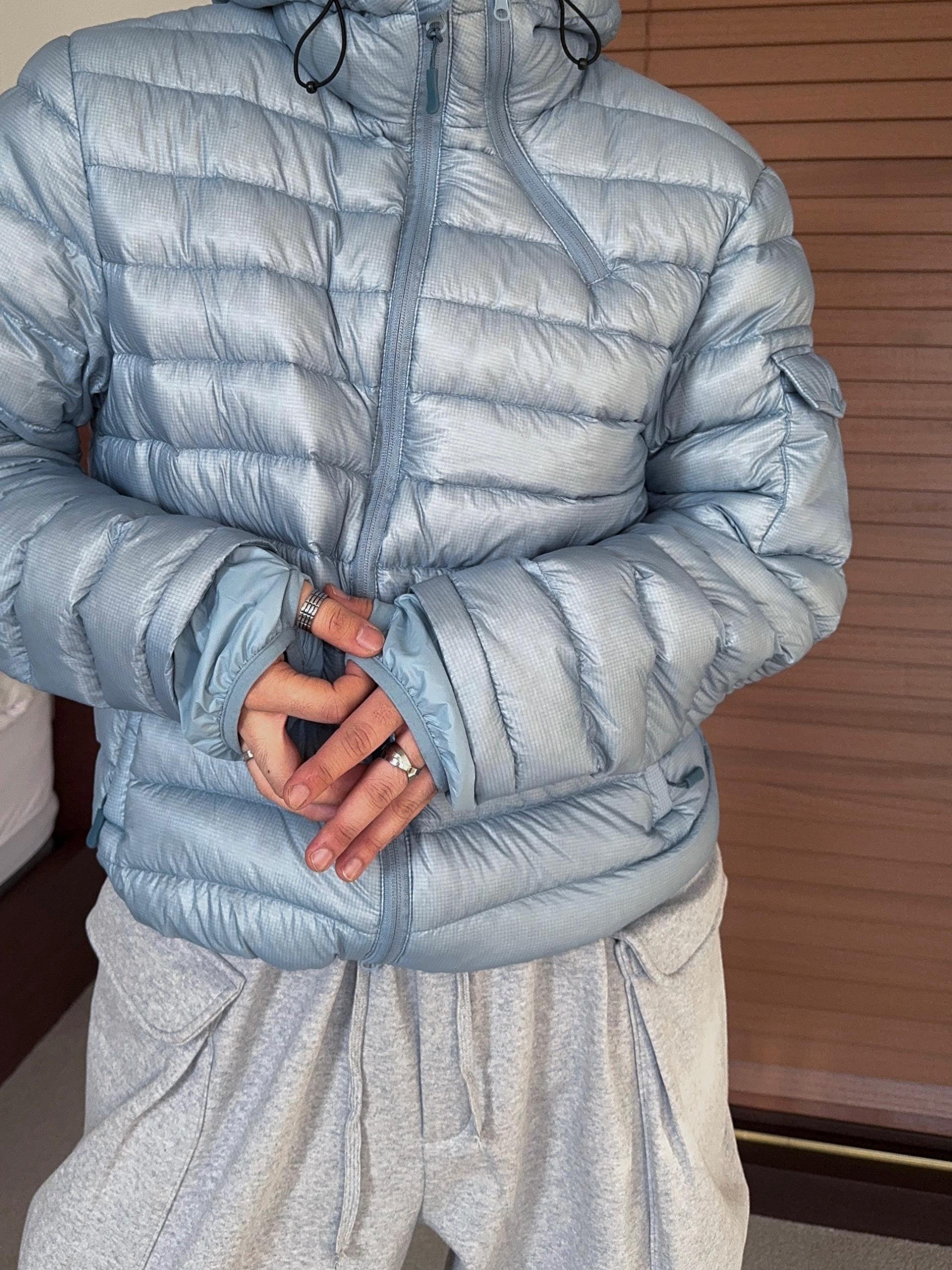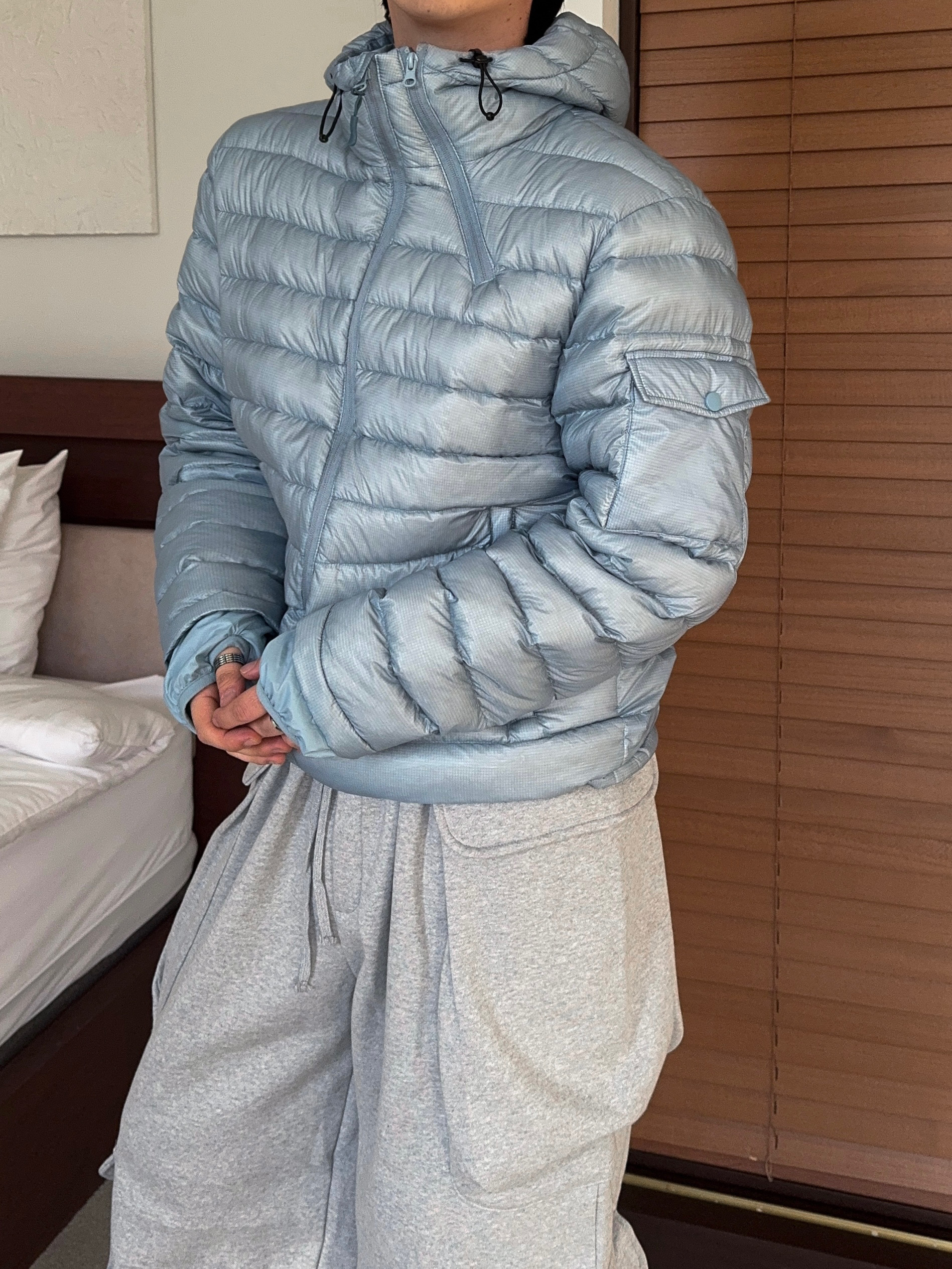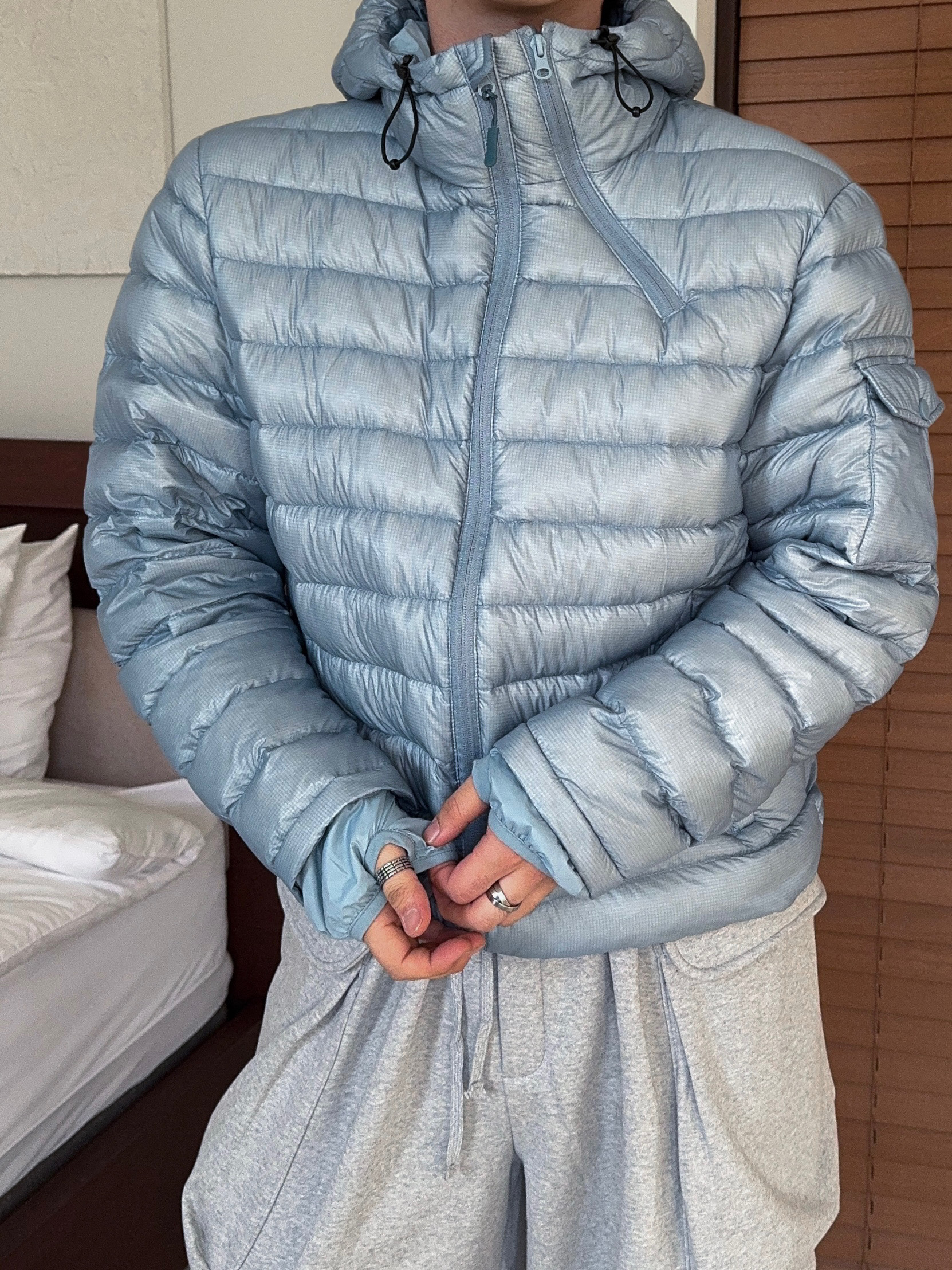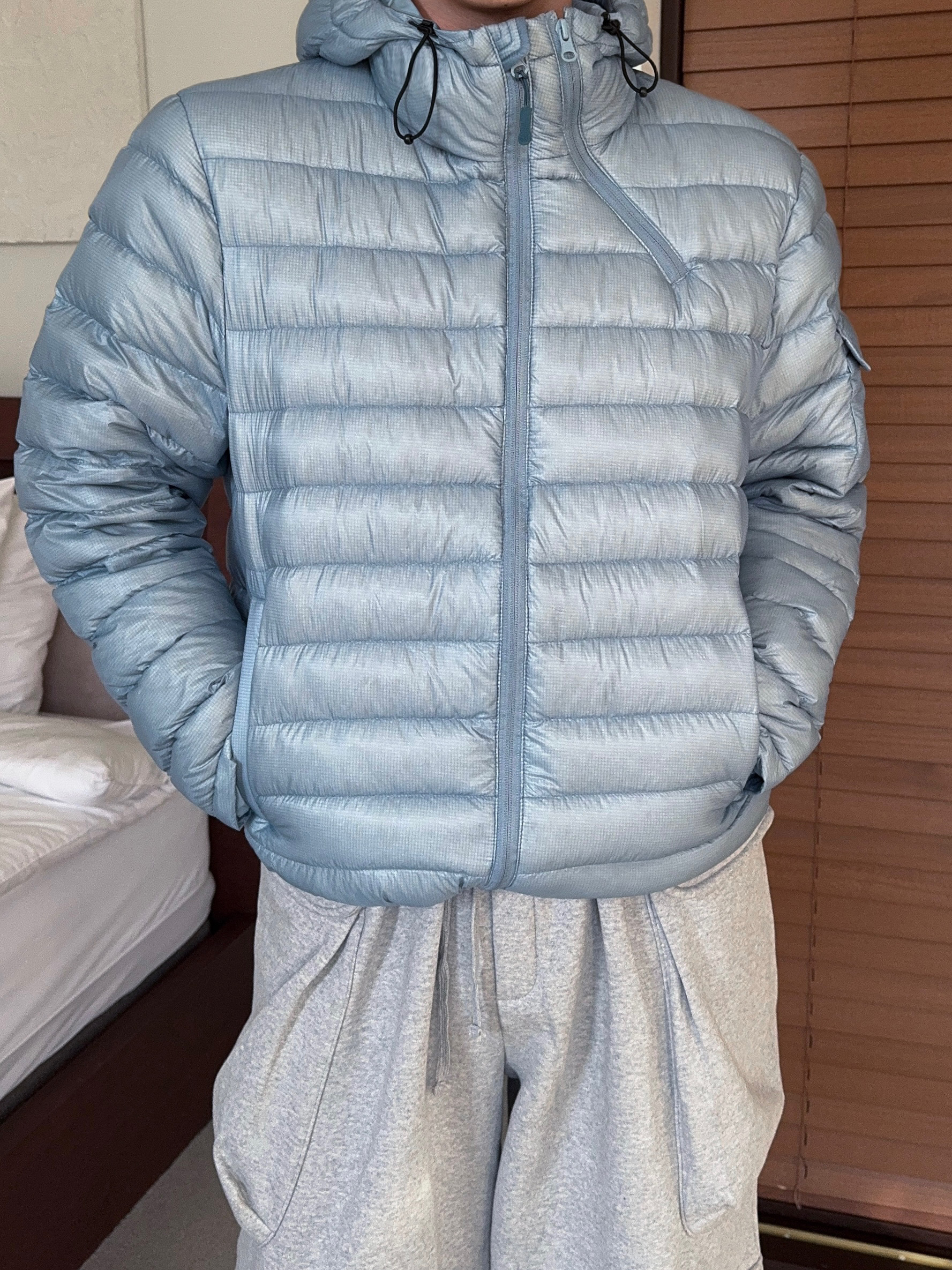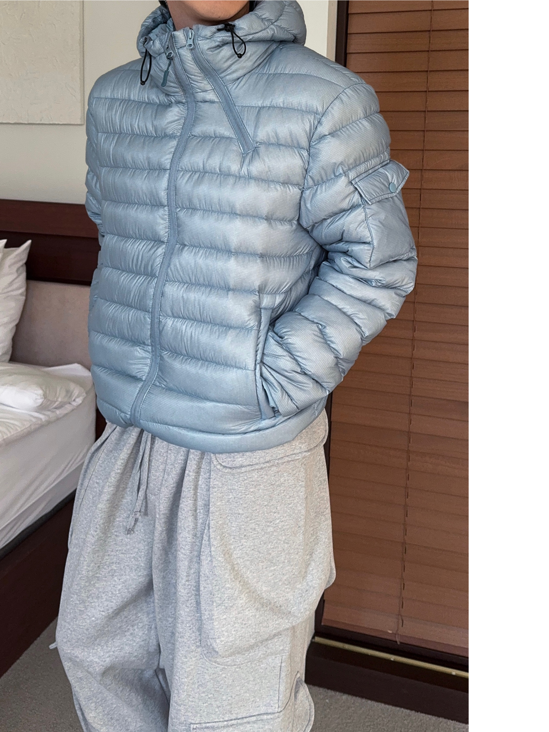 -오리털이 보이는 다운푸르프 베이비 립 원단으로 제작된 경량 패딩