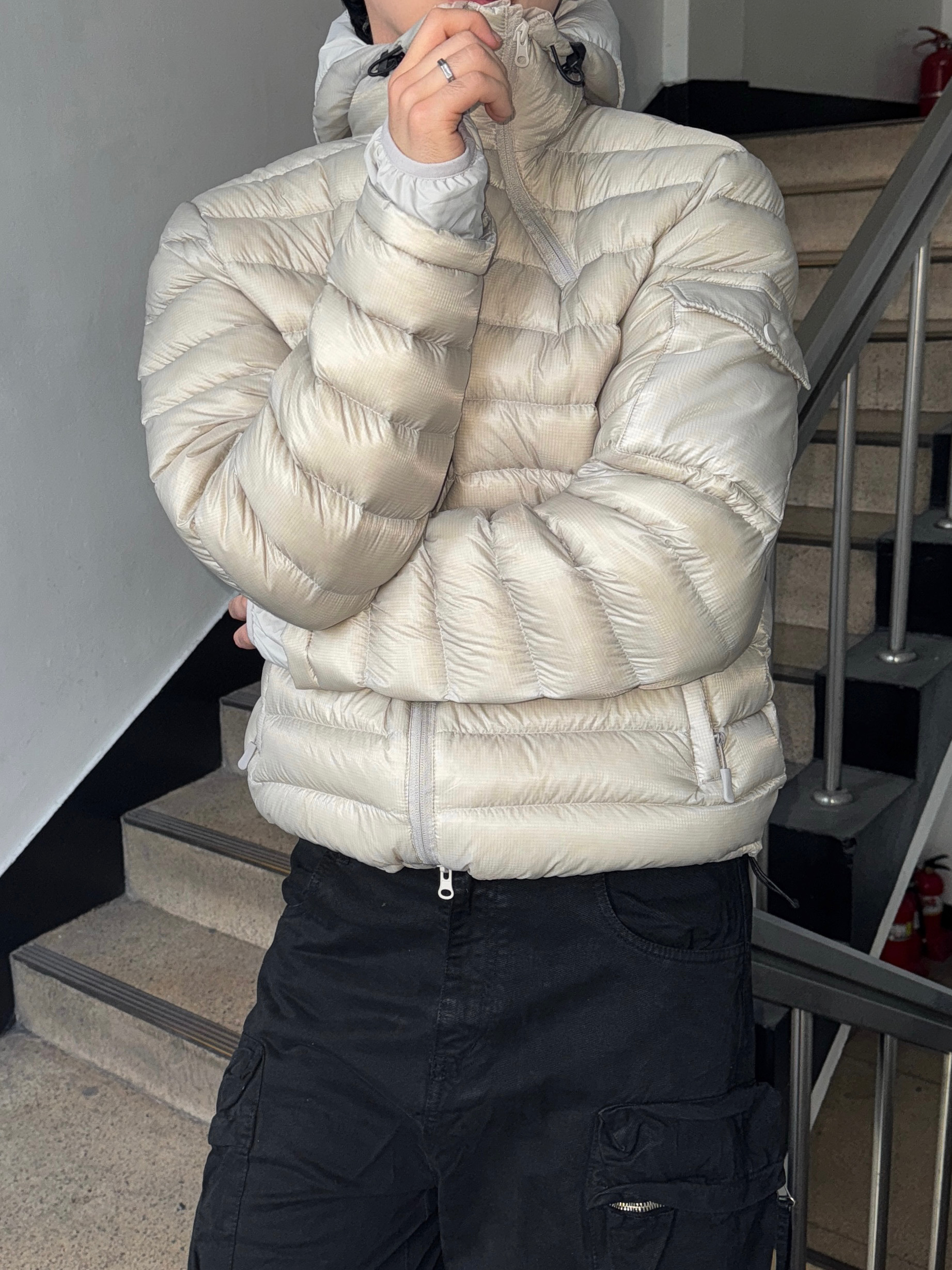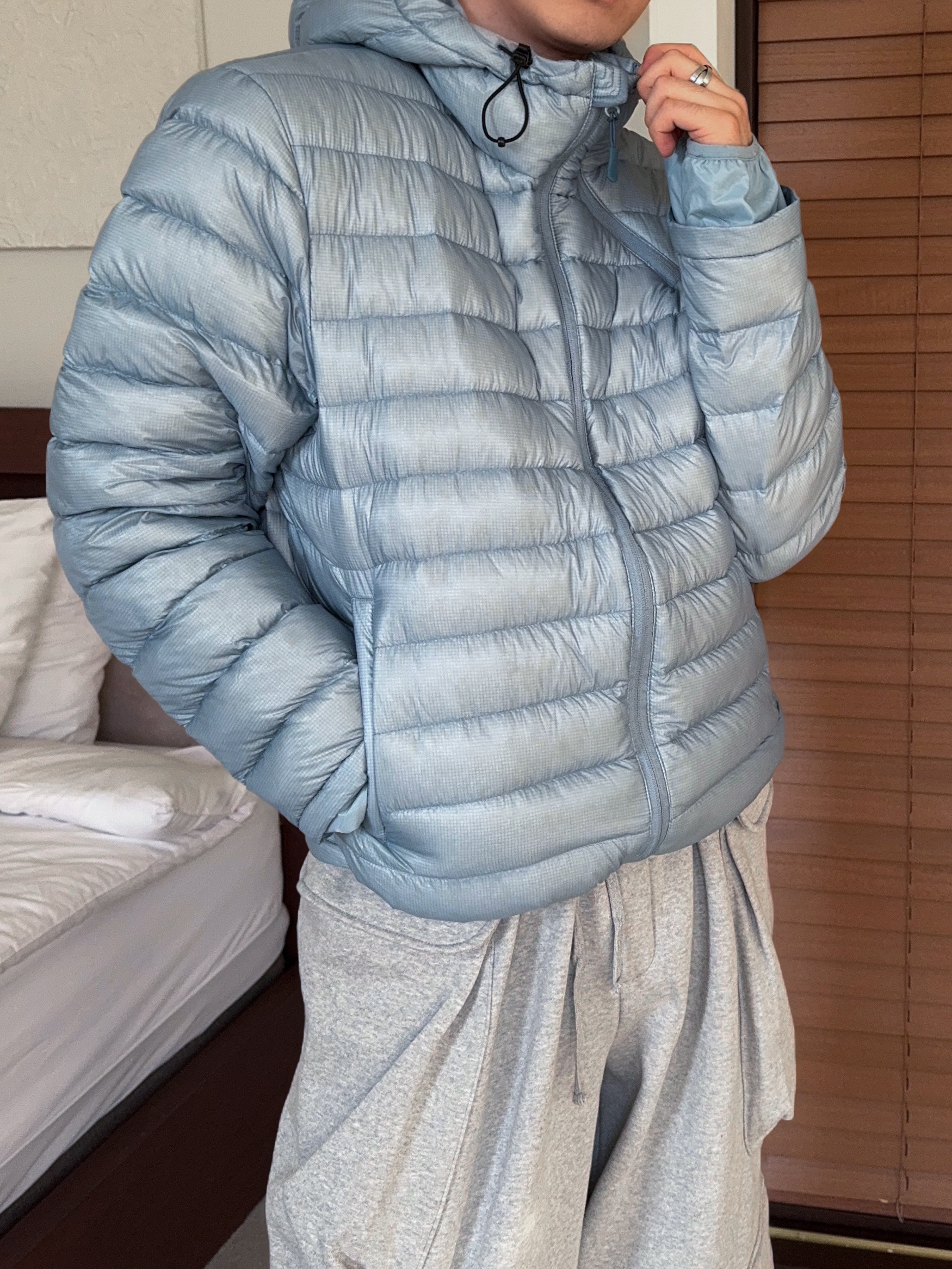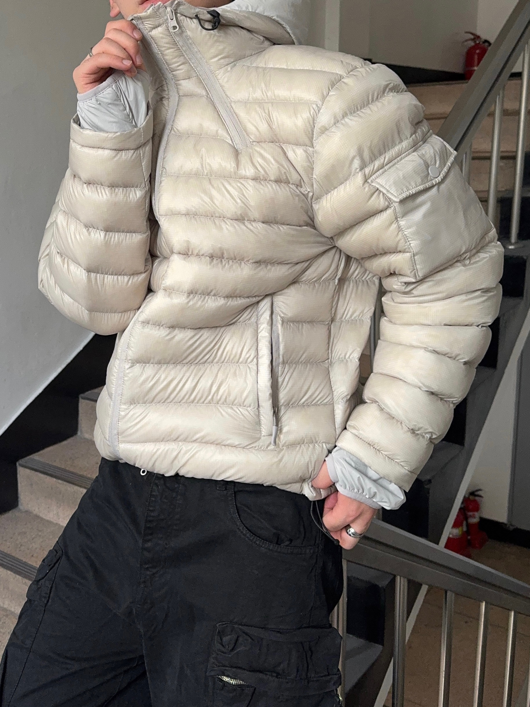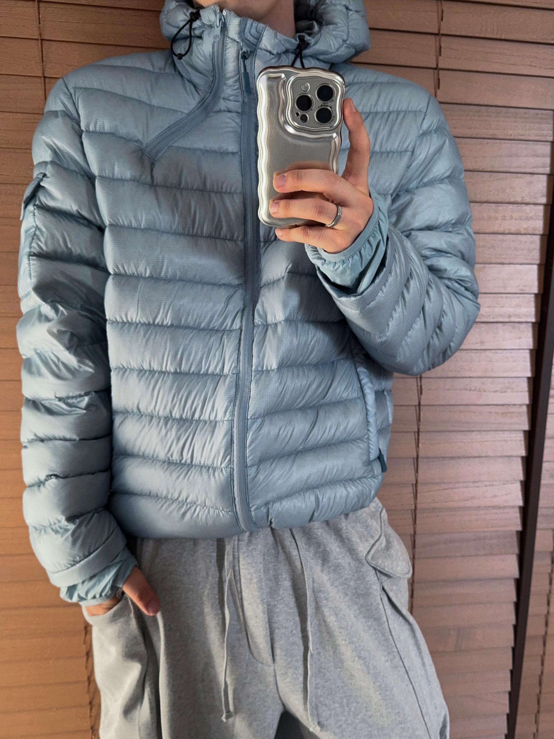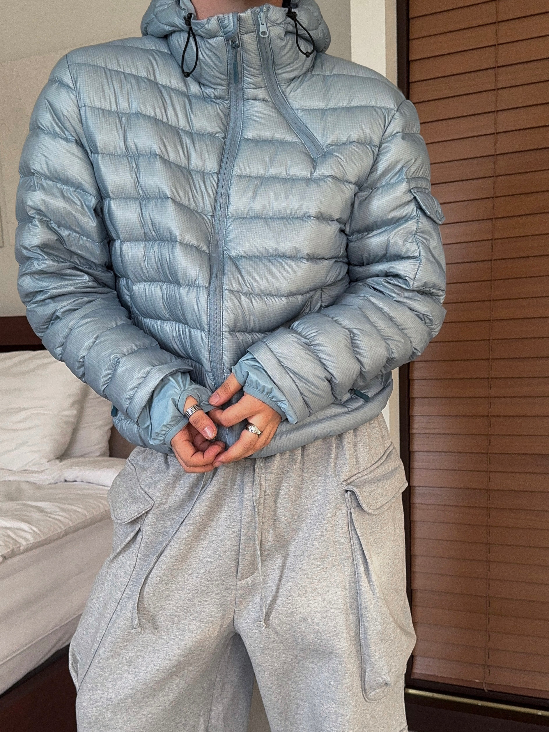 -오리털이 보이는 다운푸르프 베이비 립 원단으로 제작된 경량 패딩