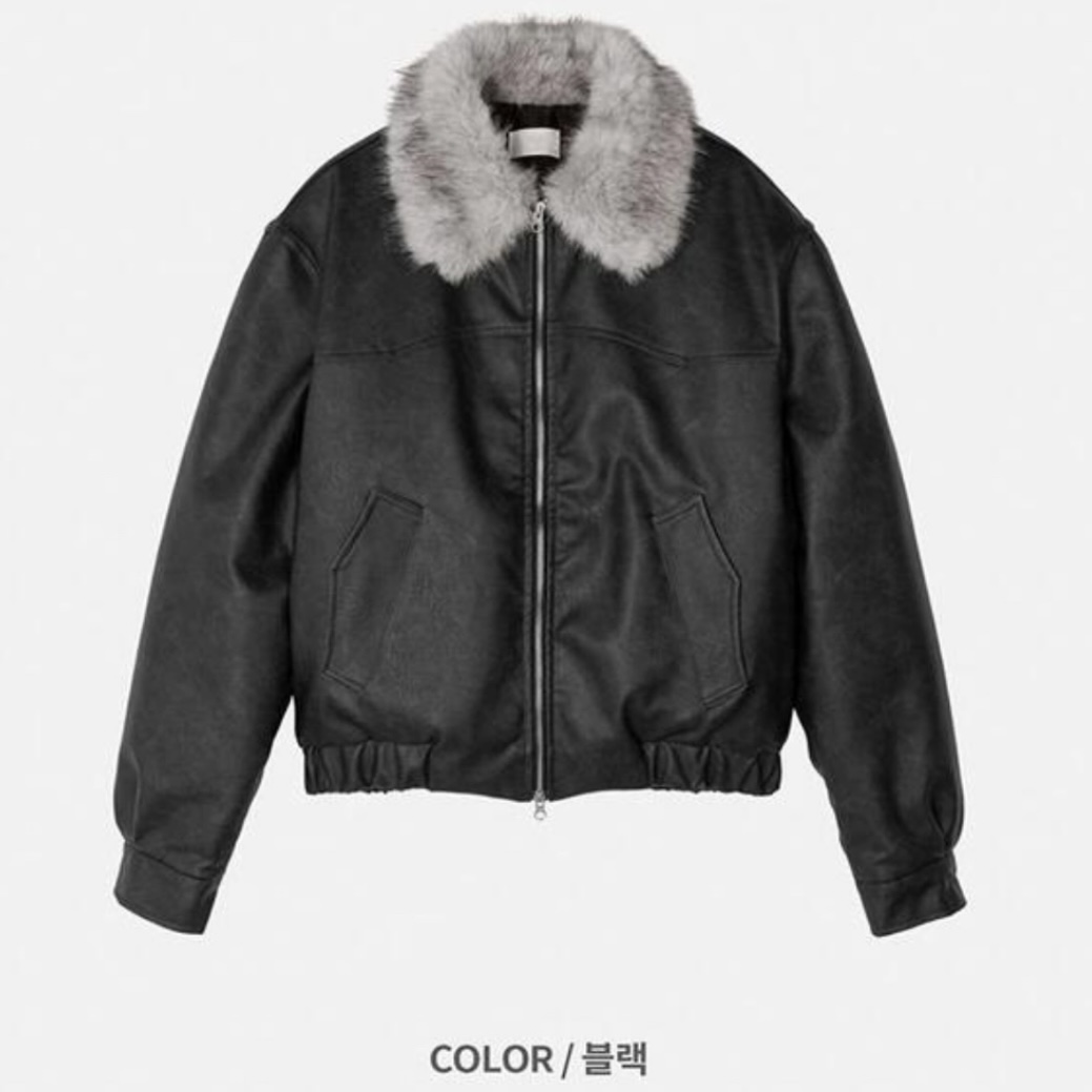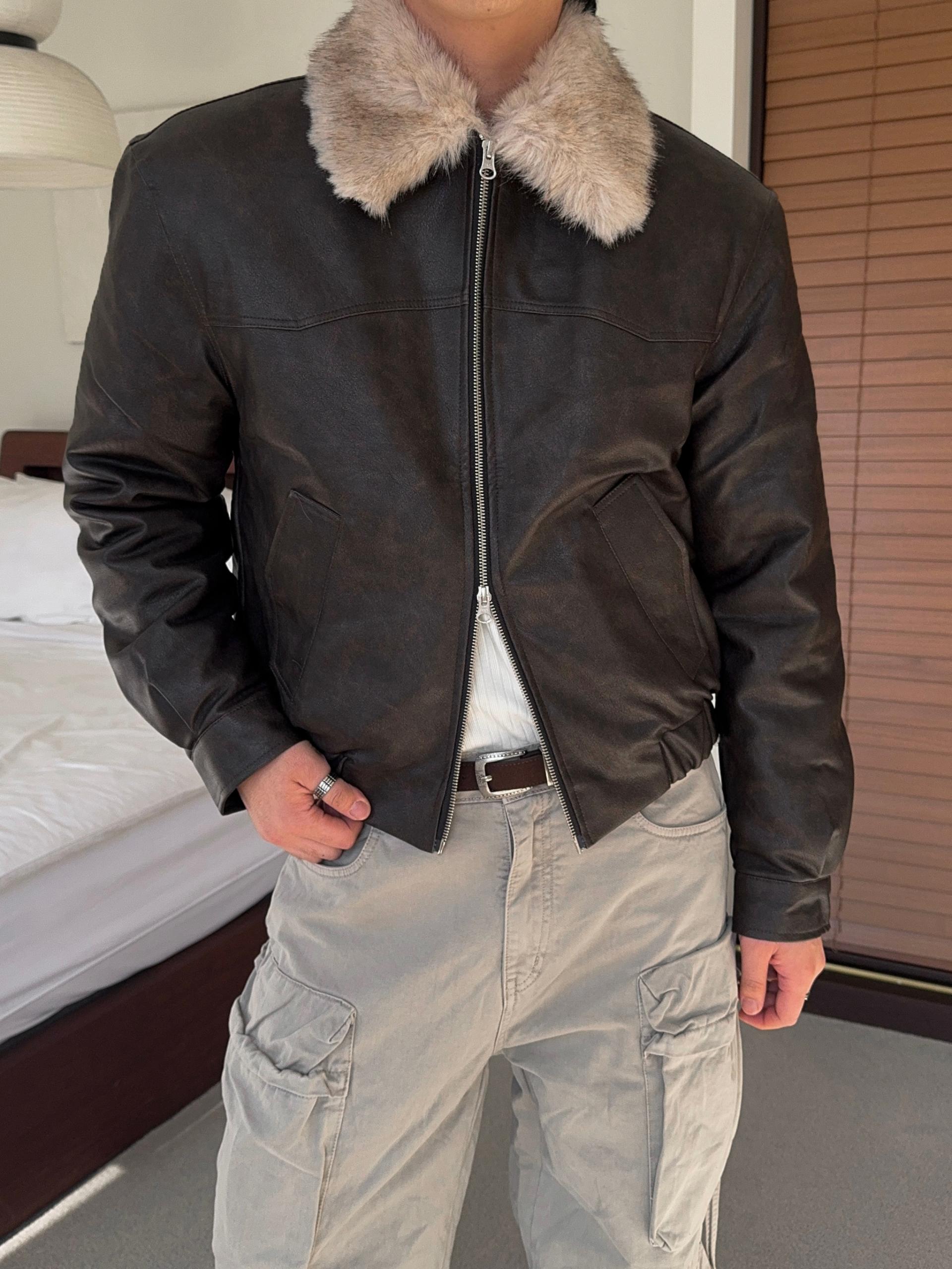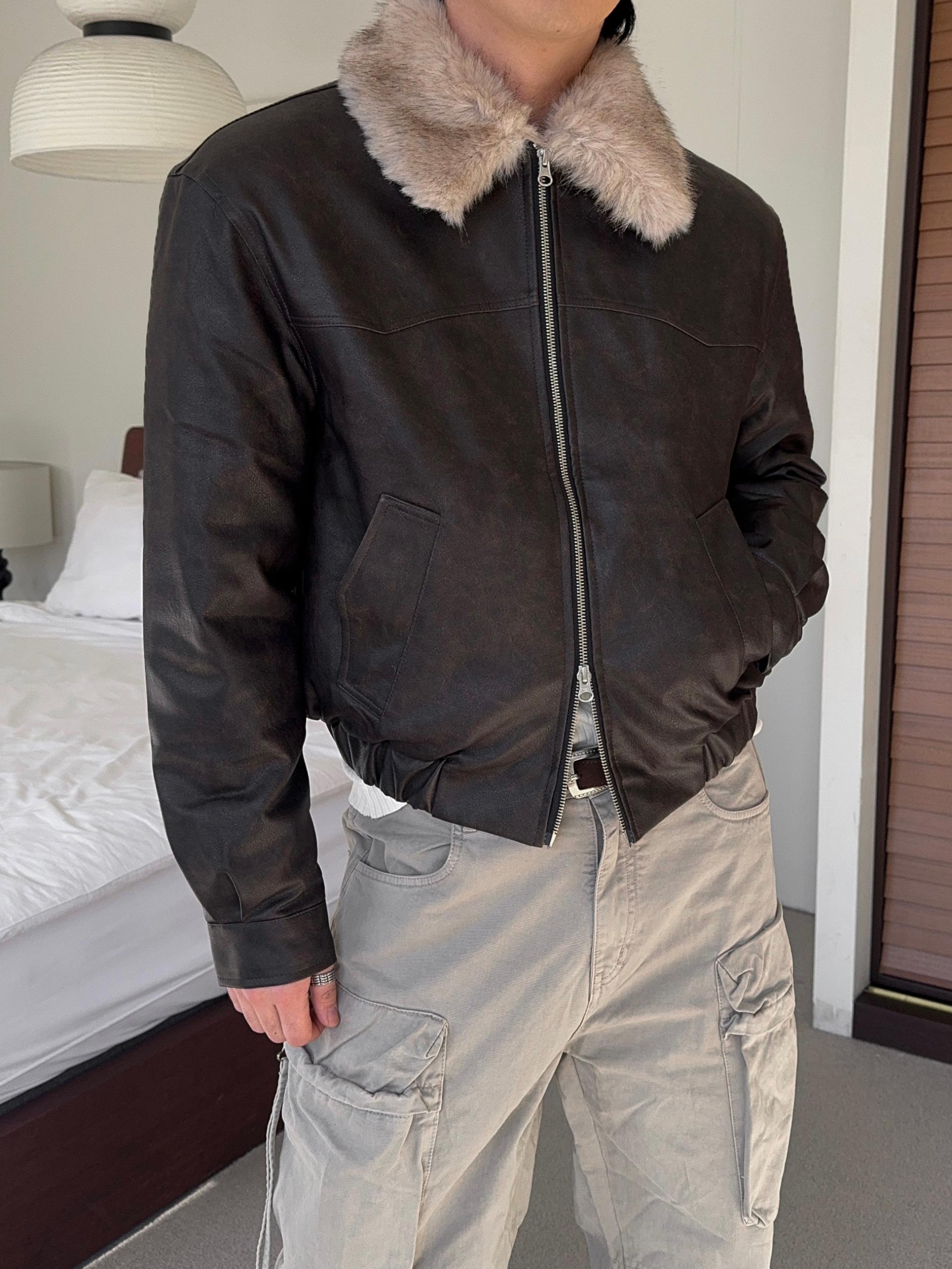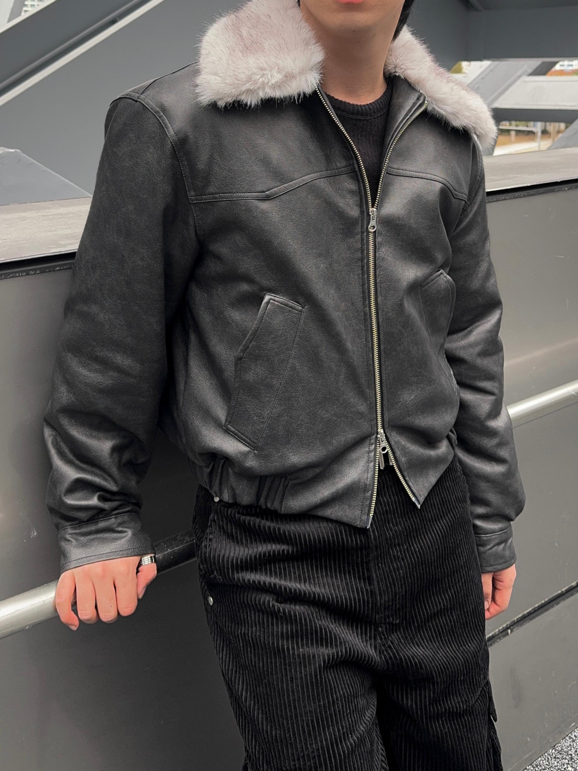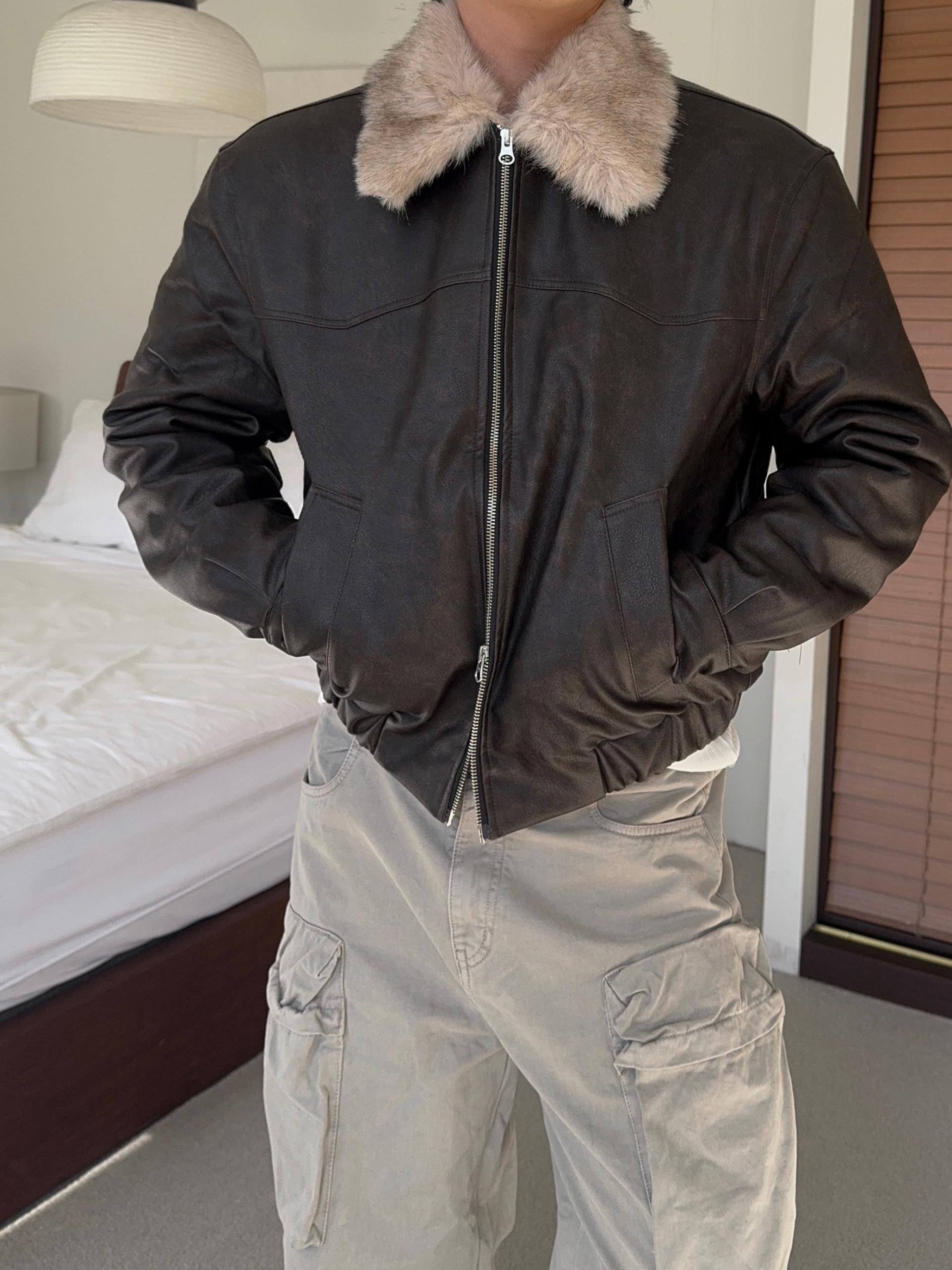 -리얼 라쿤퍼가 부착된 레더 점퍼