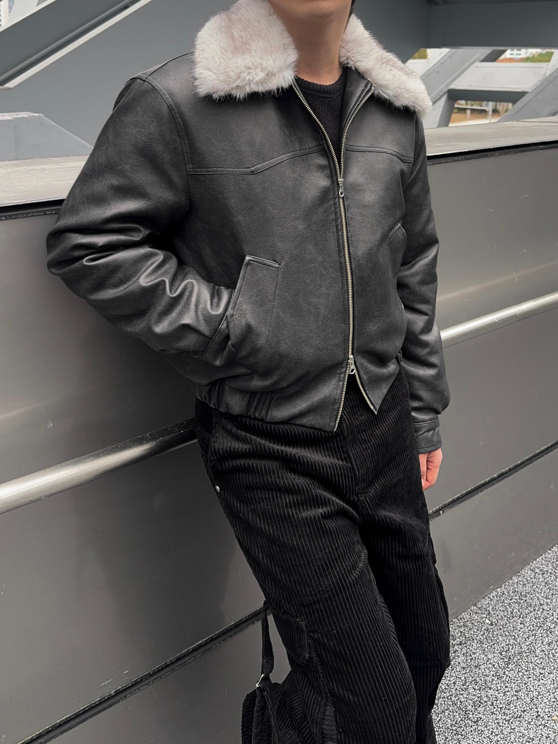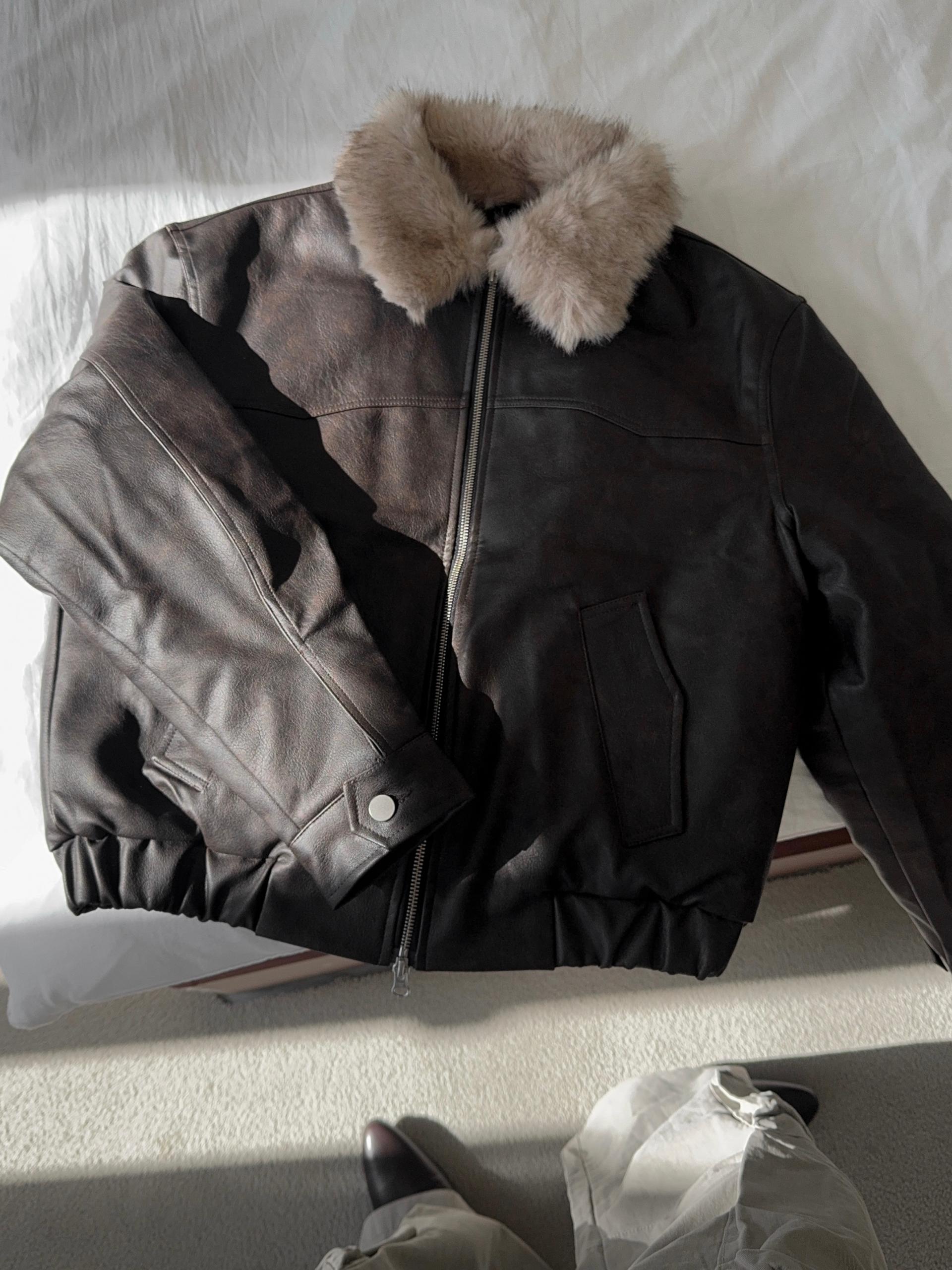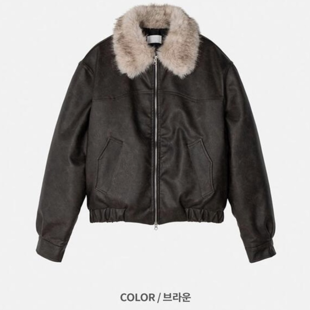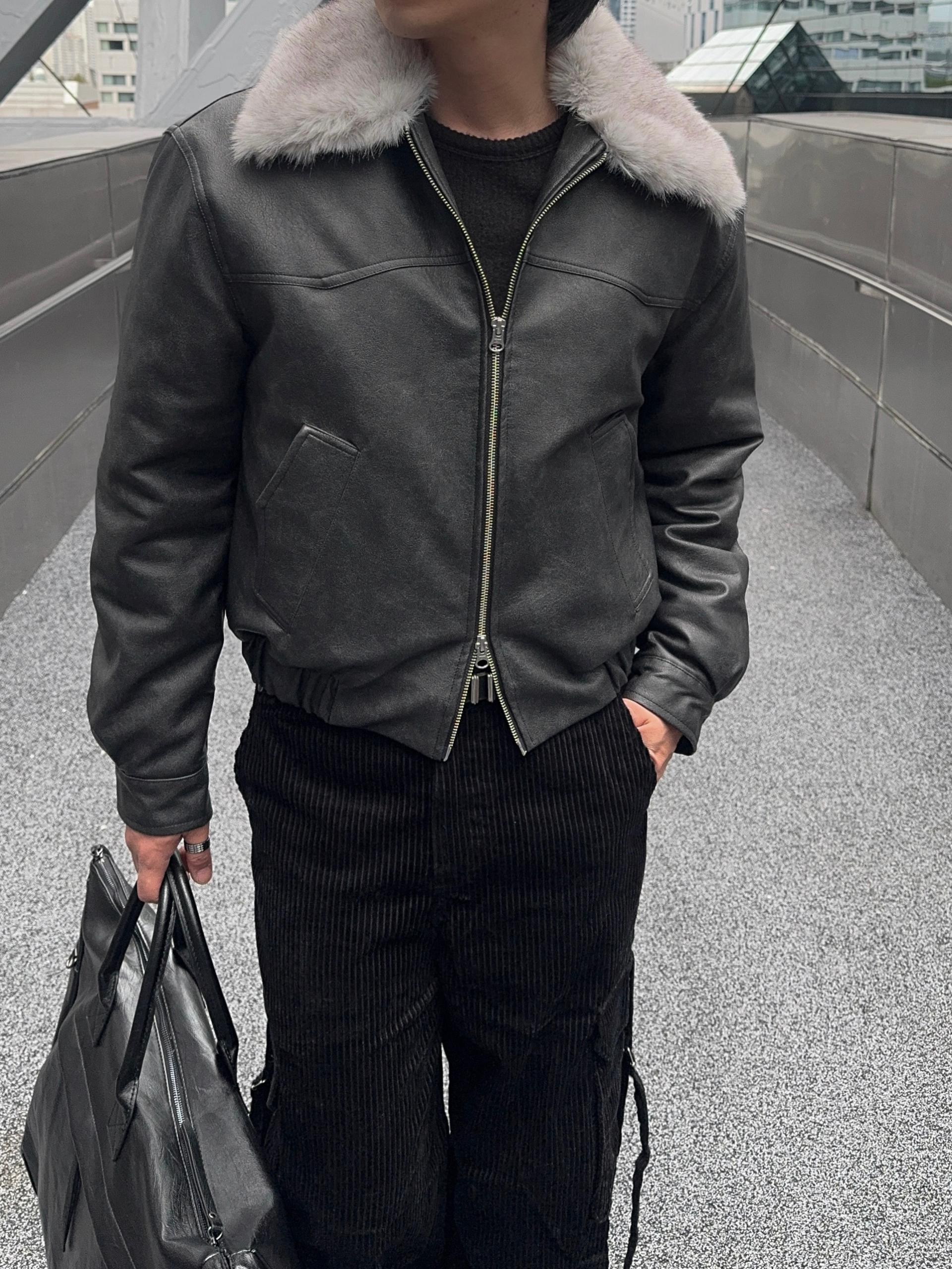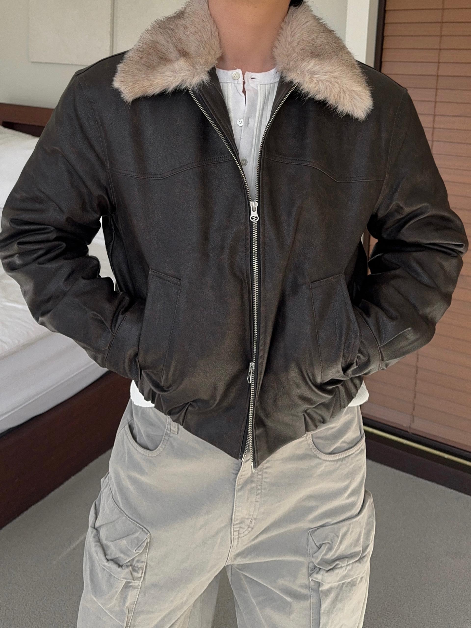 -리얼 라쿤퍼가 부착된 레더 점퍼