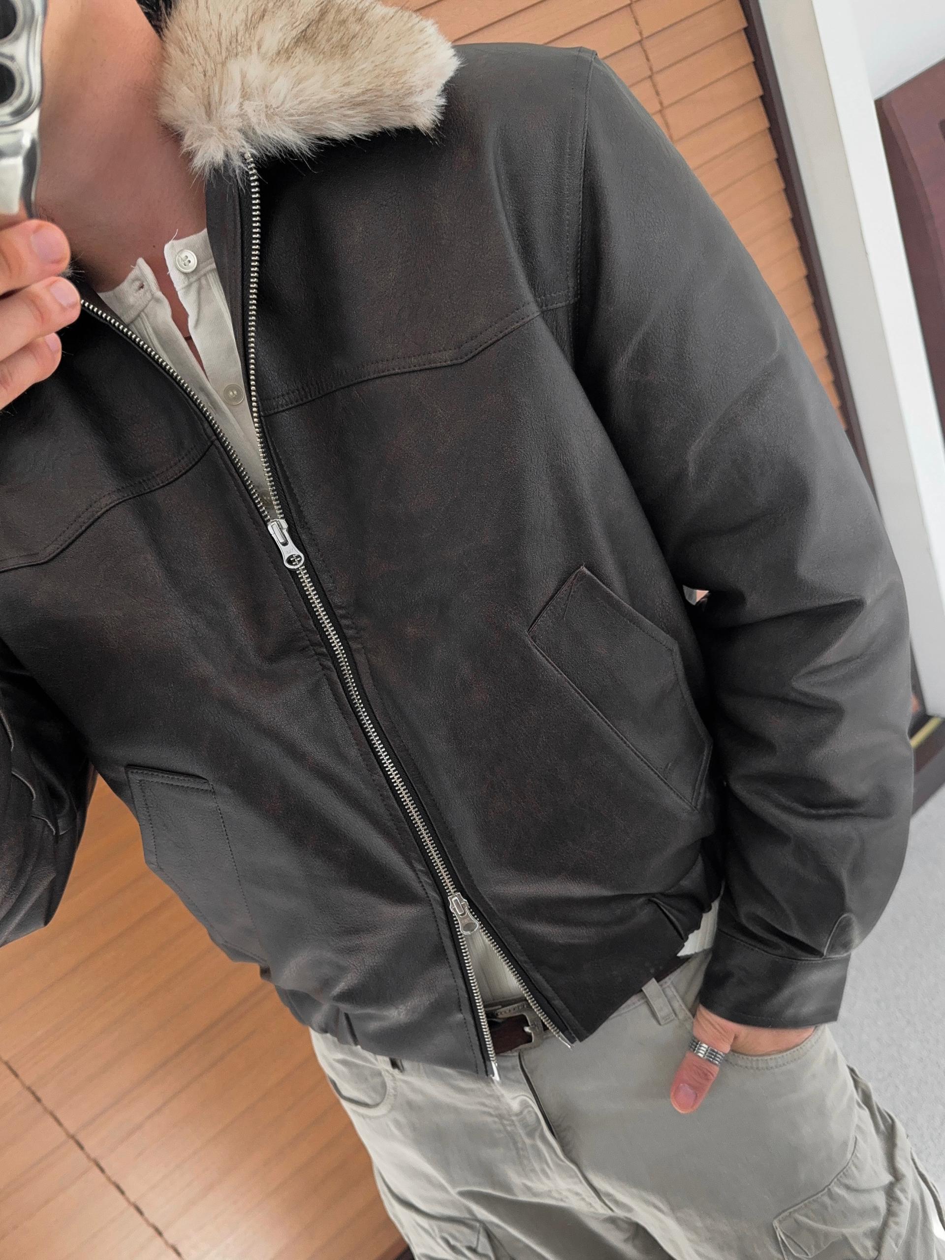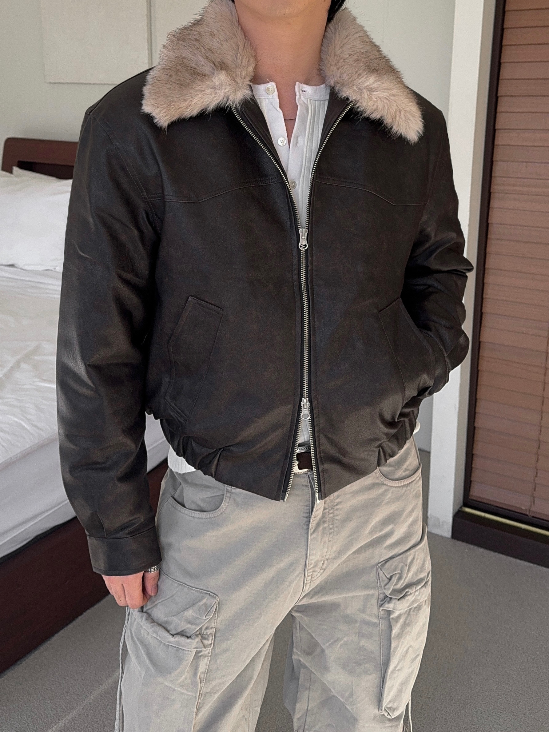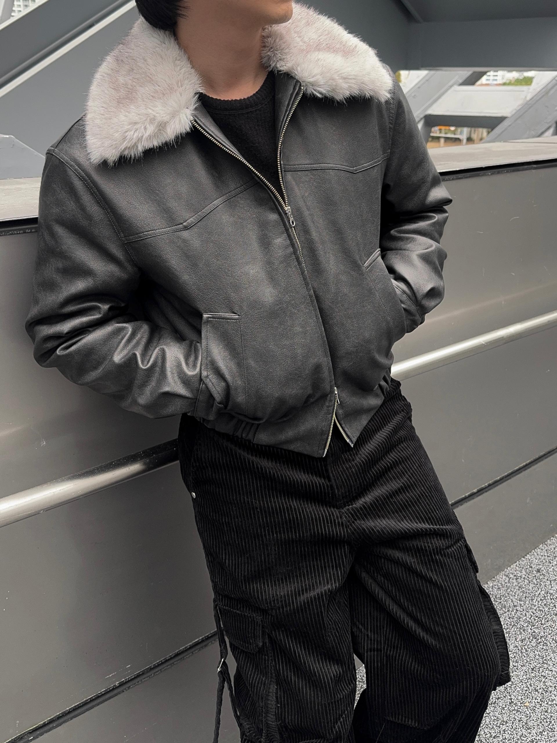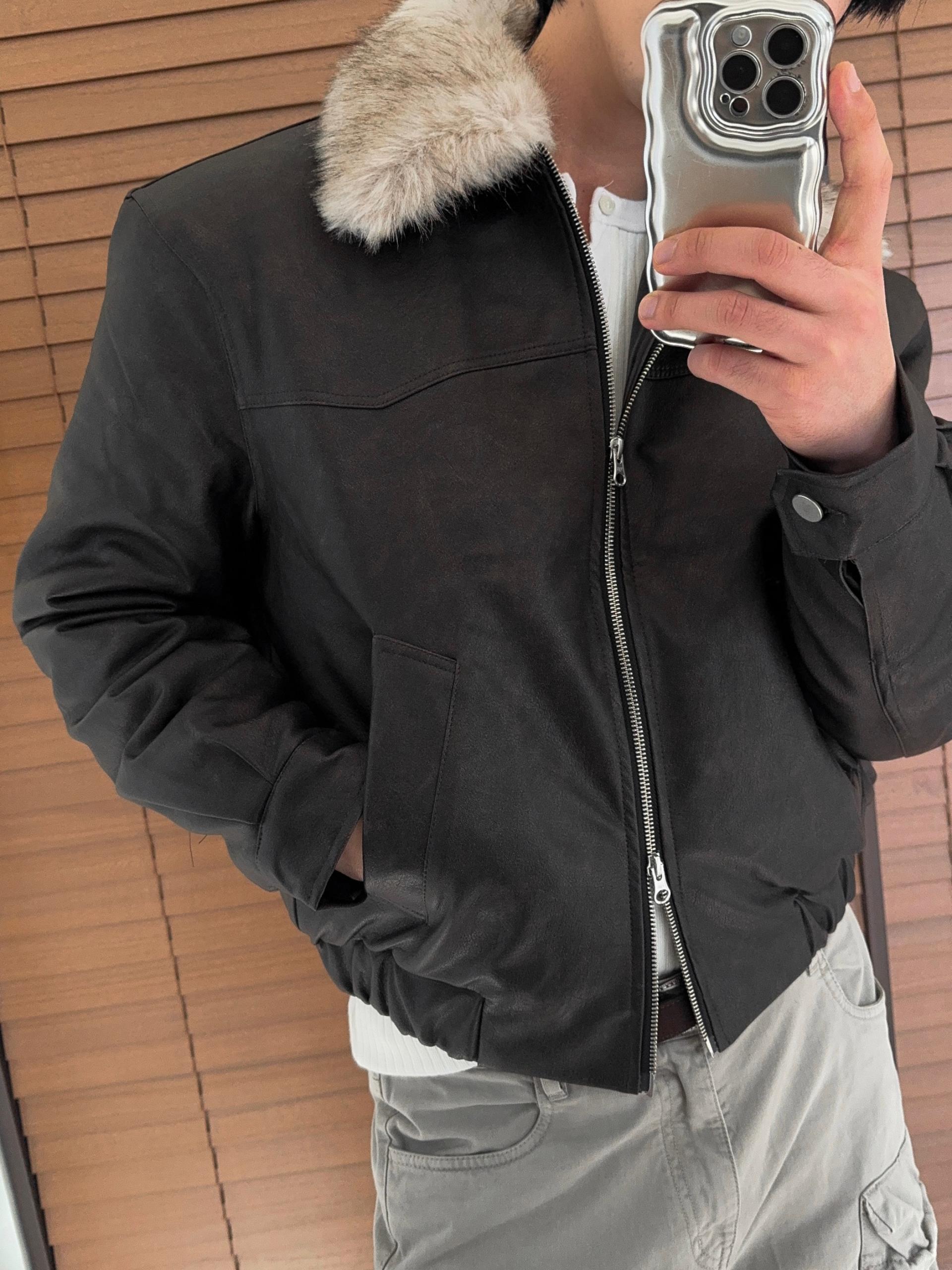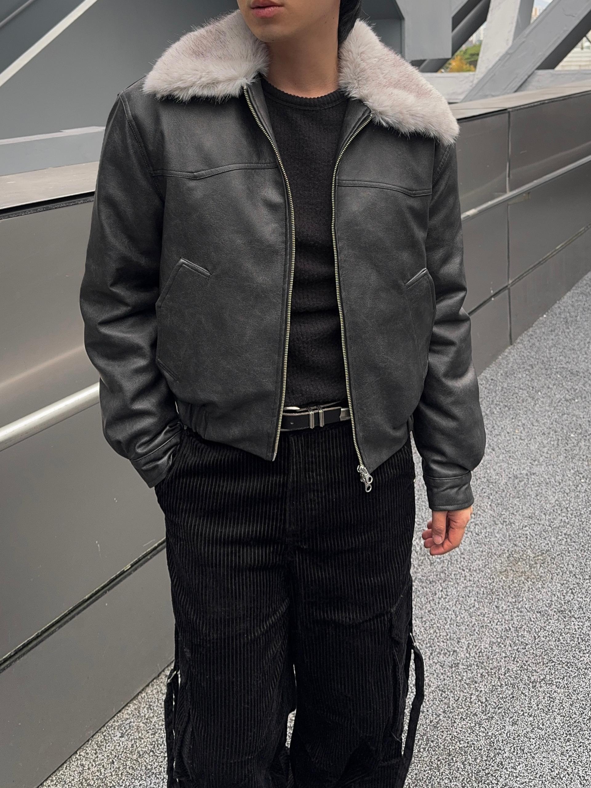 -리얼 라쿤퍼가 부착된 레더 점퍼