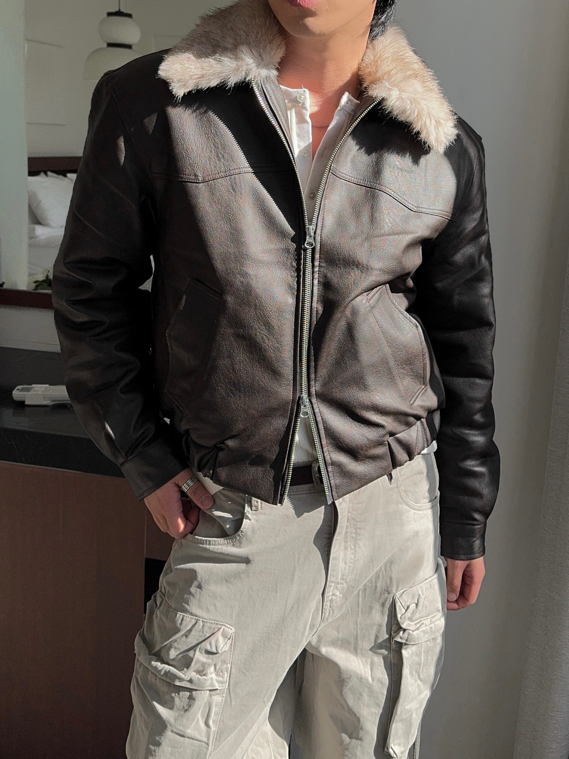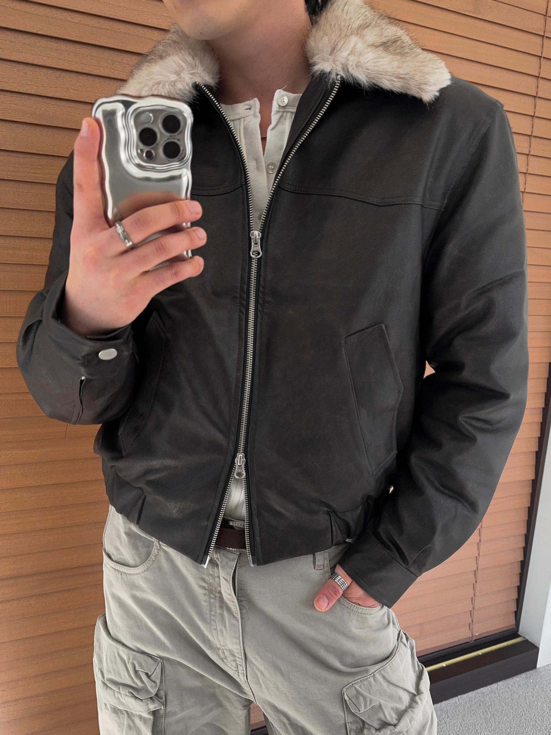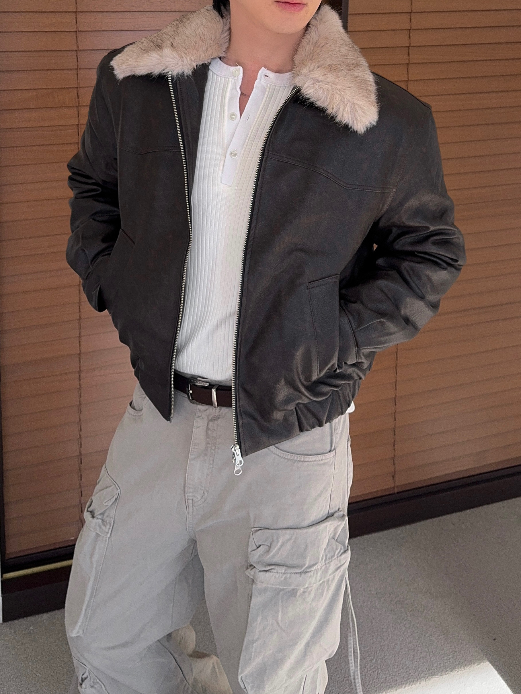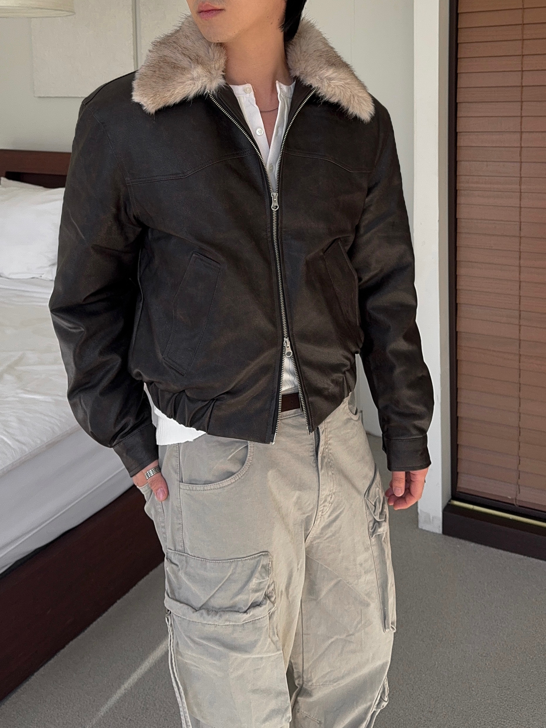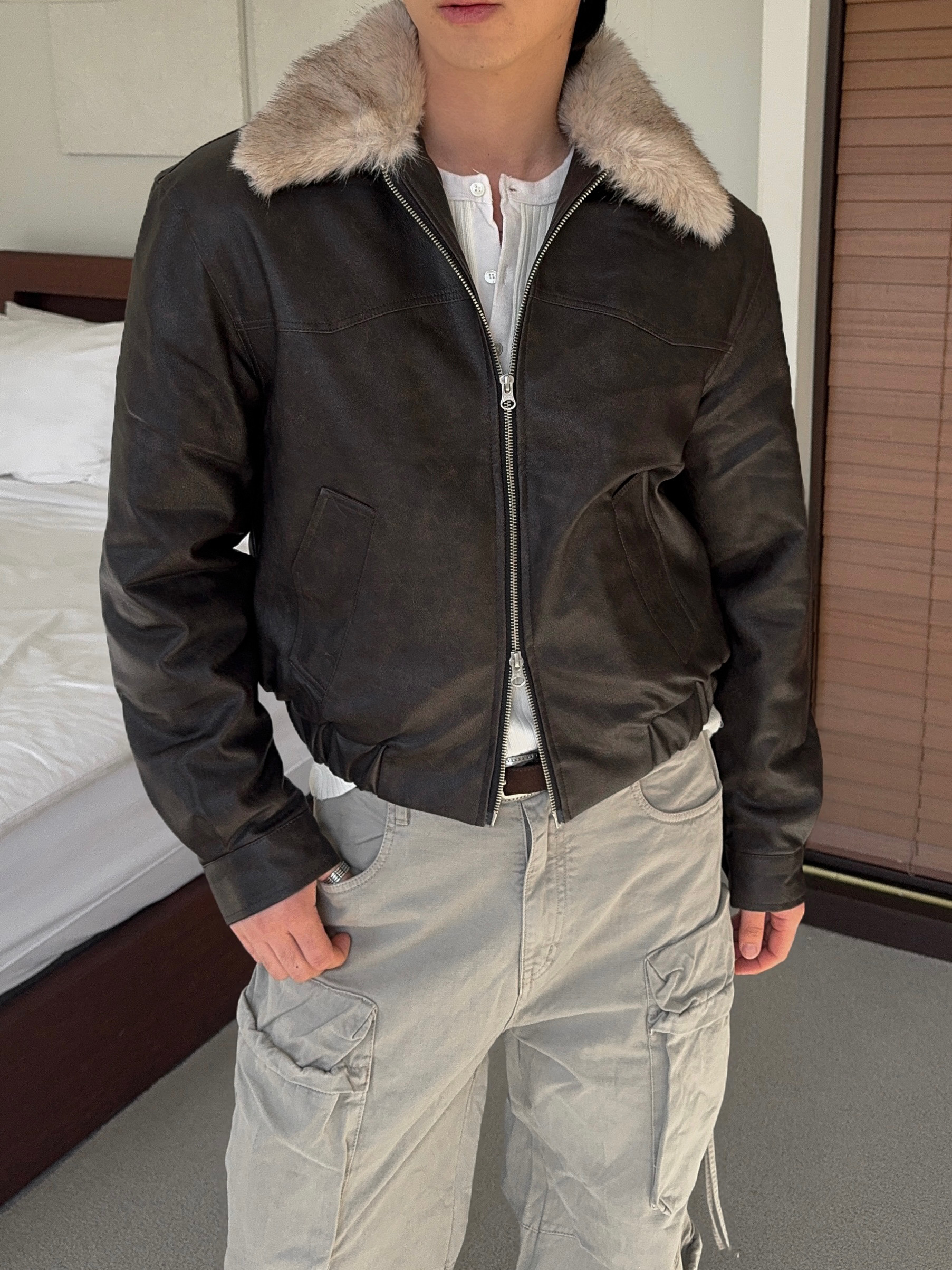 -리얼 라쿤퍼가 부착된 레더 점퍼