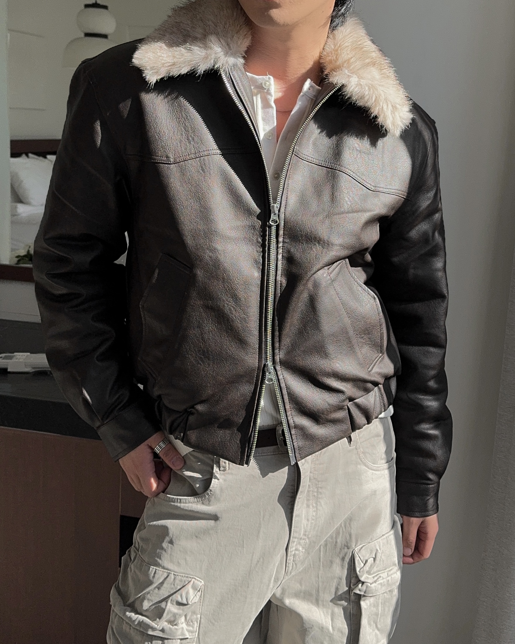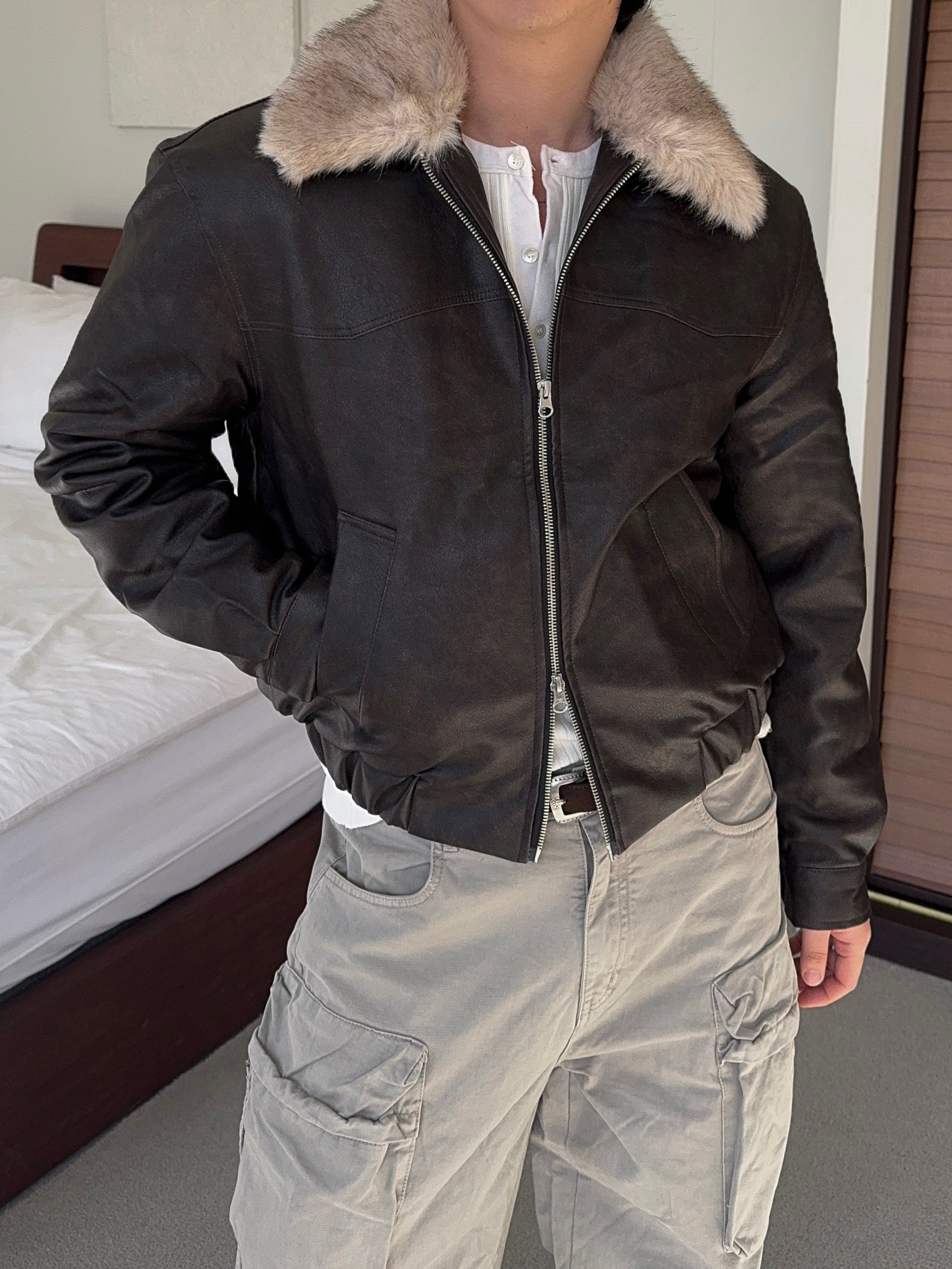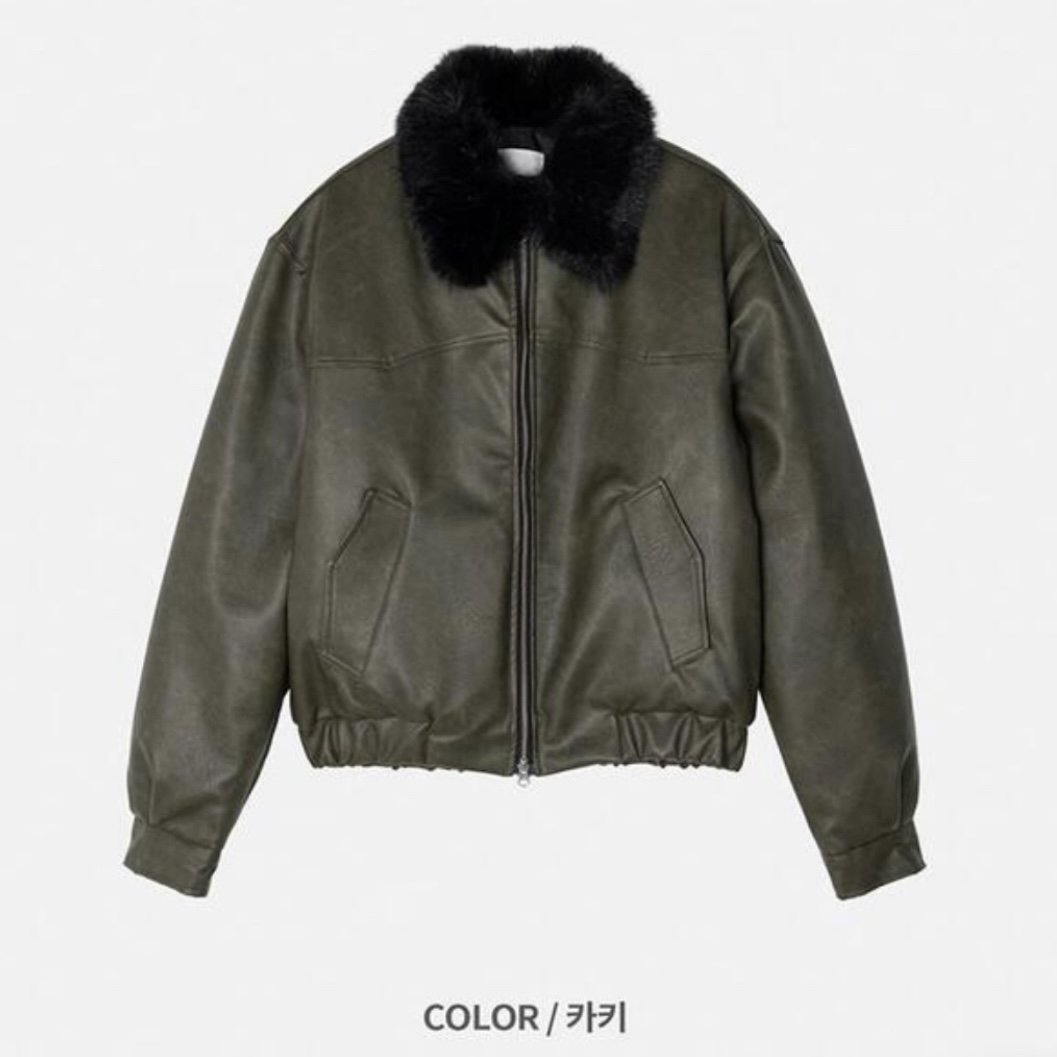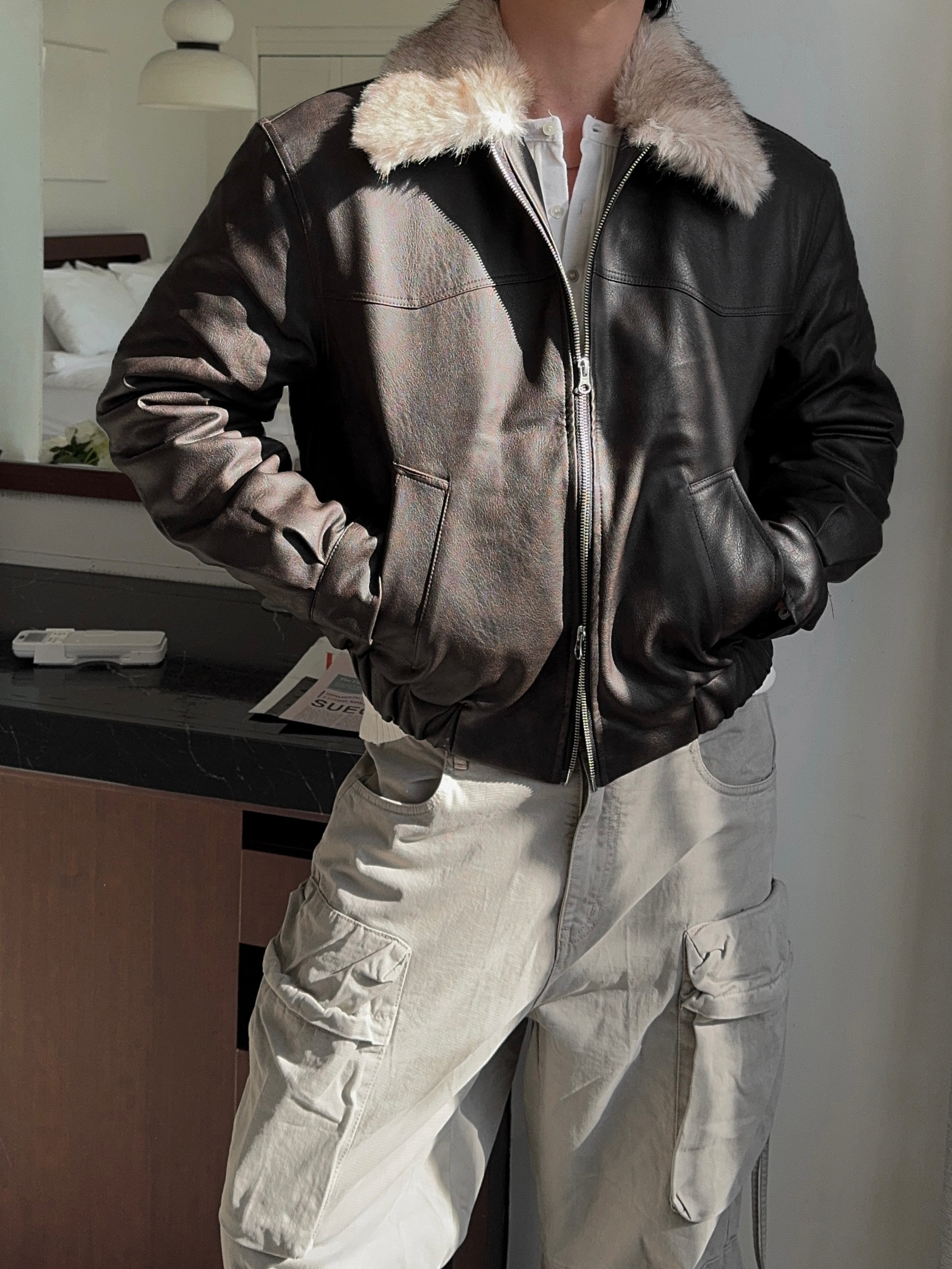 -리얼 라쿤퍼가 부착된 레더 점퍼