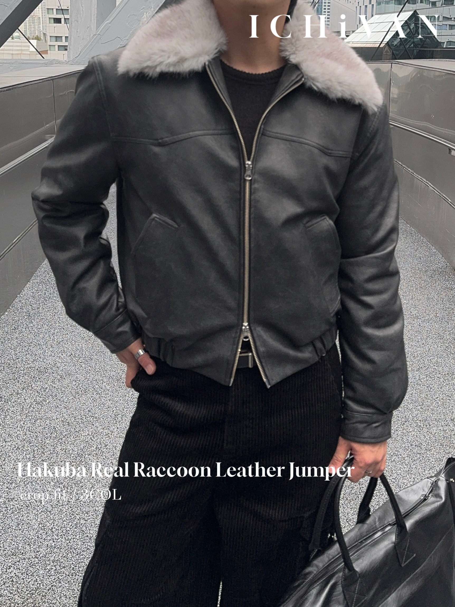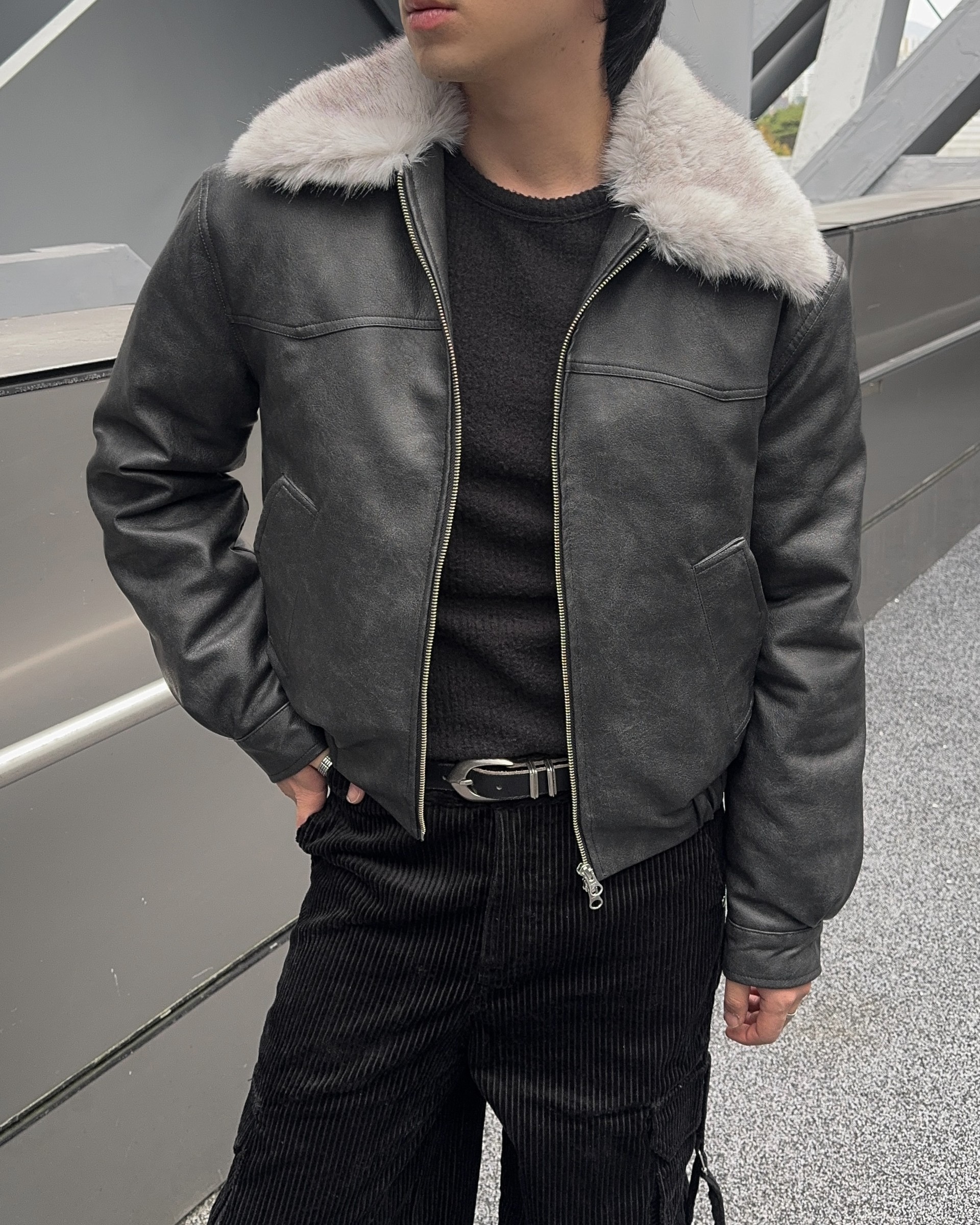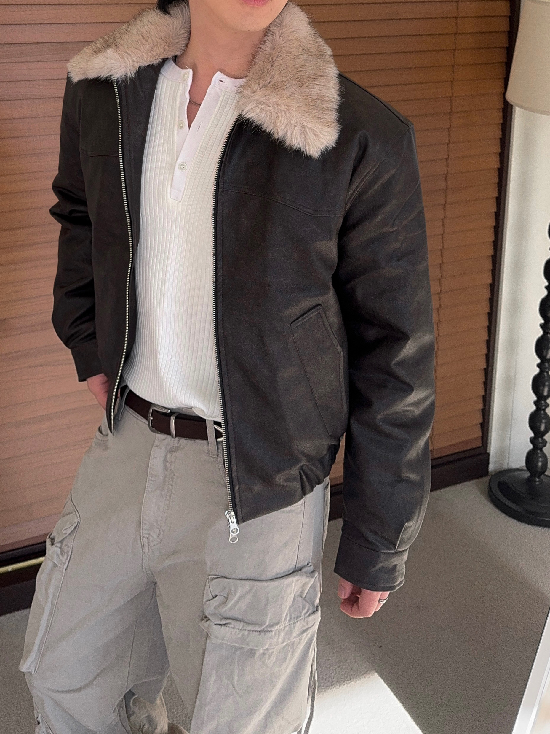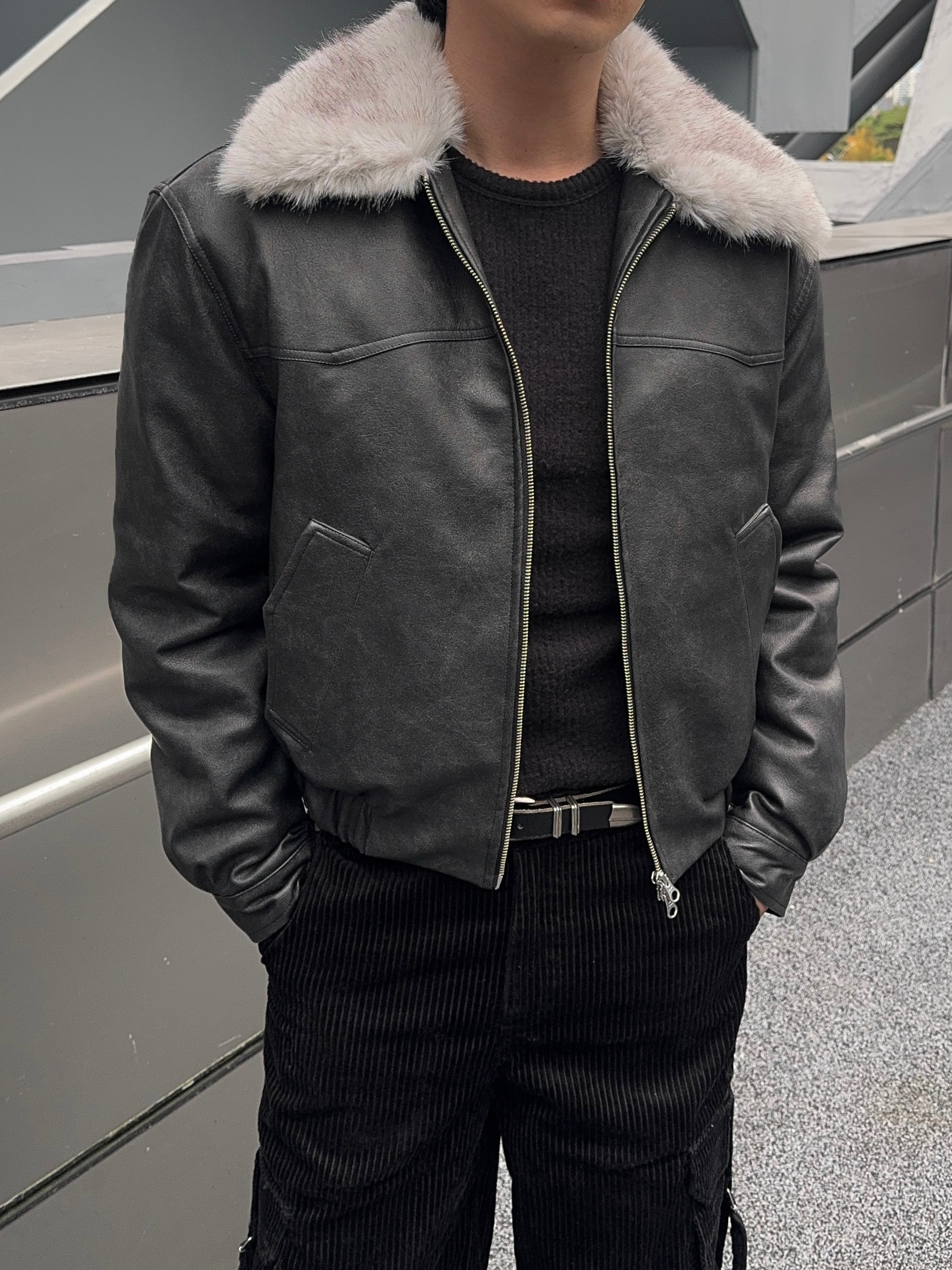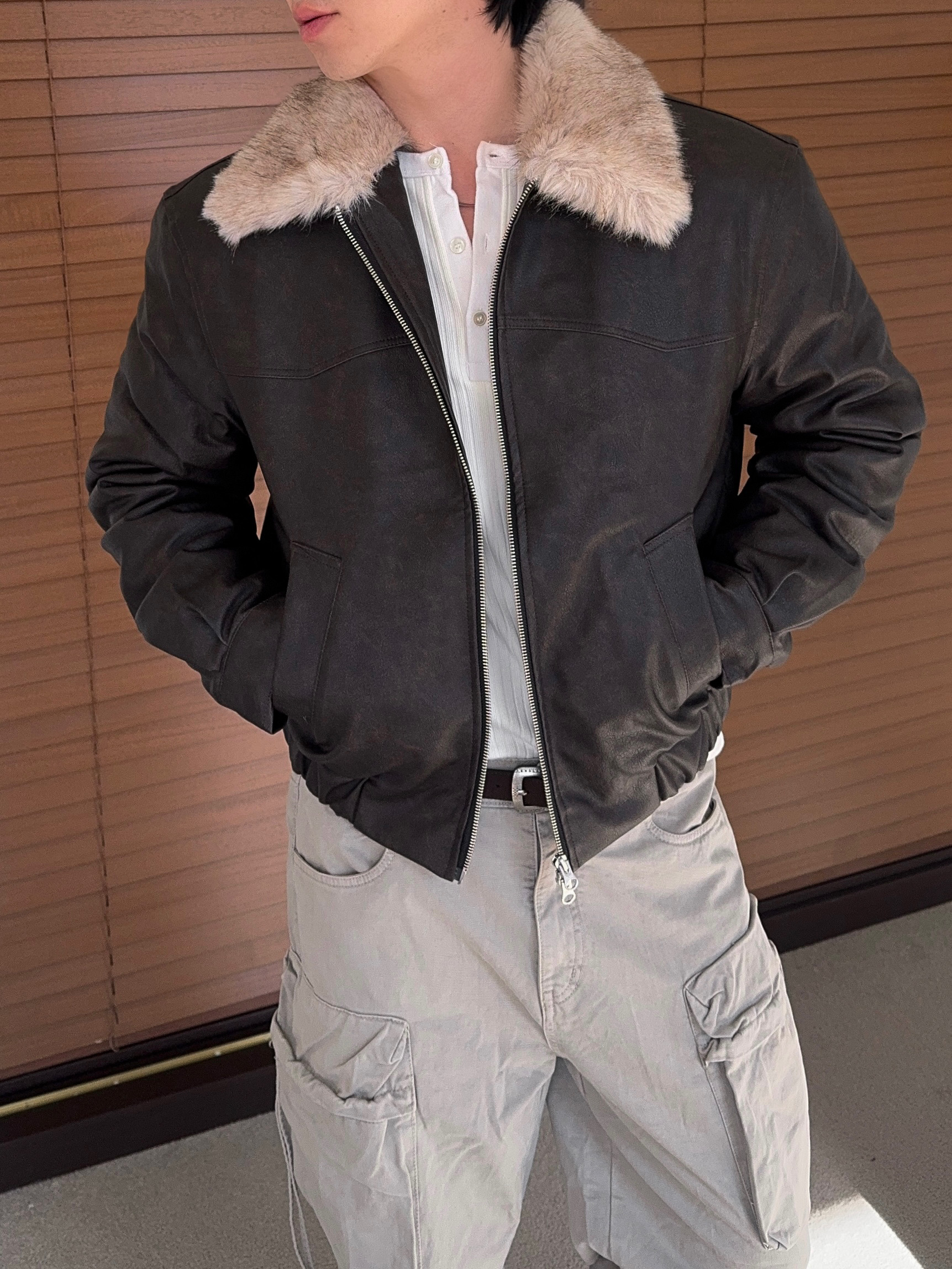 -리얼 라쿤퍼가 부착된 레더 점퍼