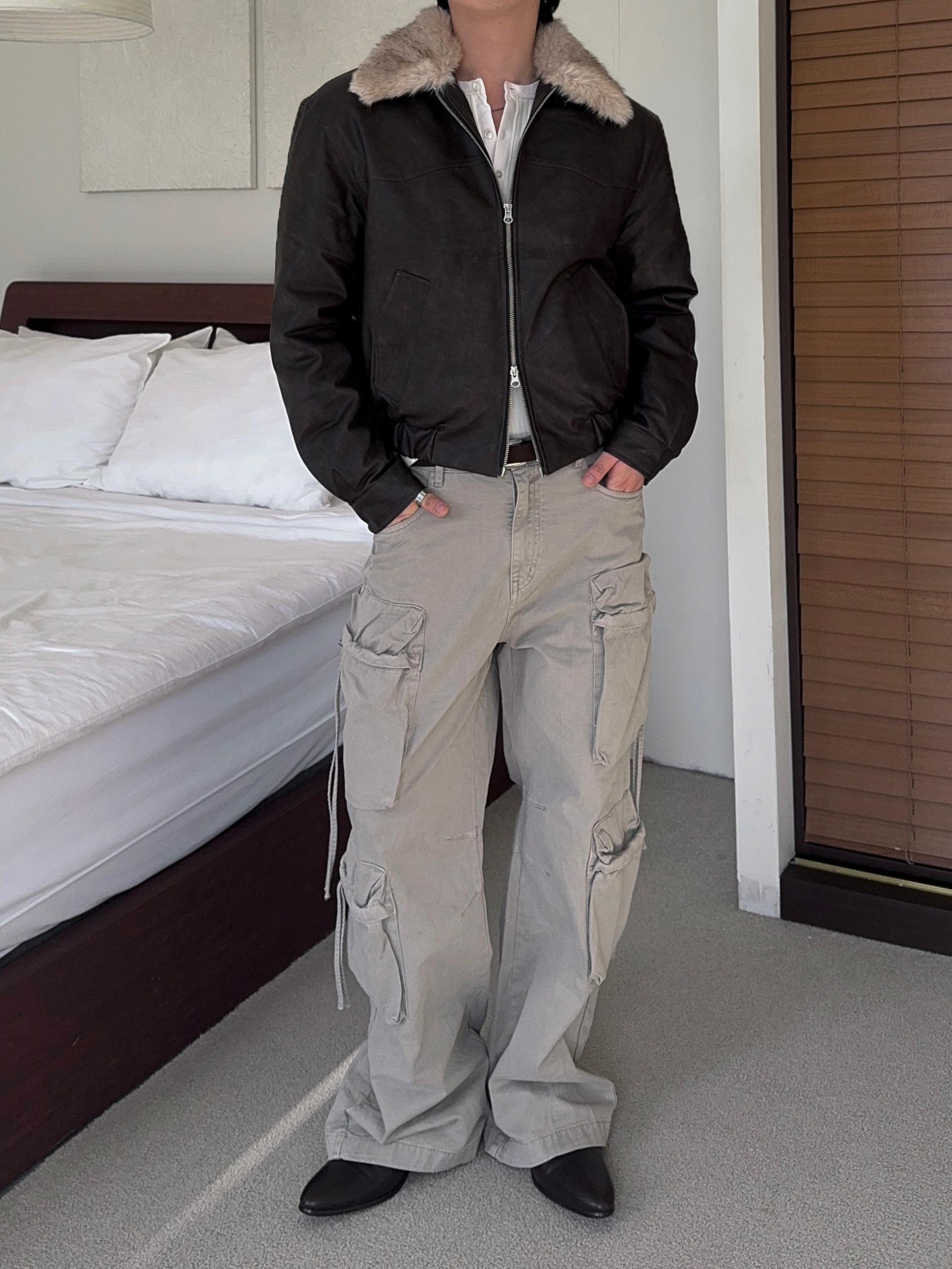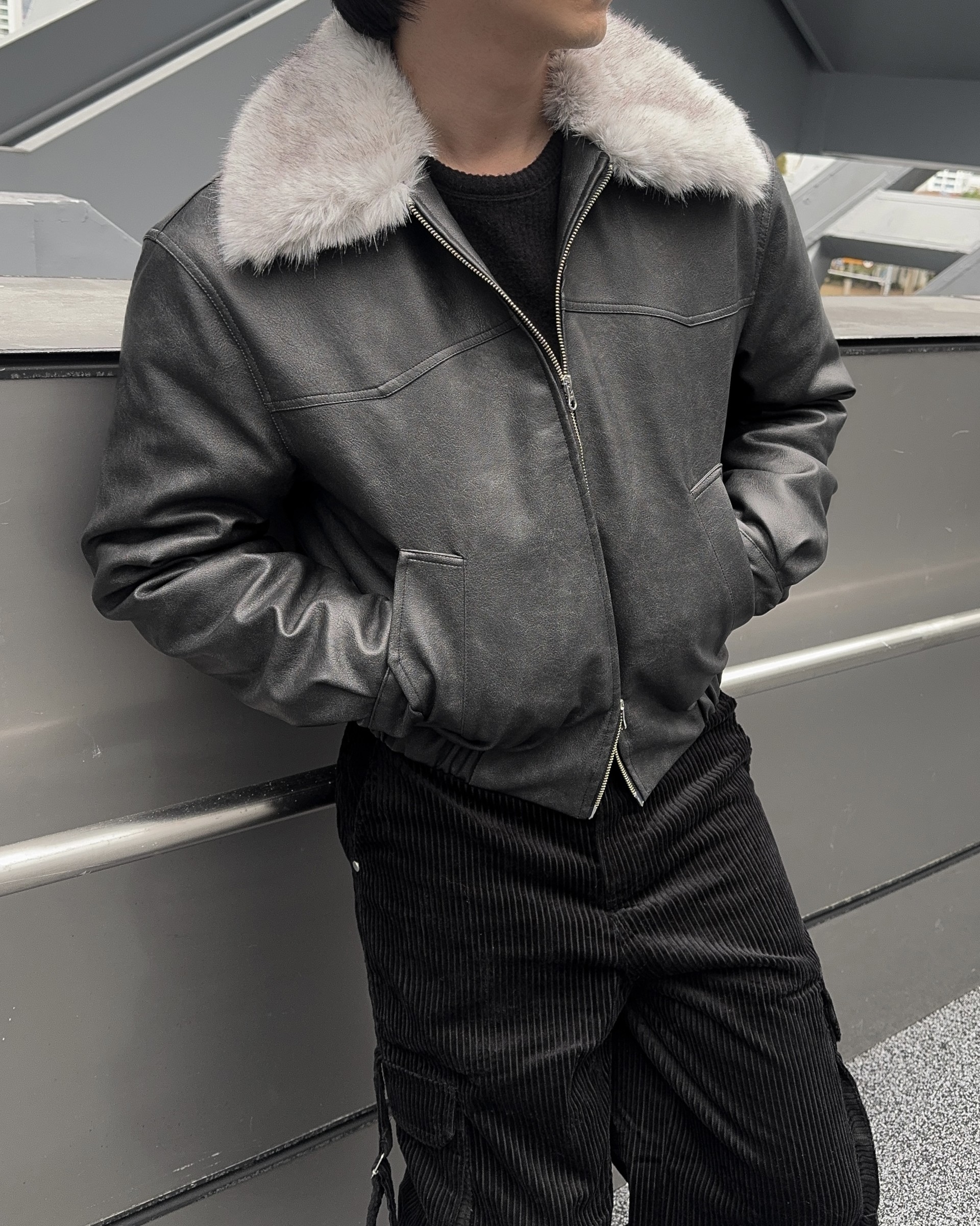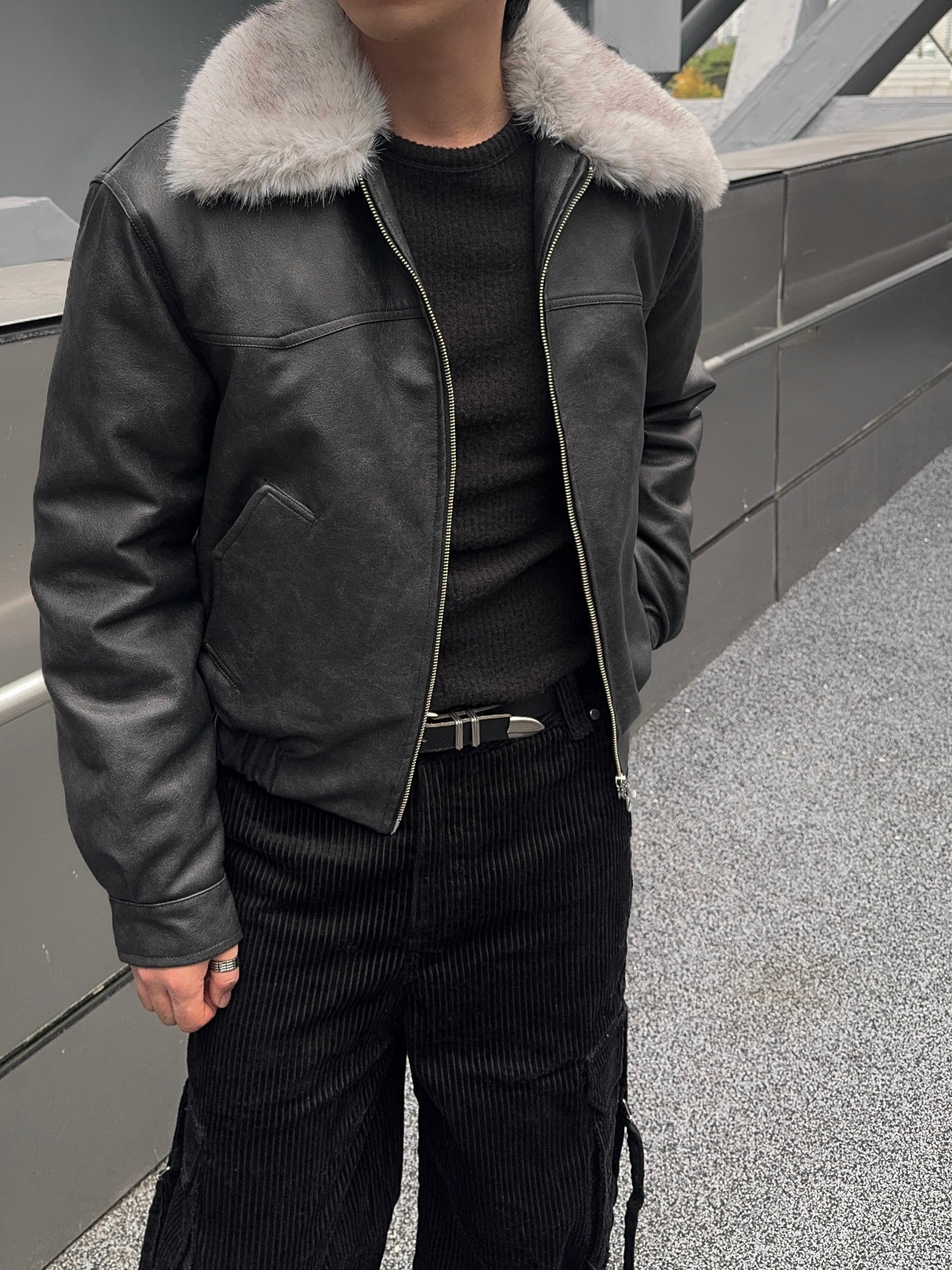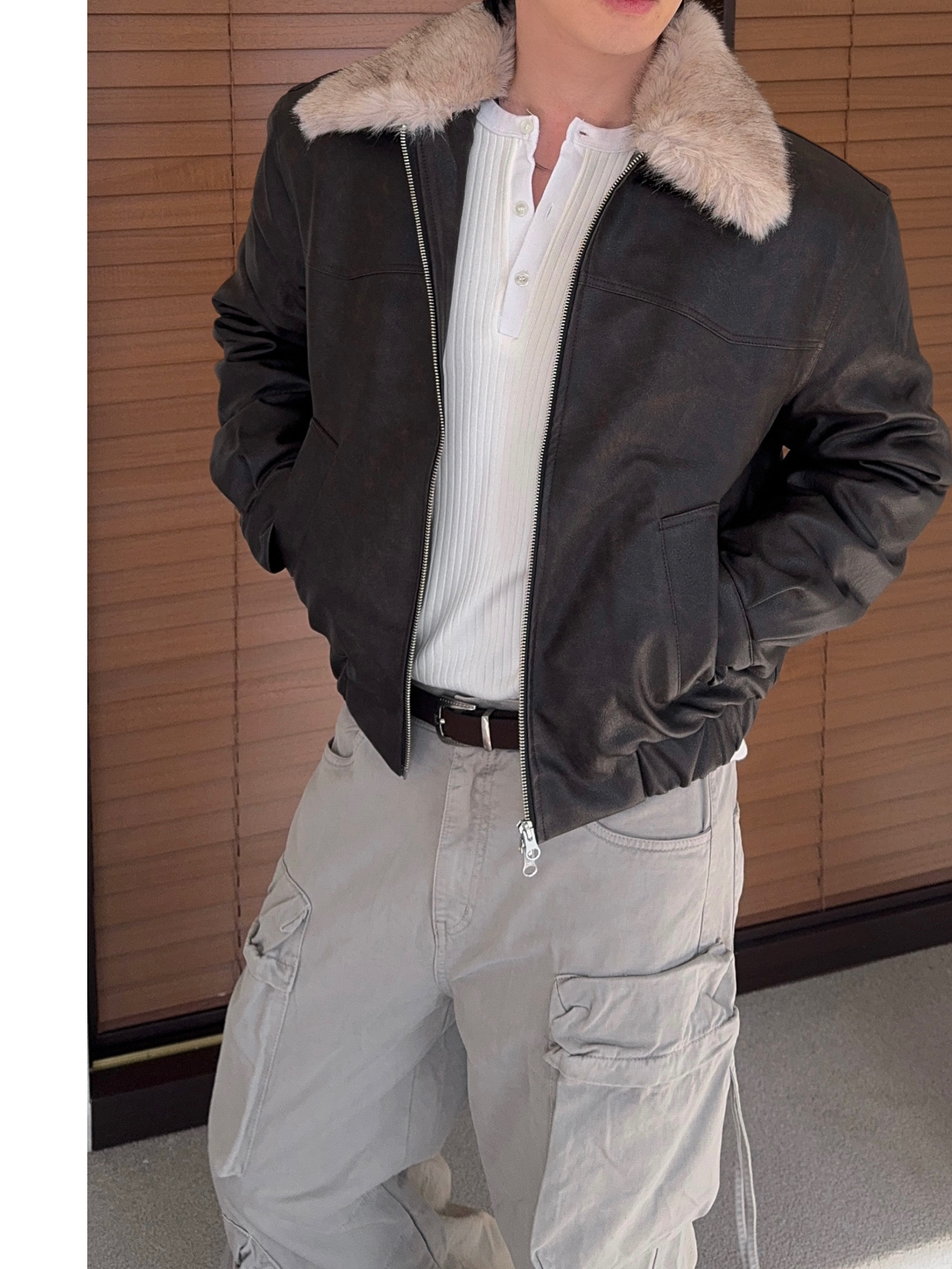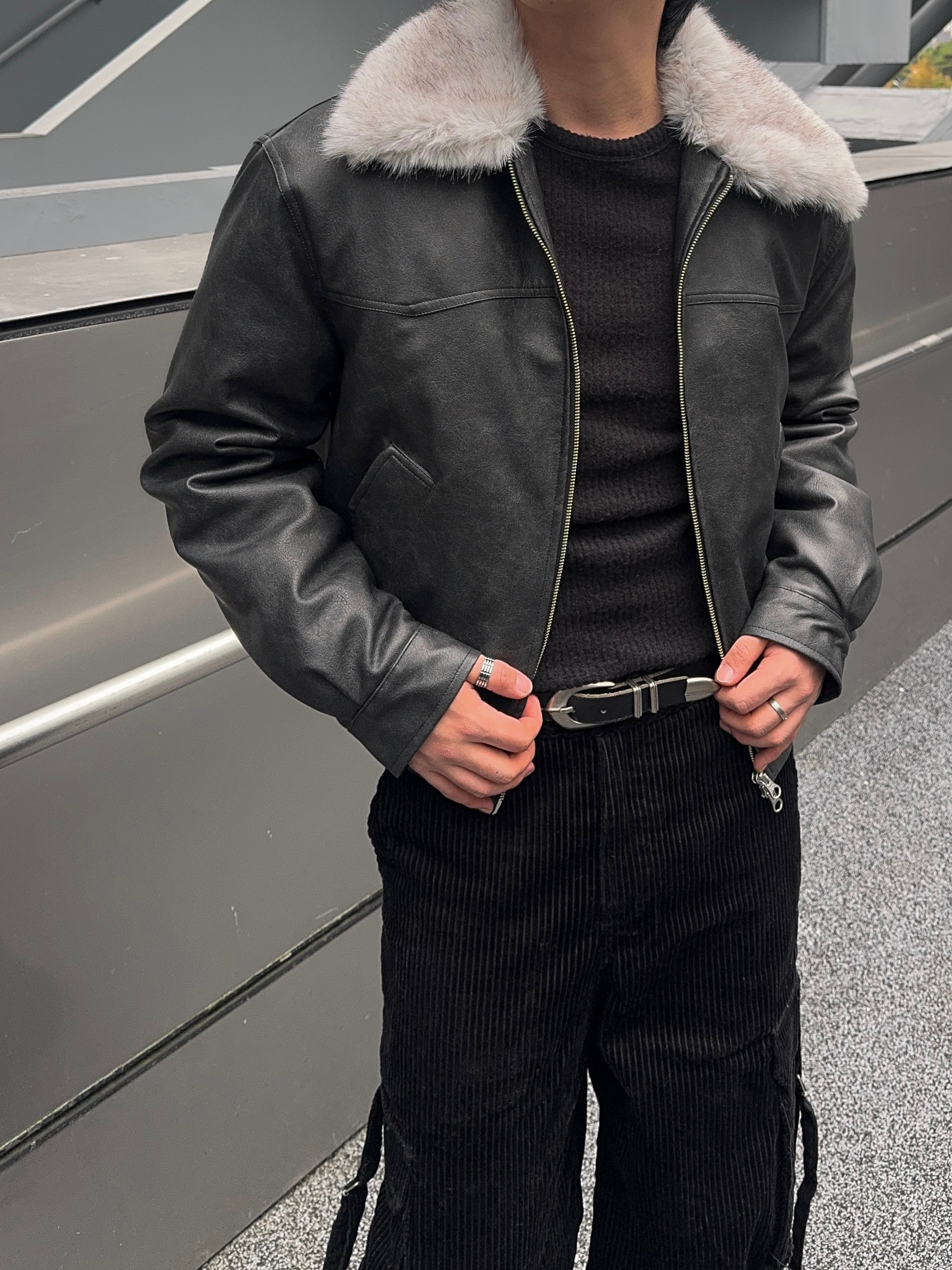 -리얼 라쿤퍼가 부착된 레더 점퍼