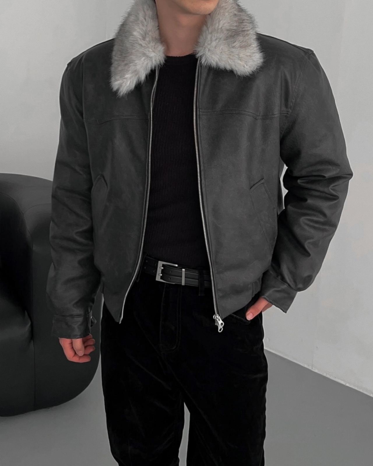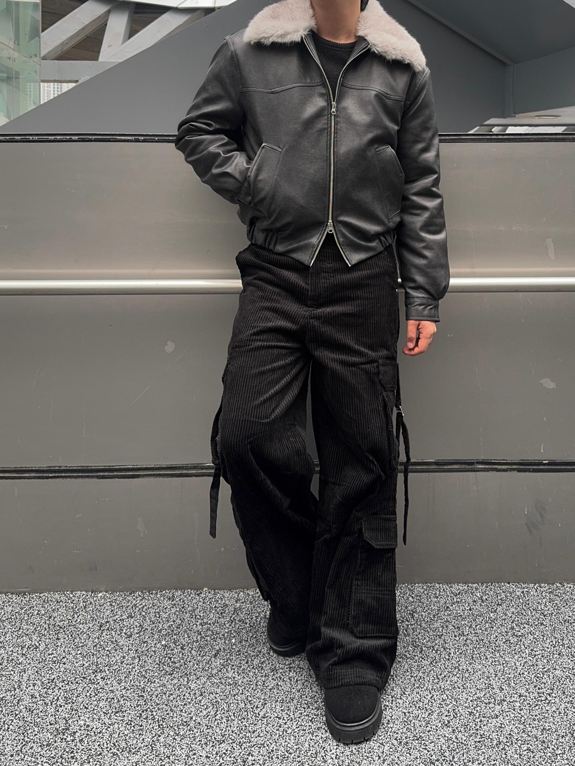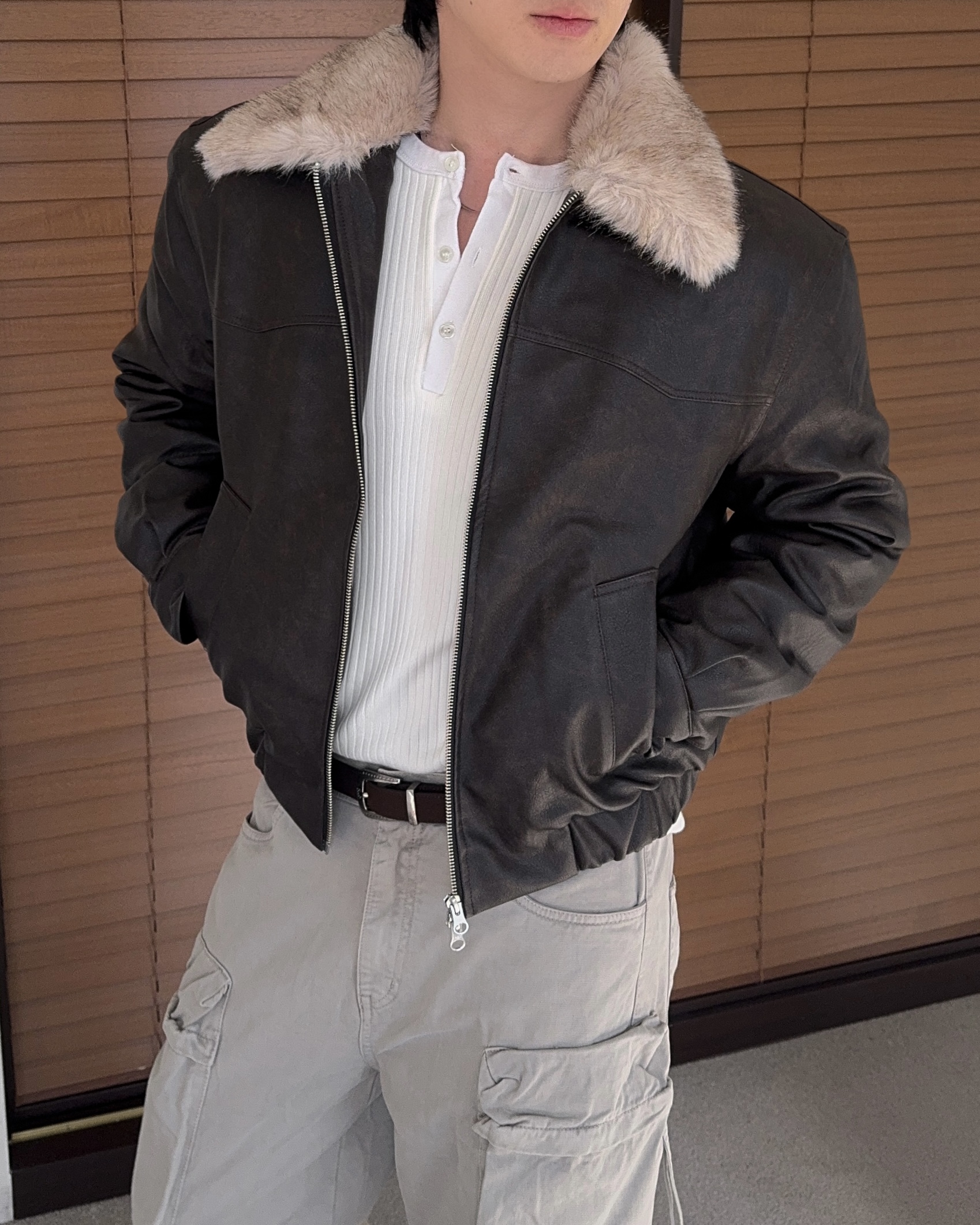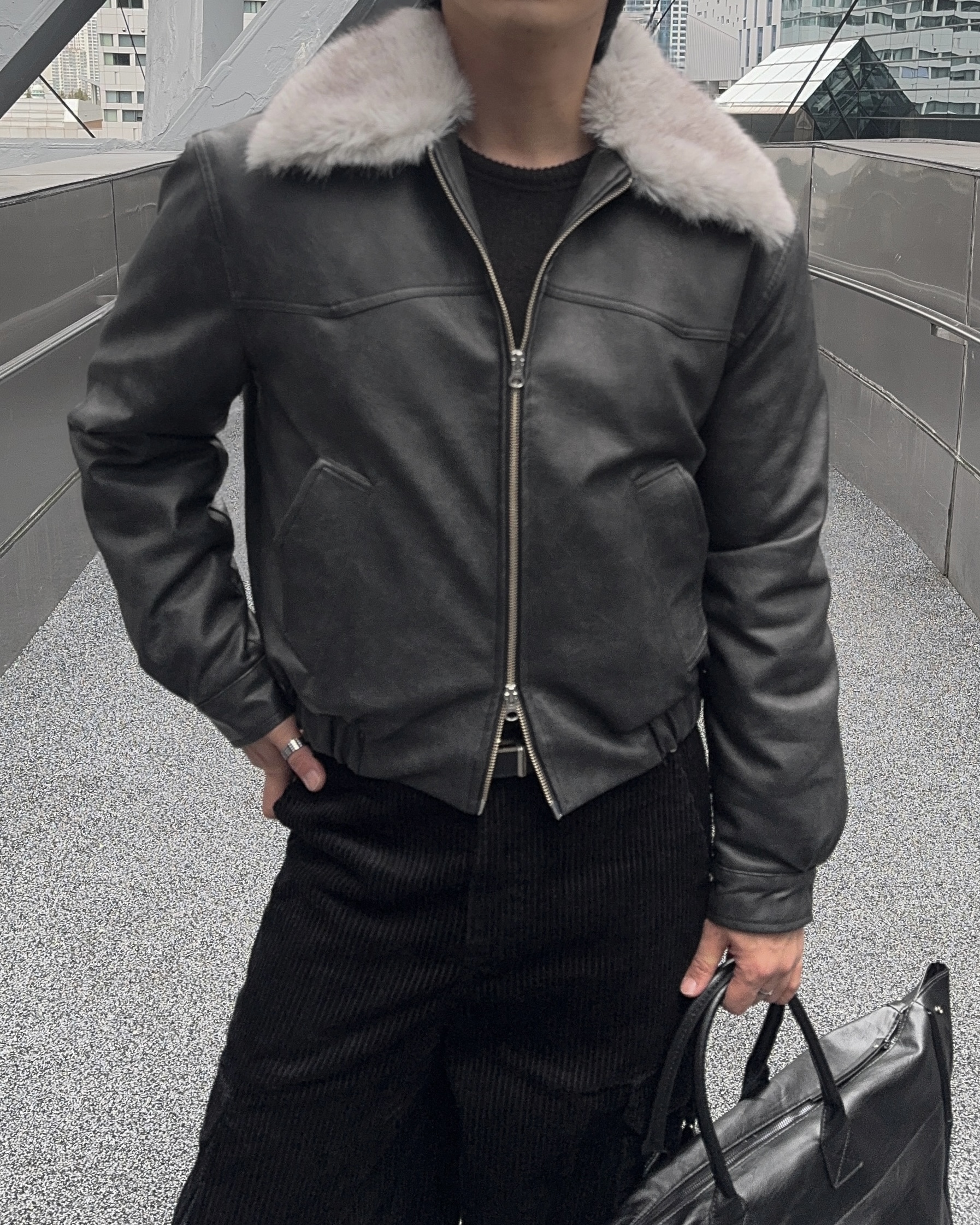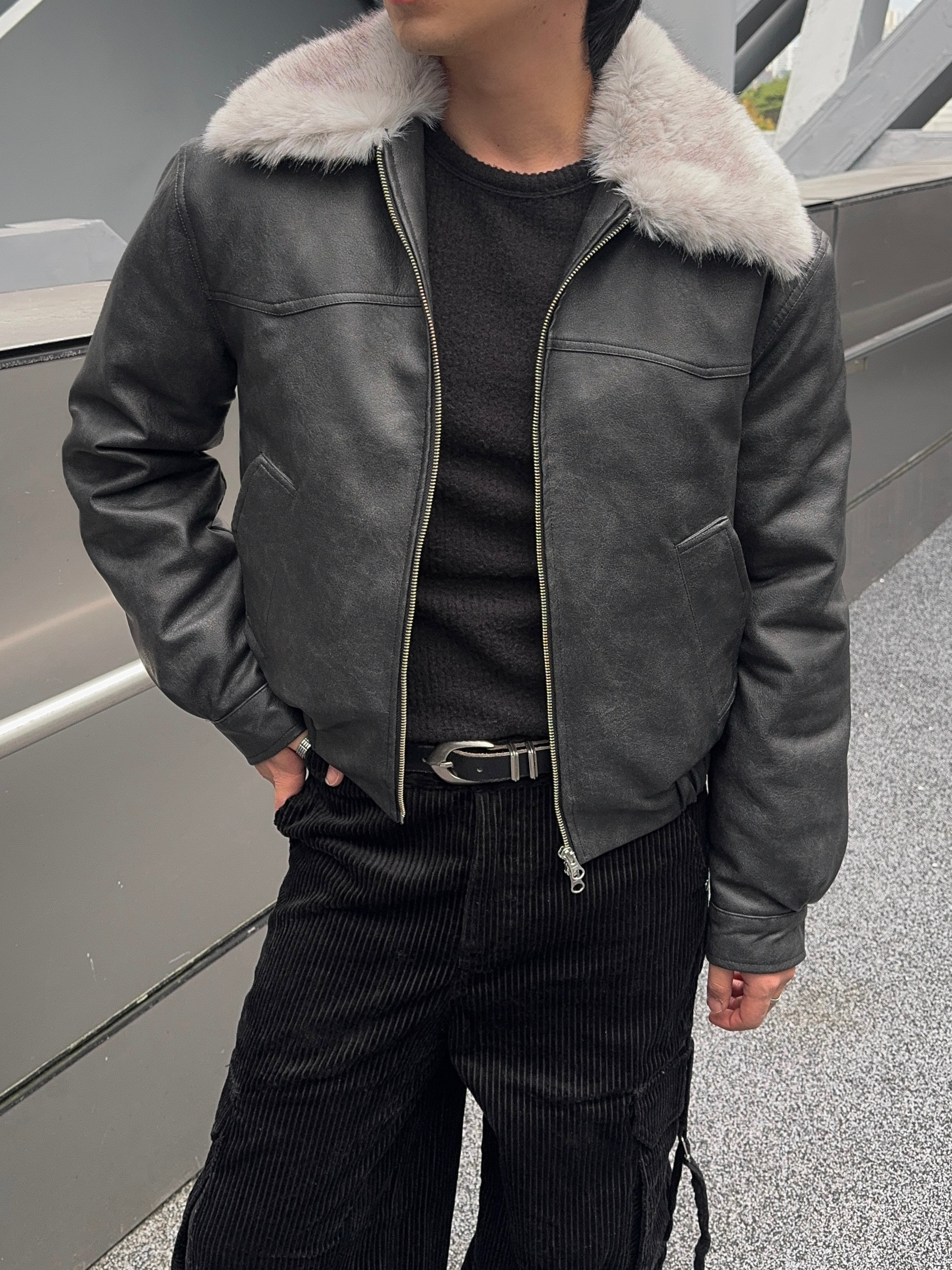 -리얼 라쿤퍼가 부착된 레더 점퍼