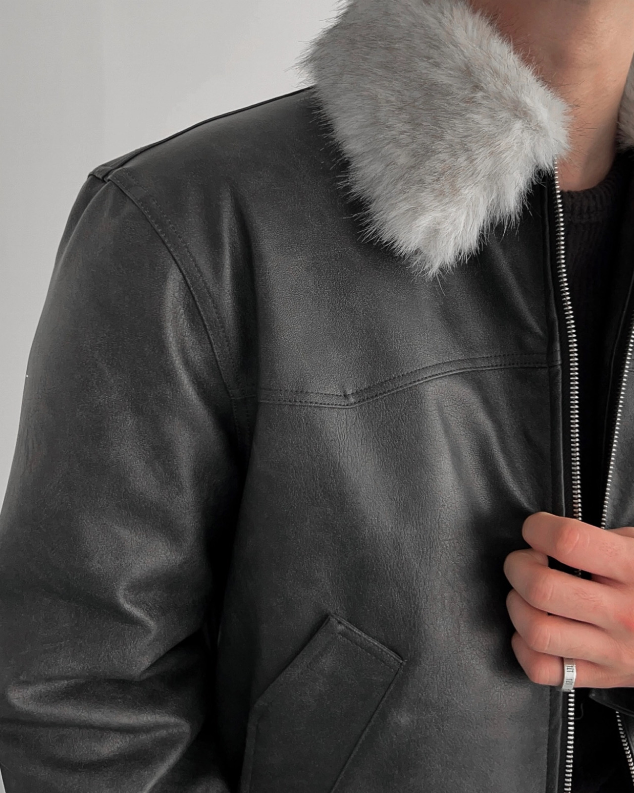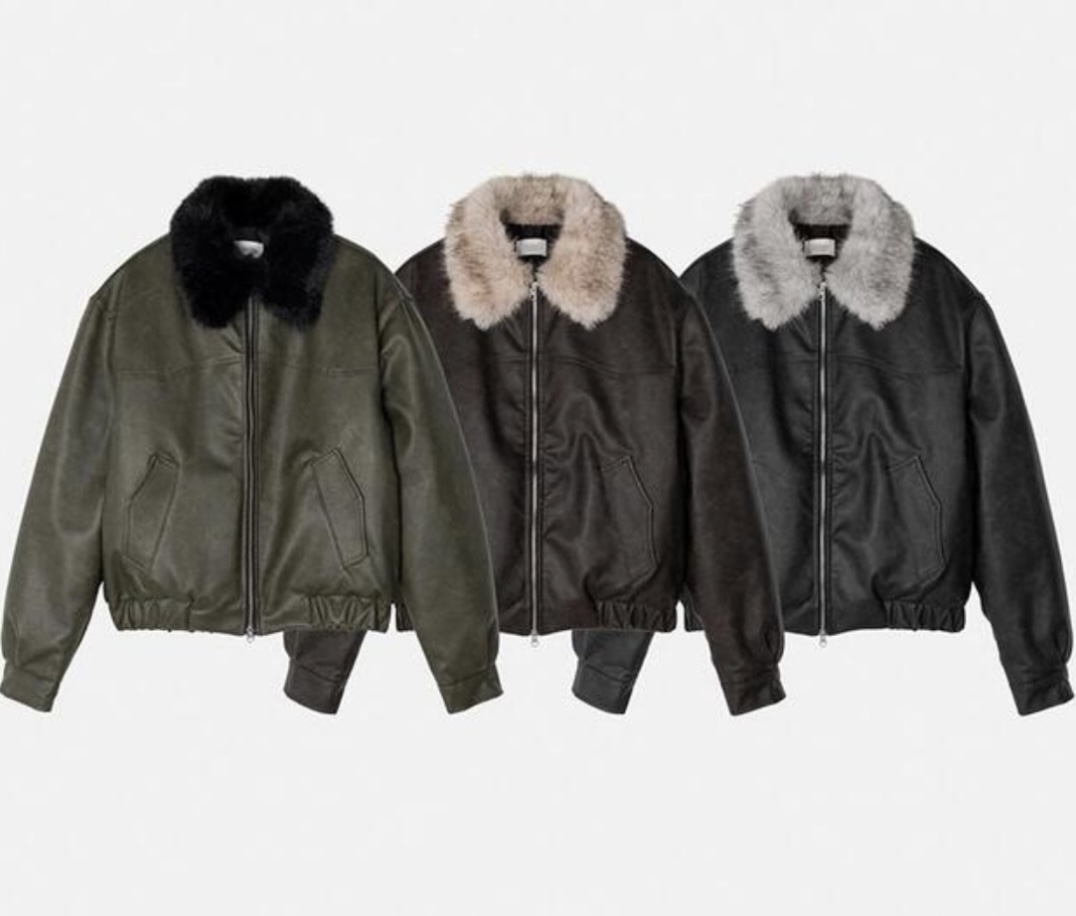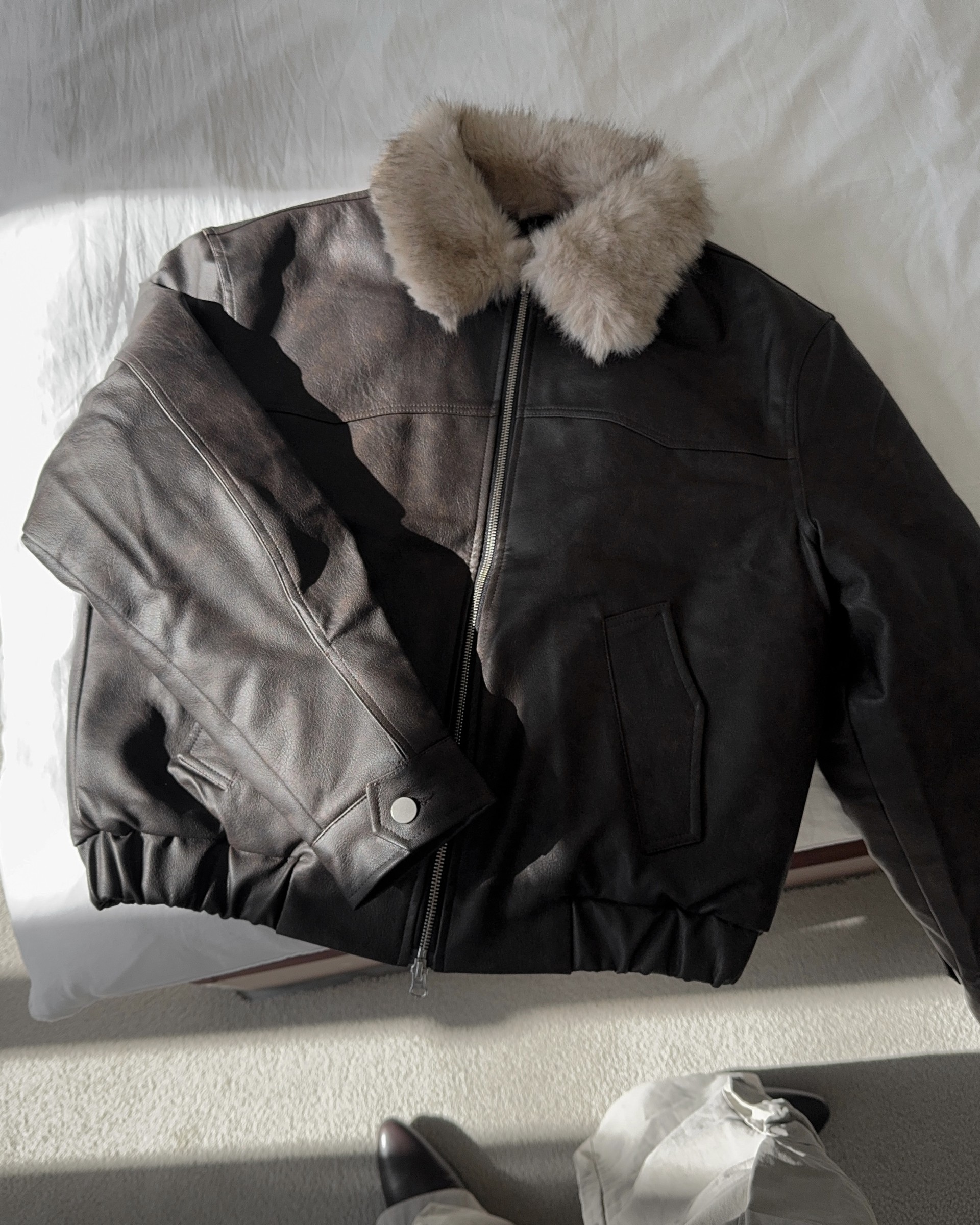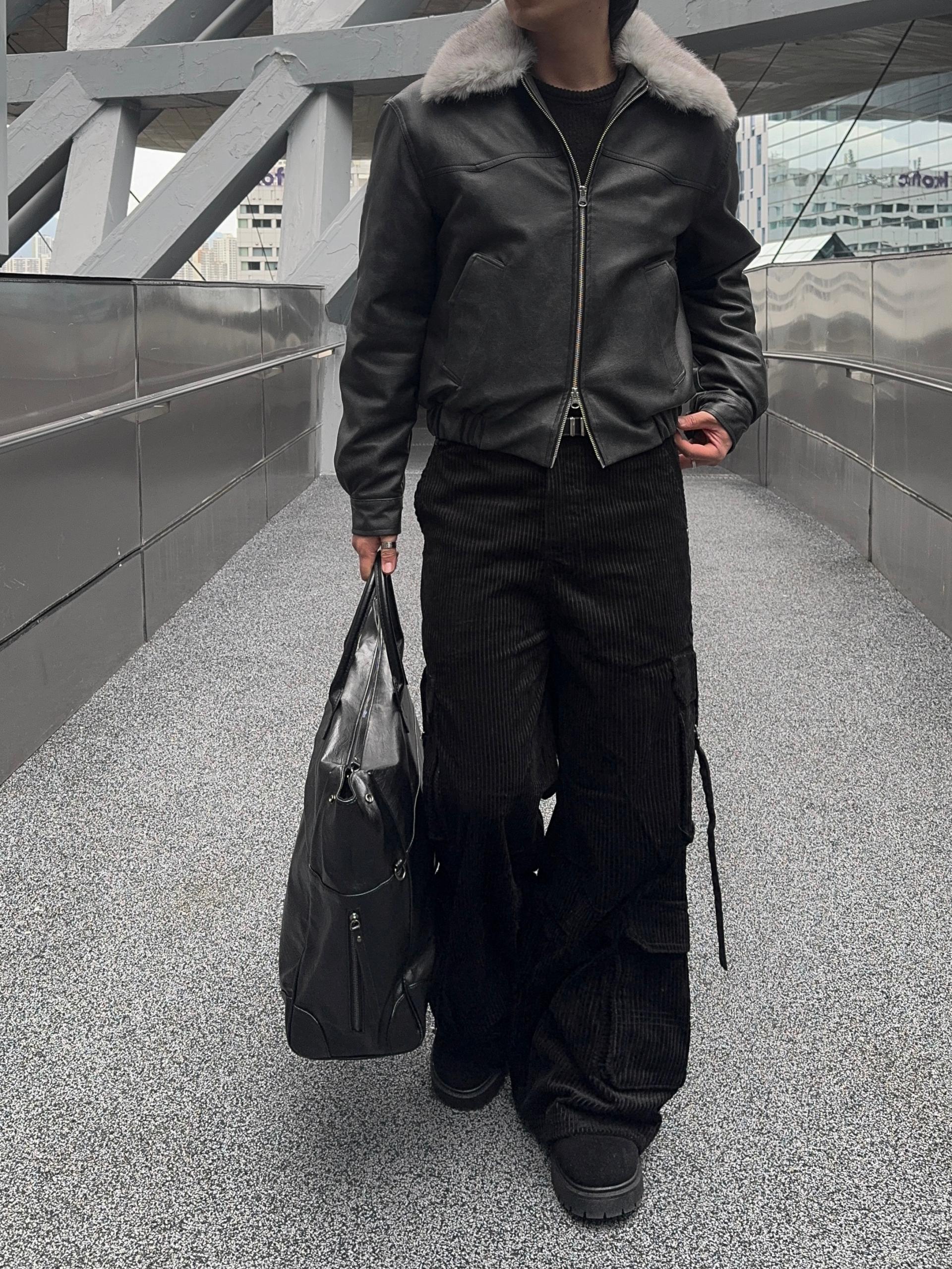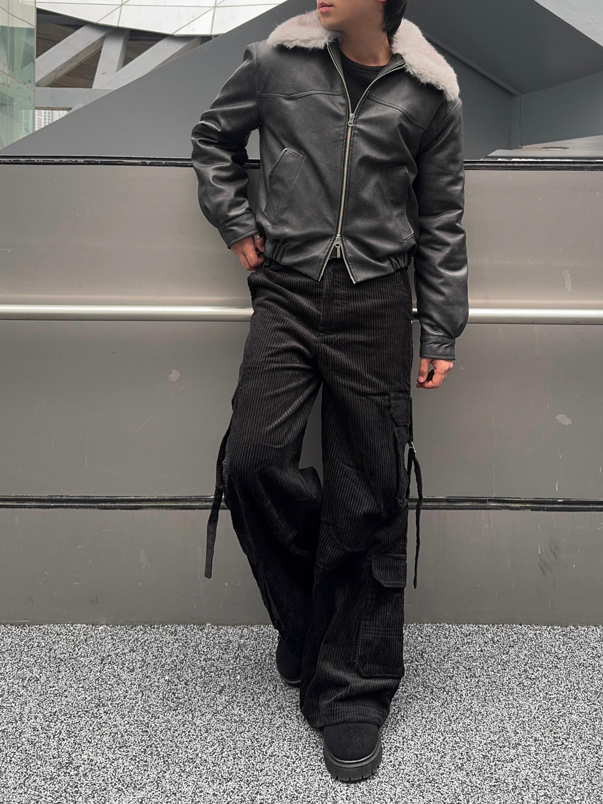 -리얼 라쿤퍼가 부착된 레더 점퍼