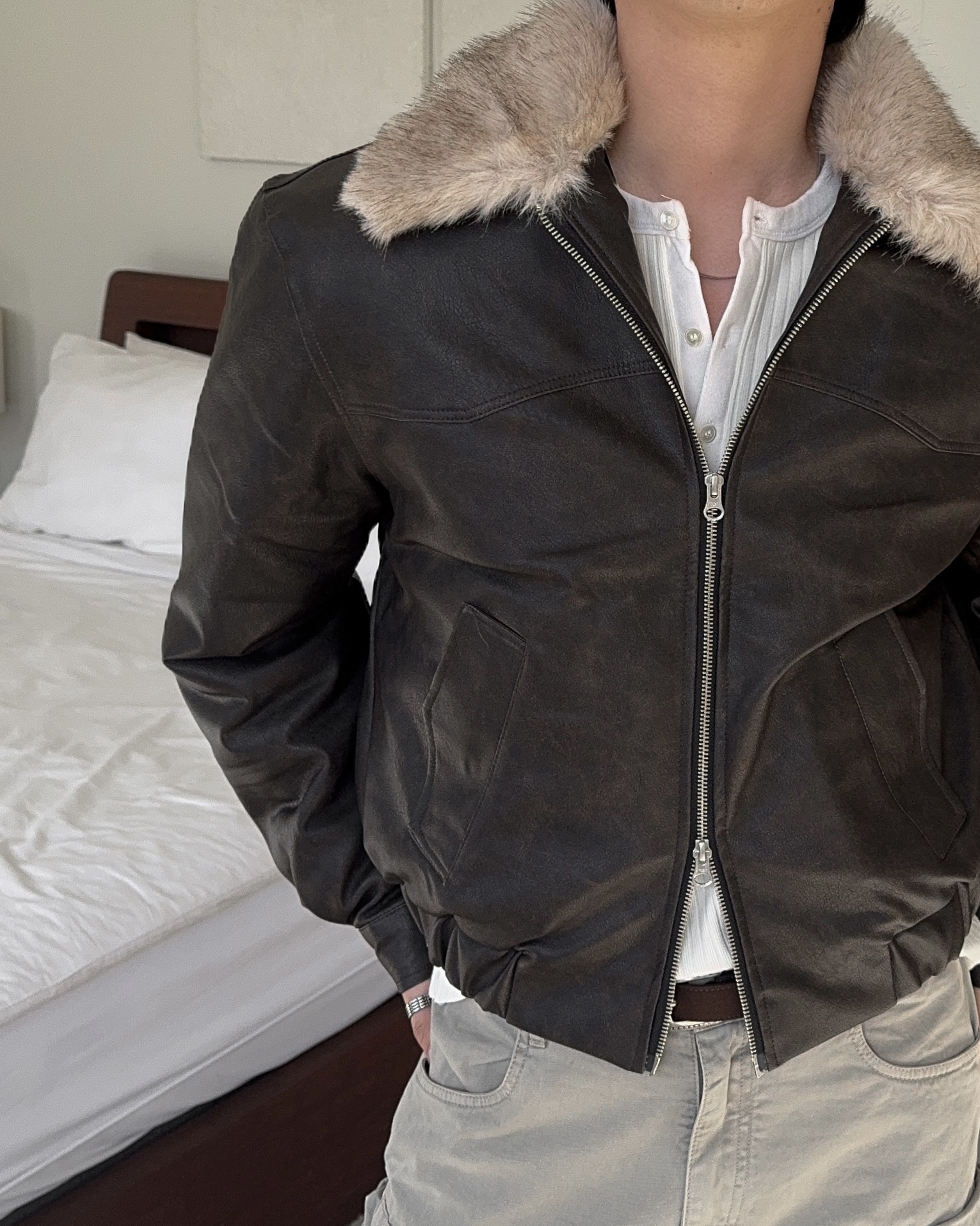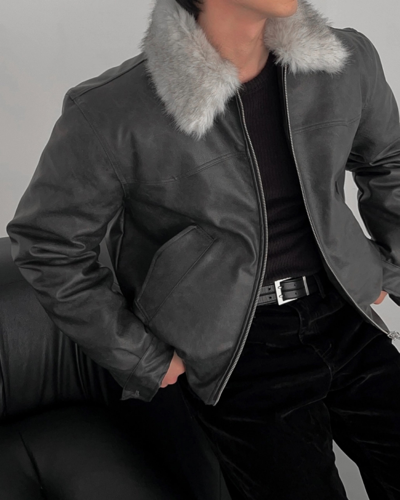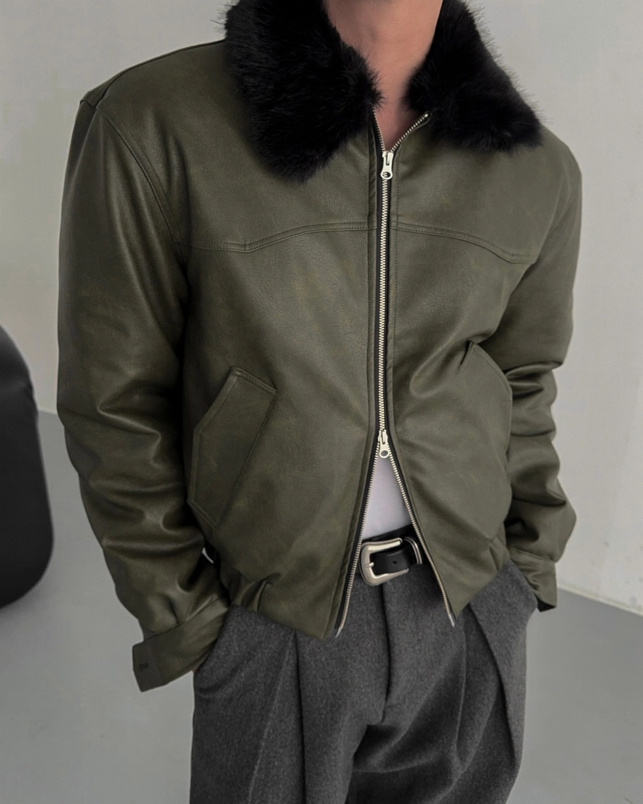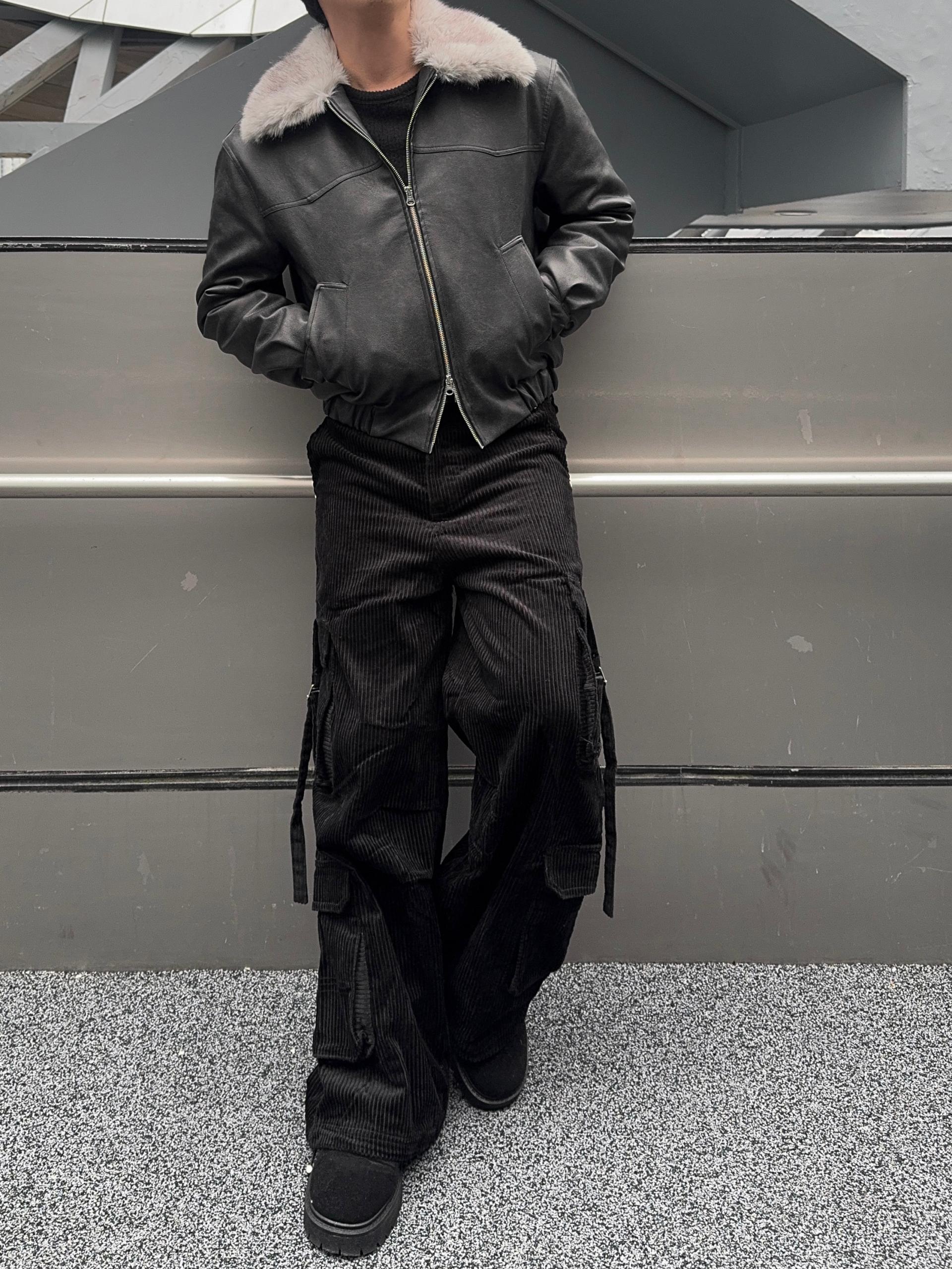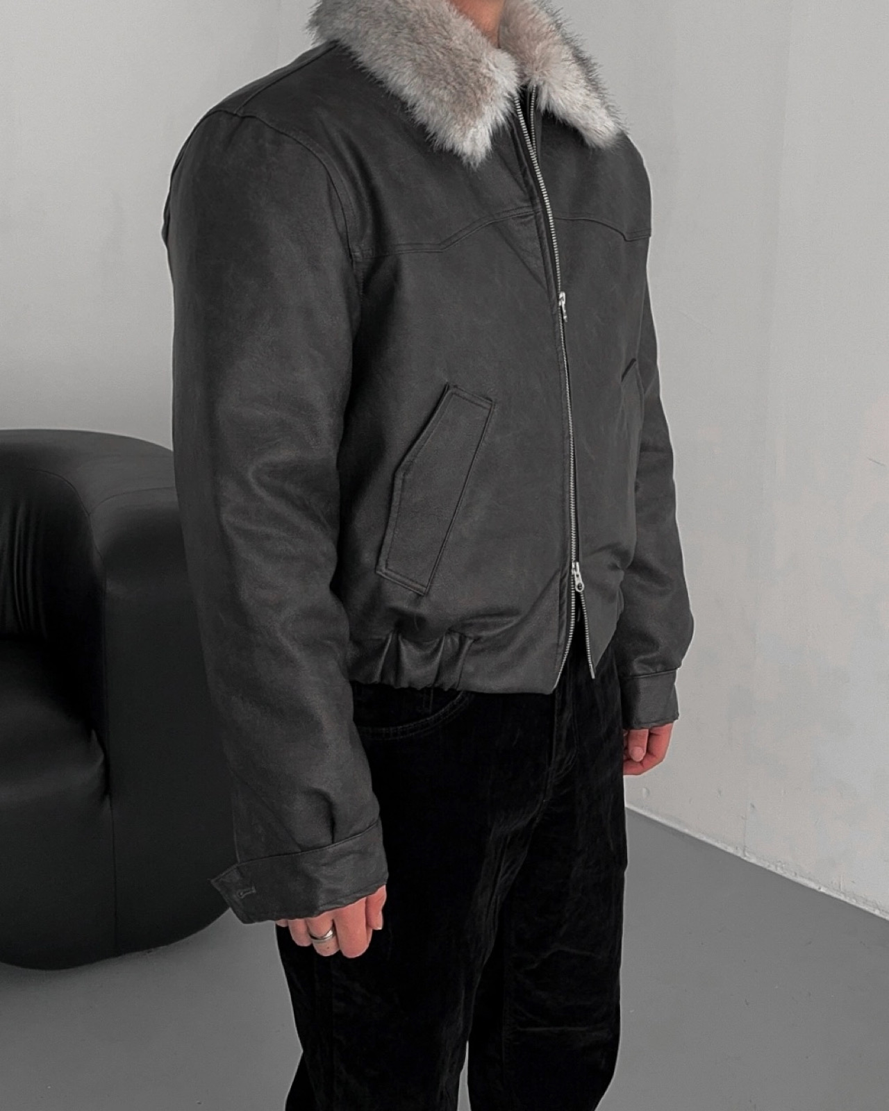 -리얼 라쿤퍼가 부착된 레더 점퍼