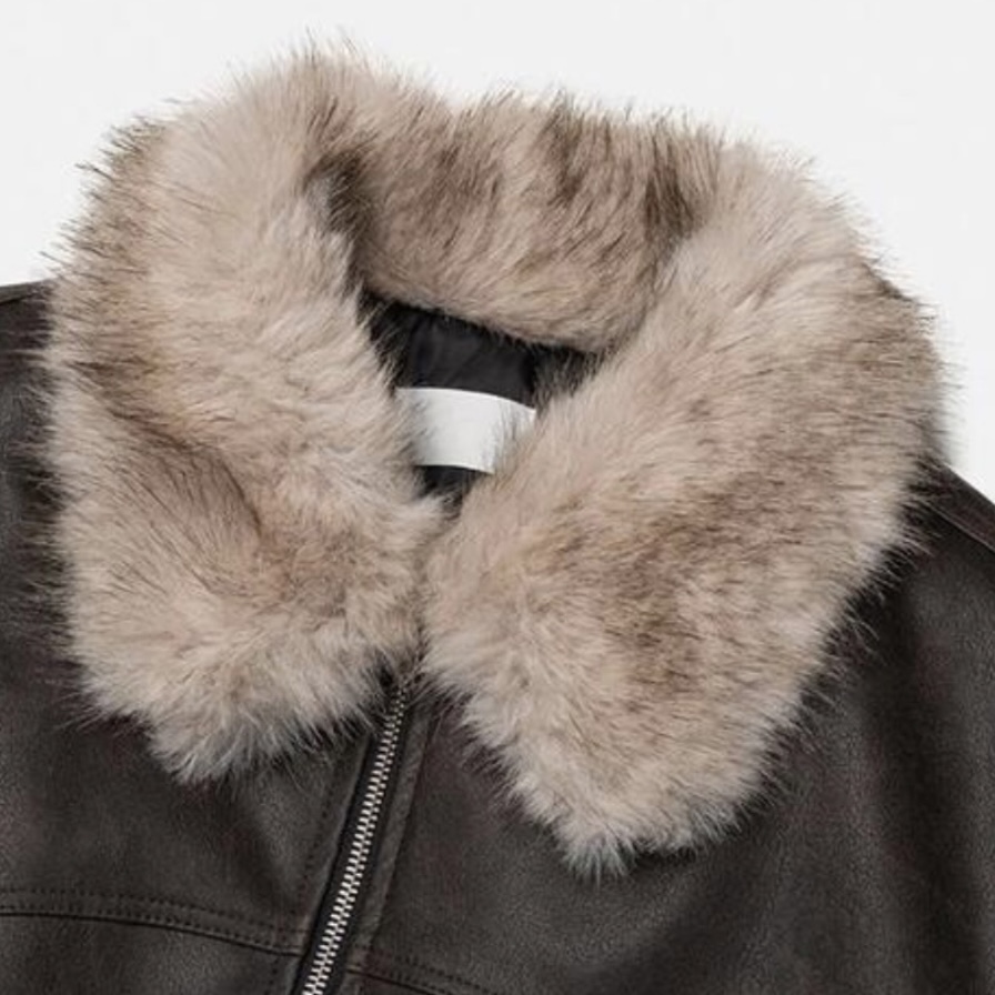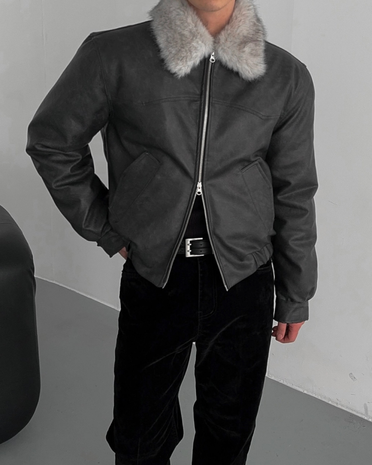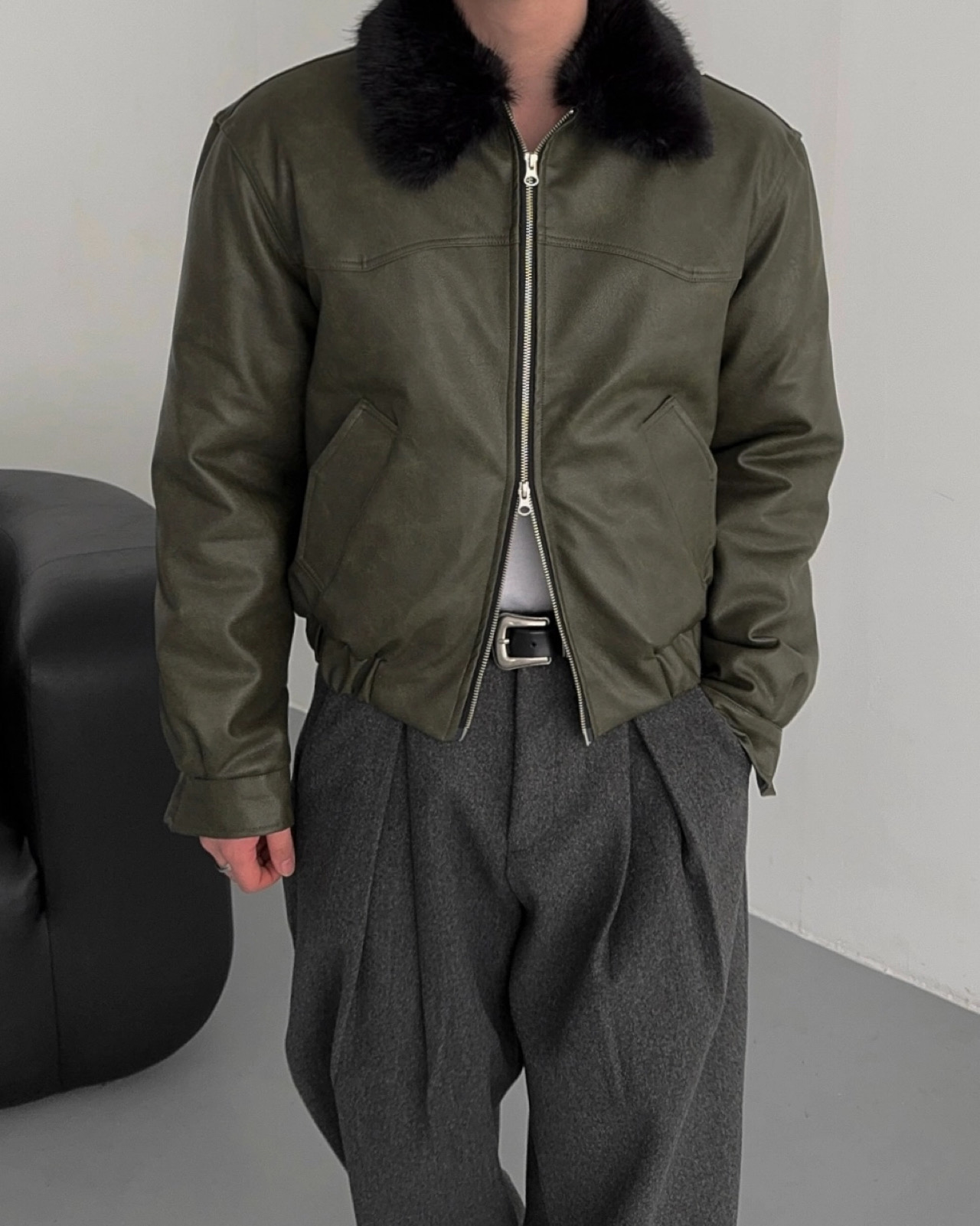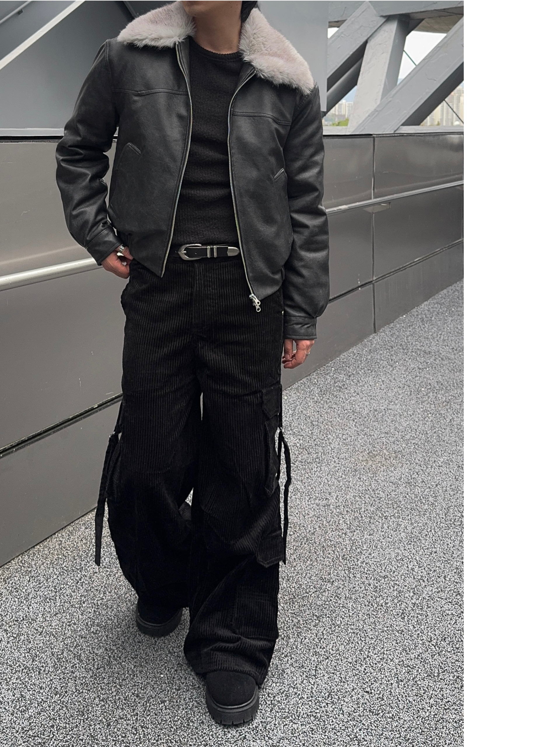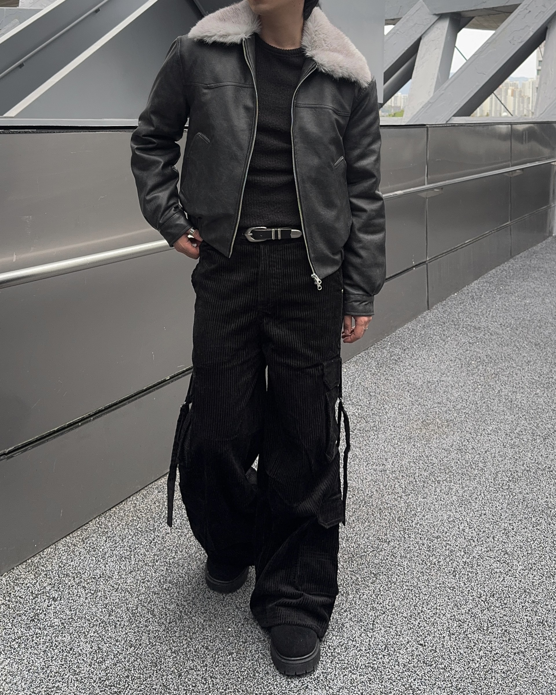 -리얼 라쿤퍼가 부착된 레더 점퍼