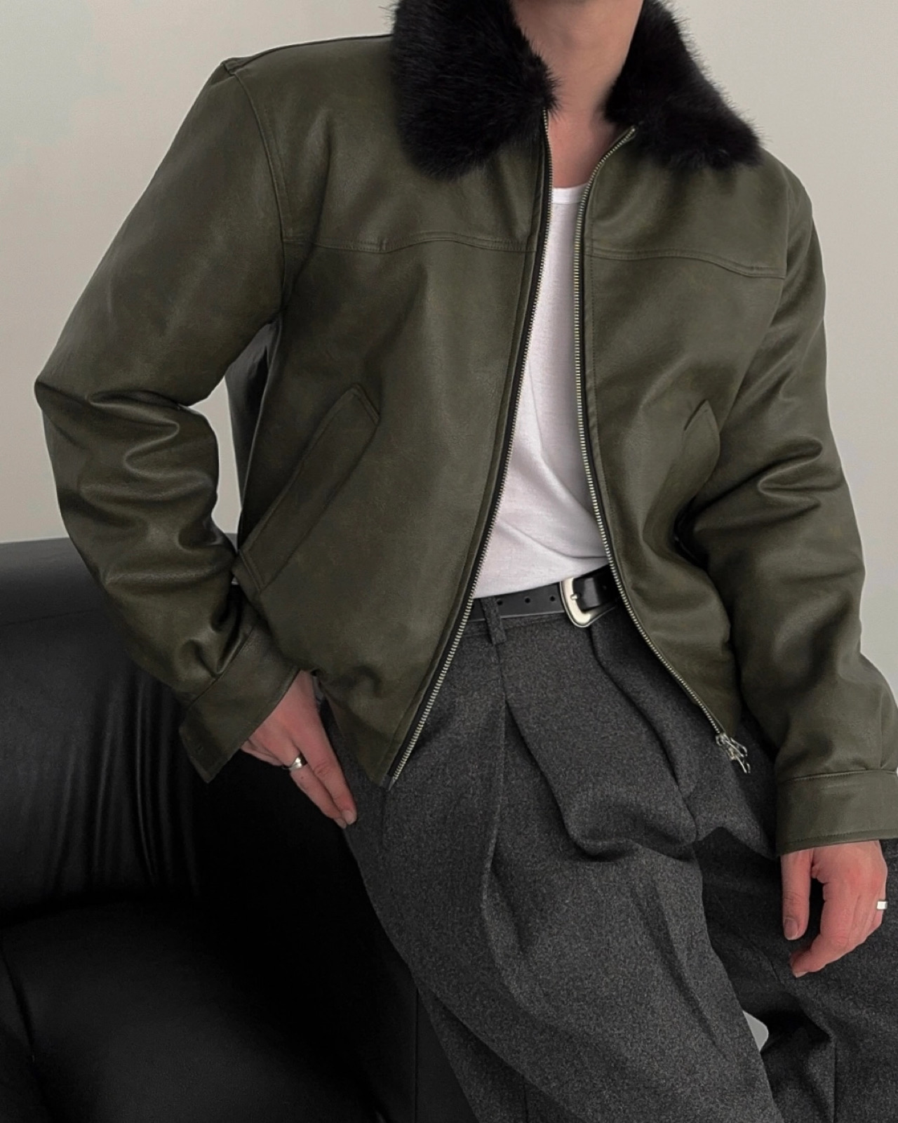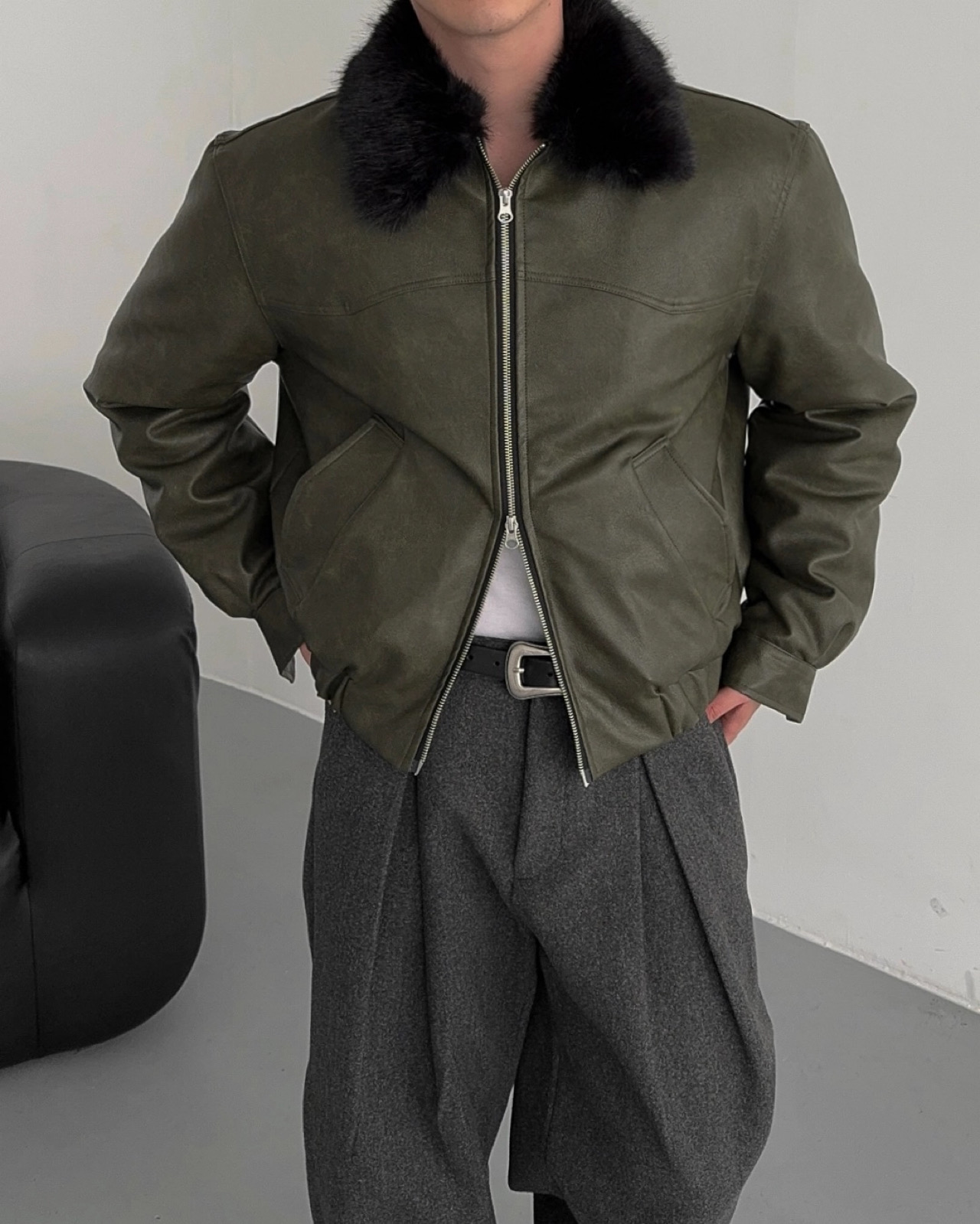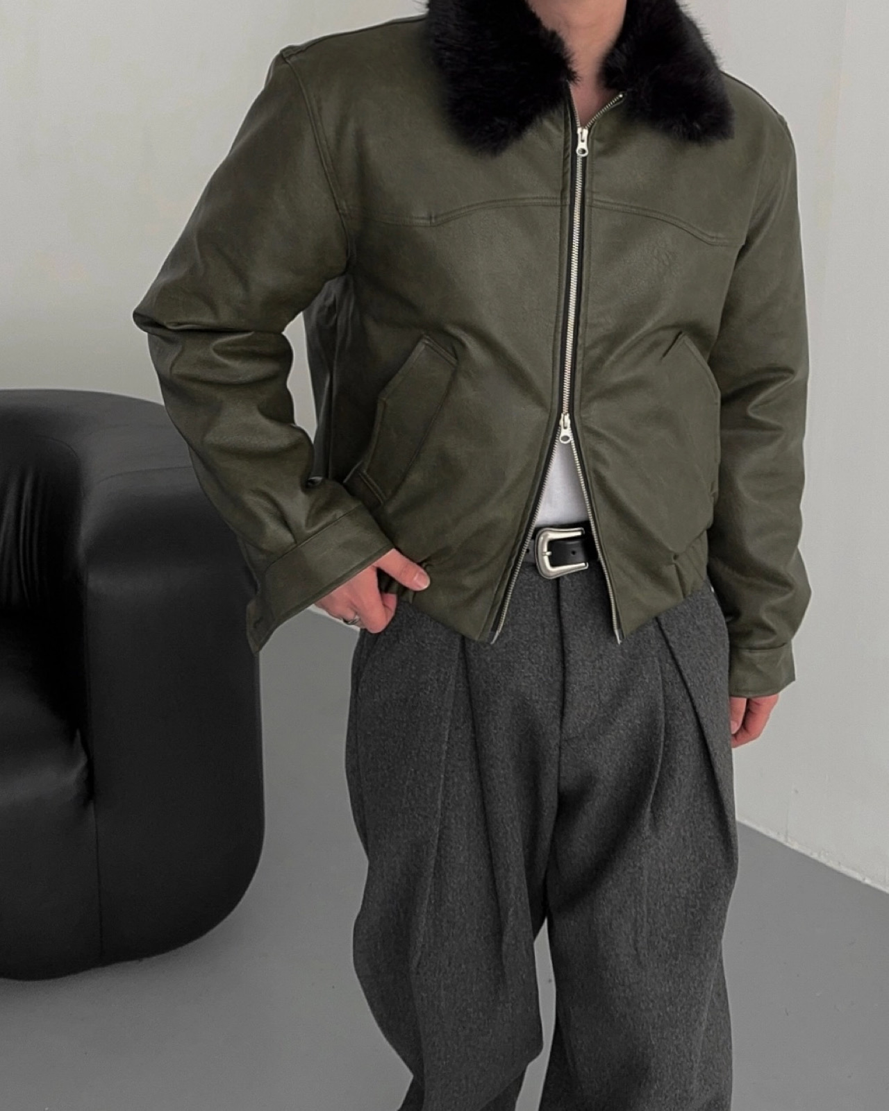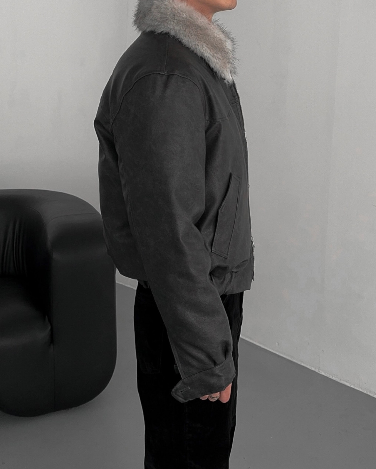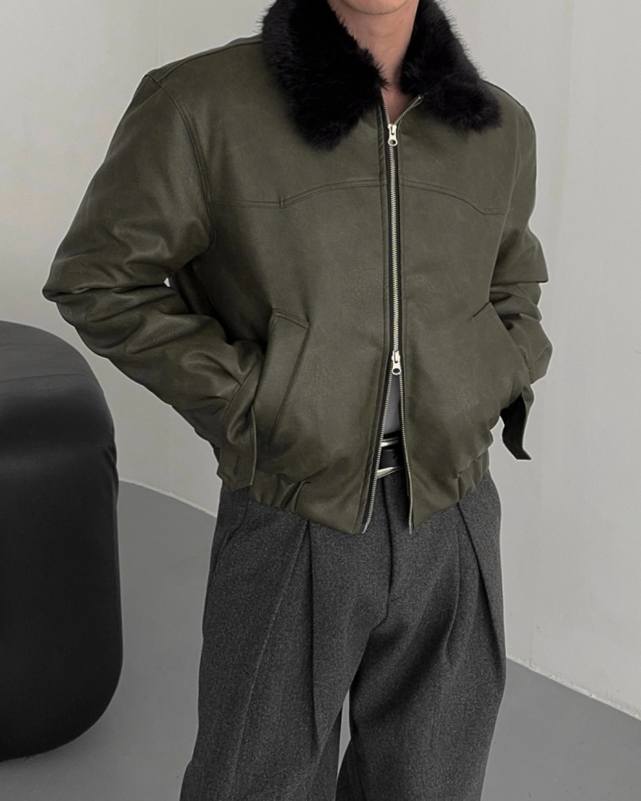 -리얼 라쿤퍼가 부착된 레더 점퍼