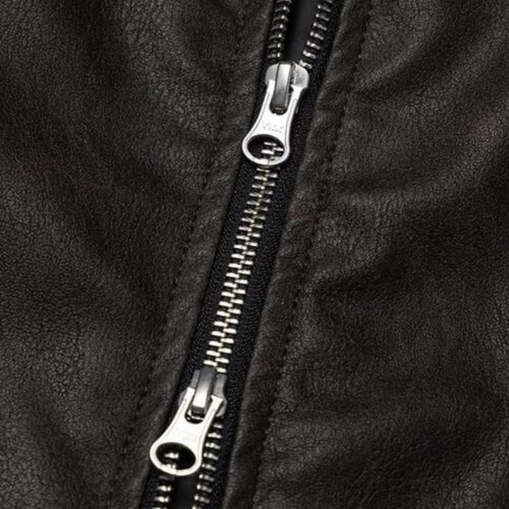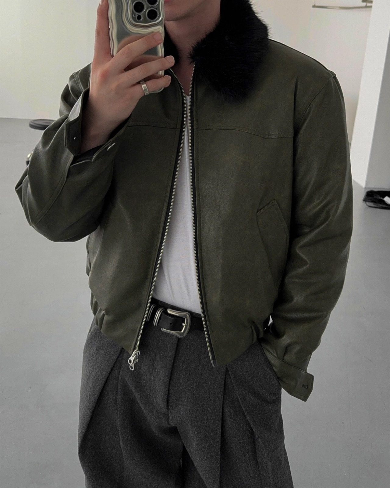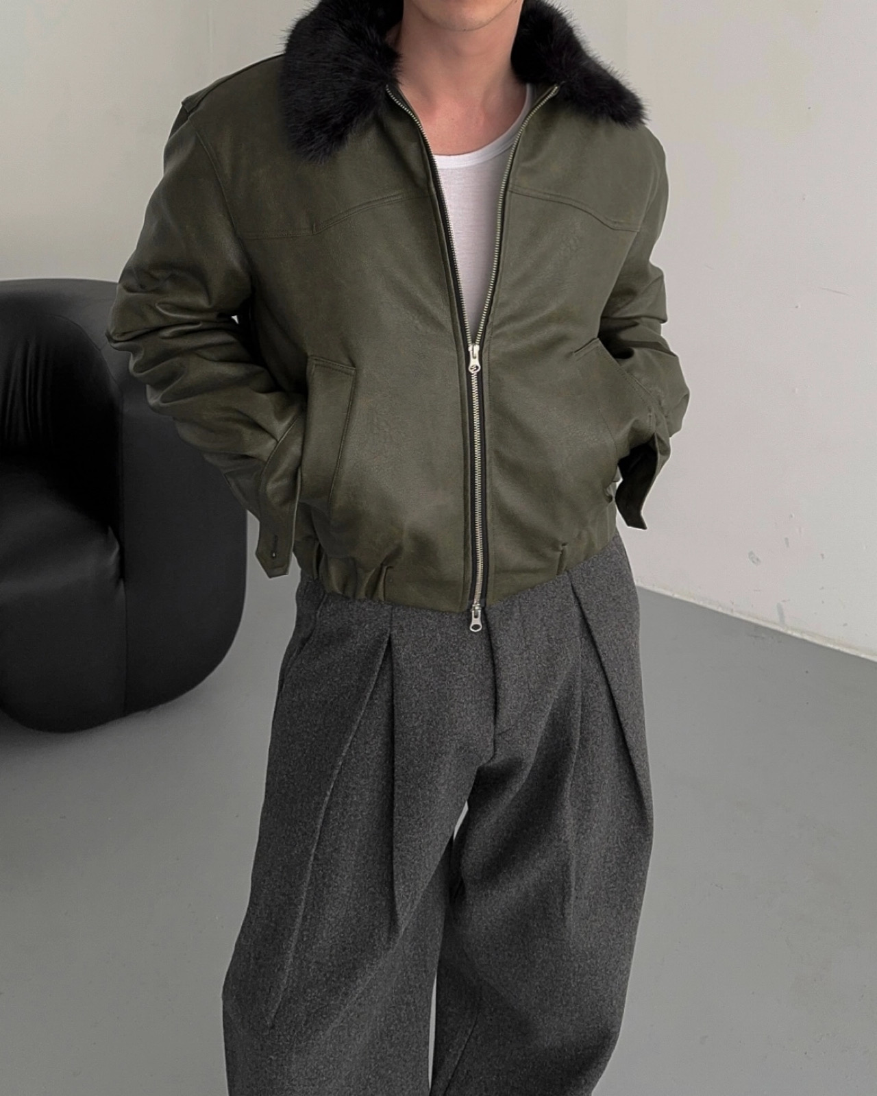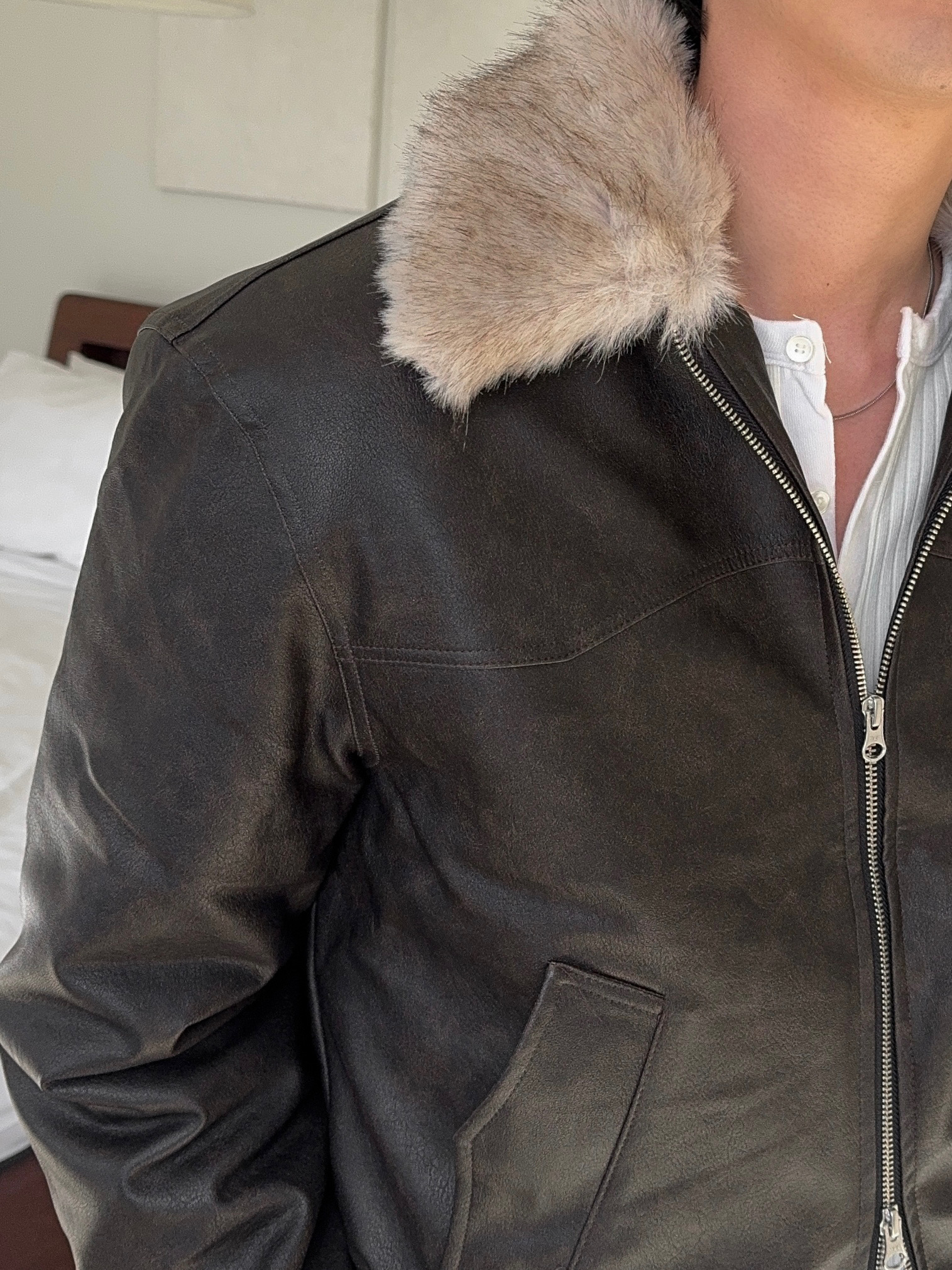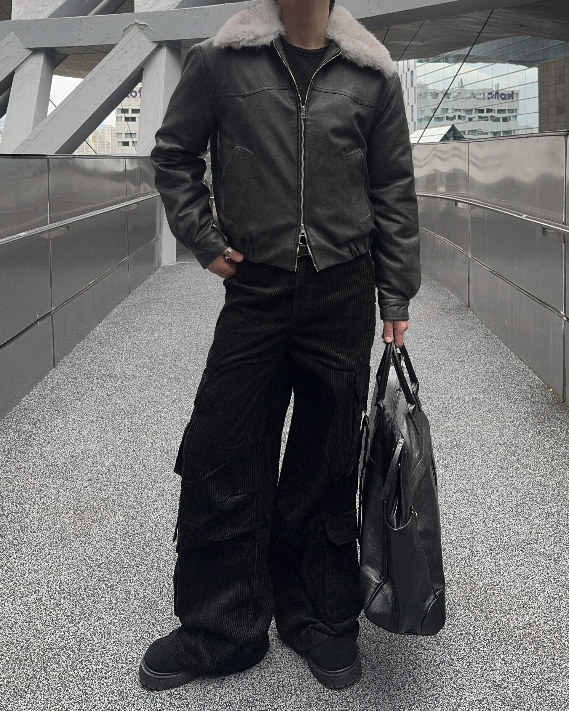 -리얼 라쿤퍼가 부착된 레더 점퍼