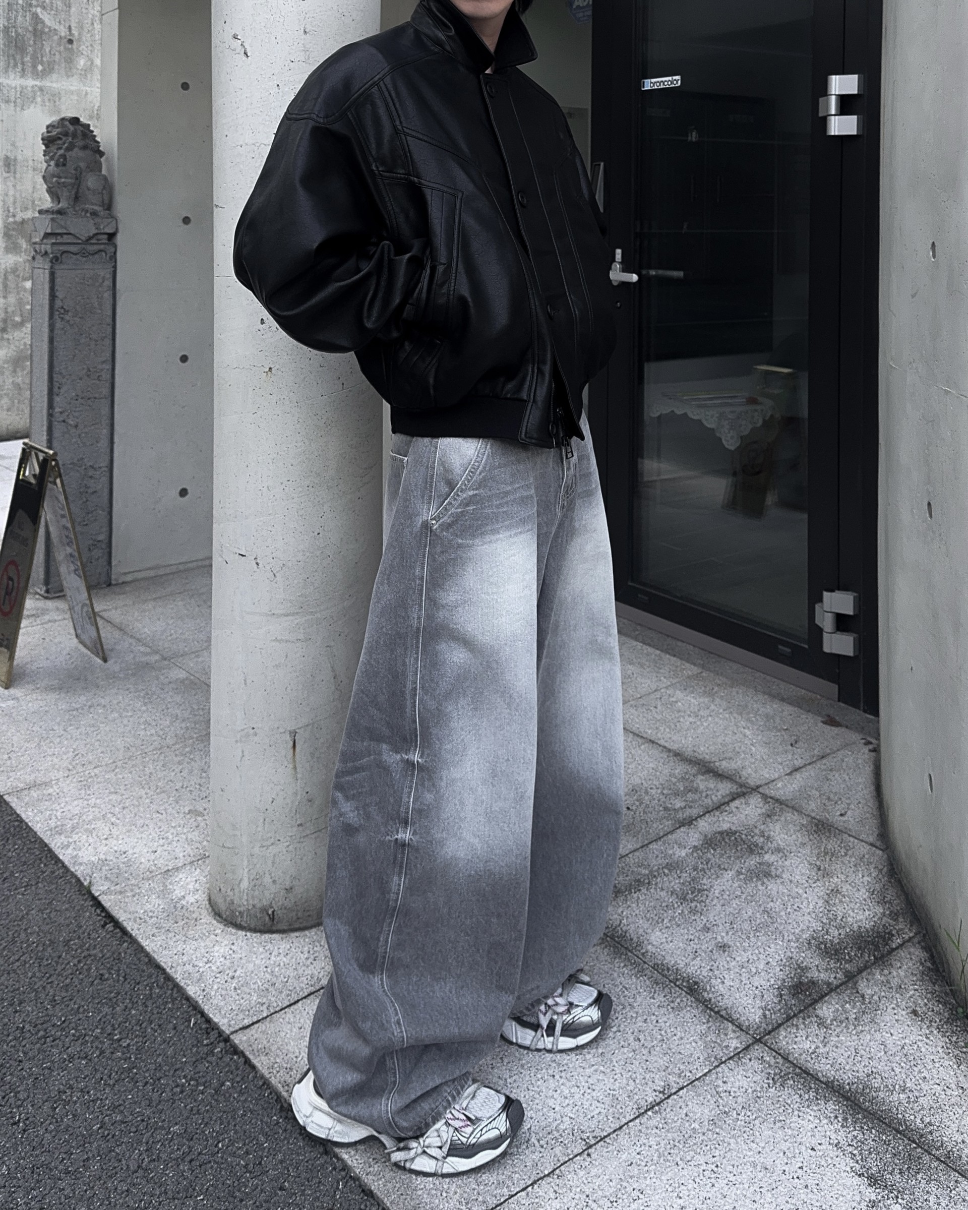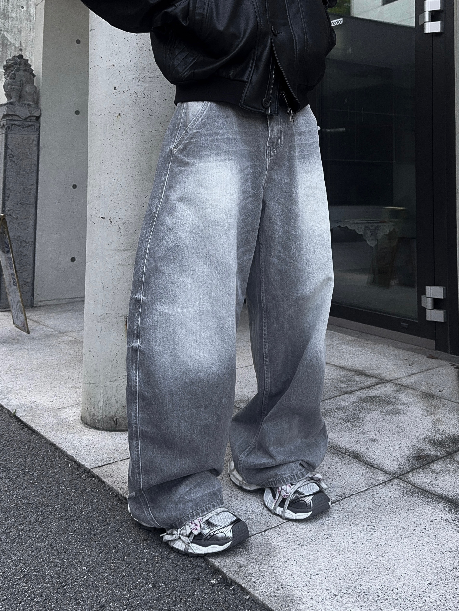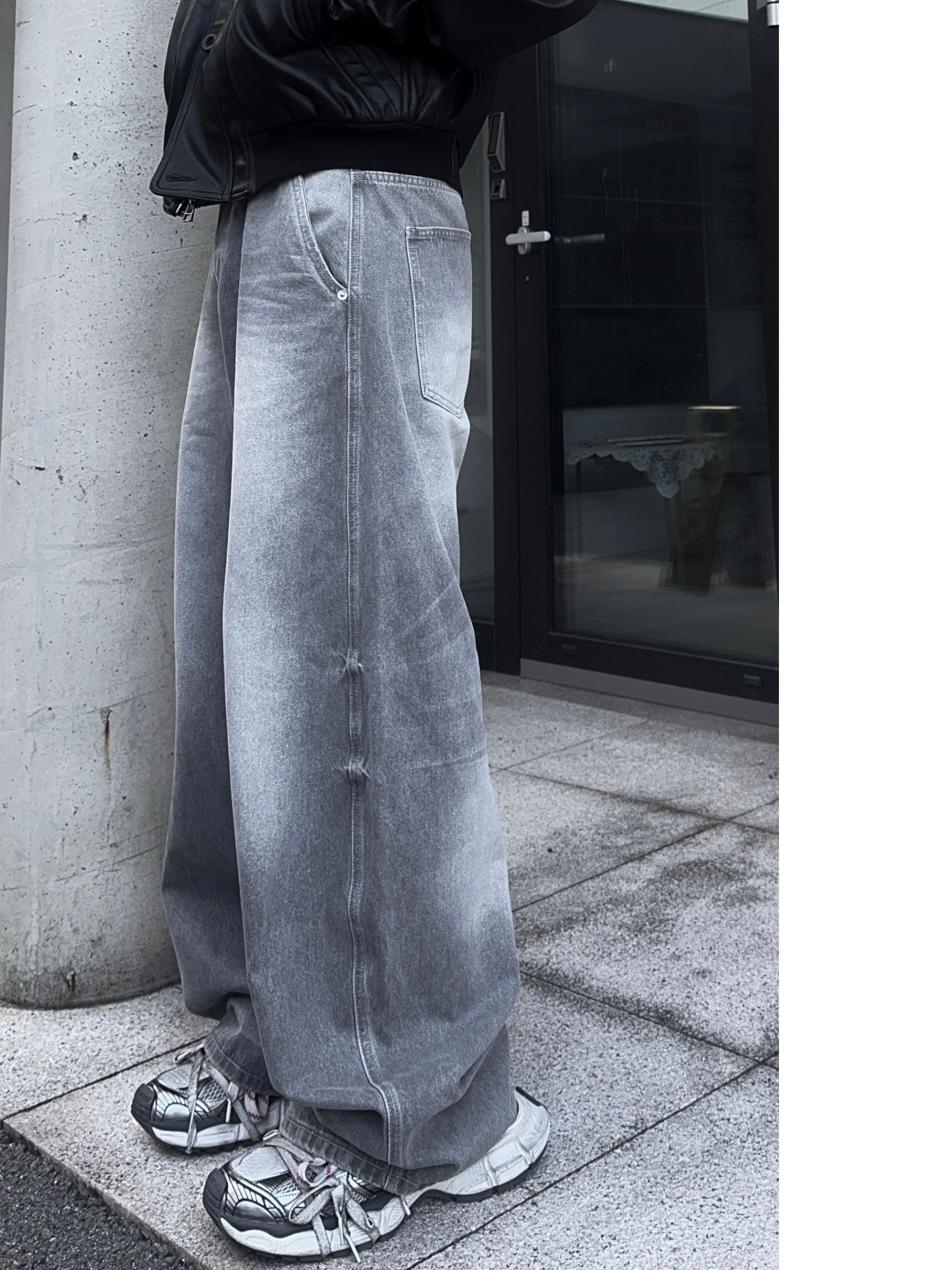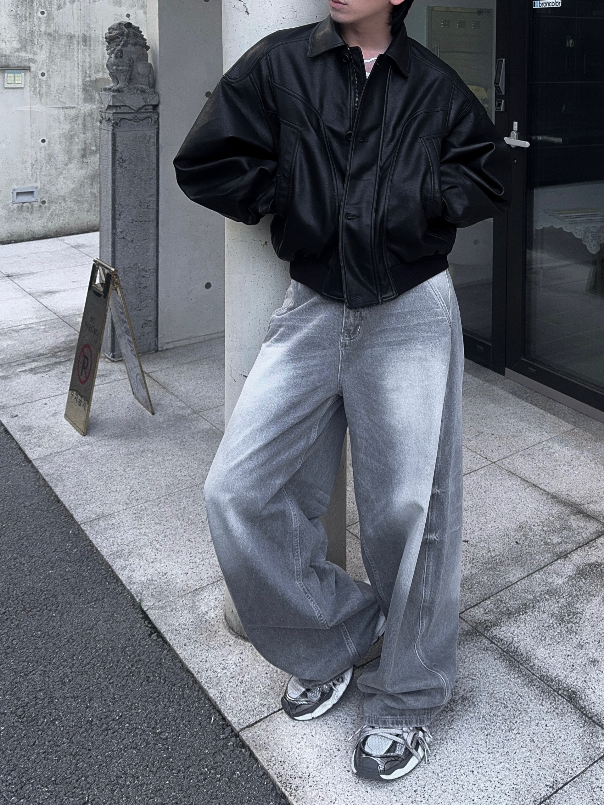 -와이드한 실루엣으로 크롭 기장감 탑,아우터와 어울러지는 아웃핏