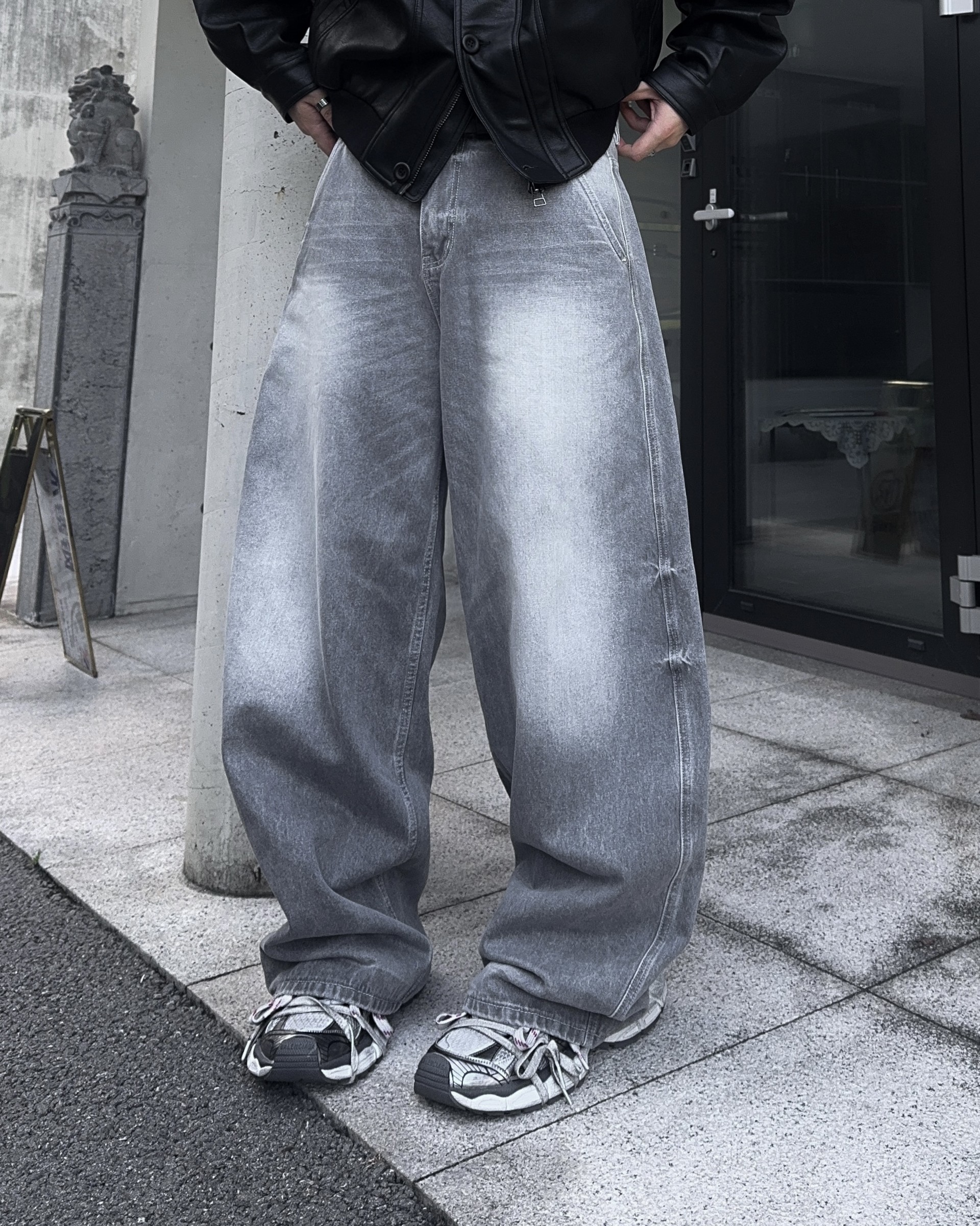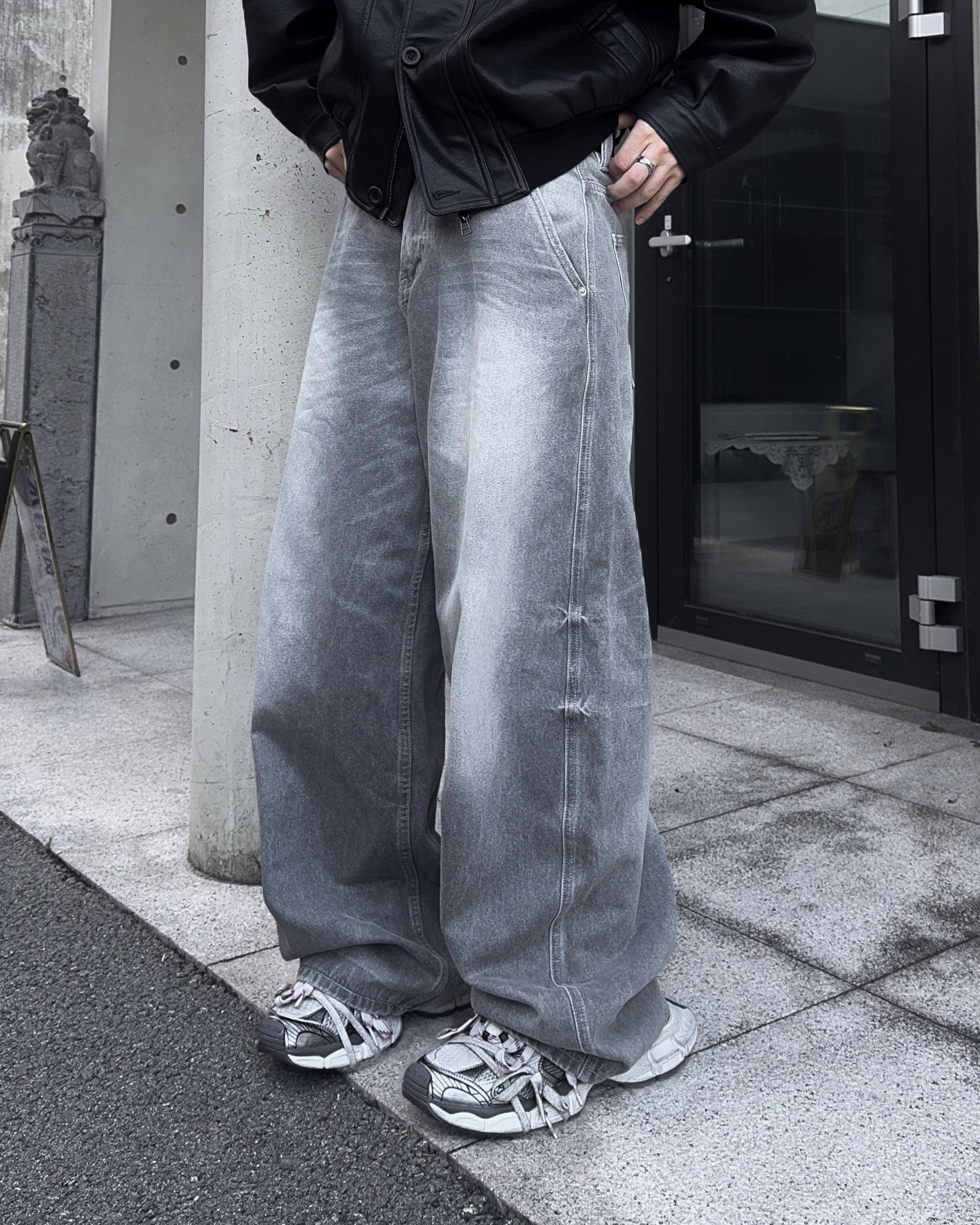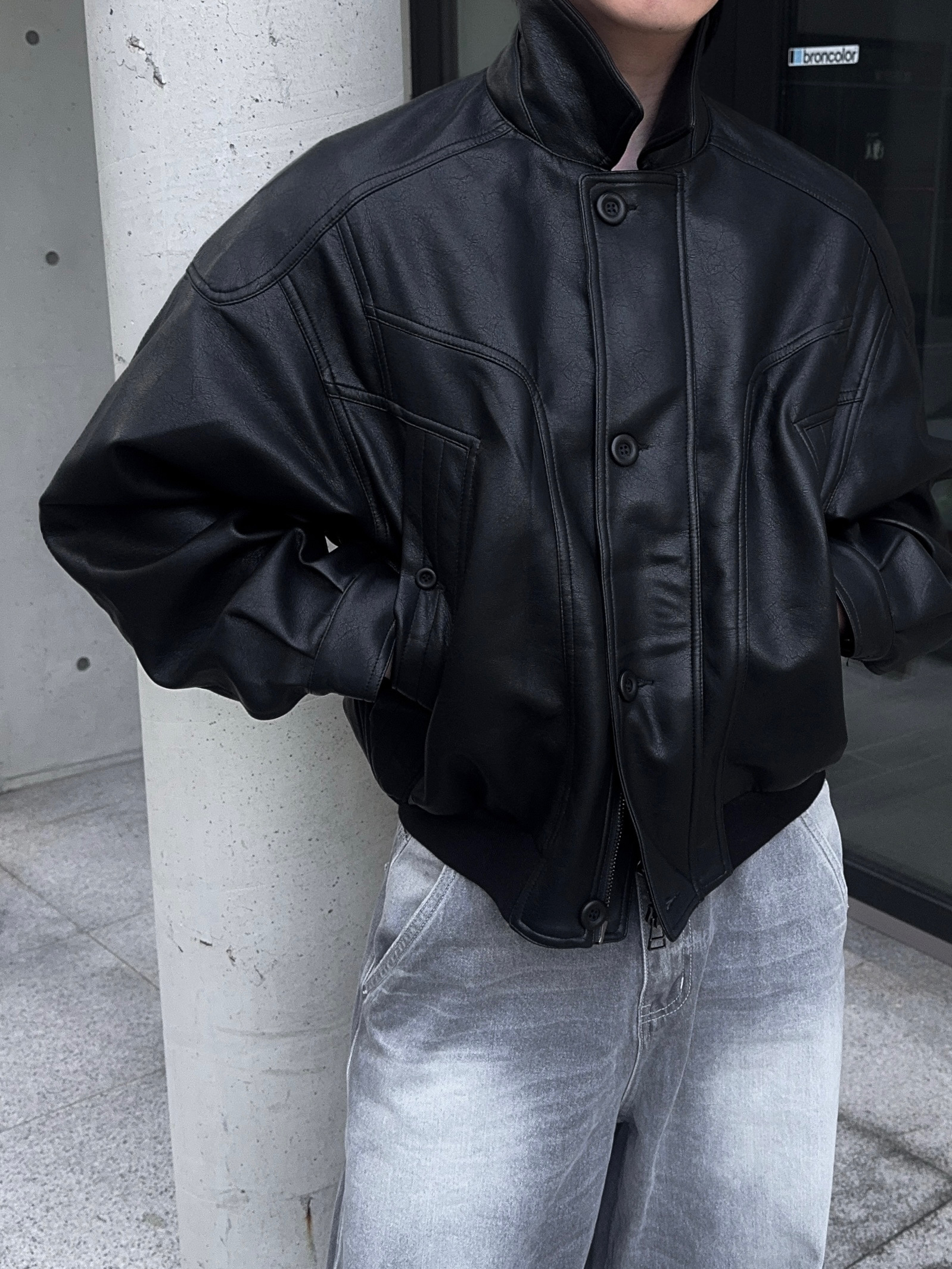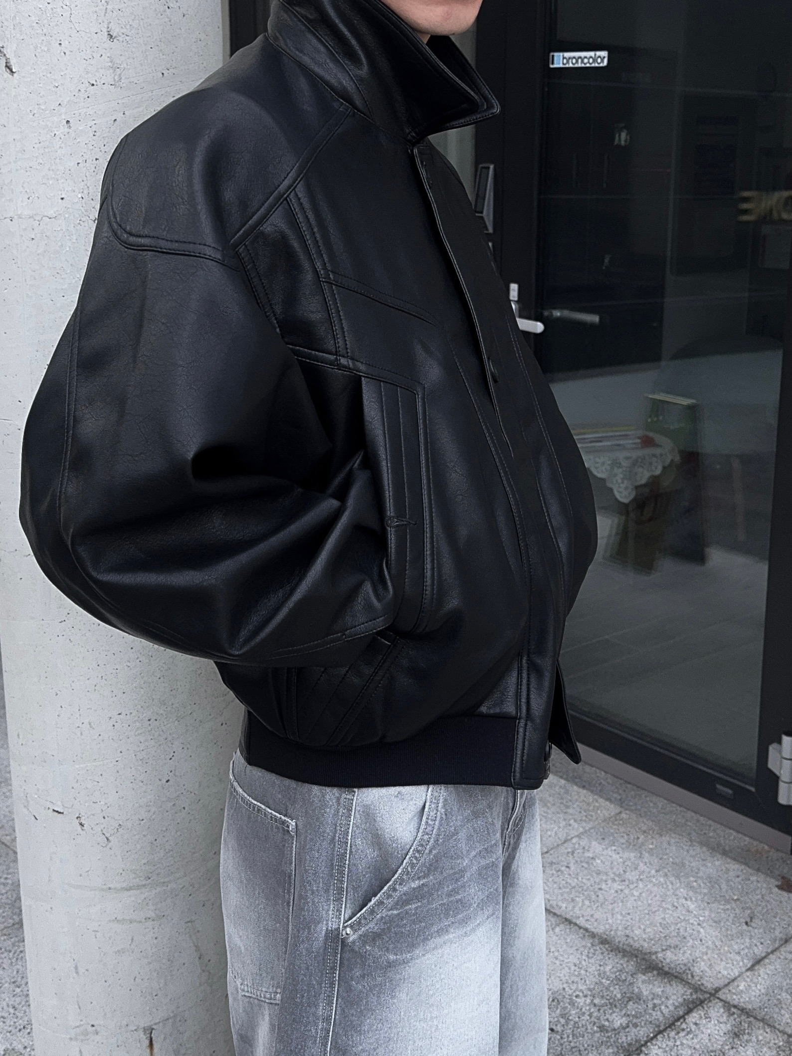 -와이드한 실루엣으로 크롭 기장감 탑,아우터와 어울러지는 아웃핏