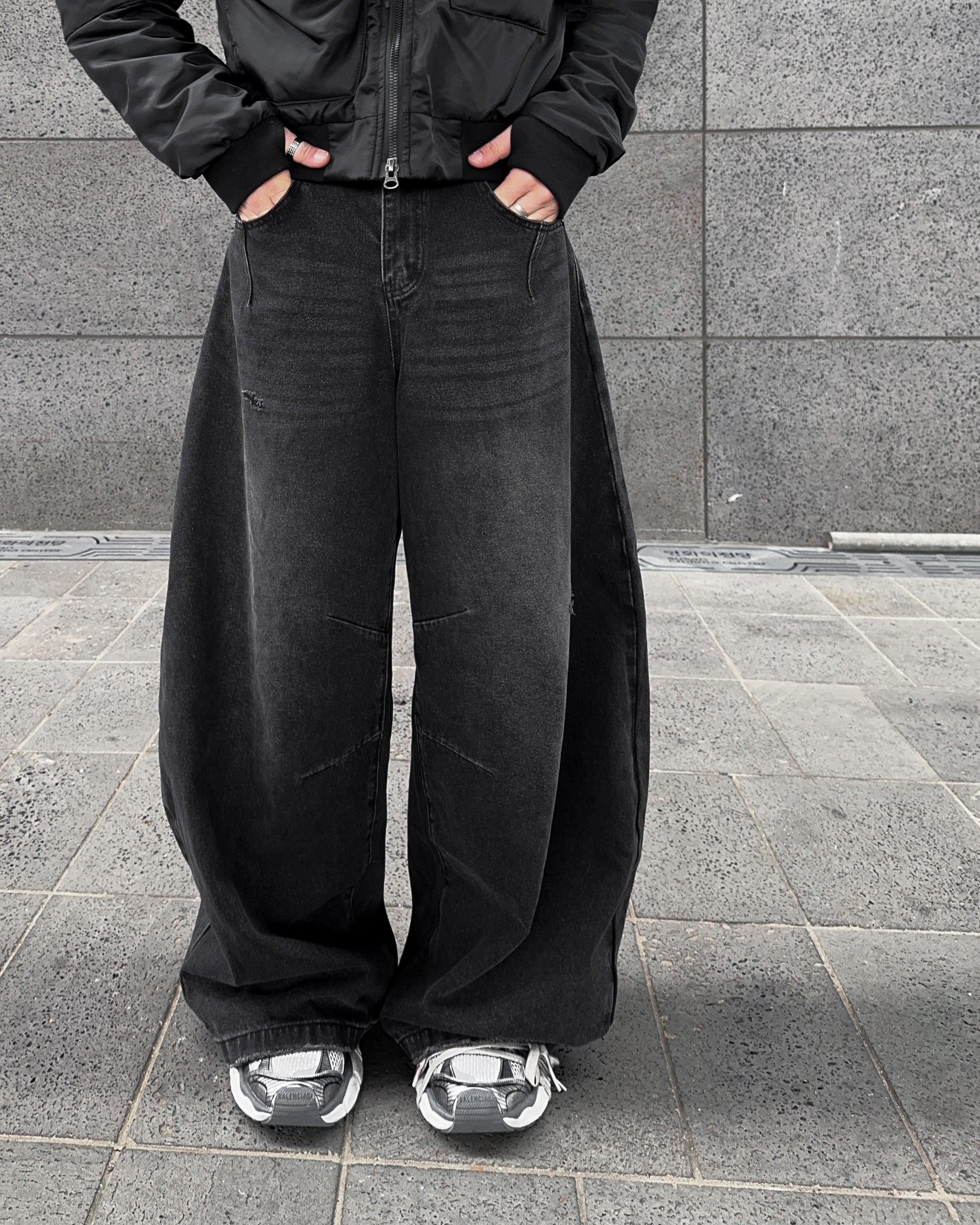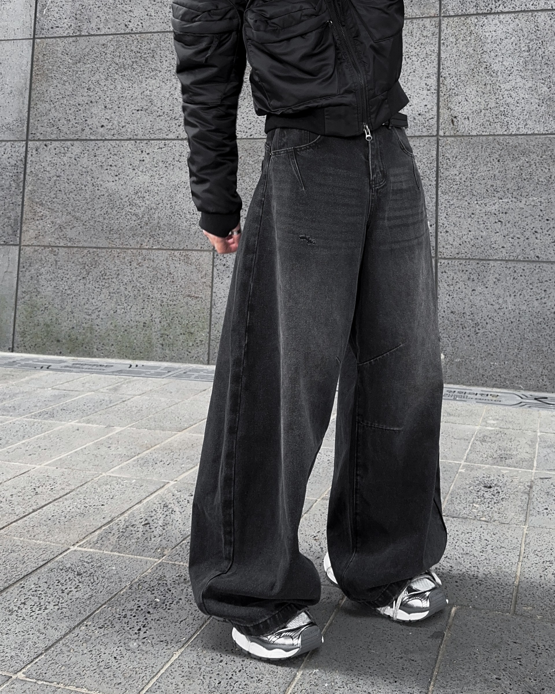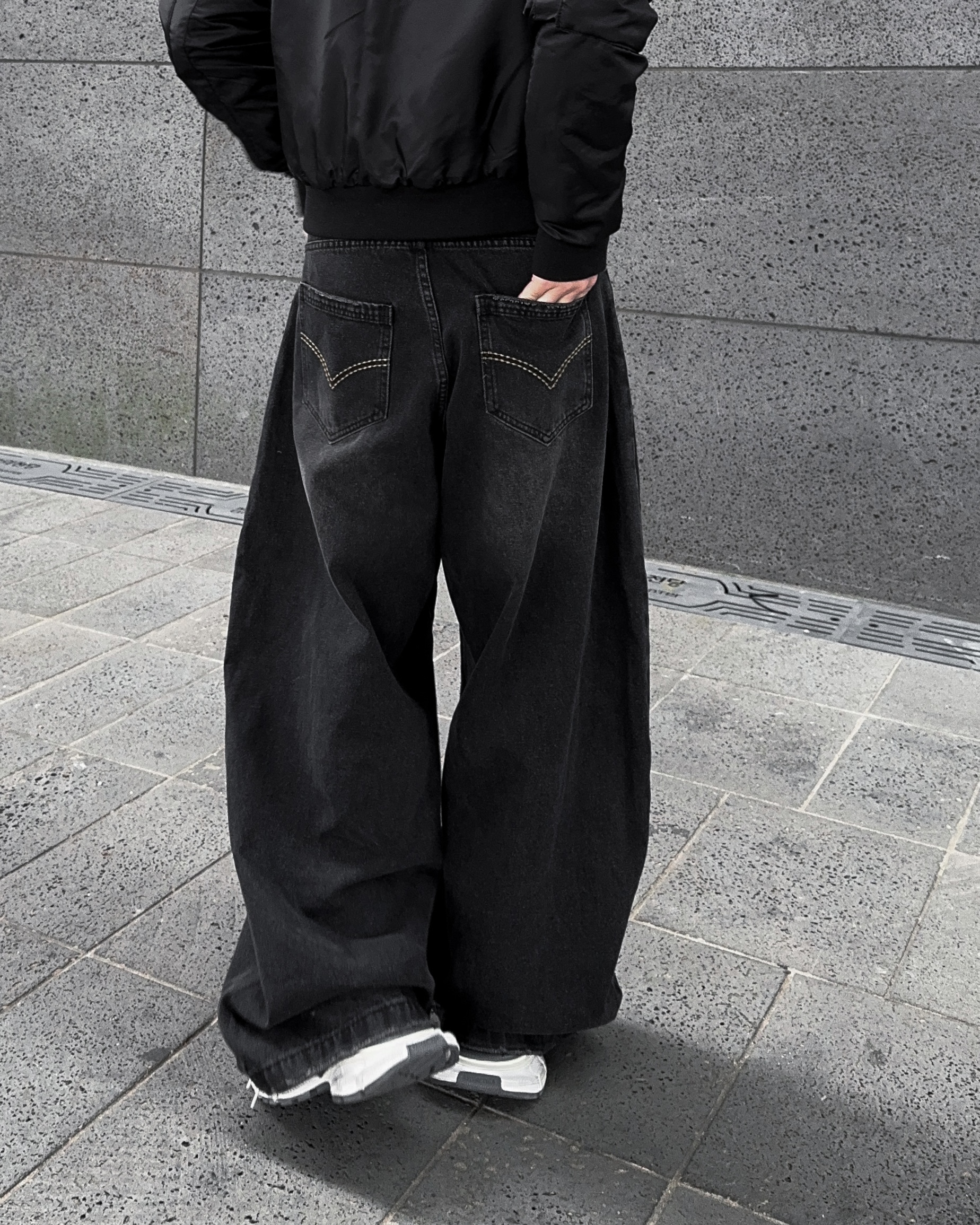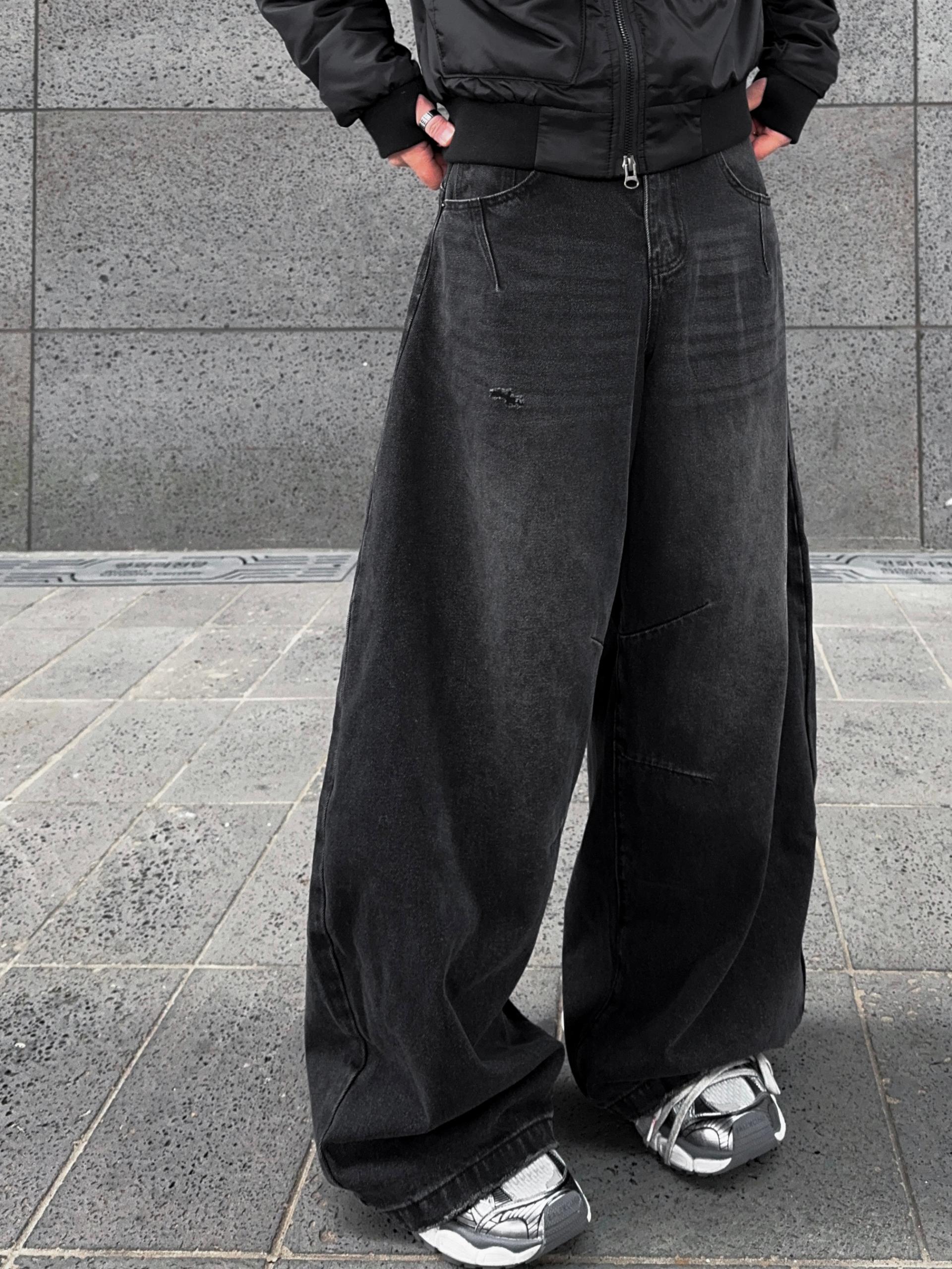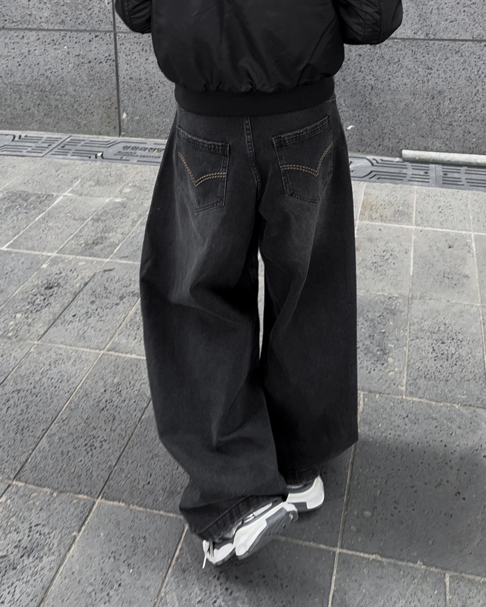 -탄탄한 데님 원단으로 제작된 와이드 팬츠