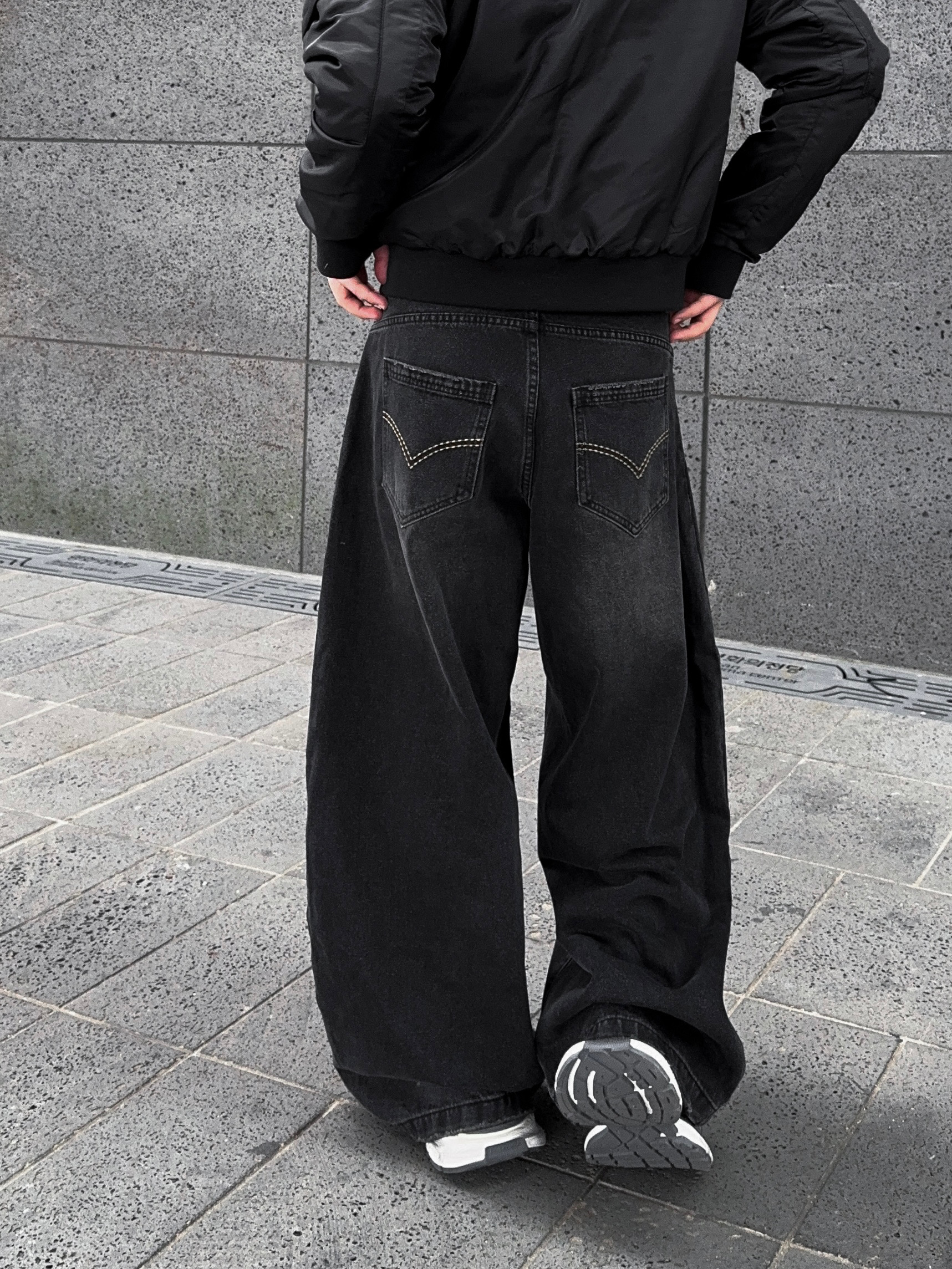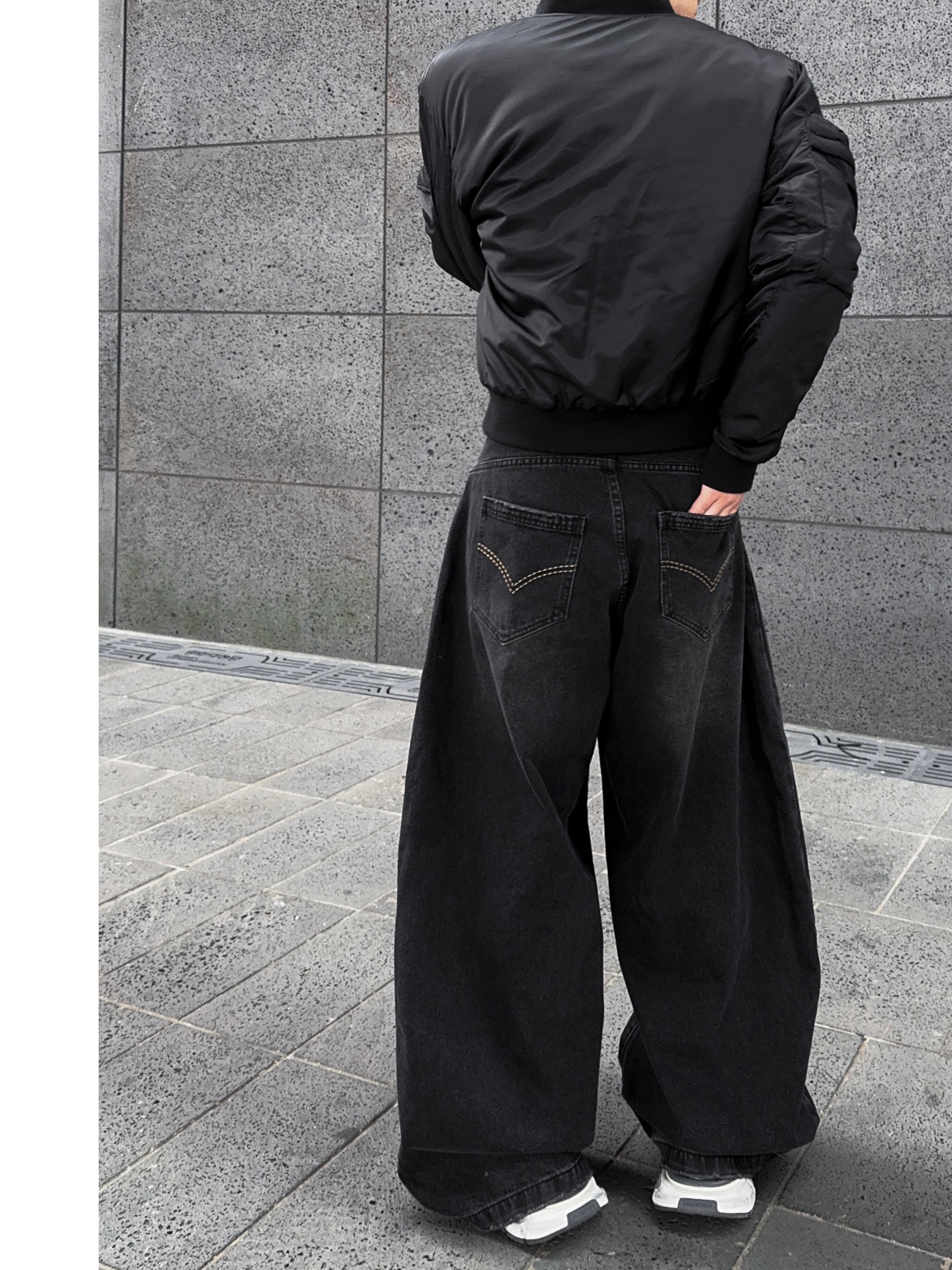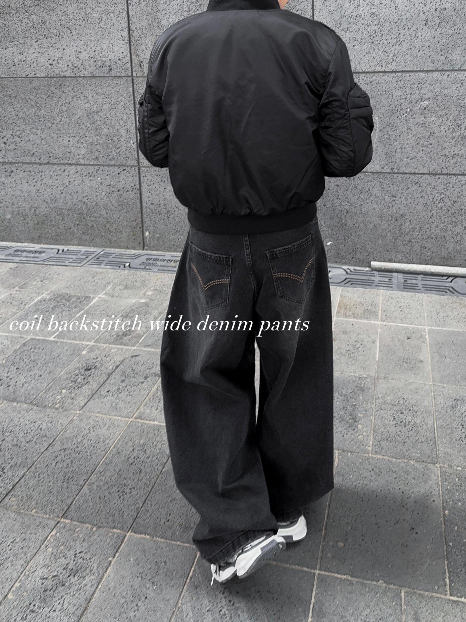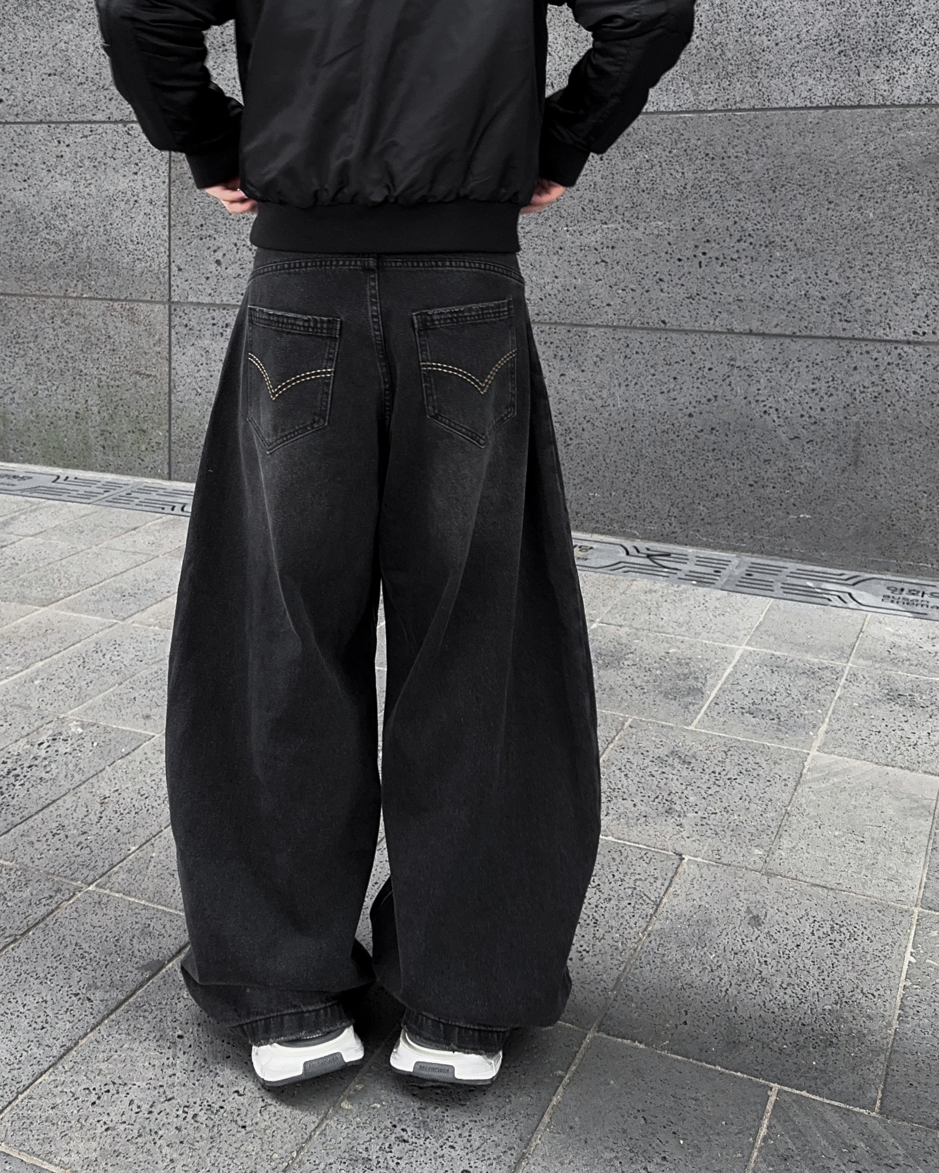 -탄탄한 데님 원단으로 제작된 와이드 팬츠