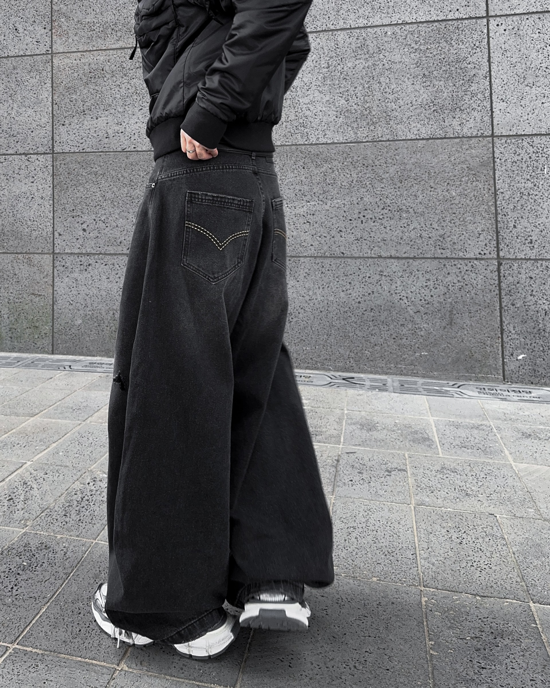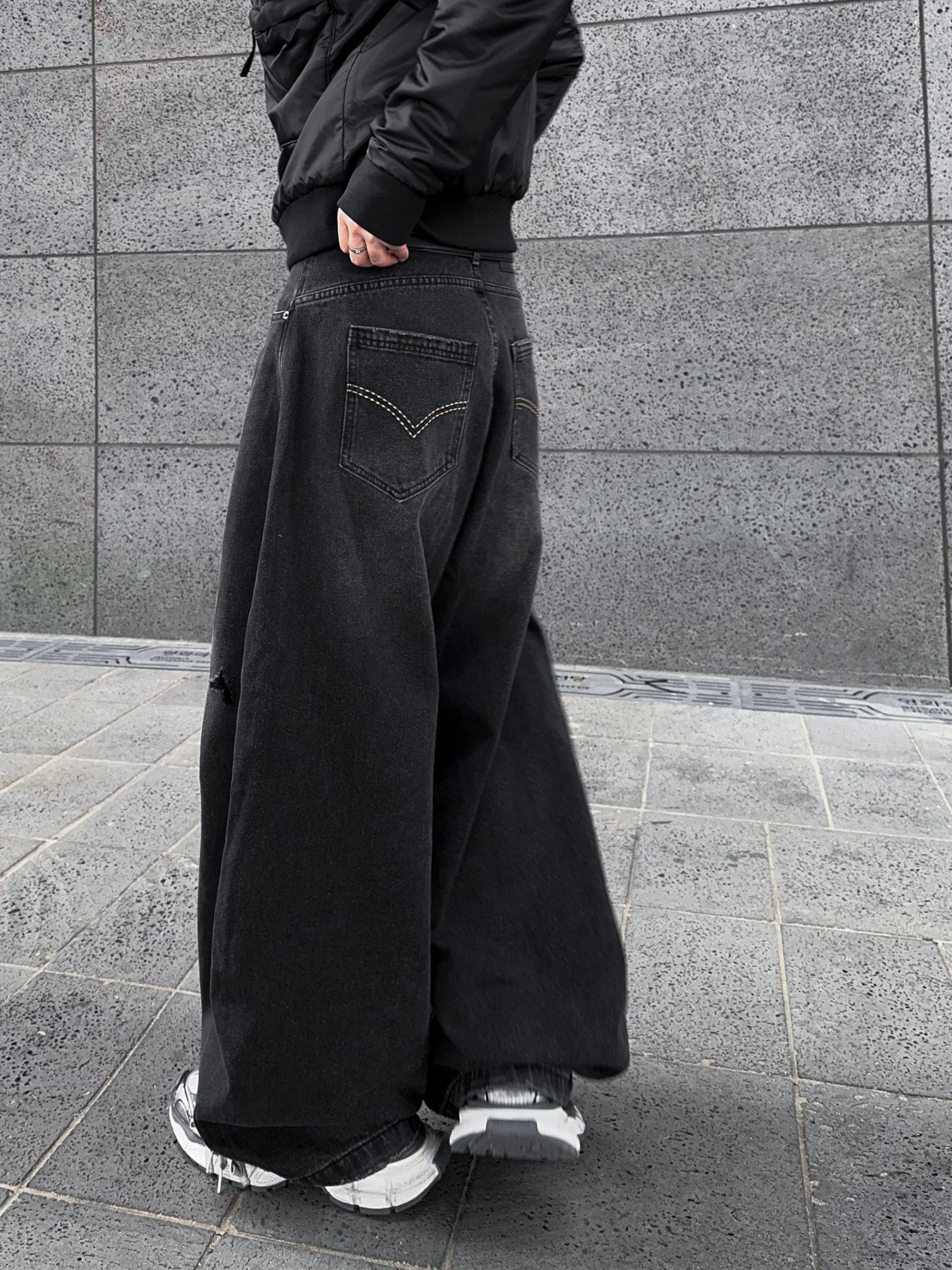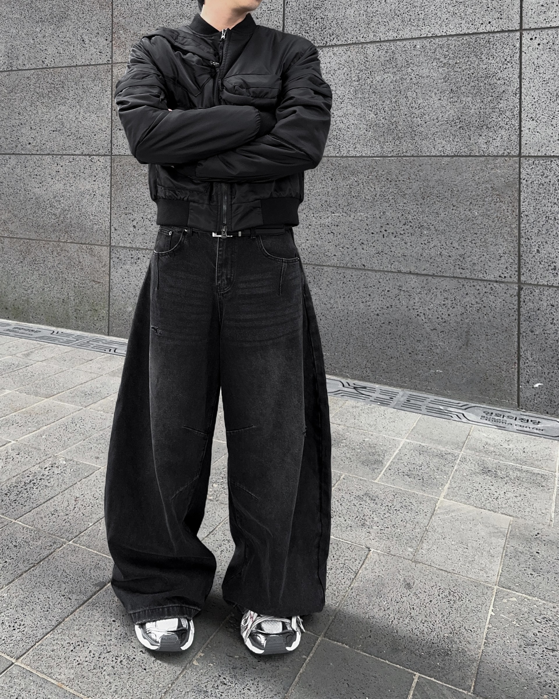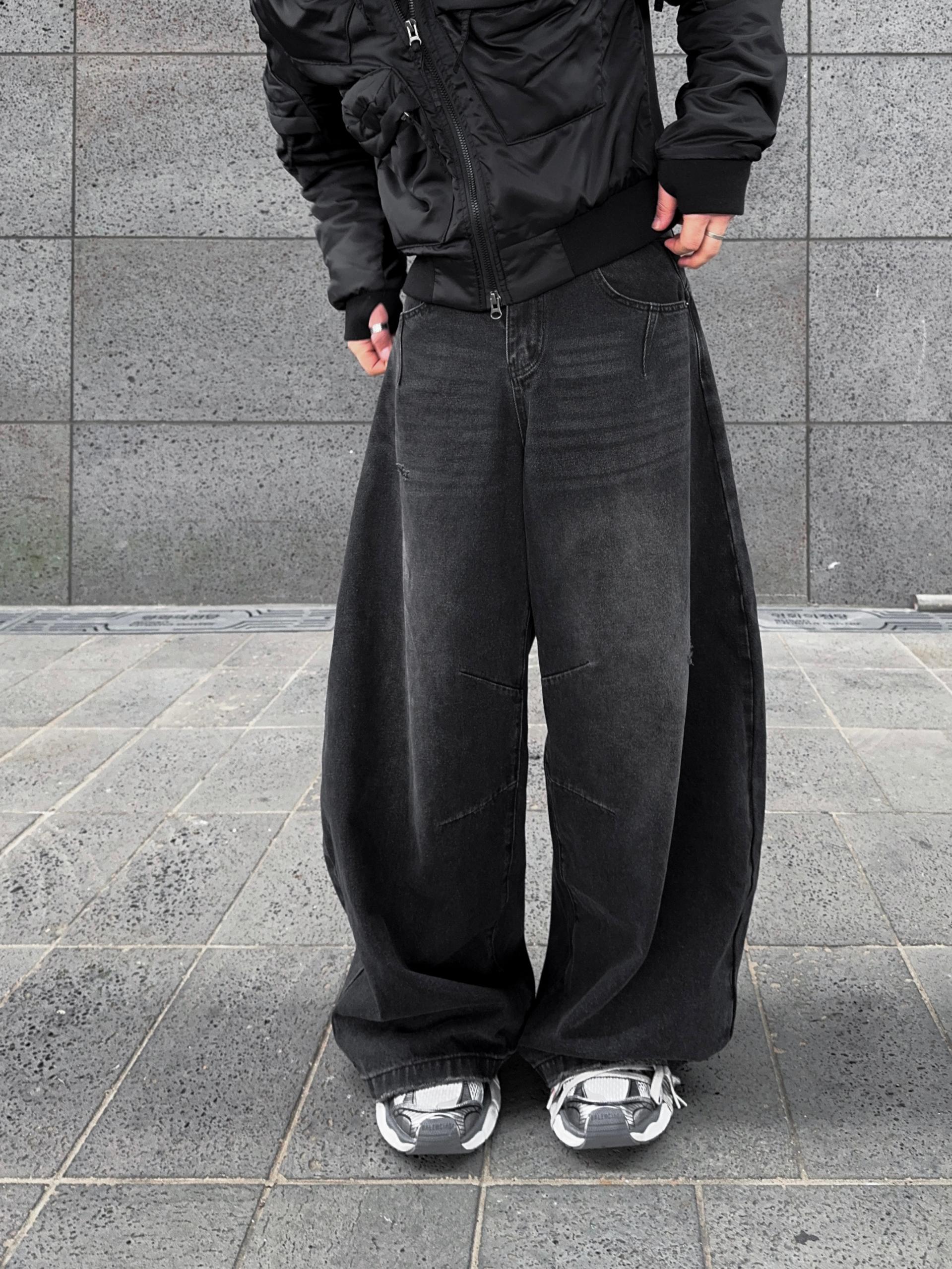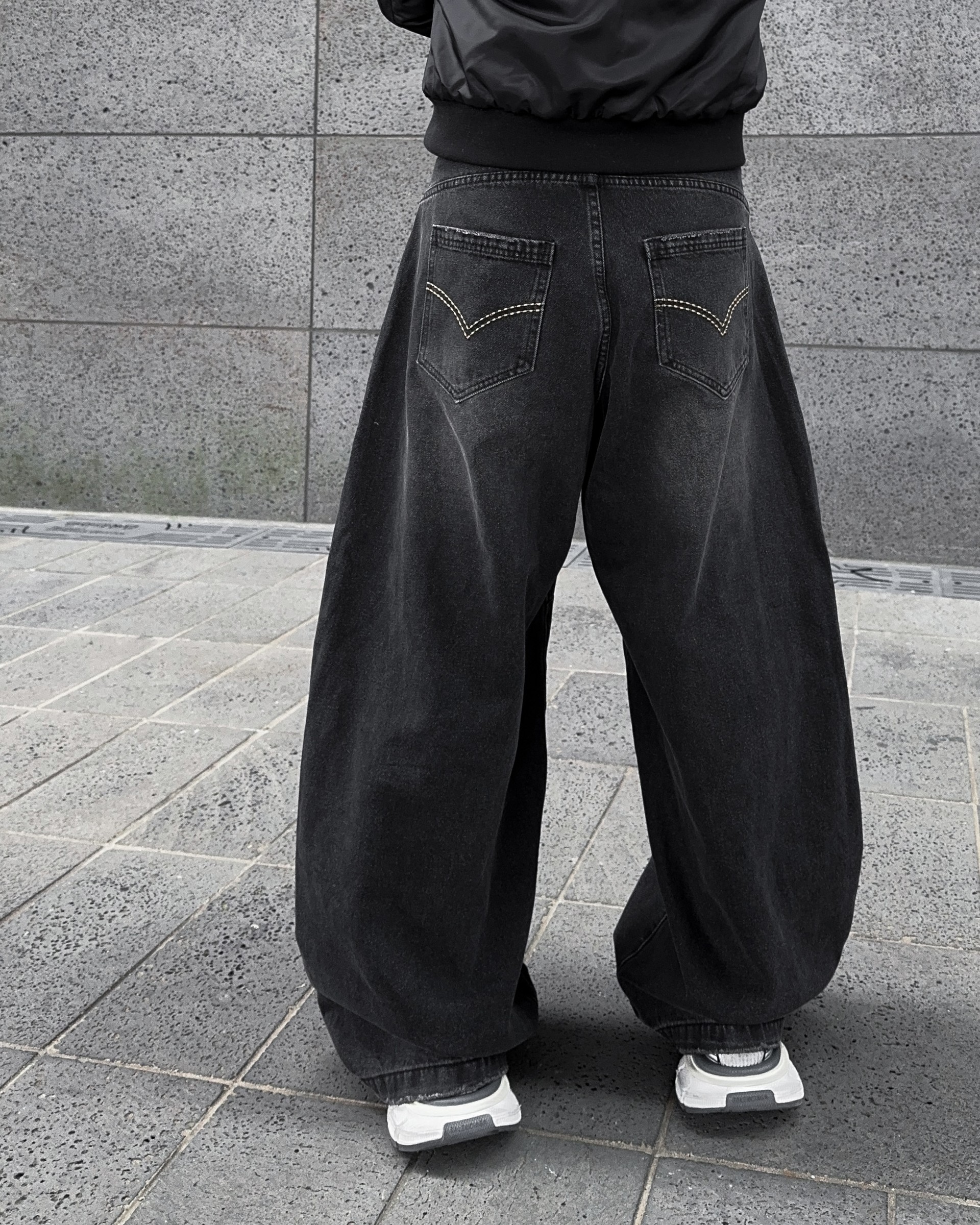 -탄탄한 데님 원단으로 제작된 와이드 팬츠