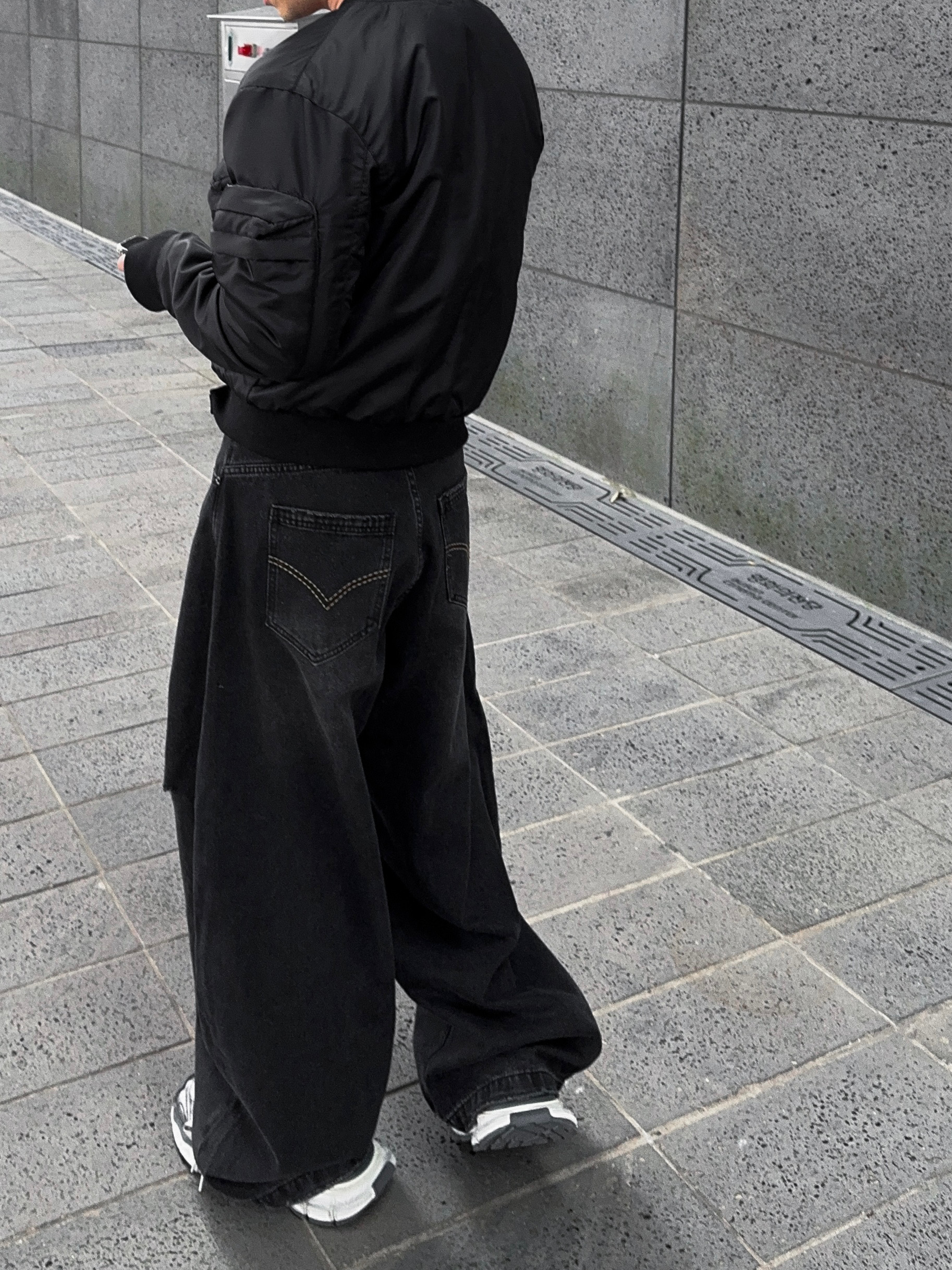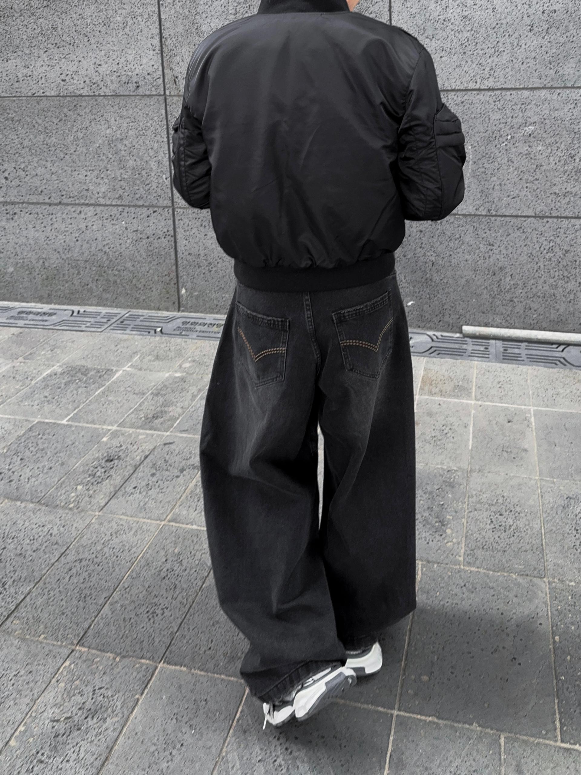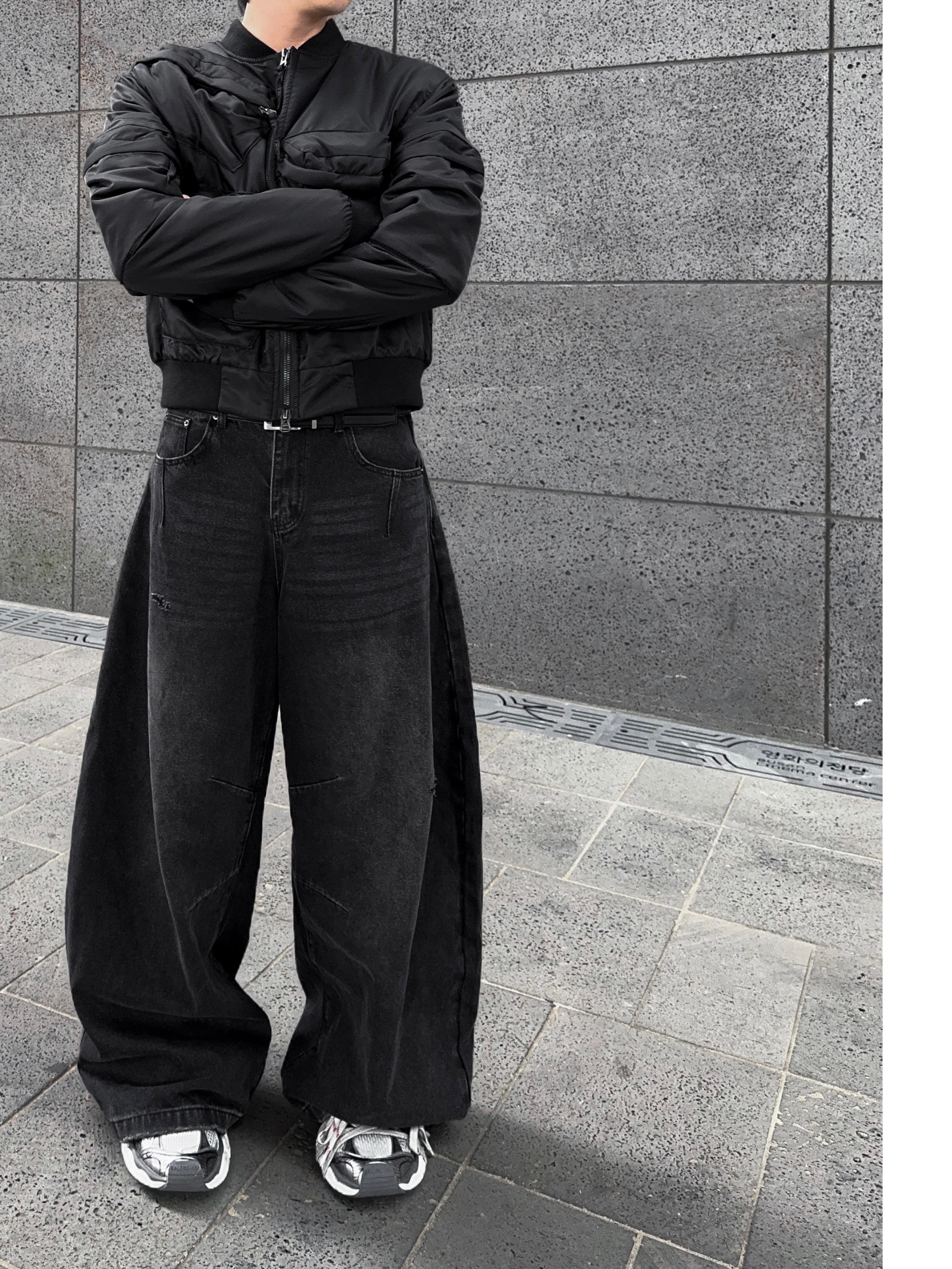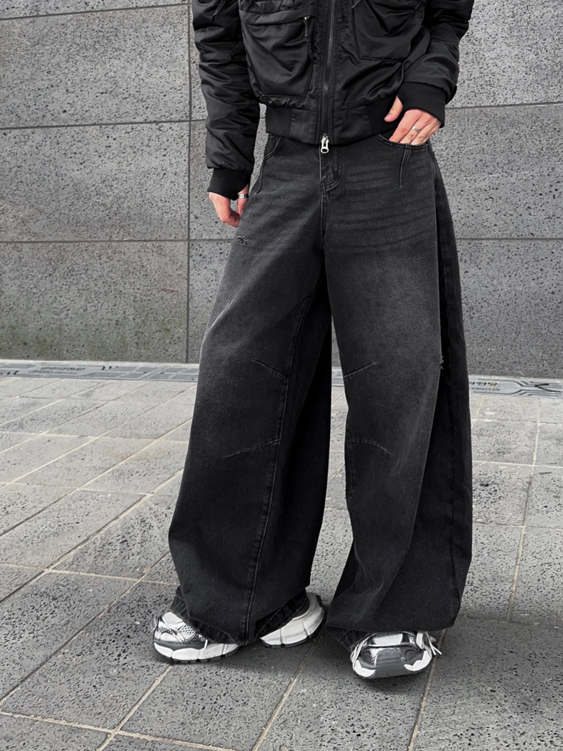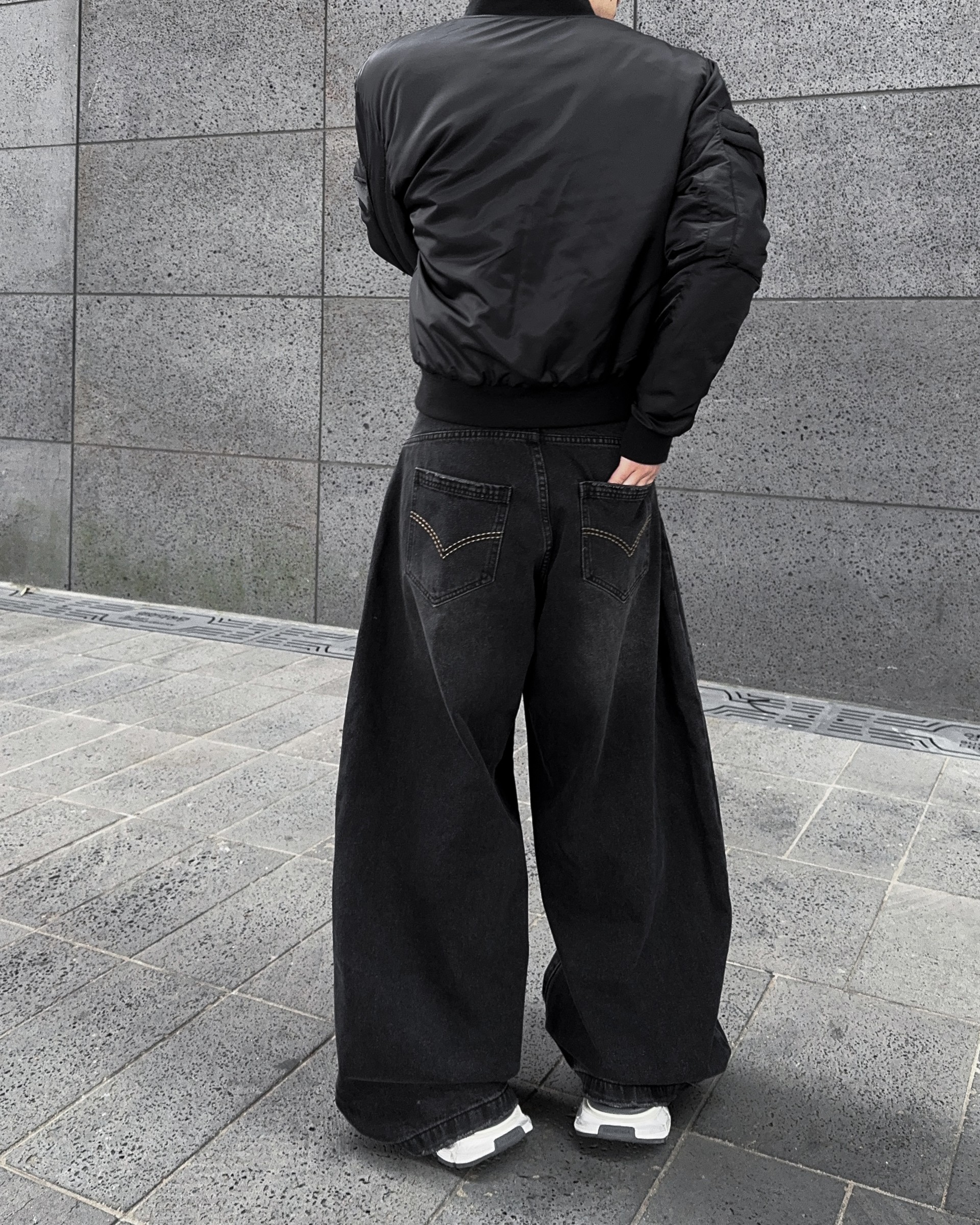 -탄탄한 데님 원단으로 제작된 와이드 팬츠