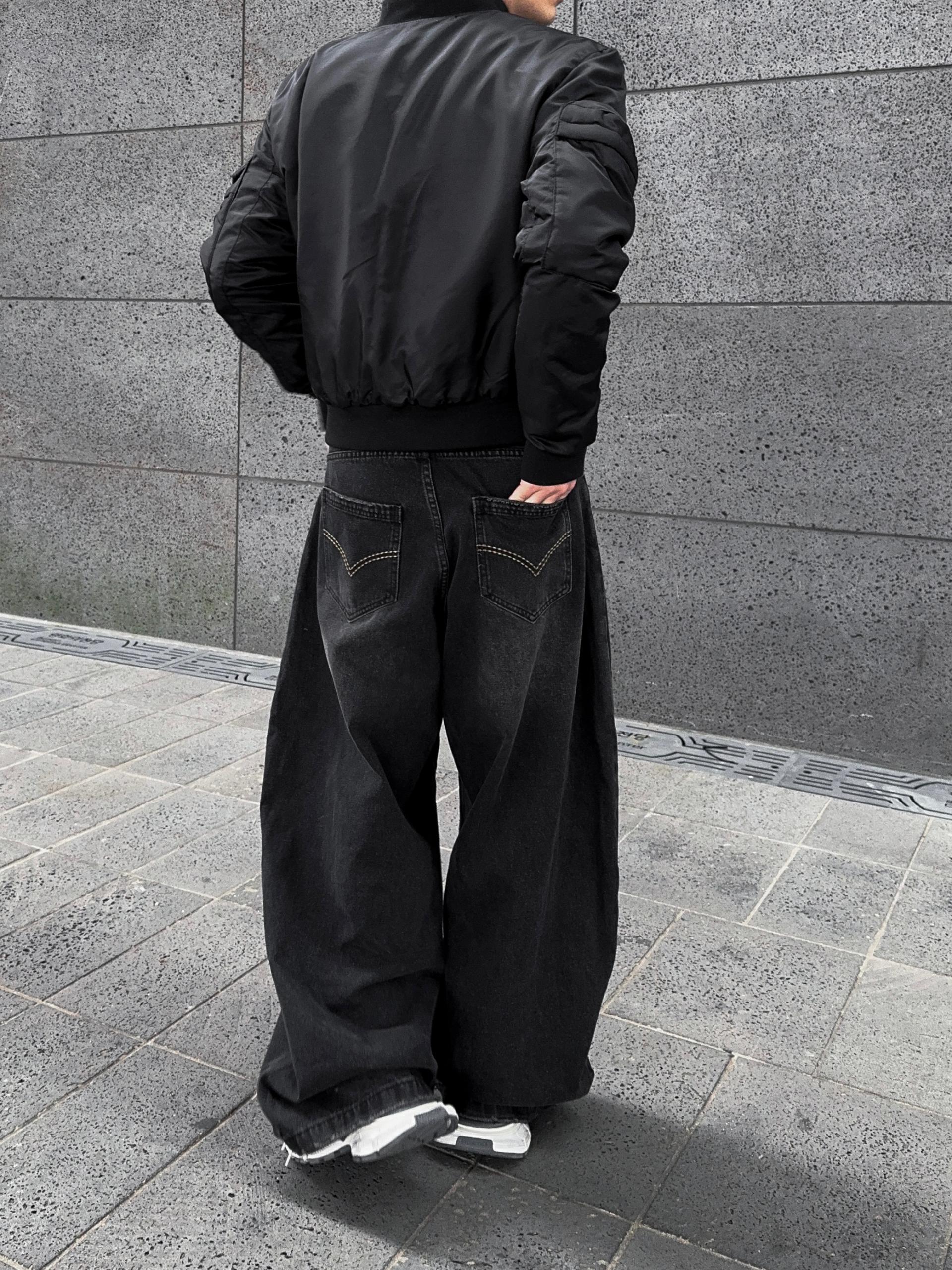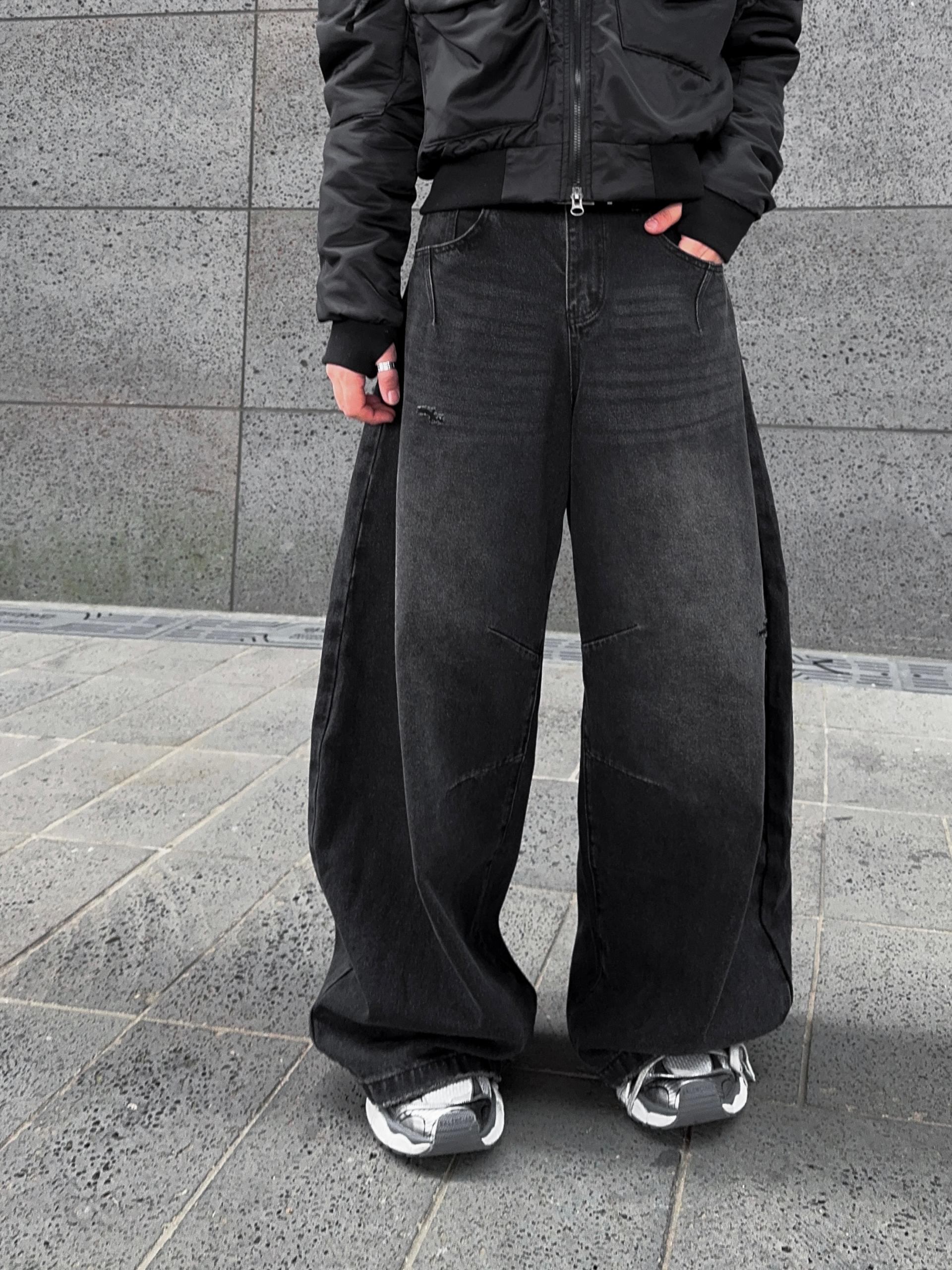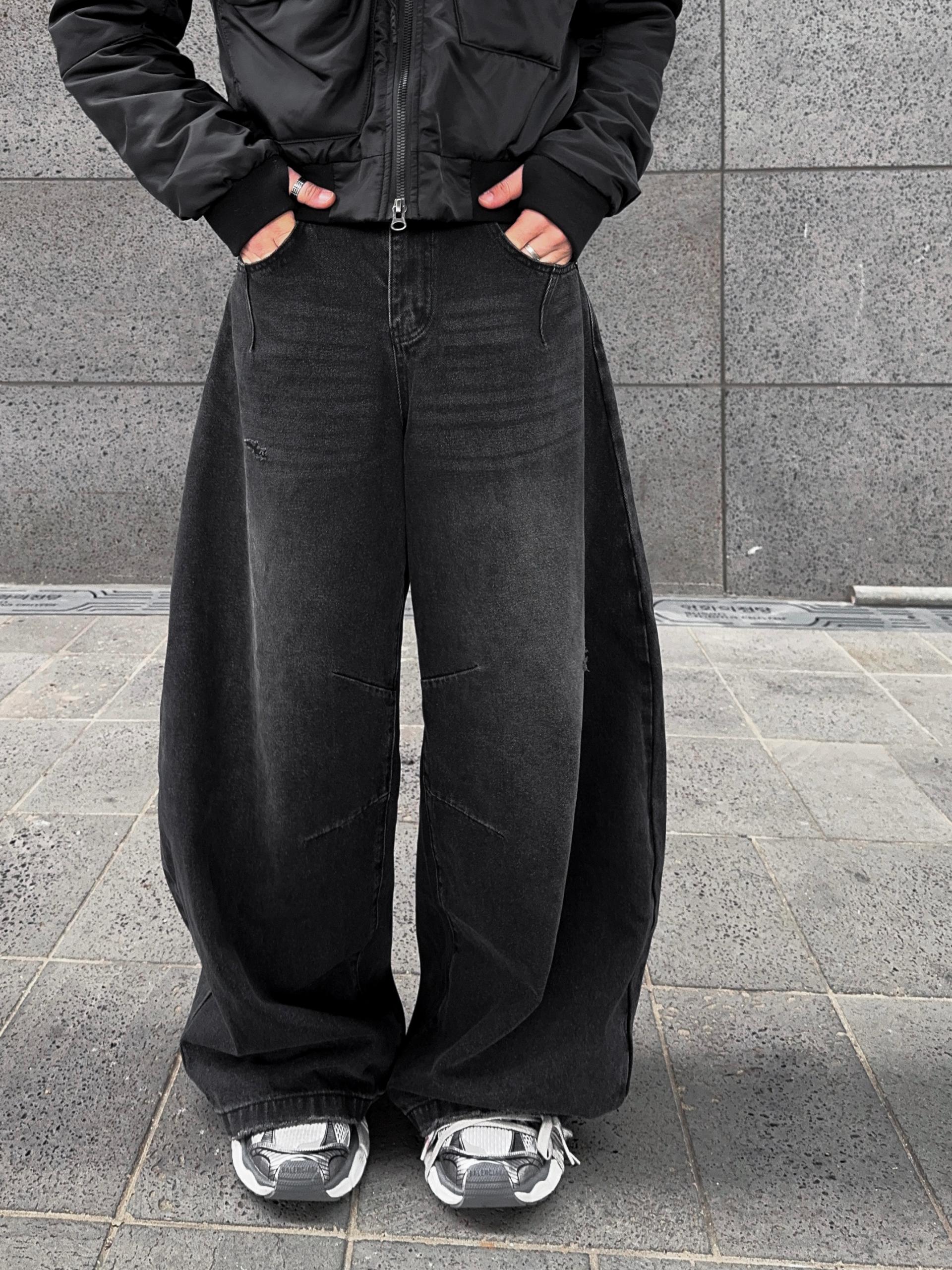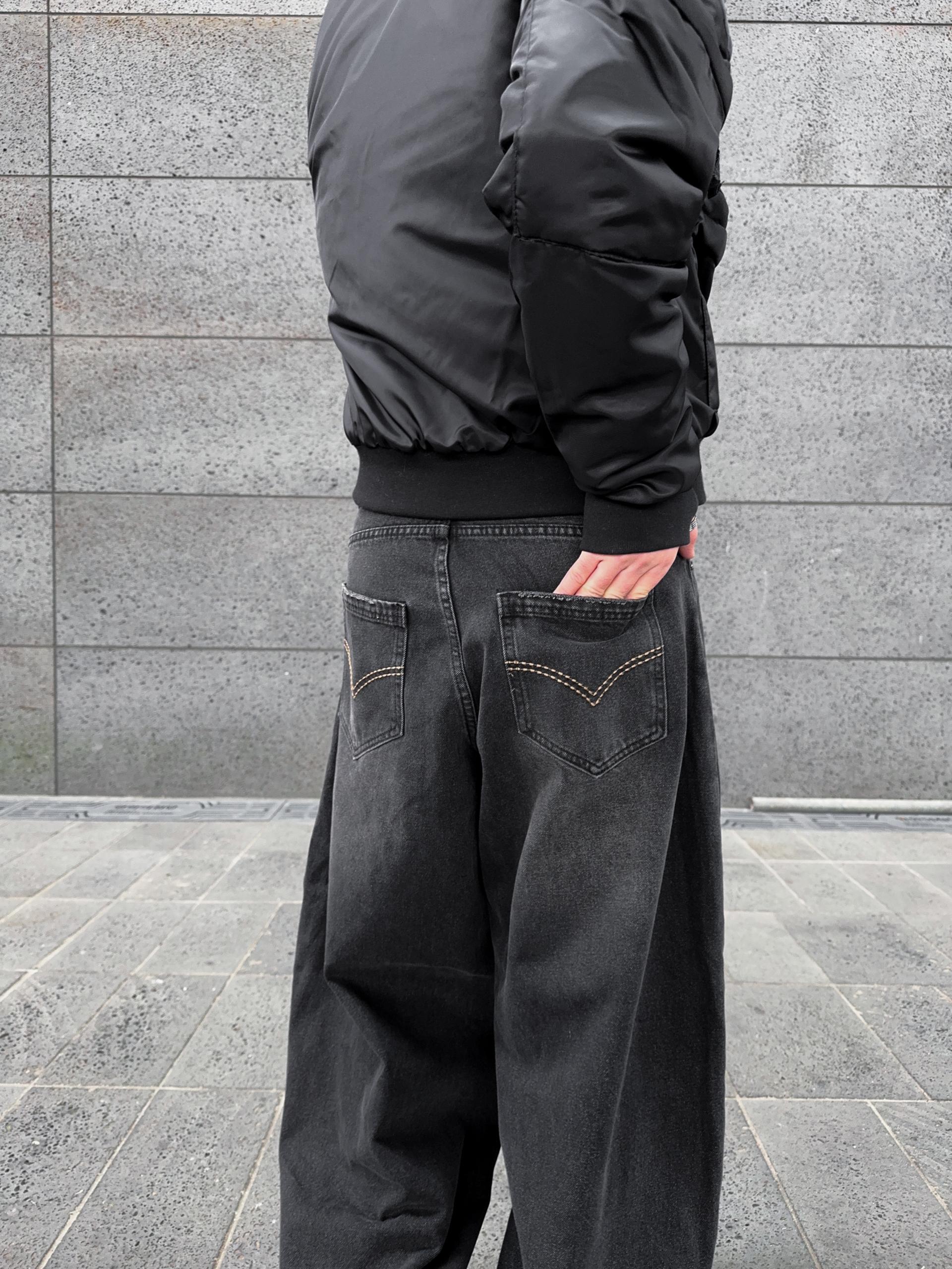 -탄탄한 데님 원단으로 제작된 와이드 팬츠